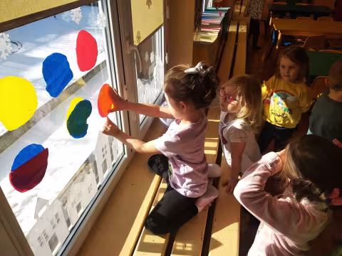 Dzieci z grupy V na przekór zimowej pogodzie postanowiły odszukać odpowiedzi na pytanie: "Jak powstają kolorowry?". W tym celu przedszkolaki wybrały się do " laboratorium kolorów", gdzie poznały jak powstają kolory i później same mieszały ze sobą różne barwy.