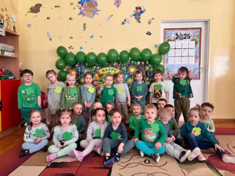 17 marca obchodziliśmy w przedszkolu Dzień Świętego Patryka. Z tej okazji wszystkie przedszkolaki przyszły ubrane w zielone barwy, aby wspólnie odtańczyć irlandzki taniec. Każda grupa przygotowała specjalne nakrycia głowy lub małe akcenty w ubiorze. Dzieci dowiedziały się kim był Św. Patryk oraz skrzat Leprechaun.