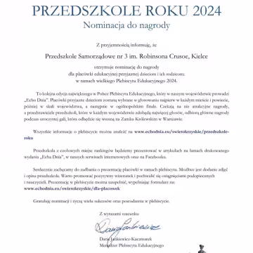 Jest nam niezmiernie miło ponieważ "Redakcja „Echa Dnia" poinformowała nas, że NASZA placówka edukacyjna została zgłoszona do nagrody jako "Placówka ...
