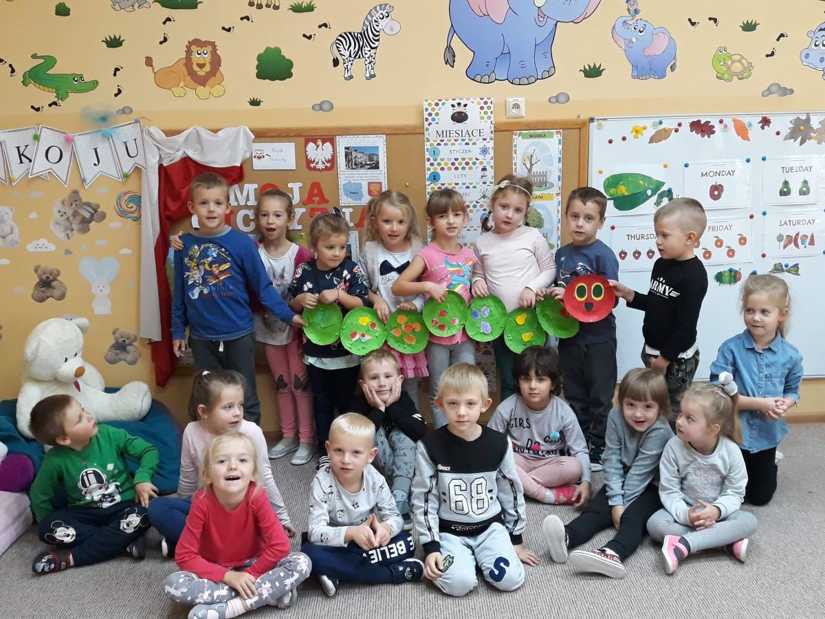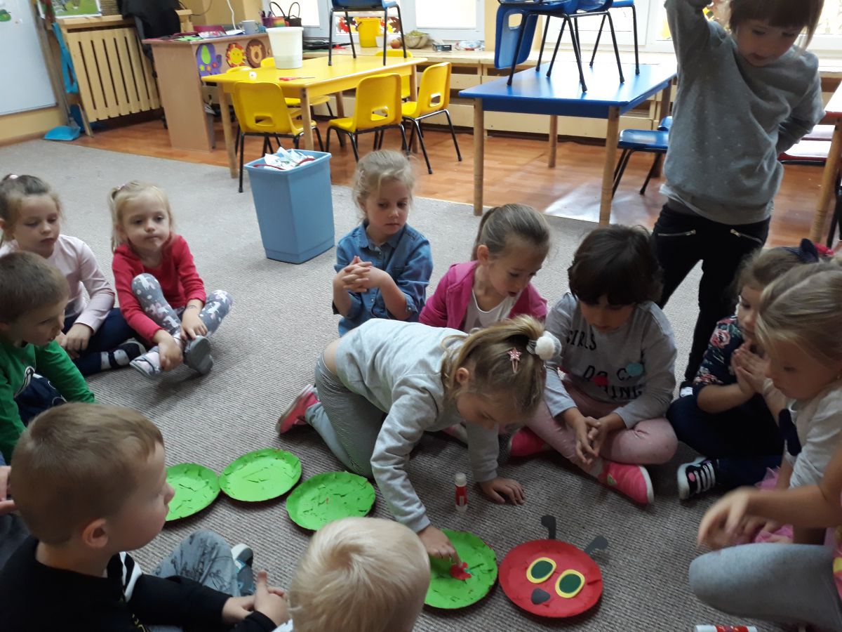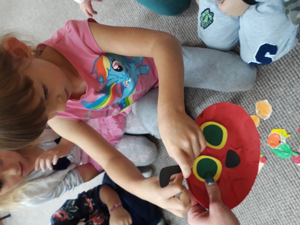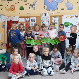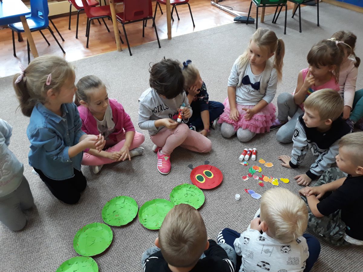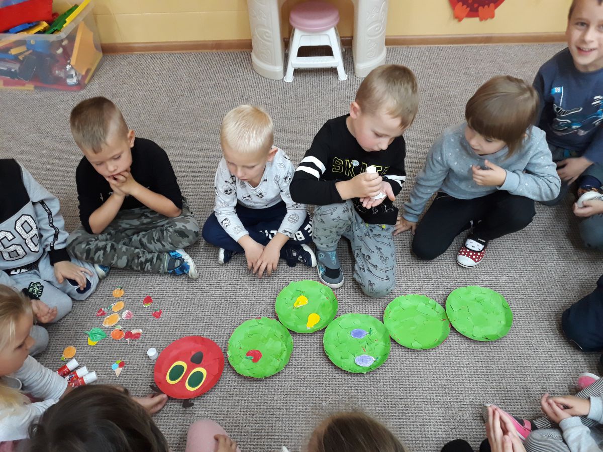 Krótka opowieść o małej głodnej gąsienicy, która każdego dnia zjadała cos innego, aż w końcu zamieniła się w pięknego motyla – The very hungry Caterpillar. Dzięki tej interesującej bajce udało nam się połączyć treści nauczania z zakresu przyrody i matematyki z językiem angielskim, co doskonale wpisuje się w stosowaną przez nas na zajęciach metodę - w skrócie nazywaną CLIL. Podczas zajęć, mieliśmy okazję utrwalić słownictwo głównie z zakresu nazw owoców, kolorów, a także liczb. Poznaliśmy również cykl życia gąsienicy i etapy jej rozwoju. Wykonaliśmy samodzielnie jej plastyczny model wykorzystując papierowe talerzyki, papier kolorowy oraz pokolorowane sylwety owoców i produktów, które potem przyklejaliśmy zgodnie z treścią bajki. Z pomocą olbrzymiej sylwety gąsienicy udało nam się jeszcze raz odtworzyć jej historię krok po kroku. Na koniec nasza „ Caterpillar” powędrowała na grupową wystawę, gdzie można ją podziwiać.