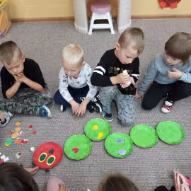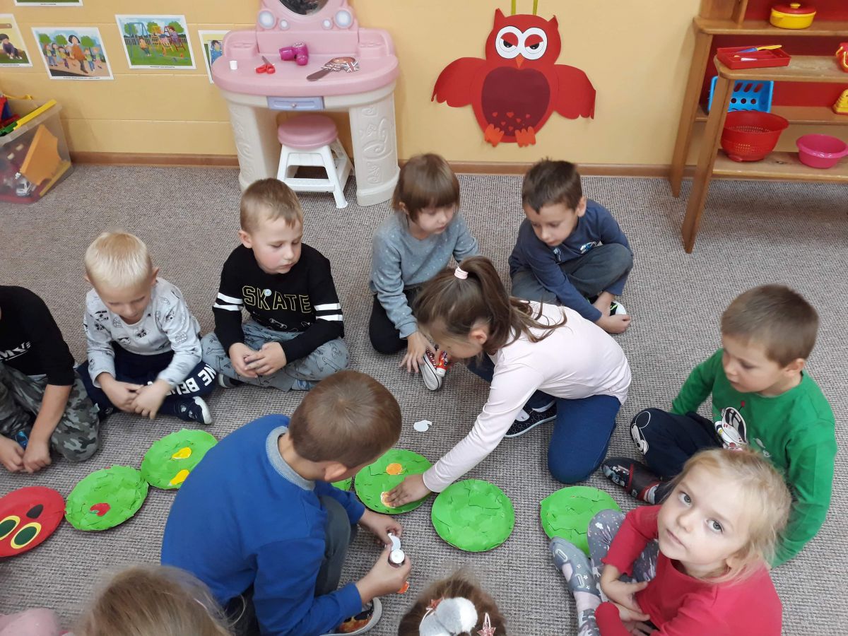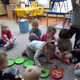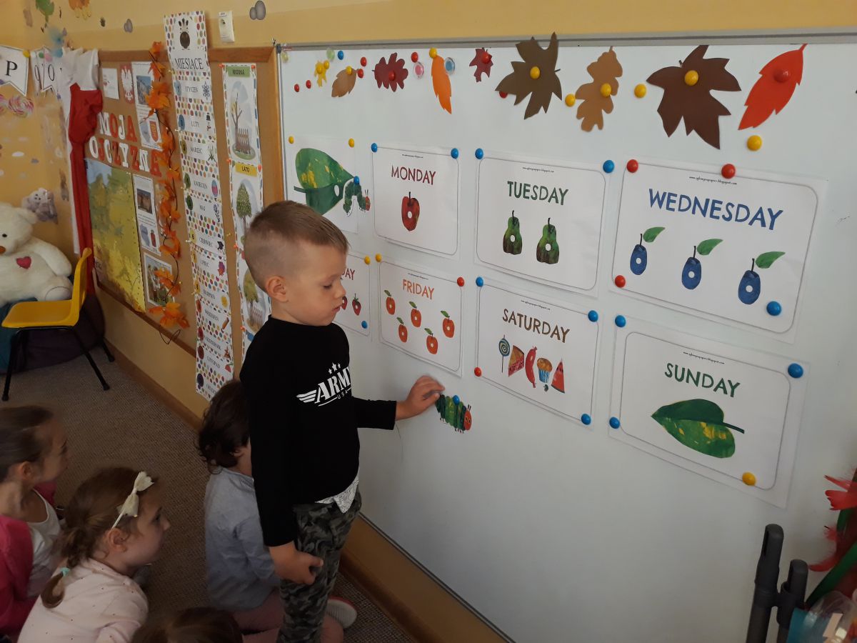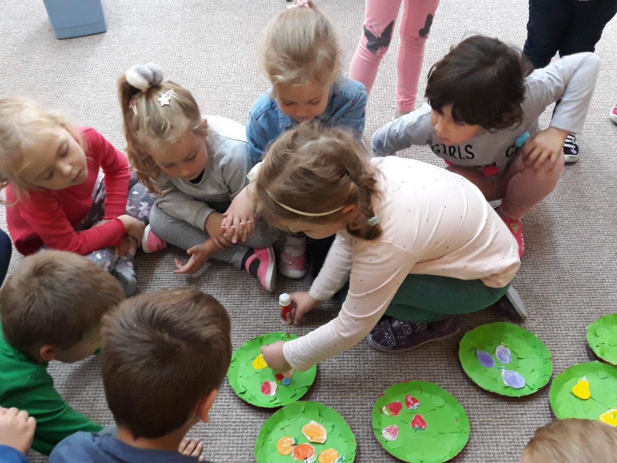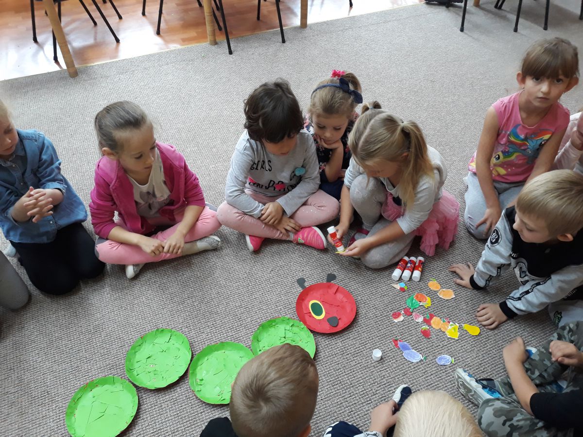Krótka opowieść o małej głodnej gąsienicy, która każdego dnia zjadała cos innego, aż w końcu zamieniła się w pięknego motyla – The very hungry Caterpillar. Dzięki tej interesującej bajce udało nam się połączyć treści nauczania z zakresu przyrody i matematyki z językiem angielskim, co doskonale wpisuje się w stosowaną przez nas na zajęciach metodę - w skrócie nazywaną CLIL. Podczas zajęć, mieliśmy okazję utrwalić słownictwo głównie z zakresu nazw owoców, kolorów, a także liczb. Poznaliśmy również cykl życia gąsienicy i etapy jej rozwoju. Wykonaliśmy samodzielnie jej plastyczny model wykorzystując papierowe talerzyki, papier kolorowy oraz pokolorowane sylwety owoców i produktów, które potem przyklejaliśmy zgodnie z treścią bajki. Z pomocą olbrzymiej sylwety gąsienicy udało nam się jeszcze raz odtworzyć jej historię krok po kroku. Na koniec nasza „ Caterpillar” powędrowała na grupową wystawę, gdzie można ją podziwiać.