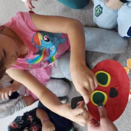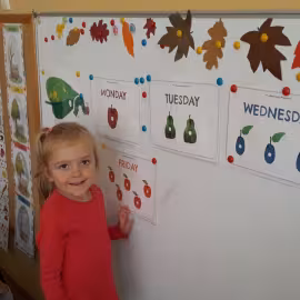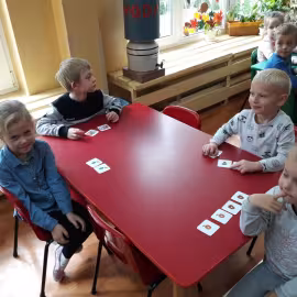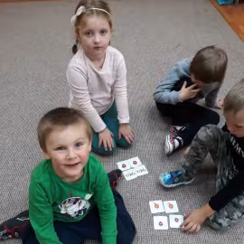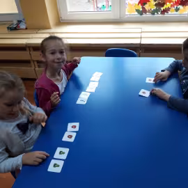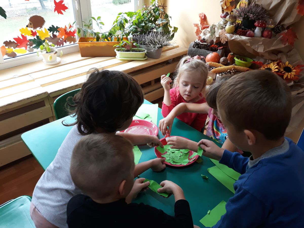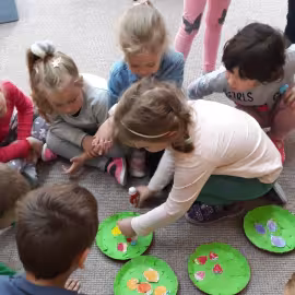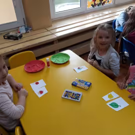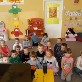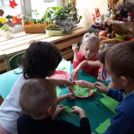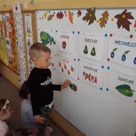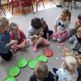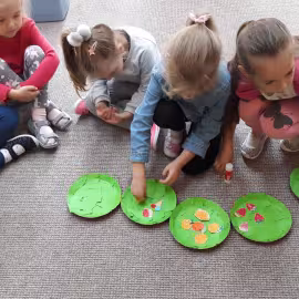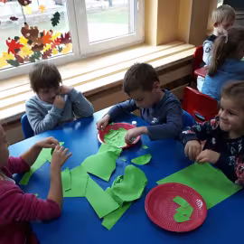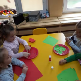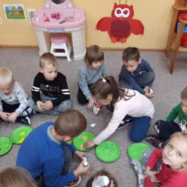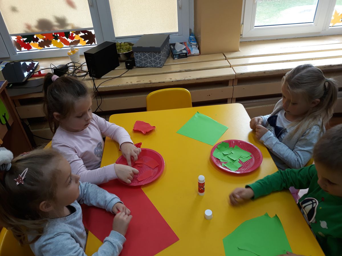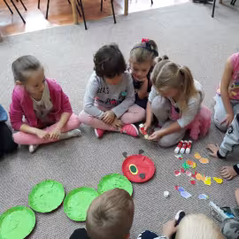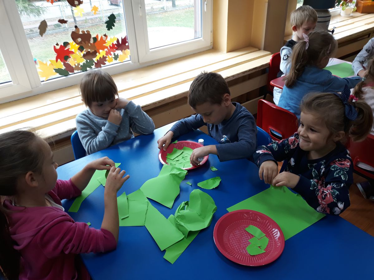 Krótka opowieść o małej głodnej gąsienicy, która każdego dnia zjadała cos innego, aż w końcu zamieniła się w pięknego motyla – The very hungry Caterpillar. Dzięki tej interesującej bajce udało nam się połączyć treści nauczania z zakresu przyrody i matematyki z językiem angielskim, co doskonale wpisuje się w stosowaną przez nas na zajęciach metodę - w skrócie nazywaną CLIL. Podczas zajęć, mieliśmy okazję utrwalić słownictwo głównie z zakresu nazw owoców, kolorów, a także liczb. Poznaliśmy również cykl życia gąsienicy i etapy jej rozwoju. Wykonaliśmy samodzielnie jej plastyczny model wykorzystując papierowe talerzyki, papier kolorowy oraz pokolorowane sylwety owoców i produktów, które potem przyklejaliśmy zgodnie z treścią bajki. Z pomocą olbrzymiej sylwety gąsienicy udało nam się jeszcze raz odtworzyć jej historię krok po kroku. Na koniec nasza „ Caterpillar” powędrowała na grupową wystawę, gdzie można ją podziwiać.
