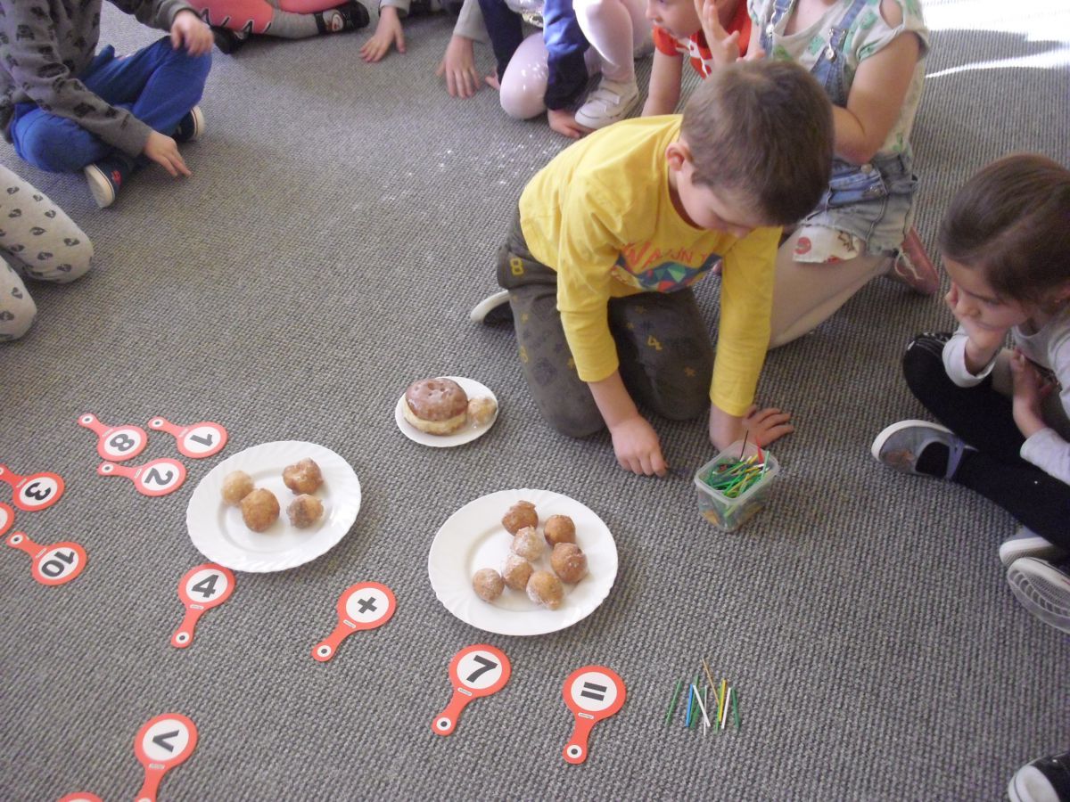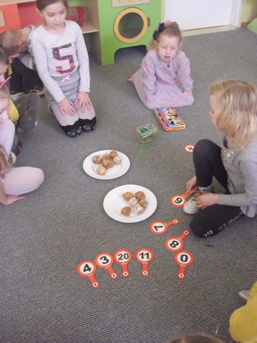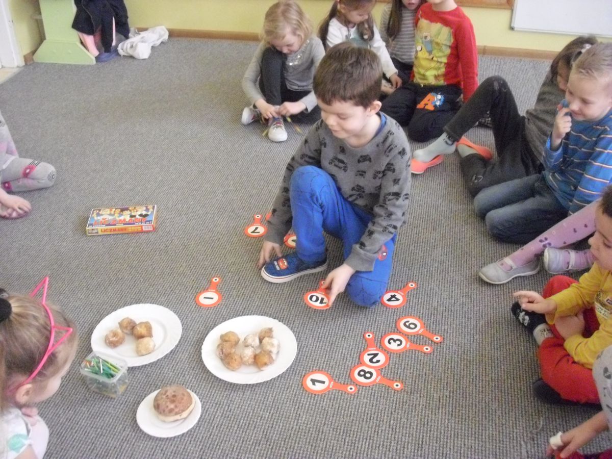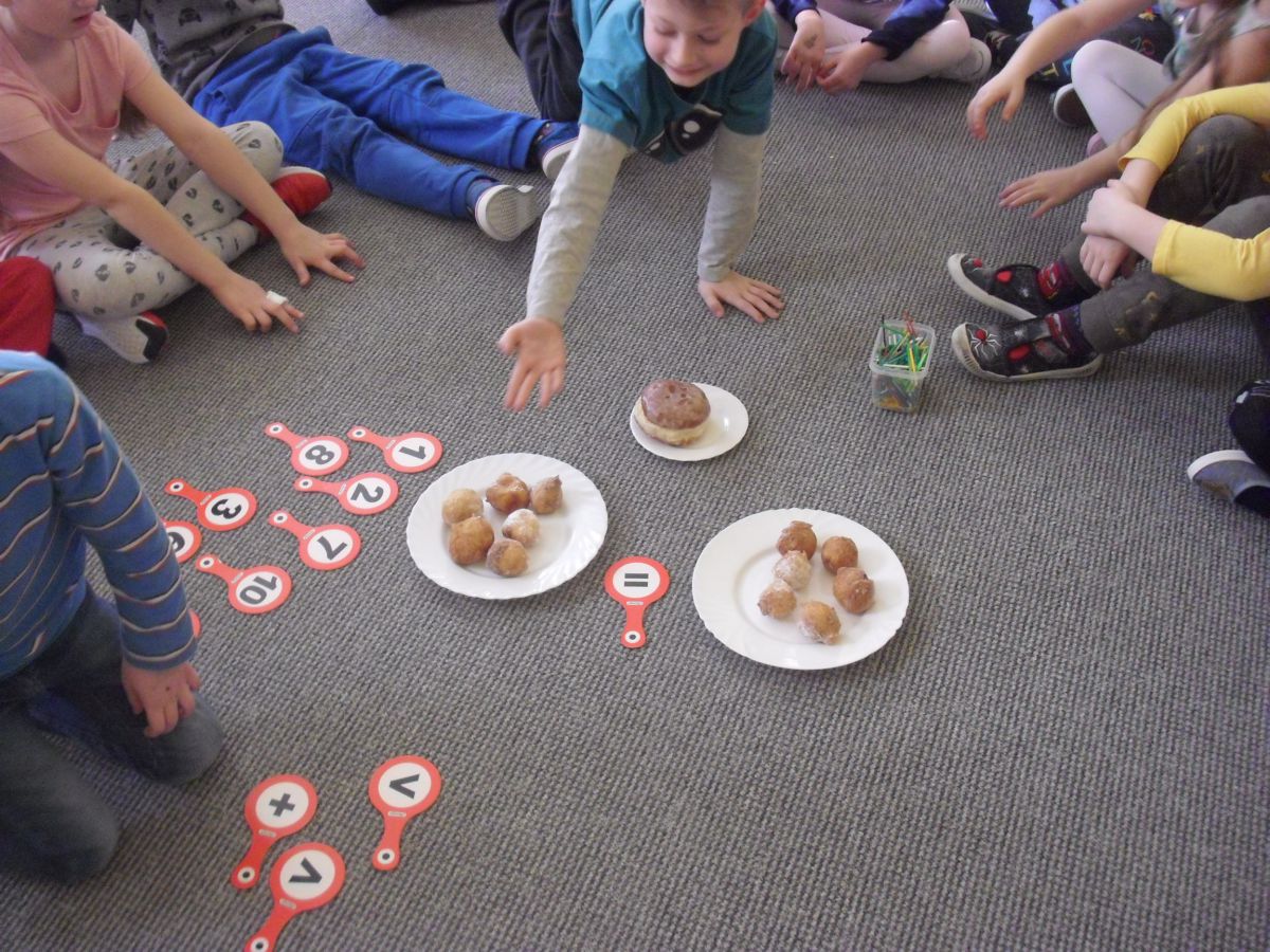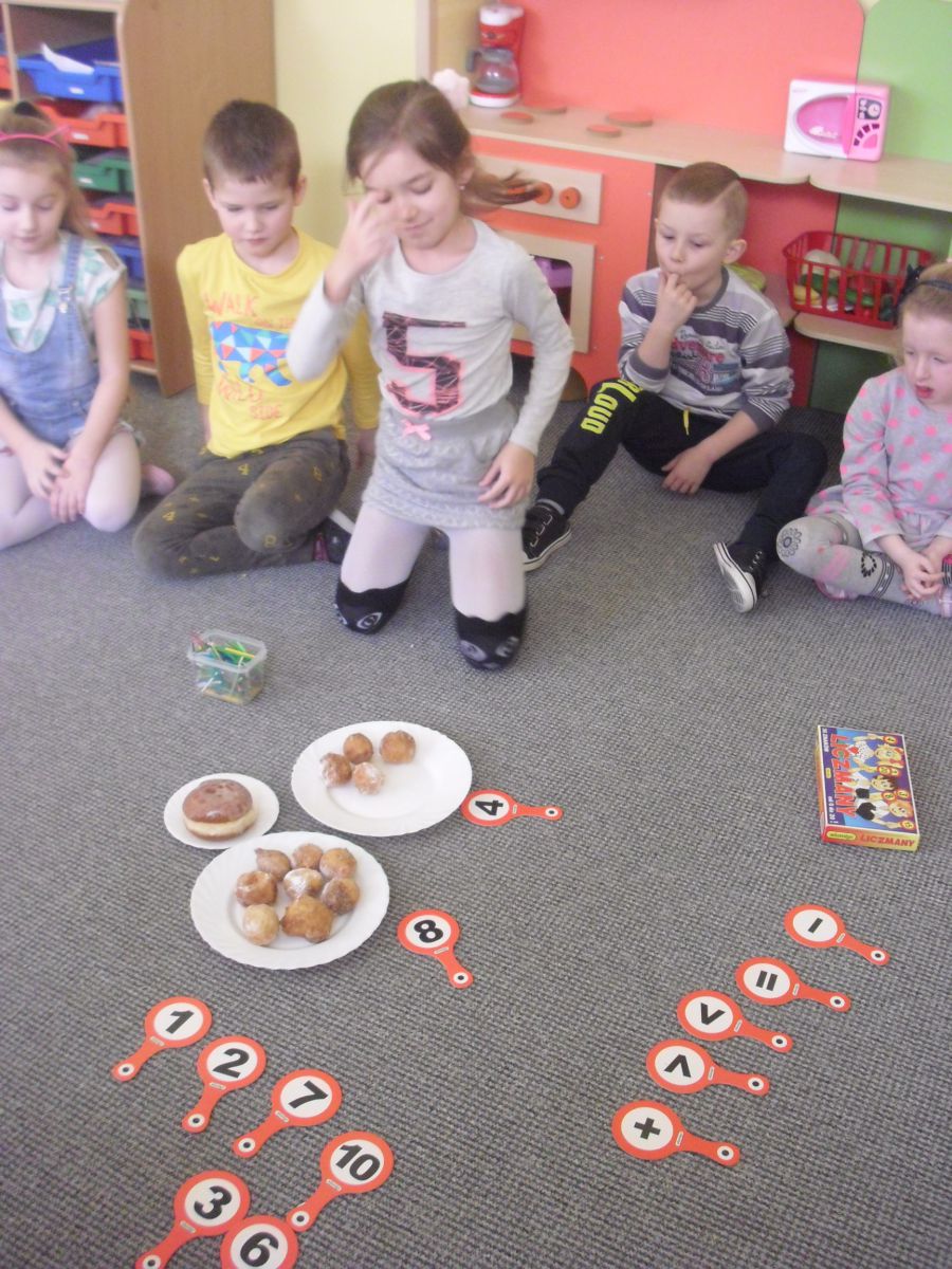 W tym roku tłusty czwartek obchodziliśmy 28 lutego . Najważniejszym akcentem tłustego czwartku są pączki. Oczywiście nie odbyło się bez ich degustacji. Wszyscy zajadali się słodkimi pysznościami. Była to okazja do świetnej zabawy, ale także do przypomnienia i kultywowania naszych narodowych tradycji i zwyczajów. Przy okazji przeliczaliśmy pączki, utrwaliliśmy znaki większości i mniejszości. Taki zwyczaj bardzo nam się podoba i jesteśmy jego gorącymi zwolennikami.