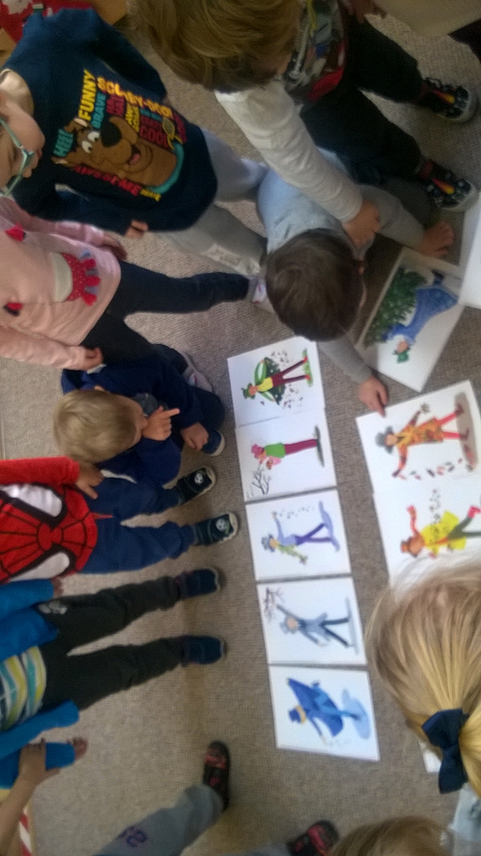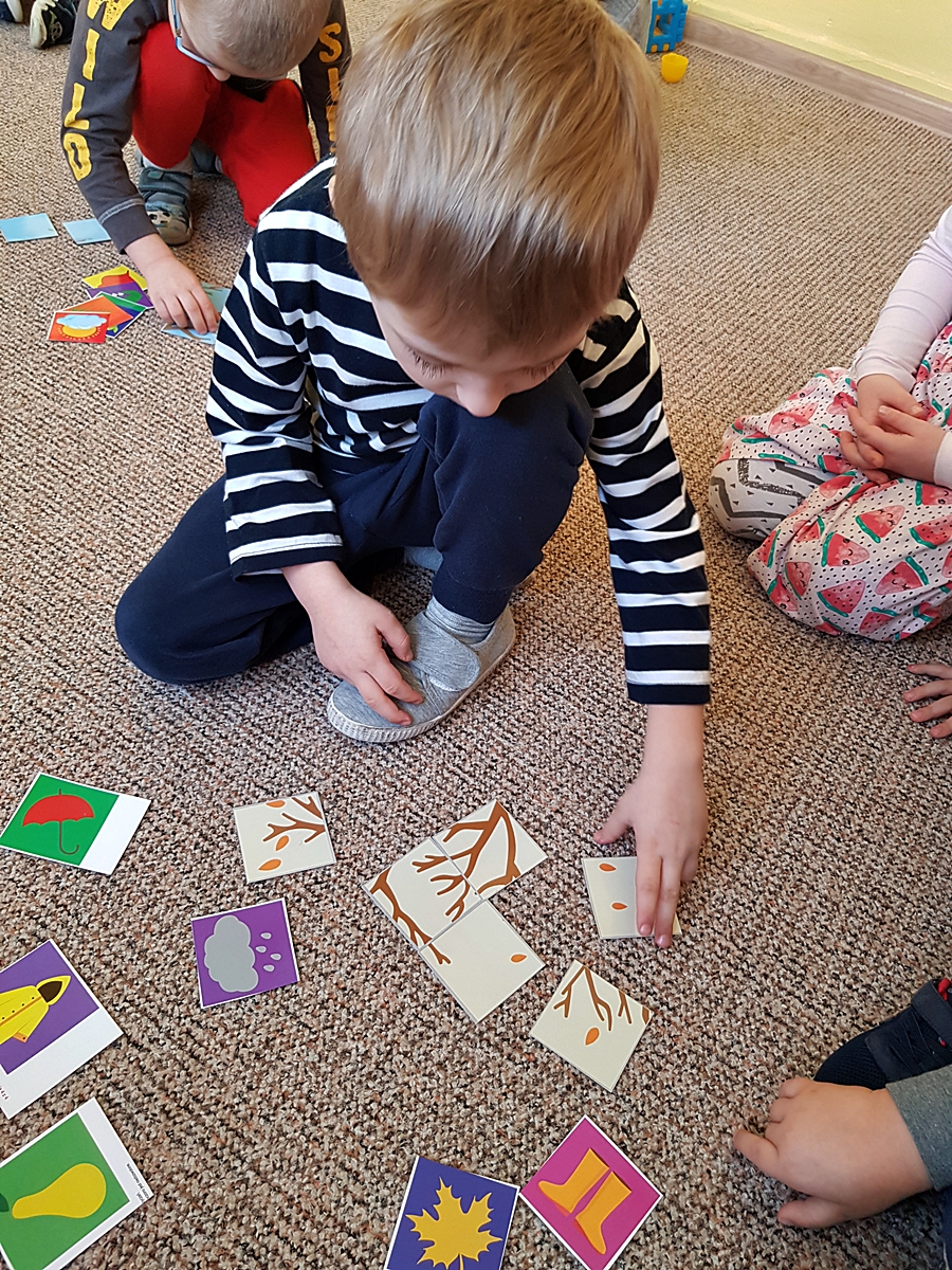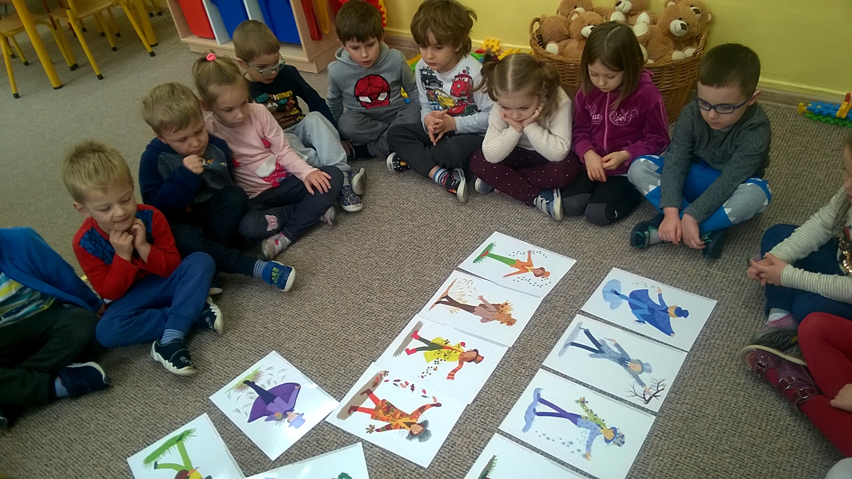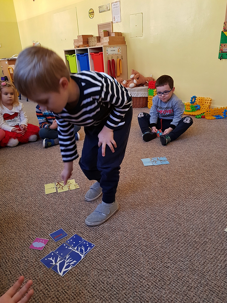 "Jaka to pora roku”- zagadki słowne Rozwijanie umiejętności wiązania opisu słownego z obrazkiem .Dzieci rozwiązywały zagadki i dobierały do nich odpowiednie obrazki.