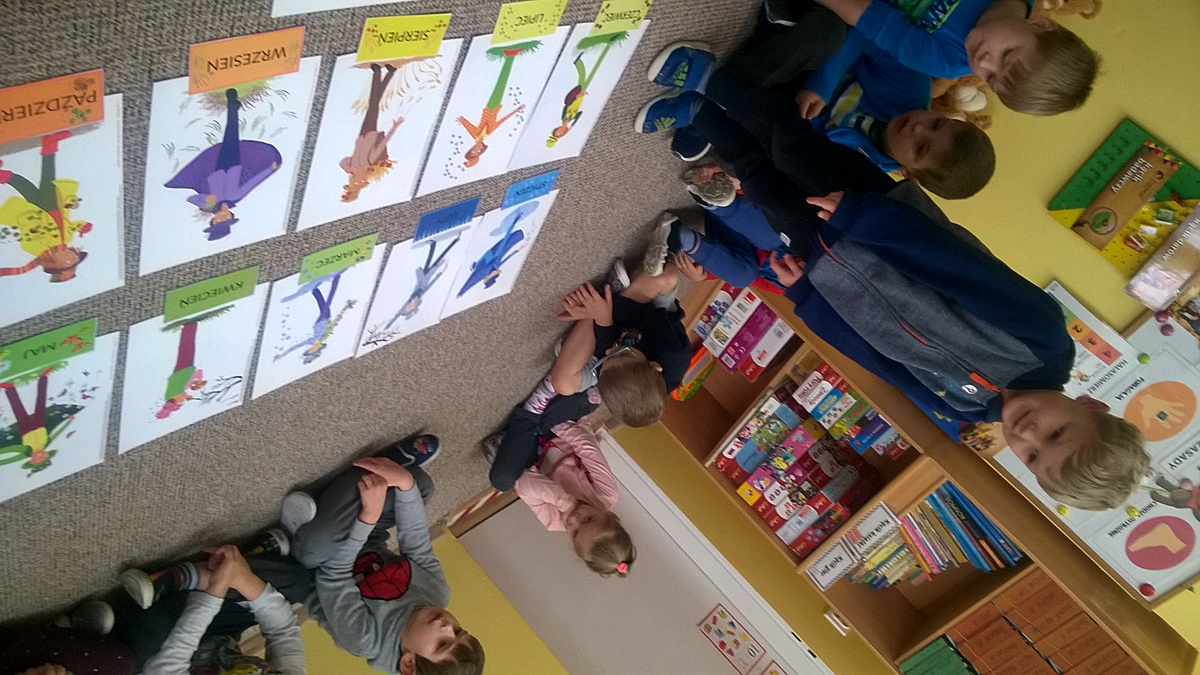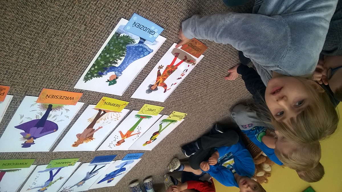 Imiona pór roku”- zabawa dydaktyczna. Rozwijanie umiejętności czytania globalnego. Dzieci dopasowywały karteczki z napisami do odpowiednich obrazków.