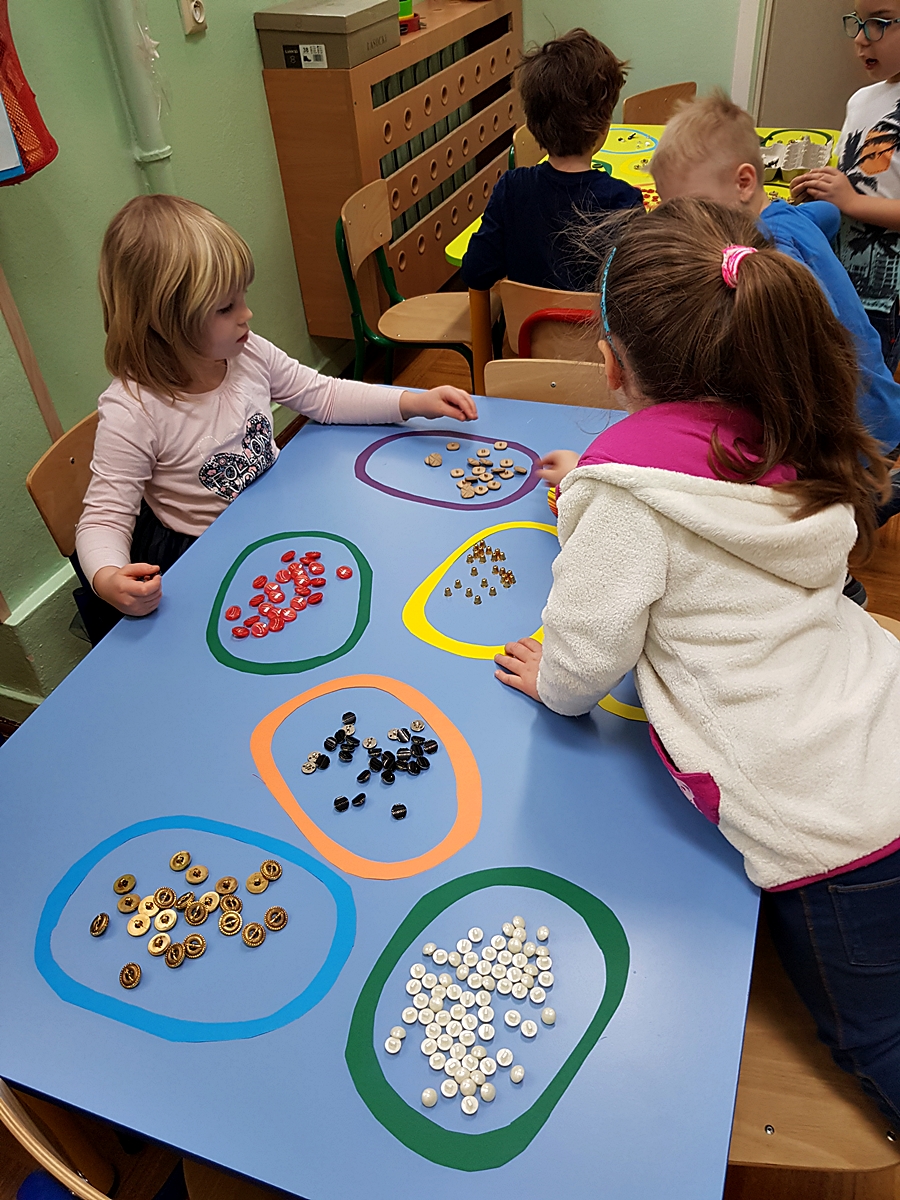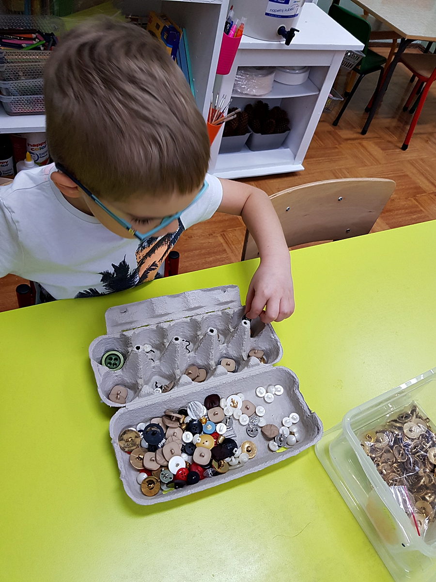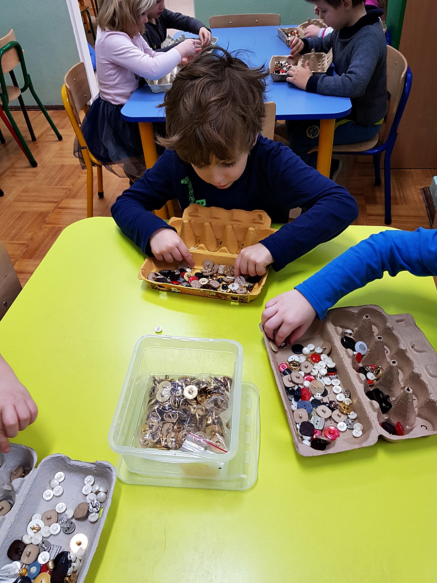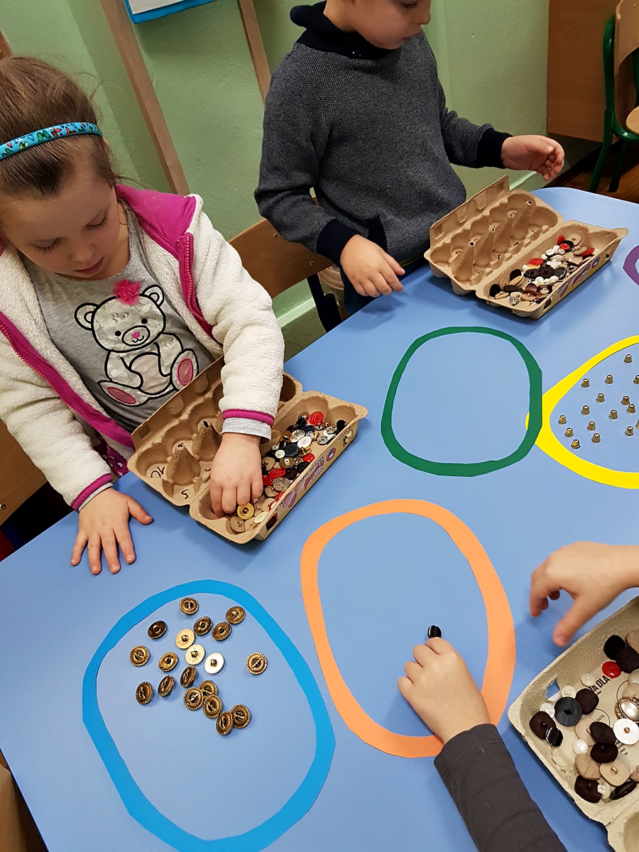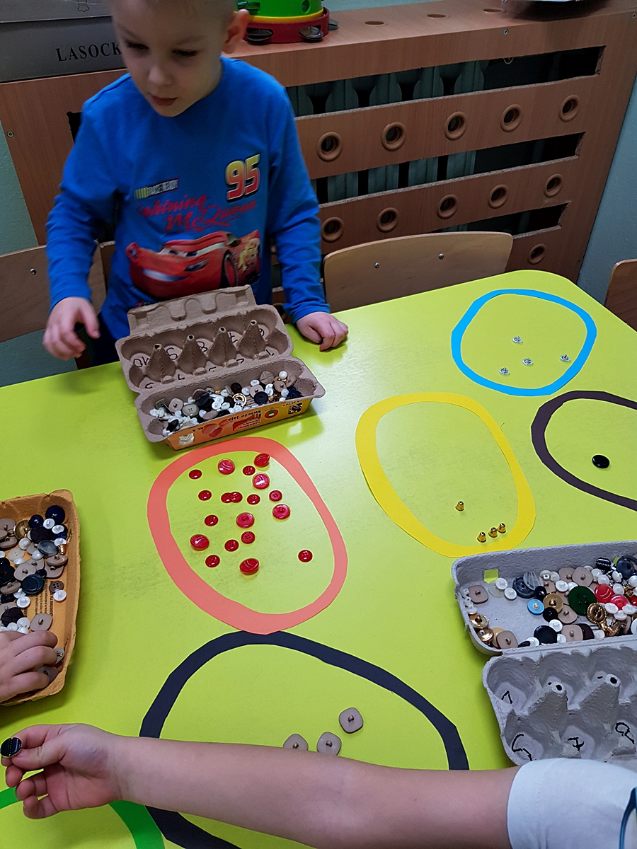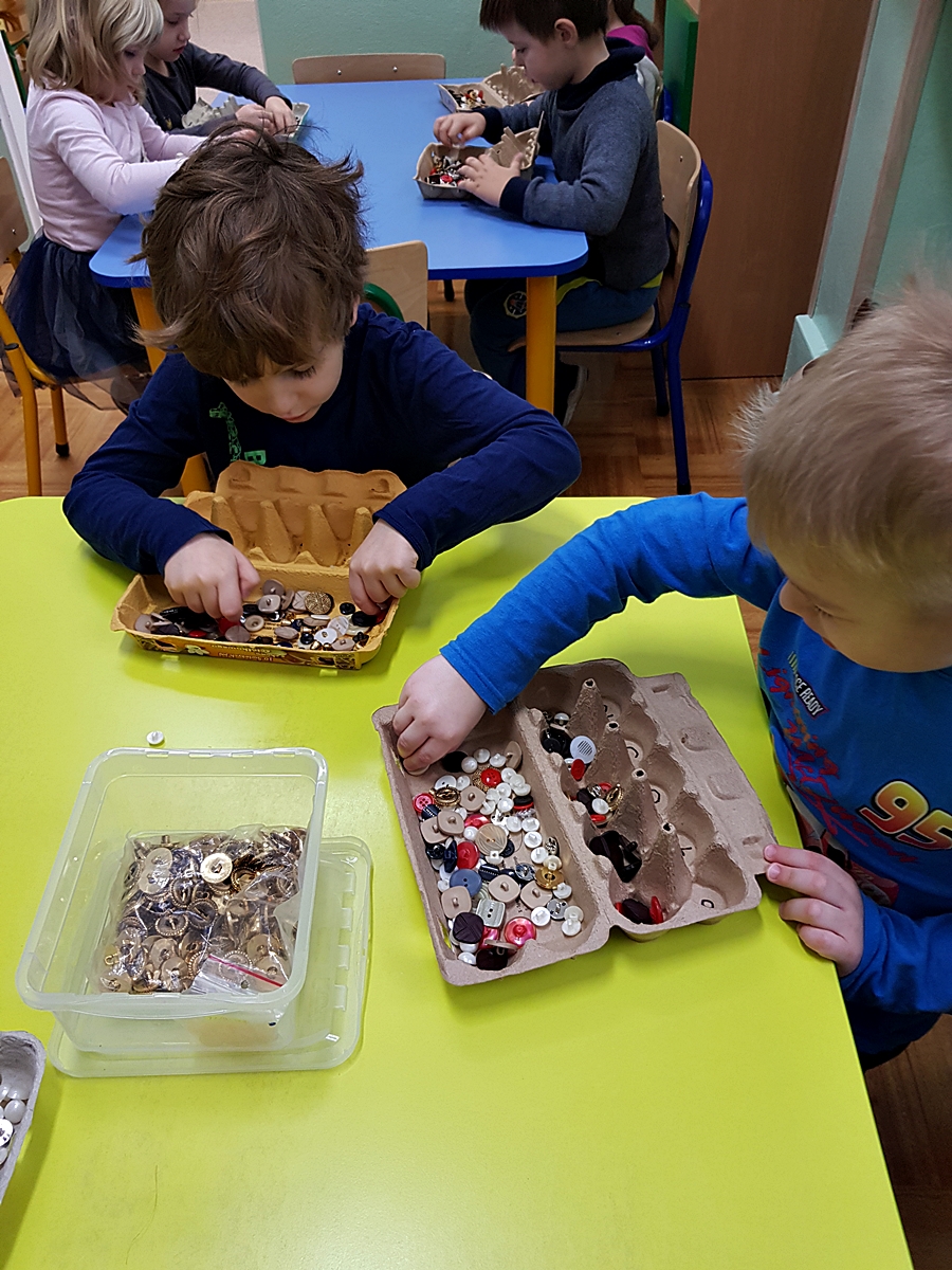 Według teorii rozwojowych autorstwa Jeana Piageta, jeśli chodzi o rozwój zdolności umysłowych u dzieci, treści myślenia na przedszkolnym etapie kształcenia powinny być oparte w największej mierze na konkretach, gdyż w tym wieku dominuje myślenie konkretno-wyobrażeniowe. Guziki potrafią wywołać u dzieci zaciekawienie, pomysłowość, ekspresję twórczą. Guziki są przeróżne: małe, duże, o rożnych dziwnych kształtach, jednobarwne, różnokolorowe, obciągnięte materiałem, metalowe, plastikowe, płaskie, wypukłe. Tym razem wykorzystaliśmy je właśnie do zabaw matematycznych– ćwiczyliśmy stosunki przestrzenne, klasyfikację np. „Gdzie jest guzik?” „Guzikowe rytmy”, „”Ile mam dziurek?”, „Guzik do guzika” .,,Gdzie jest więcej?” „,Ile guzików potrzebujesz „itp. Im sprawniej dziecko segreguje, klasyfikuje i podporządkowuje, tym łatwiej mu zrozumieć rzeczywistość, zaprowadzać w niej ład i ją nazywać. Klasyfikacja na poziomie operacyjnym różni się od wcześniejszych rozwojowo sposobów segregowania (np. według kolorów) i porządkowania (np. od najmniejszego do największego) przedmiotów. Cechują ją:
