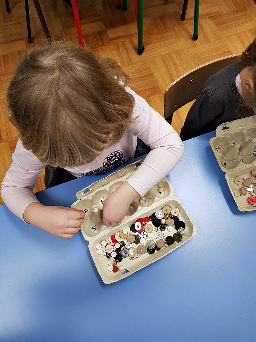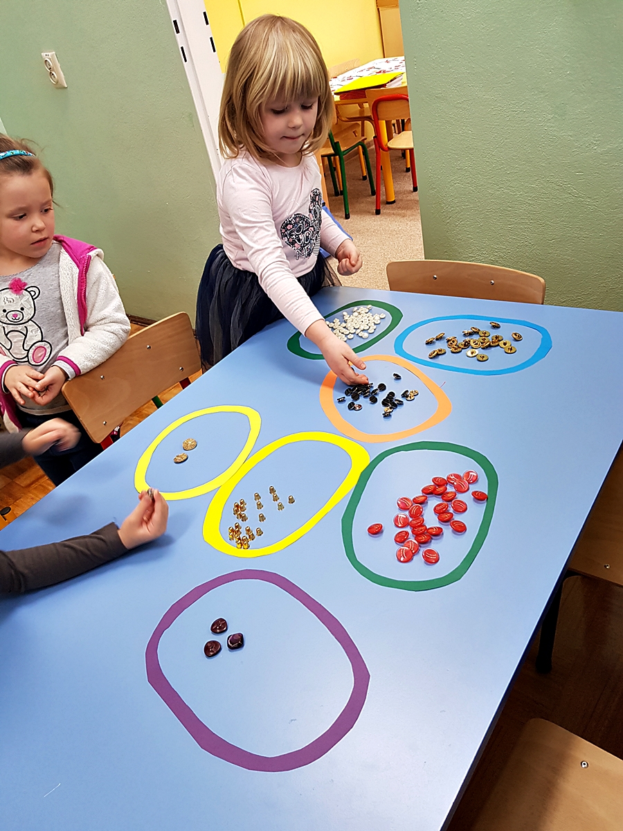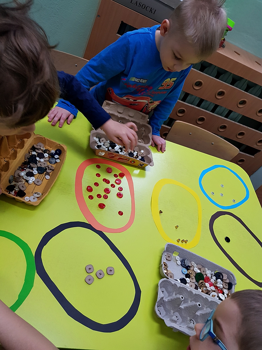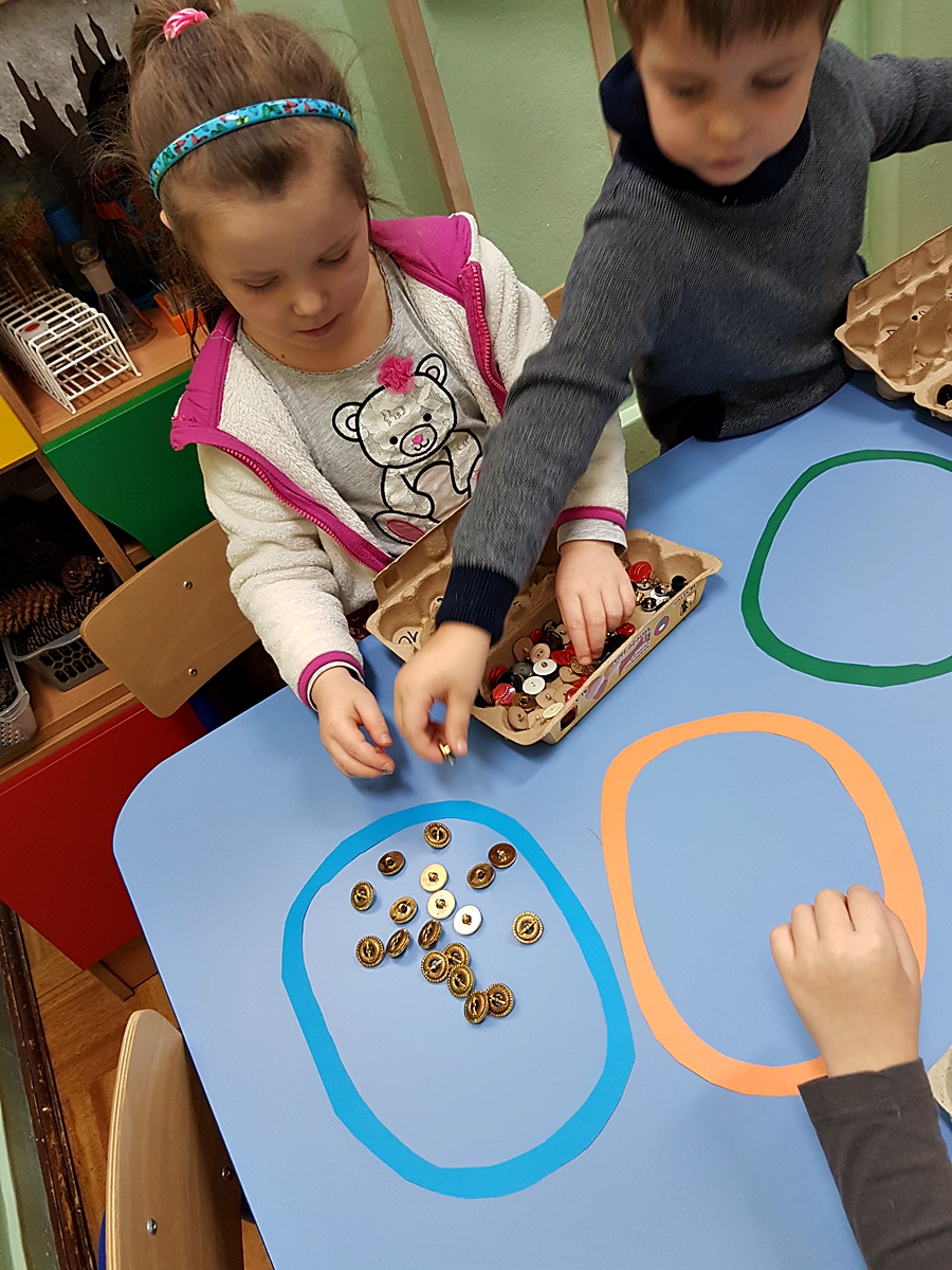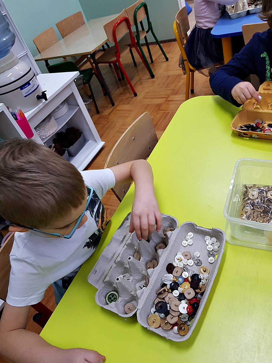 Według teorii rozwojowych autorstwa Jeana Piageta, jeśli chodzi o rozwój zdolności umysłowych u dzieci, treści myślenia na przedszkolnym etapie kształcenia powinny być oparte w największej mierze na konkretach, gdyż w tym wieku dominuje myślenie konkretno-wyobrażeniowe. Guziki potrafią wywołać u dzieci zaciekawienie, pomysłowość, ekspresję twórczą. Guziki są przeróżne: małe, duże, o rożnych dziwnych kształtach, jednobarwne, różnokolorowe, obciągnięte materiałem, metalowe, plastikowe, płaskie, wypukłe. Tym razem wykorzystaliśmy je właśnie do zabaw matematycznych– ćwiczyliśmy stosunki przestrzenne, klasyfikację np. „Gdzie jest guzik?” „Guzikowe rytmy”, „”Ile mam dziurek?”, „Guzik do guzika” .,,Gdzie jest więcej?” „,Ile guzików potrzebujesz „itp. Im sprawniej dziecko segreguje, klasyfikuje i podporządkowuje, tym łatwiej mu zrozumieć rzeczywistość, zaprowadzać w niej ład i ją nazywać. Klasyfikacja na poziomie operacyjnym różni się od wcześniejszych rozwojowo sposobów segregowania (np. według kolorów) i porządkowania (np. od najmniejszego do największego) przedmiotów. Cechują ją: