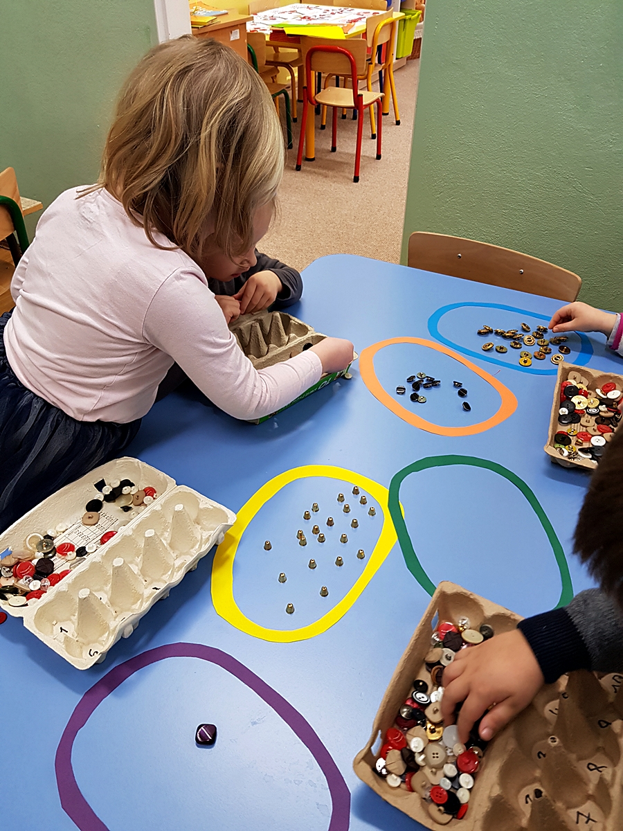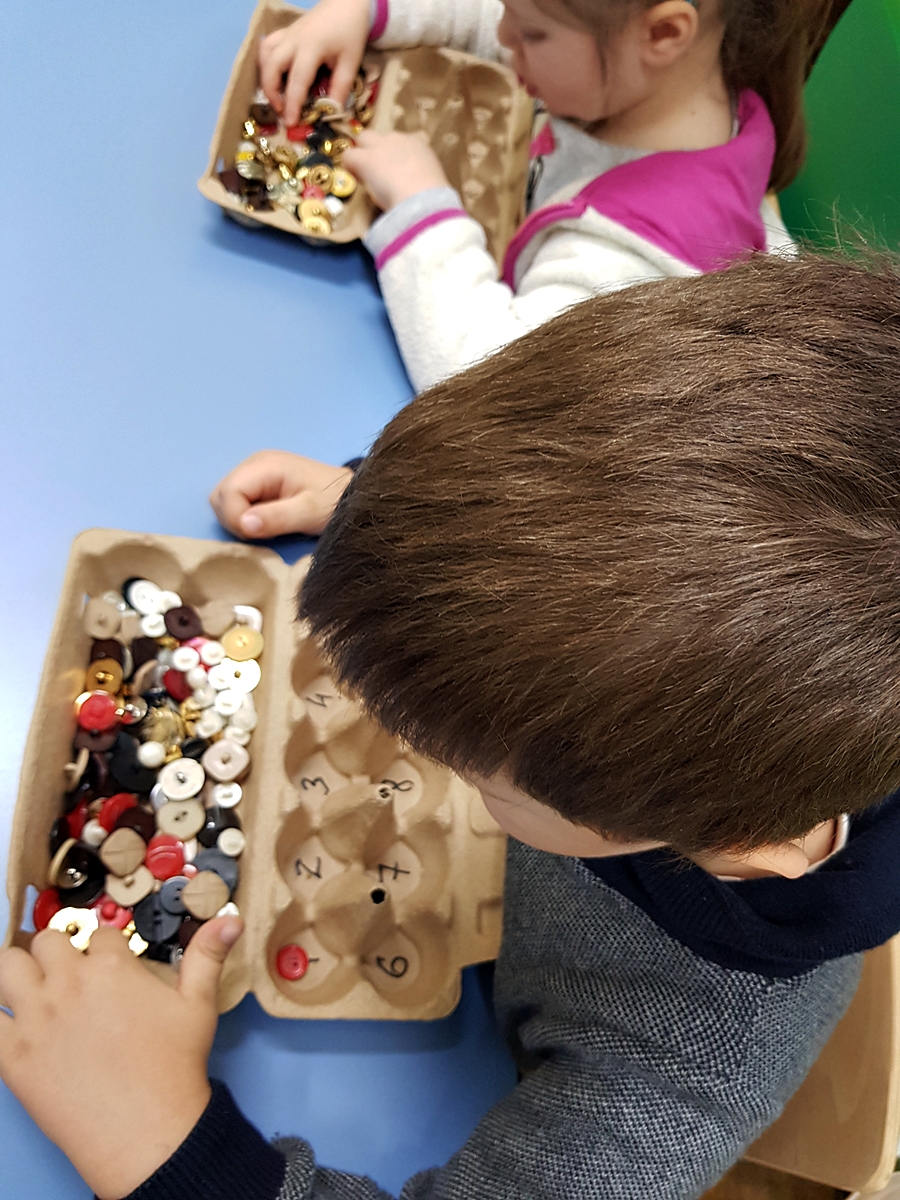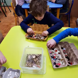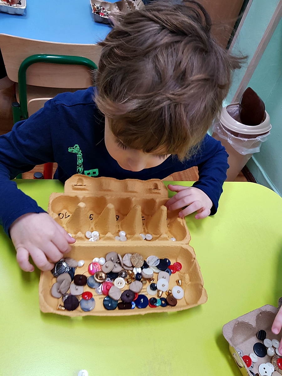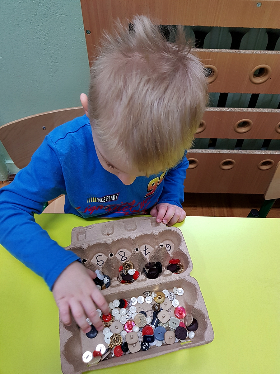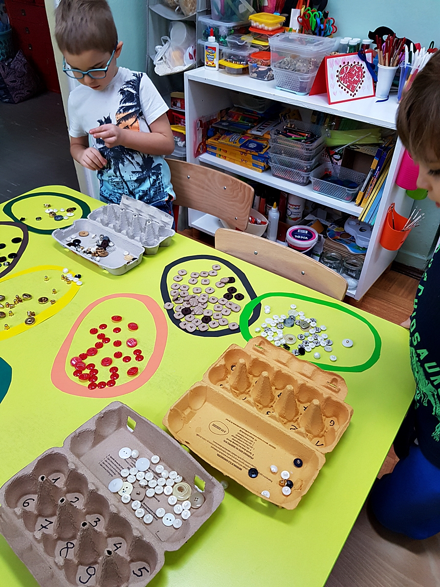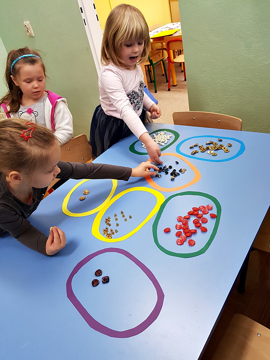 Według teorii rozwojowych autorstwa Jeana Piageta, jeśli chodzi o rozwój zdolności umysłowych u dzieci, treści myślenia na przedszkolnym etapie kształcenia powinny być oparte w największej mierze na konkretach, gdyż w tym wieku dominuje myślenie konkretno-wyobrażeniowe. Guziki potrafią wywołać u dzieci zaciekawienie, pomysłowość, ekspresję twórczą. Guziki są przeróżne: małe, duże, o rożnych dziwnych kształtach, jednobarwne, różnokolorowe, obciągnięte materiałem, metalowe, plastikowe, płaskie, wypukłe. Tym razem wykorzystaliśmy je właśnie do zabaw matematycznych– ćwiczyliśmy stosunki przestrzenne, klasyfikację np. „Gdzie jest guzik?” „Guzikowe rytmy”, „”Ile mam dziurek?”, „Guzik do guzika” .,,Gdzie jest więcej?” „,Ile guzików potrzebujesz „itp. Im sprawniej dziecko segreguje, klasyfikuje i podporządkowuje, tym łatwiej mu zrozumieć rzeczywistość, zaprowadzać w niej ład i ją nazywać. Klasyfikacja na poziomie operacyjnym różni się od wcześniejszych rozwojowo sposobów segregowania (np. według kolorów) i porządkowania (np. od najmniejszego do największego) przedmiotów. Cechują ją: