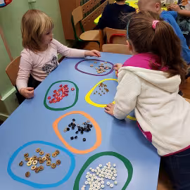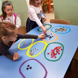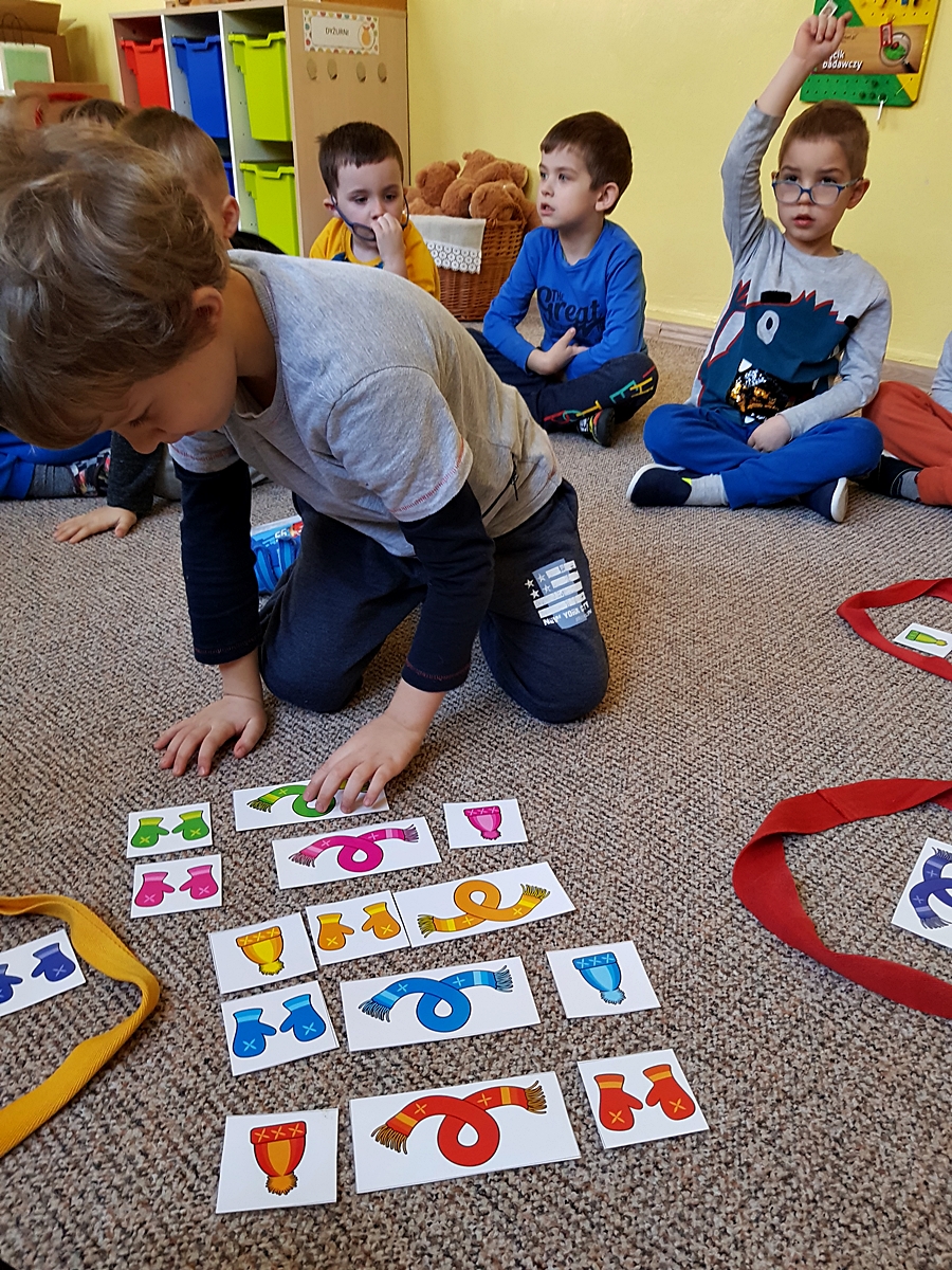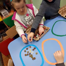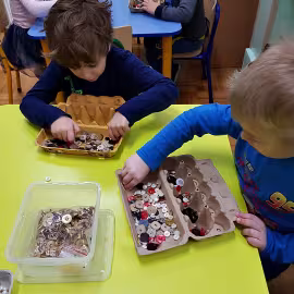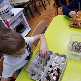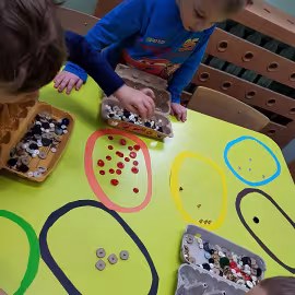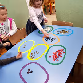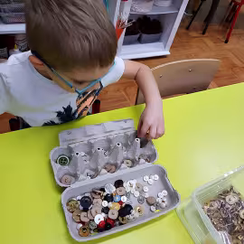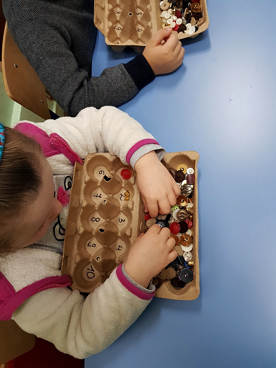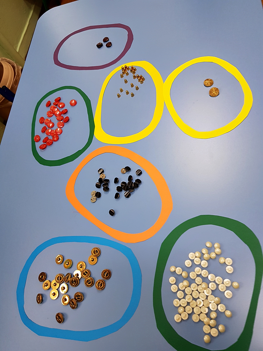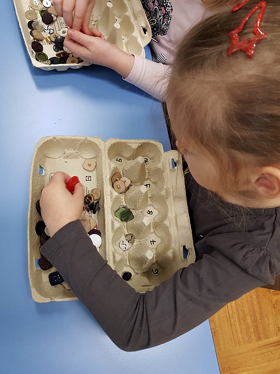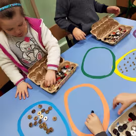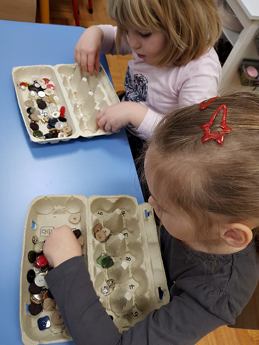 Według teorii rozwojowych autorstwa Jeana Piageta, jeśli chodzi o rozwój zdolności umysłowych u dzieci, treści myślenia na przedszkolnym etapie kształcenia powinny być oparte w największej mierze na konkretach, gdyż w tym wieku dominuje myślenie konkretno-wyobrażeniowe. Guziki potrafią wywołać u dzieci zaciekawienie, pomysłowość, ekspresję twórczą. Guziki są przeróżne: małe, duże, o rożnych dziwnych kształtach, jednobarwne, różnokolorowe, obciągnięte materiałem, metalowe, plastikowe, płaskie, wypukłe. Tym razem wykorzystaliśmy je właśnie do zabaw matematycznych– ćwiczyliśmy stosunki przestrzenne, klasyfikację np. „Gdzie jest guzik?” „Guzikowe rytmy”, „”Ile mam dziurek?”, „Guzik do guzika” .,,Gdzie jest więcej?” „,Ile guzików potrzebujesz „itp. Im sprawniej dziecko segreguje, klasyfikuje i podporządkowuje, tym łatwiej mu zrozumieć rzeczywistość, zaprowadzać w niej ład i ją nazywać. Klasyfikacja na poziomie operacyjnym różni się od wcześniejszych rozwojowo sposobów segregowania (np. według kolorów) i porządkowania (np. od najmniejszego do największego) przedmiotów. Cechują ją: