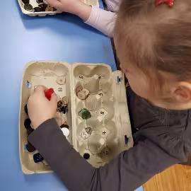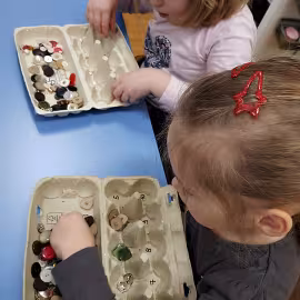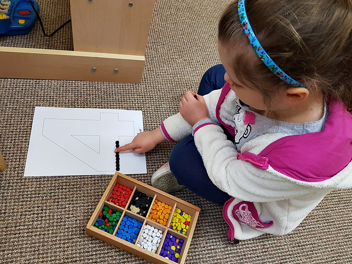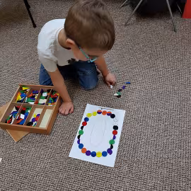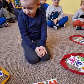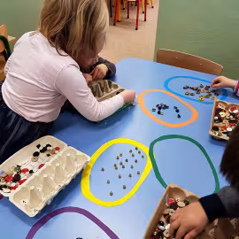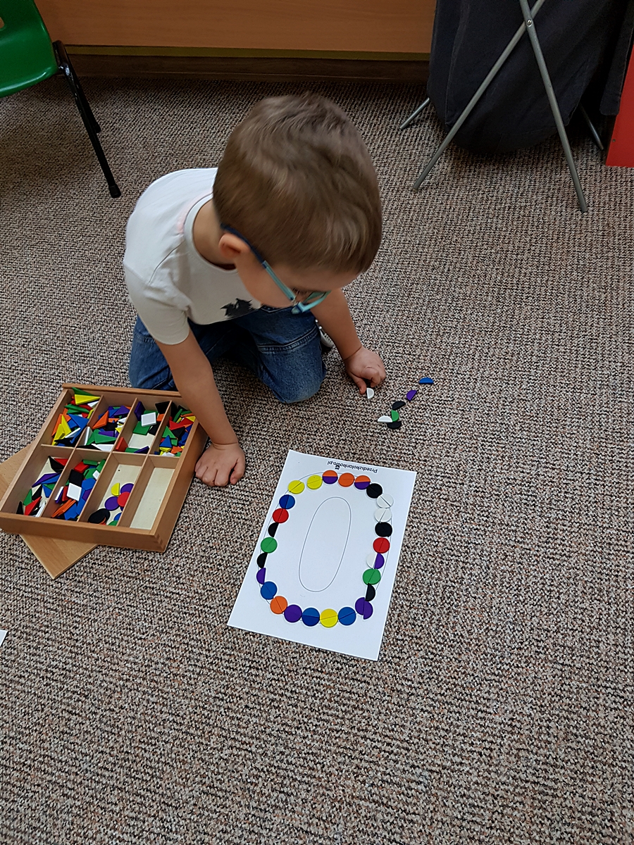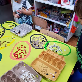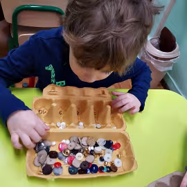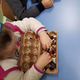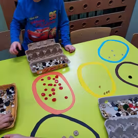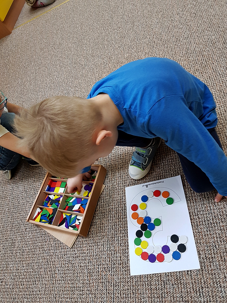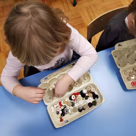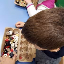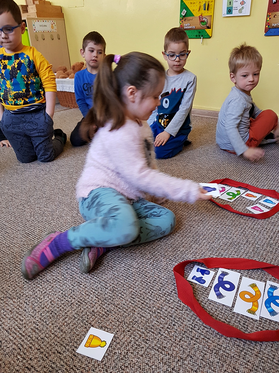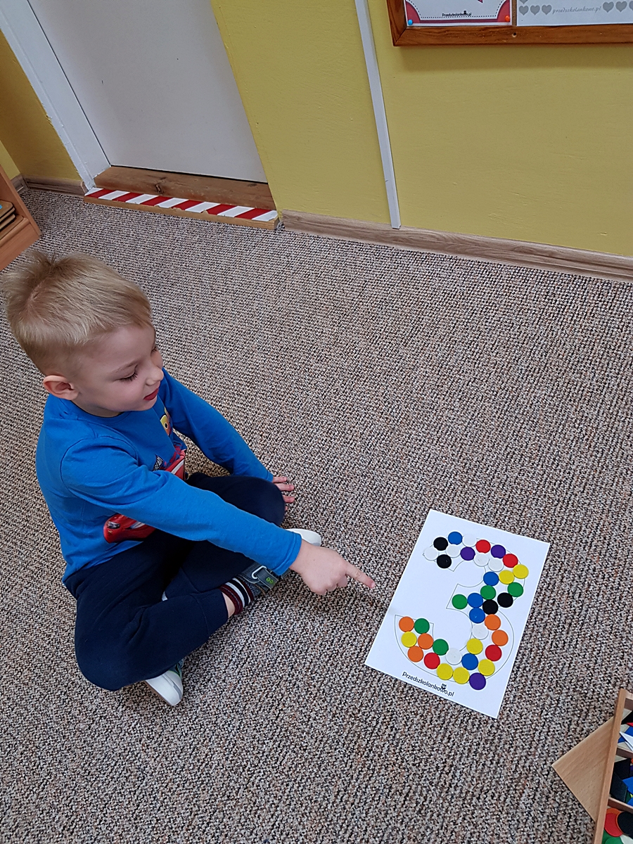 Według teorii rozwojowych autorstwa Jeana Piageta, jeśli chodzi o rozwój zdolności umysłowych u dzieci, treści myślenia na przedszkolnym etapie kształcenia powinny być oparte w największej mierze na konkretach, gdyż w tym wieku dominuje myślenie konkretno-wyobrażeniowe. Guziki potrafią wywołać u dzieci zaciekawienie, pomysłowość, ekspresję twórczą. Guziki są przeróżne: małe, duże, o rożnych dziwnych kształtach, jednobarwne, różnokolorowe, obciągnięte materiałem, metalowe, plastikowe, płaskie, wypukłe. Tym razem wykorzystaliśmy je właśnie do zabaw matematycznych– ćwiczyliśmy stosunki przestrzenne, klasyfikację np. „Gdzie jest guzik?” „Guzikowe rytmy”, „”Ile mam dziurek?”, „Guzik do guzika” .,,Gdzie jest więcej?” „,Ile guzików potrzebujesz „itp. Im sprawniej dziecko segreguje, klasyfikuje i podporządkowuje, tym łatwiej mu zrozumieć rzeczywistość, zaprowadzać w niej ład i ją nazywać. Klasyfikacja na poziomie operacyjnym różni się od wcześniejszych rozwojowo sposobów segregowania (np. według kolorów) i porządkowania (np. od najmniejszego do największego) przedmiotów. Cechują ją:
