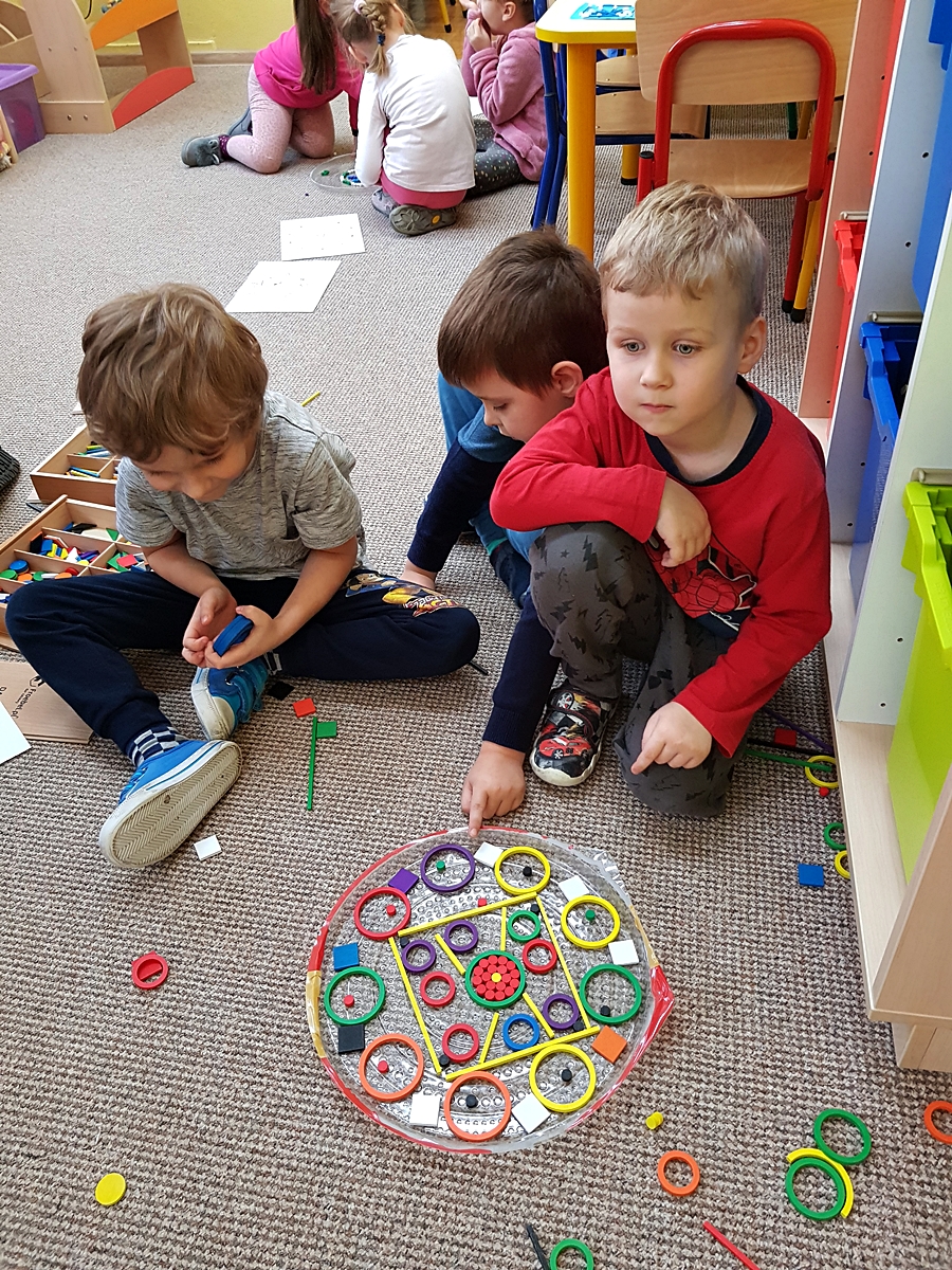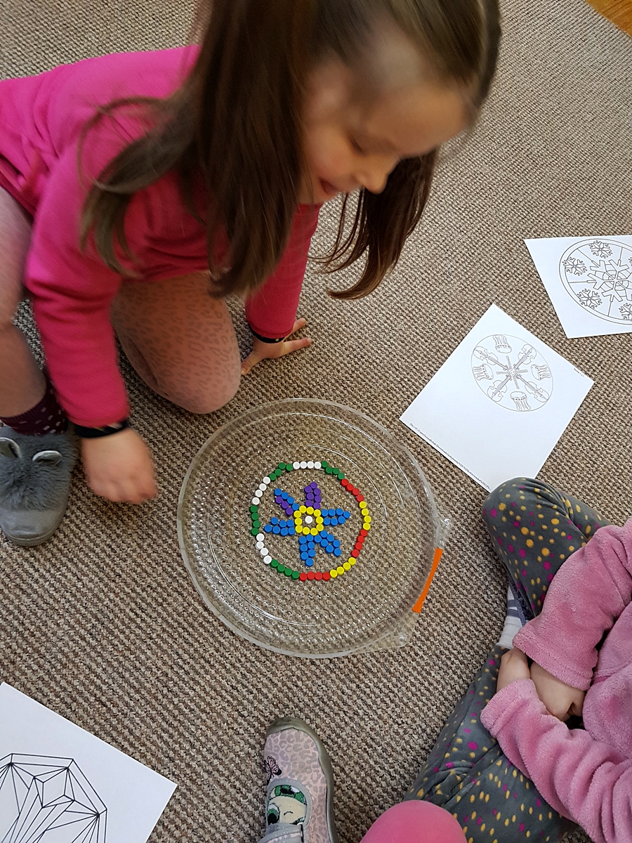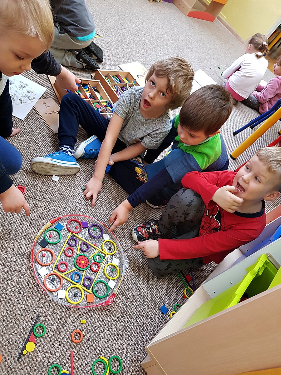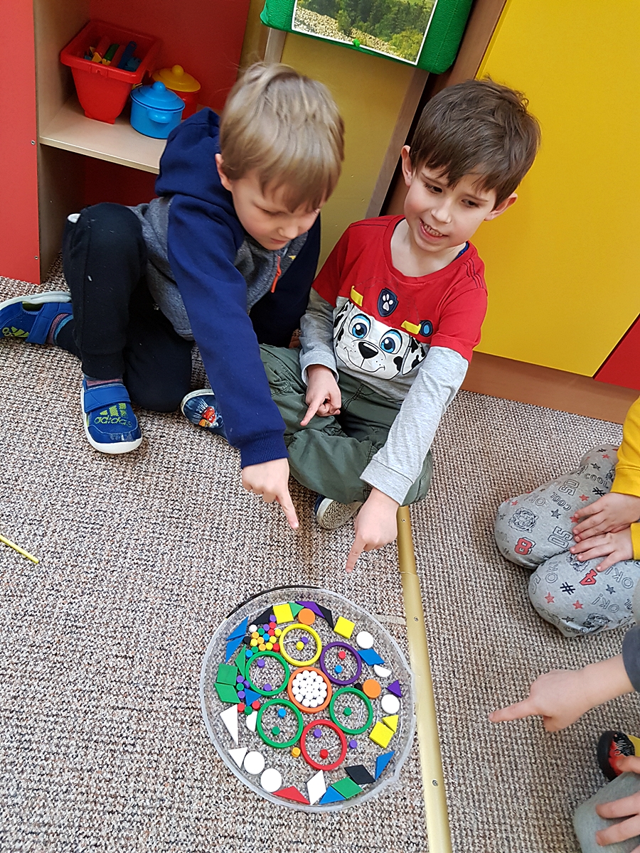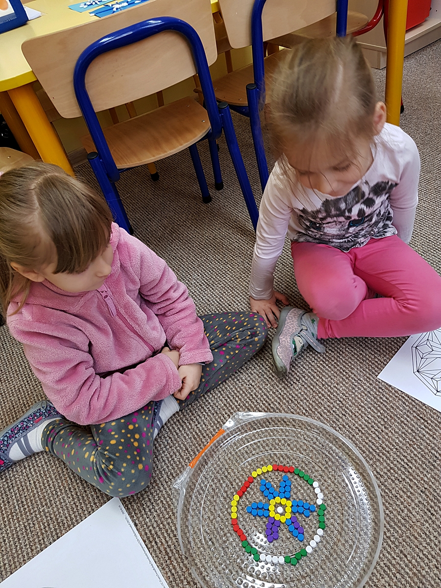 Tym razem do pracy twórczej wykorzystywaliśmy, oprócz pisaków i kredek, plasteliny, ryżu, nasze ulubione Klocki Froebla. Praca nad mandalą odbywała się w ciszy i skupieniu, przy włączonej spokojnej muzyce. Należy dodać, że specyficzna atmosfera, jaka wytworzyła się podczas tworzenia mandali, łagodziła napięcia, nieporozumienia wśród dzieci. Następnym razem chcemy zastosować tę metodę aktywizującą wyobraźnię, z wykorzystaniem sypania mandali na wzór przez tybetańskich mnichów.