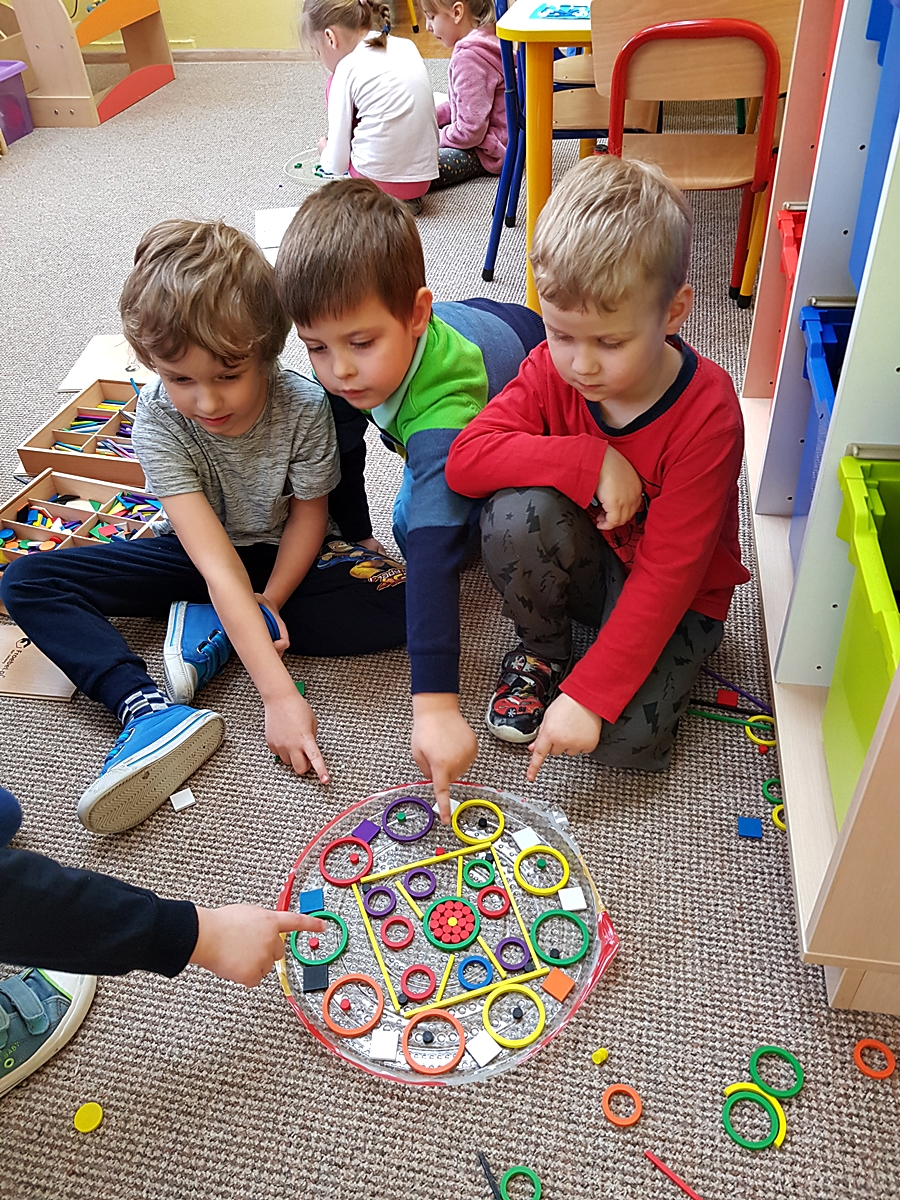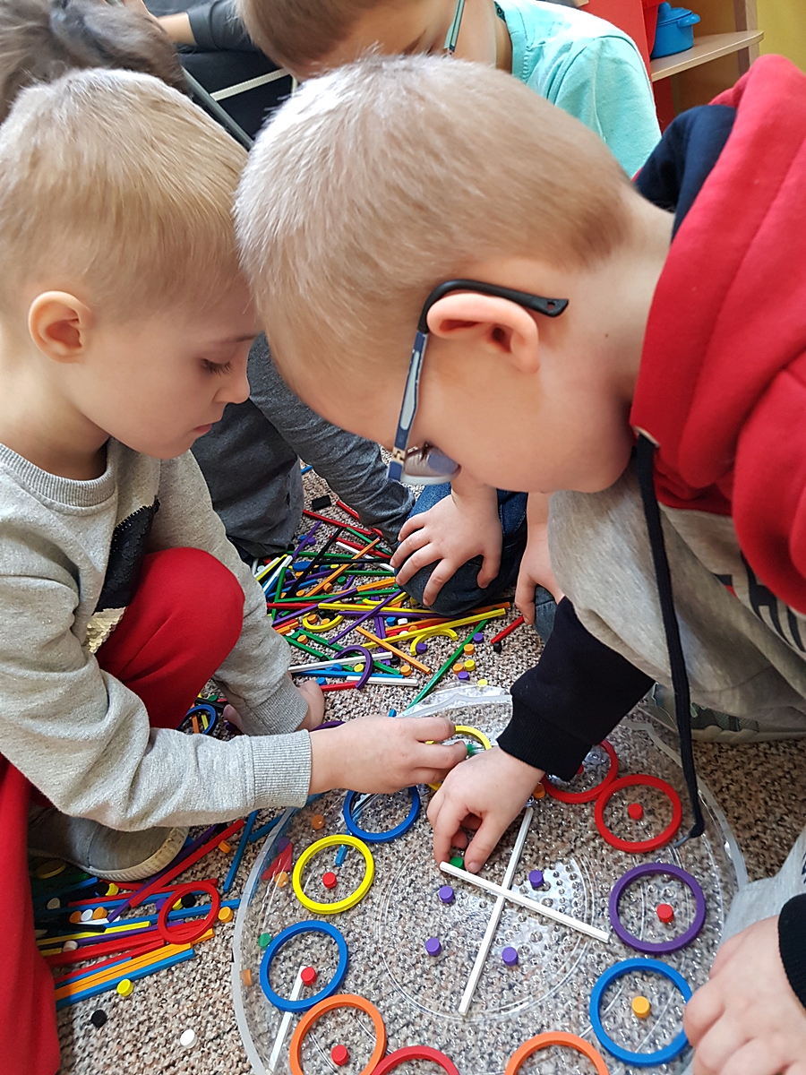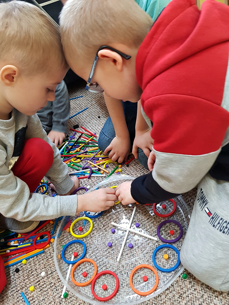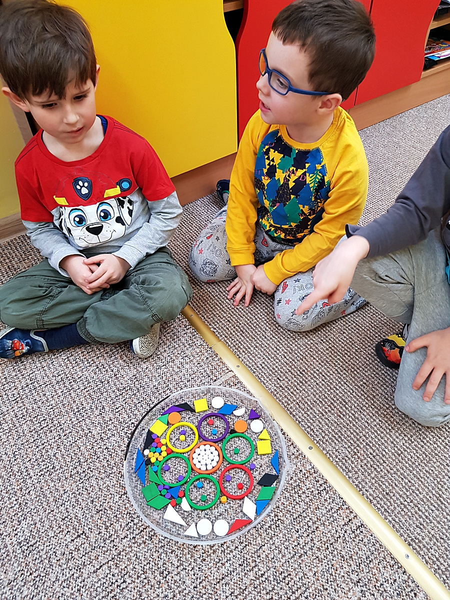 Tym razem do pracy twórczej wykorzystywaliśmy, oprócz pisaków i kredek, plasteliny, ryżu, nasze ulubione Klocki Froebla. Praca nad mandalą odbywała się w ciszy i skupieniu, przy włączonej spokojnej muzyce. Należy dodać, że specyficzna atmosfera, jaka wytworzyła się podczas tworzenia mandali, łagodziła napięcia, nieporozumienia wśród dzieci. Następnym razem chcemy zastosować tę metodę aktywizującą wyobraźnię, z wykorzystaniem sypania mandali na wzór przez tybetańskich mnichów.