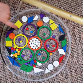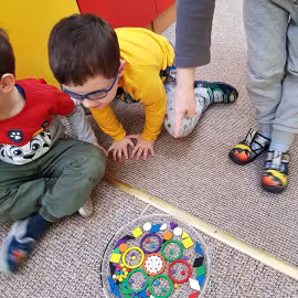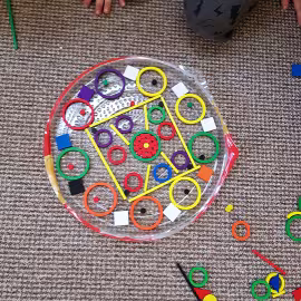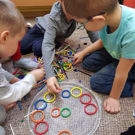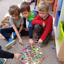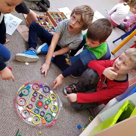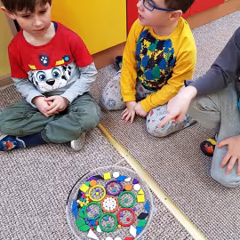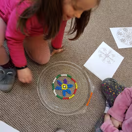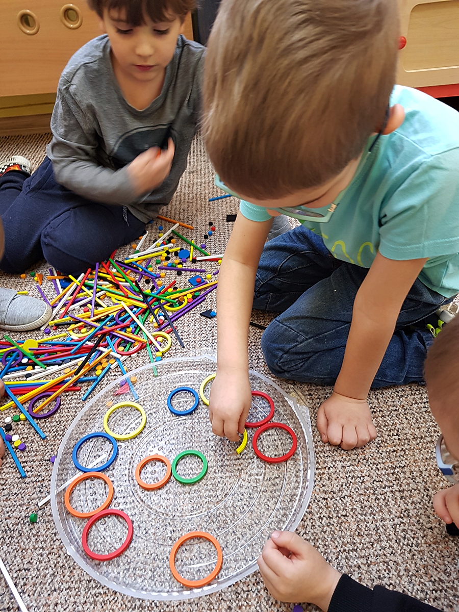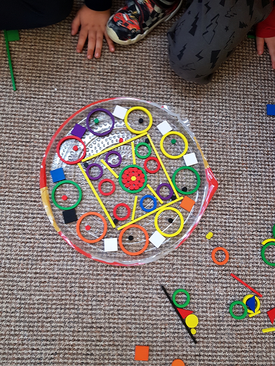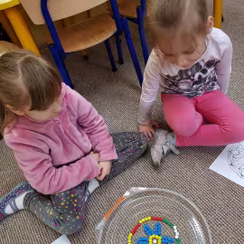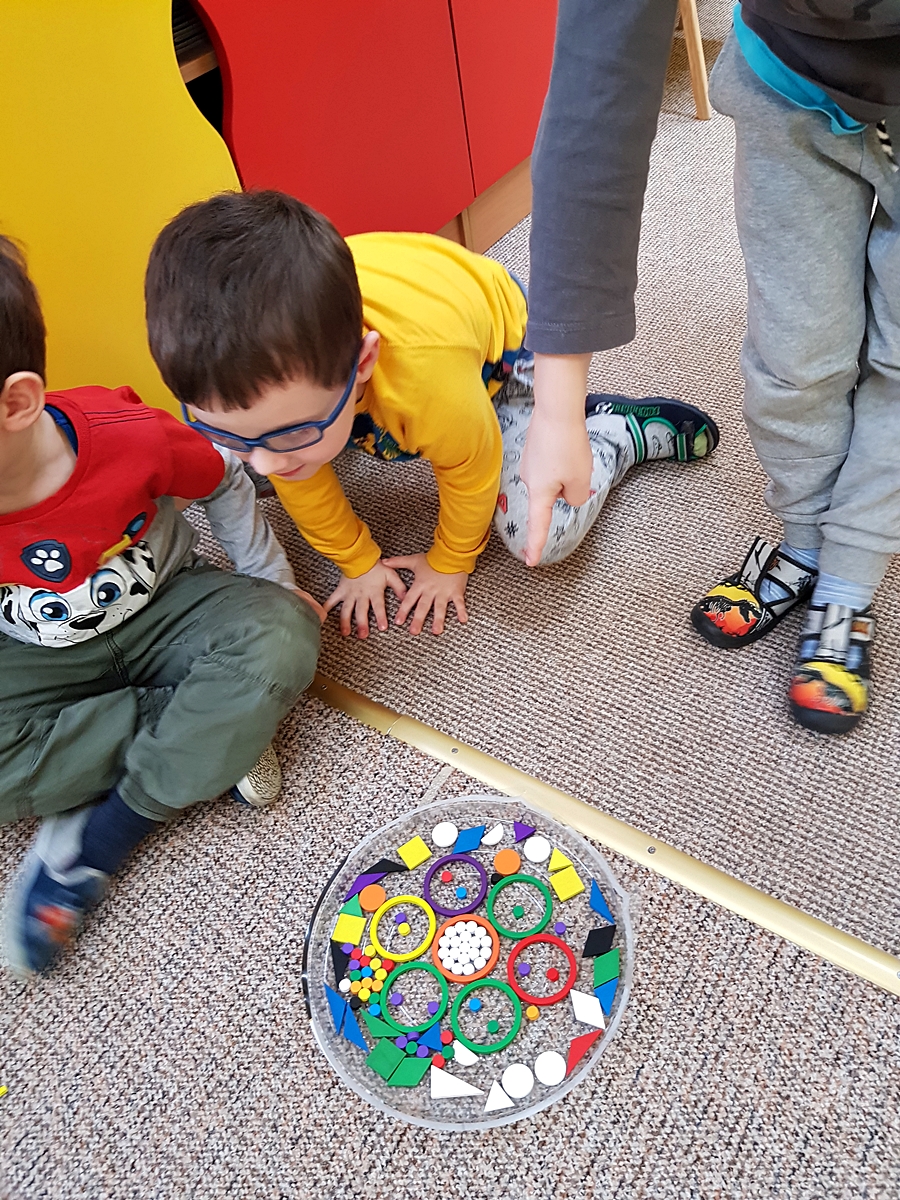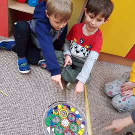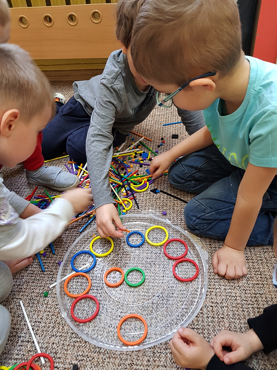 Tym razem do pracy twórczej wykorzystywaliśmy, oprócz pisaków i kredek, plasteliny, ryżu, nasze ulubione Klocki Froebla. Praca nad mandalą odbywała się w ciszy i skupieniu, przy włączonej spokojnej muzyce. Należy dodać, że specyficzna atmosfera, jaka wytworzyła się podczas tworzenia mandali, łagodziła napięcia, nieporozumienia wśród dzieci. Następnym razem chcemy zastosować tę metodę aktywizującą wyobraźnię, z wykorzystaniem sypania mandali na wzór przez tybetańskich mnichów.