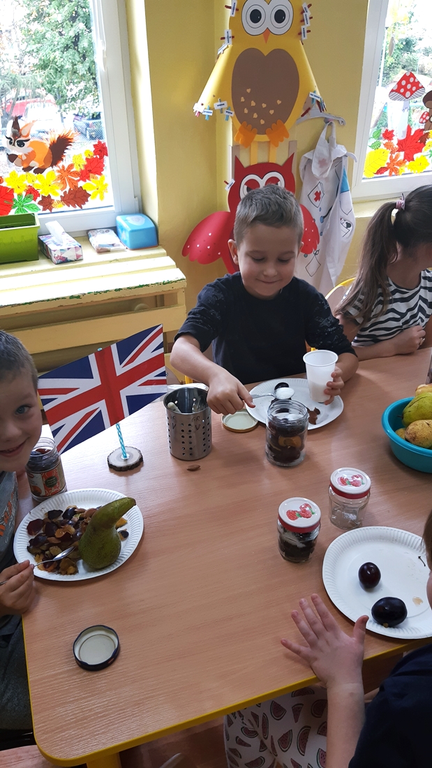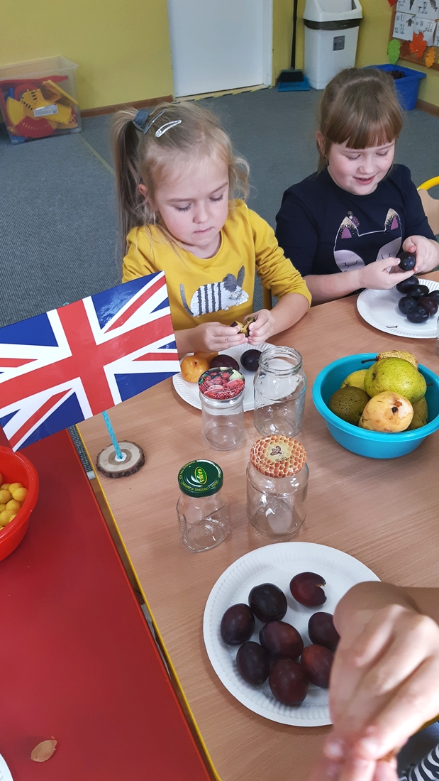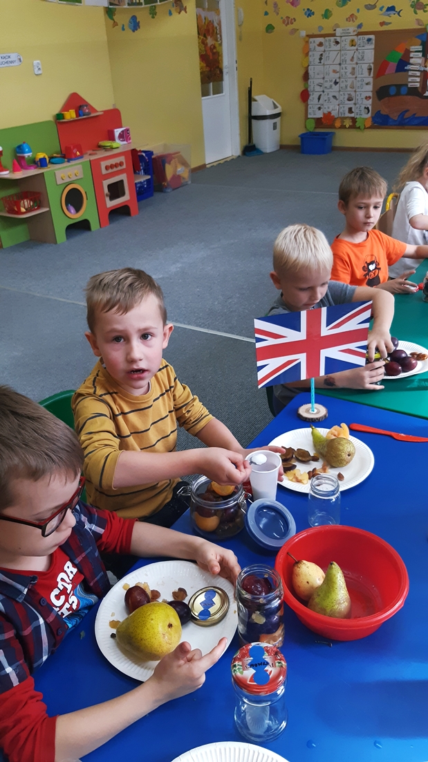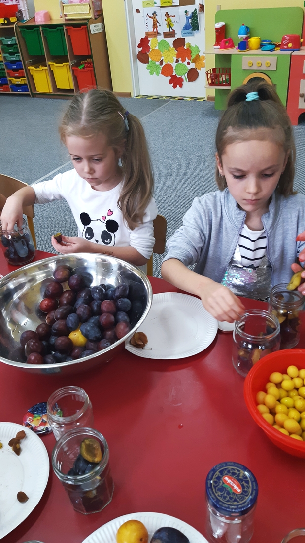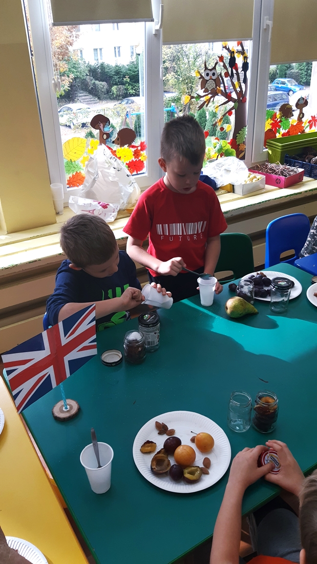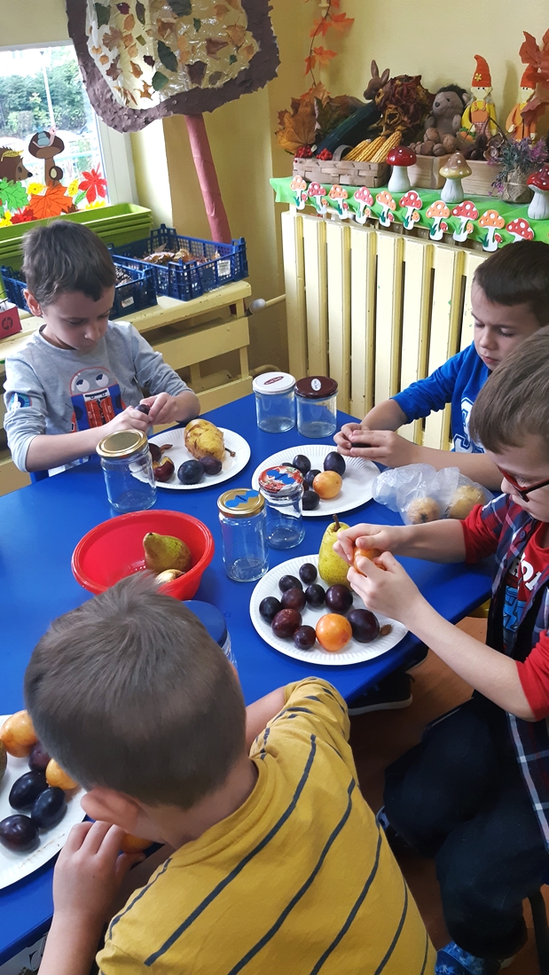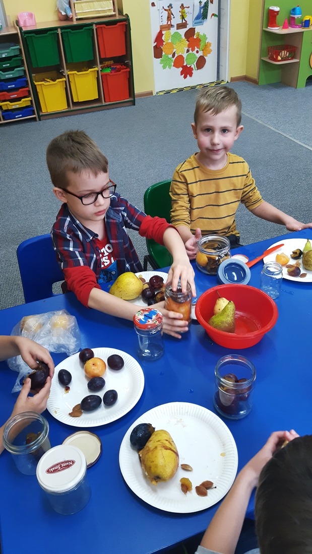Miniony tydzień upłynął nam owocowo. Jesienne sady obfitują w jabłka, gruszki i śliwki, więc wraz z przedszkolakami postanowiliśmy zrobić z nich przetwory – kompoty owocowe. Najpierw obejrzeliśmy film edukacyjny pt. „Zakręcone owoce”, następnie omówiliśmy krok po kroku zasady wykonywania kompotów owocowych, również w języku angielskim. Następnie przystąpiliśmy do działania. Nasze kompoty będą prawdziwym przysmakiem na zimowe dni w przedszkolu!