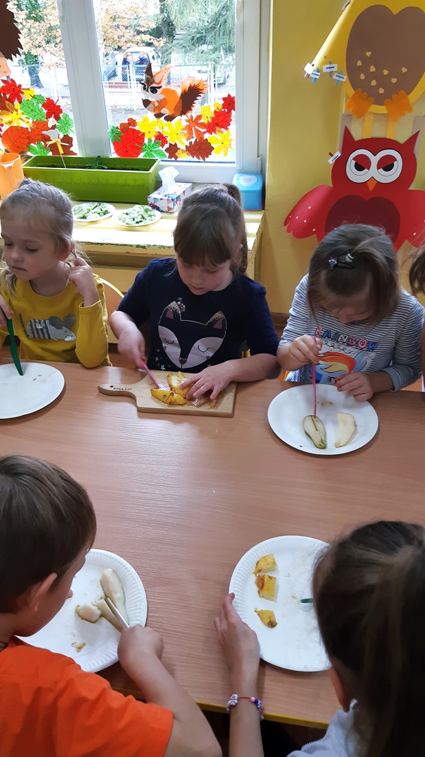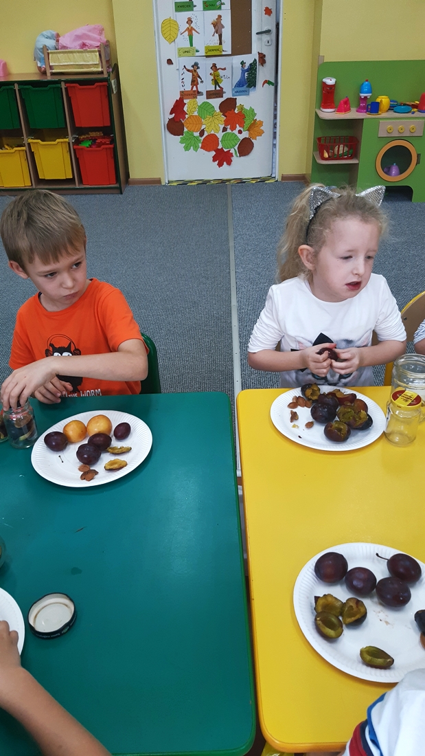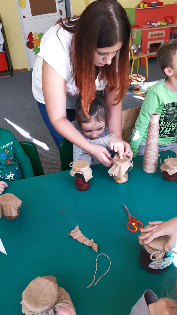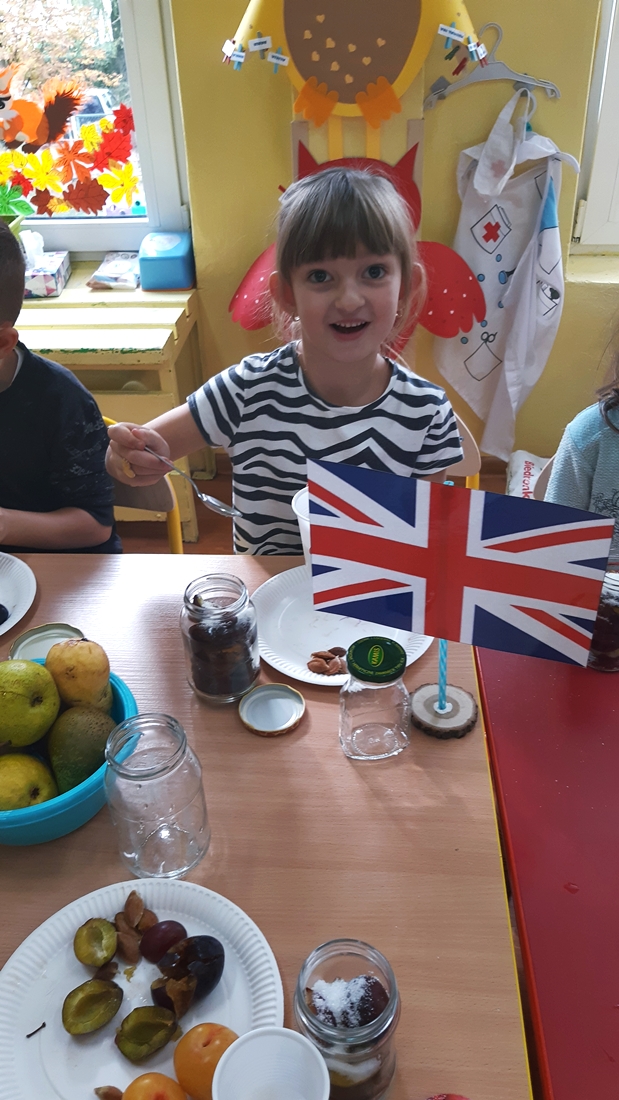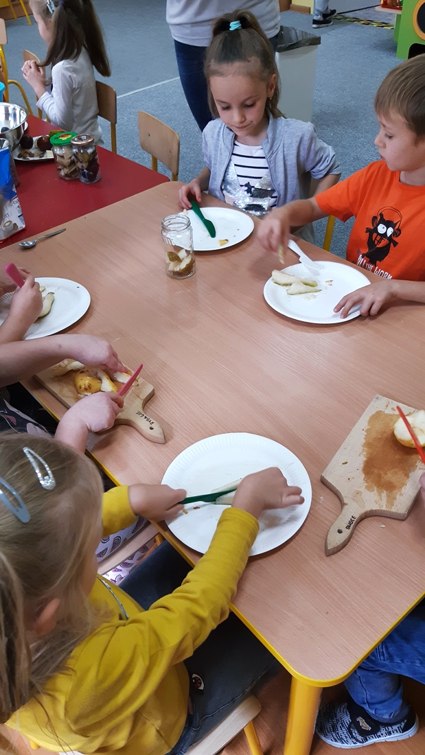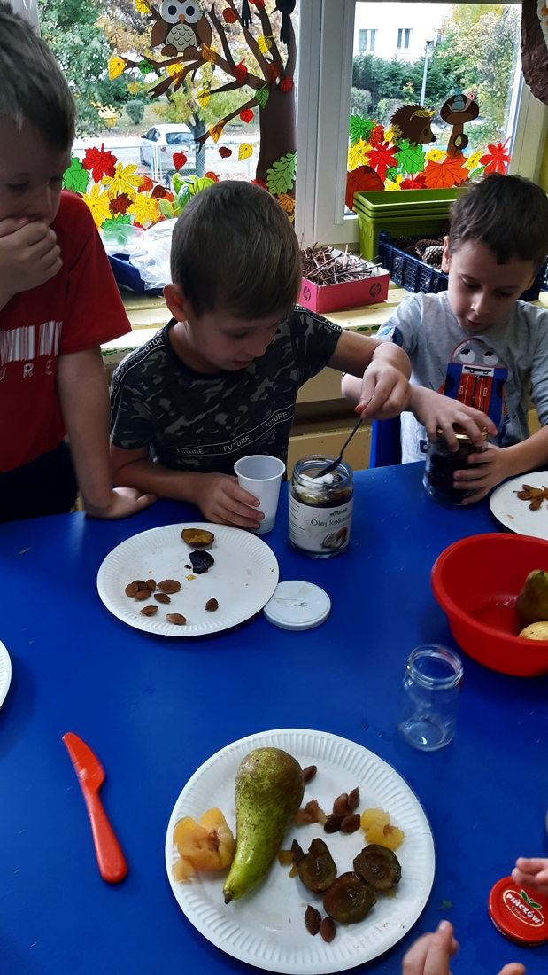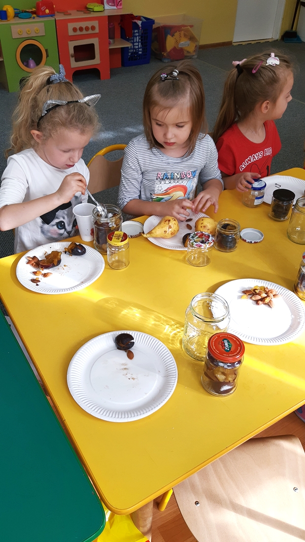 Miniony tydzień upłynął nam owocowo. Jesienne sady obfitują w jabłka, gruszki i śliwki, więc wraz z przedszkolakami postanowiliśmy zrobić z nich przetwory – kompoty owocowe. Najpierw obejrzeliśmy film edukacyjny pt. „Zakręcone owoce”, następnie omówiliśmy krok po kroku zasady wykonywania kompotów owocowych, również w języku angielskim. Następnie przystąpiliśmy do działania. Nasze kompoty będą prawdziwym przysmakiem na zimowe dni w przedszkolu!