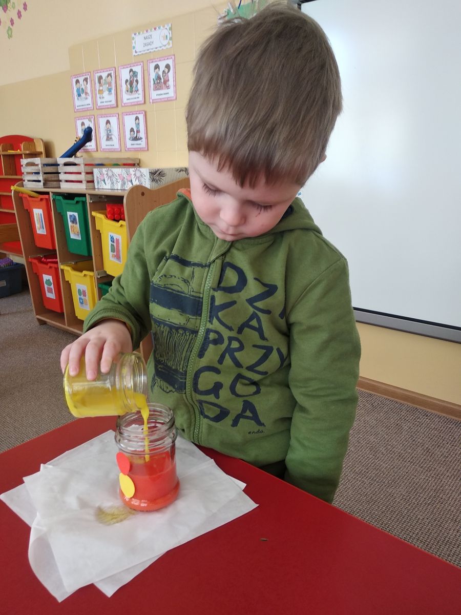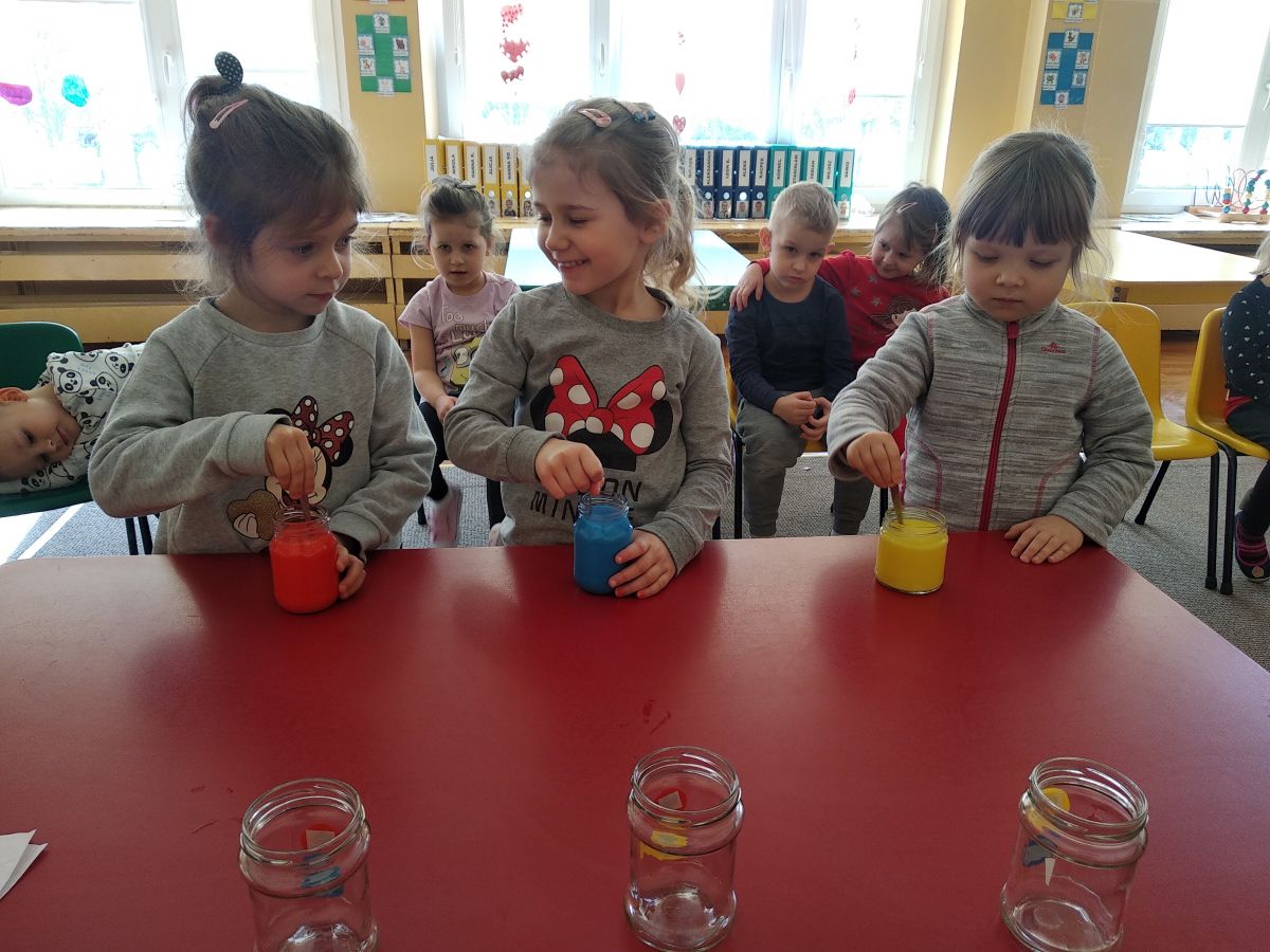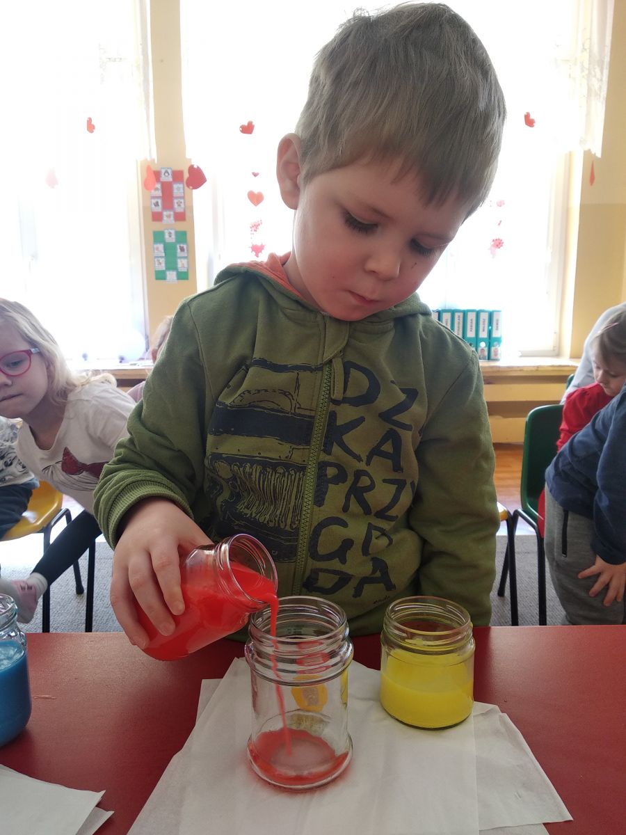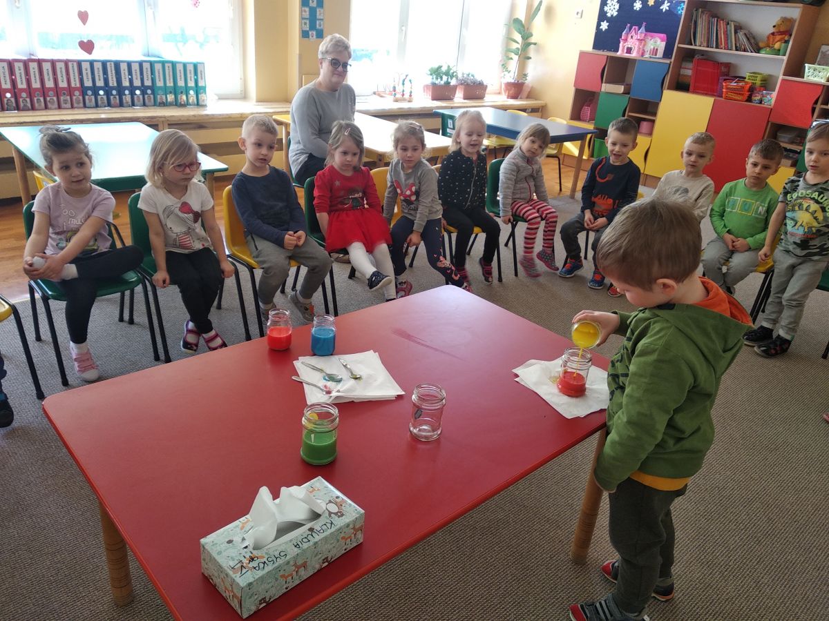 Dzieci z grupy V na przekór zimowej pogodzie postanowiły odszukać odpowiedzi na pytanie: "Jak powstają kolorowry?". W tym celu przedszkolaki wybrały się do " laboratorium kolorów", gdzie poznały jak powstają kolory i później same mieszały ze sobą różne barwy.
