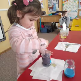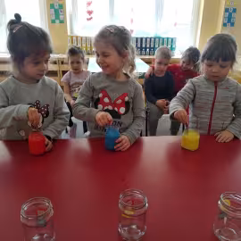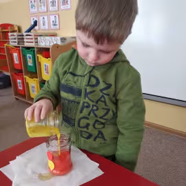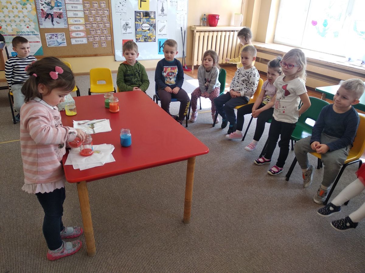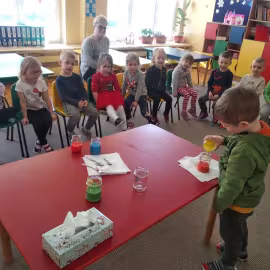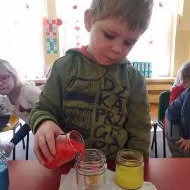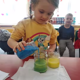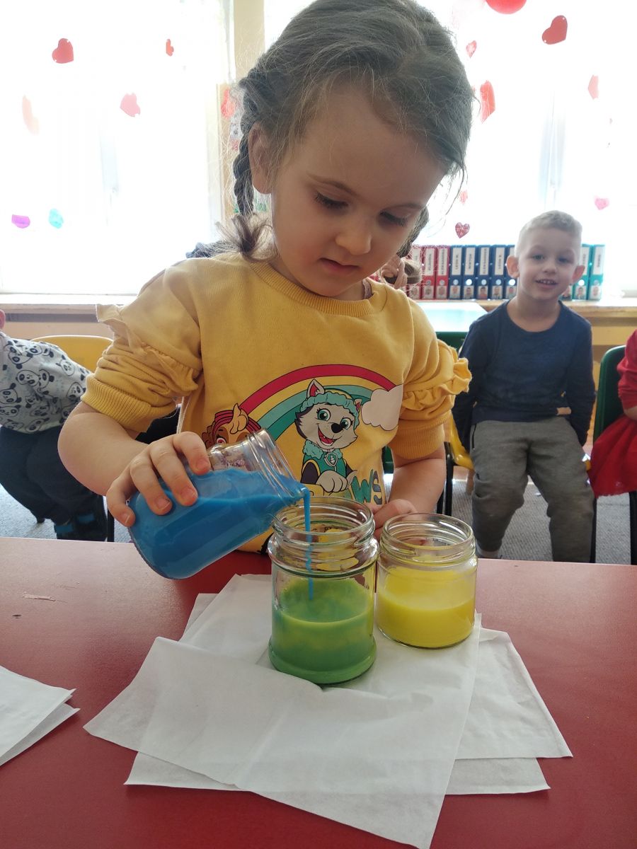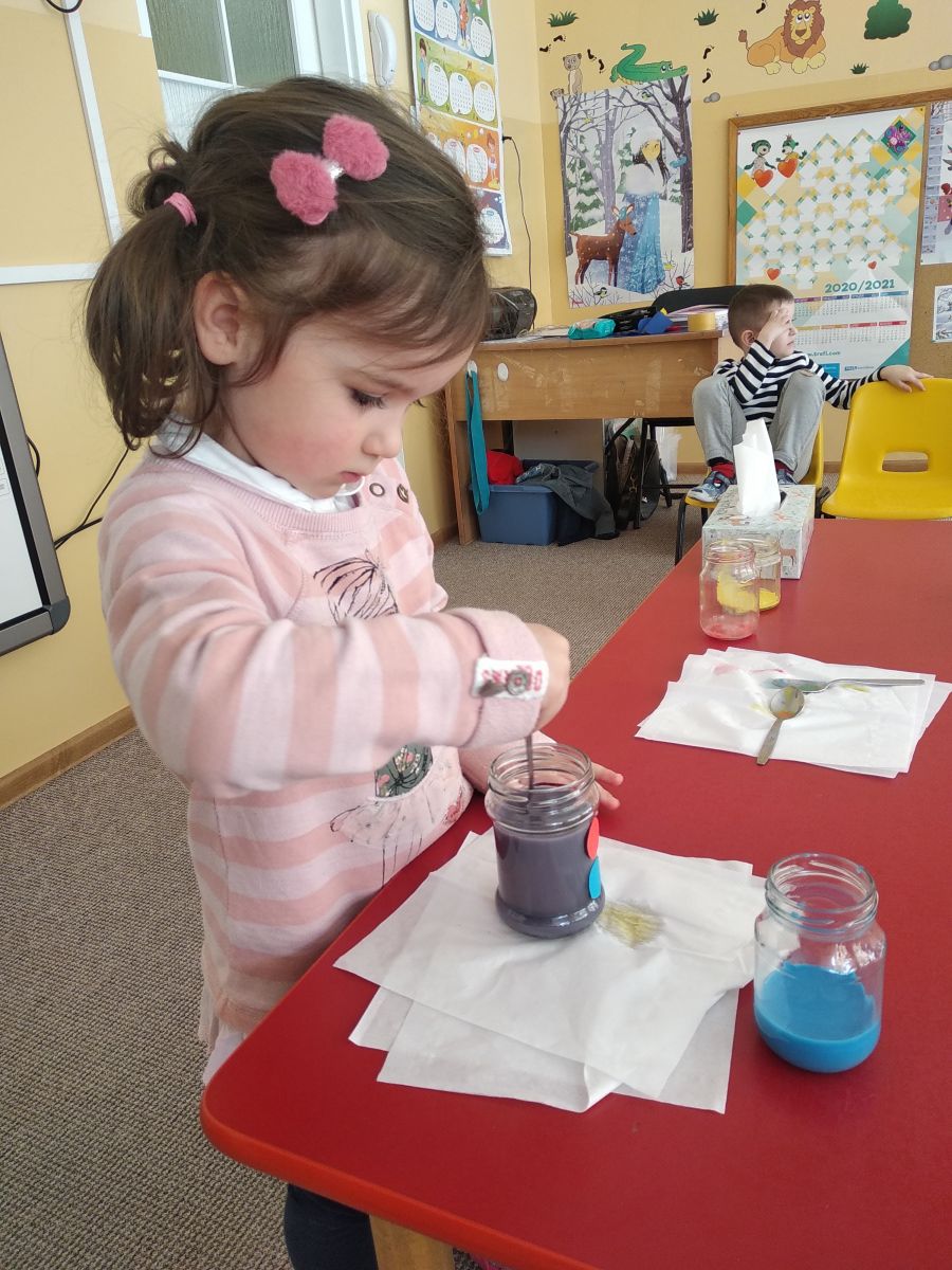 Dzieci z grupy V na przekór zimowej pogodzie postanowiły odszukać odpowiedzi na pytanie: "Jak powstają kolorowry?". W tym celu przedszkolaki wybrały się do " laboratorium kolorów", gdzie poznały jak powstają kolory i później same mieszały ze sobą różne barwy.