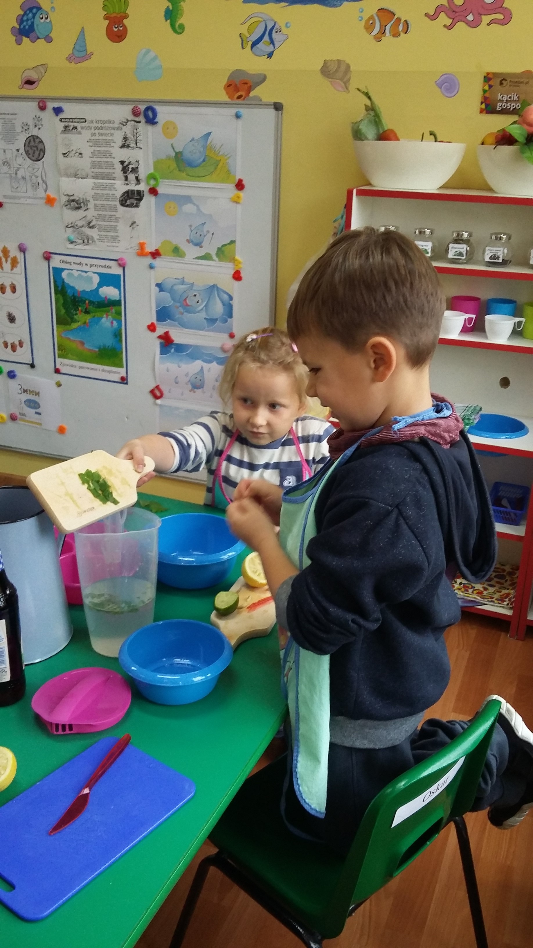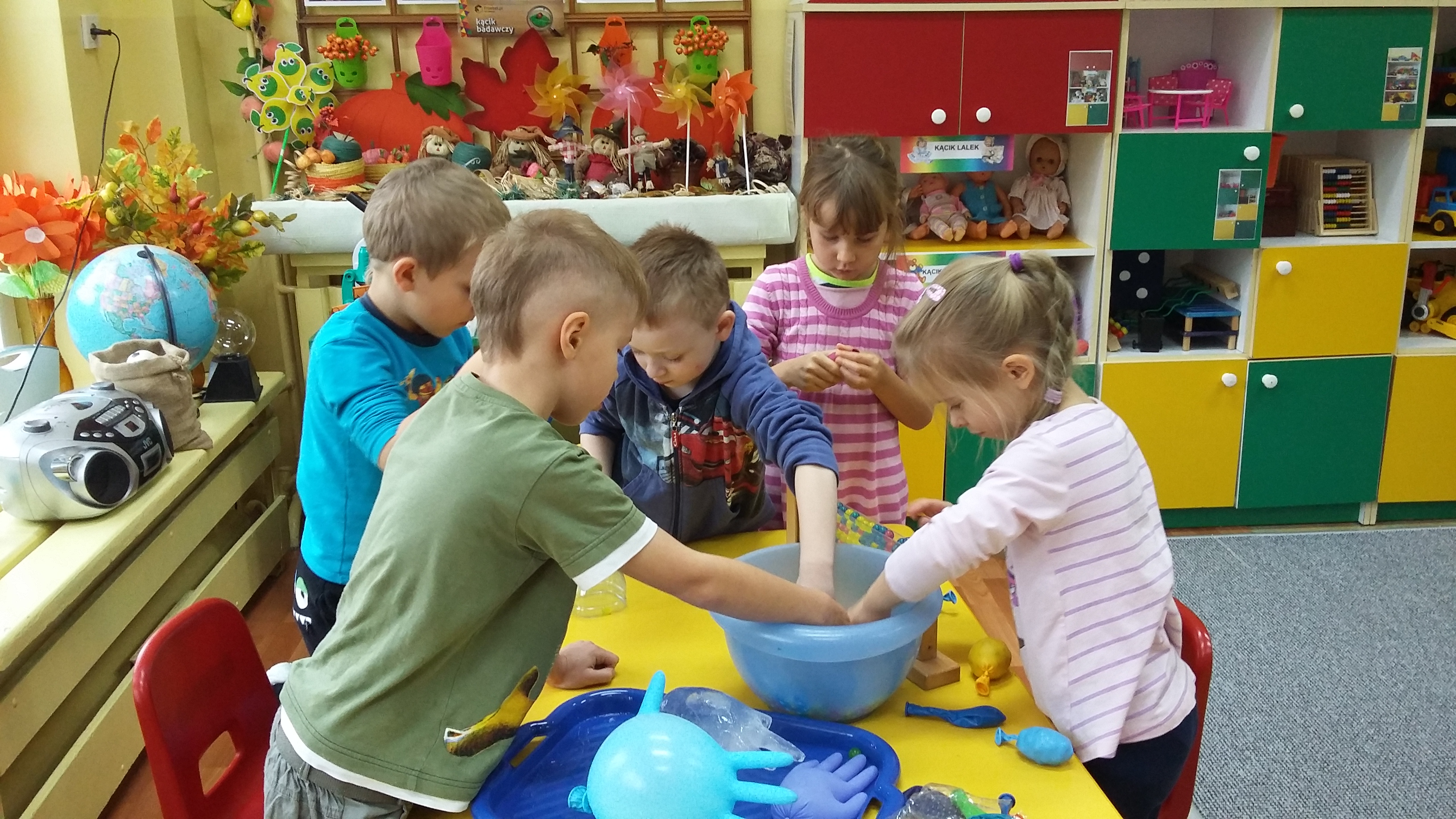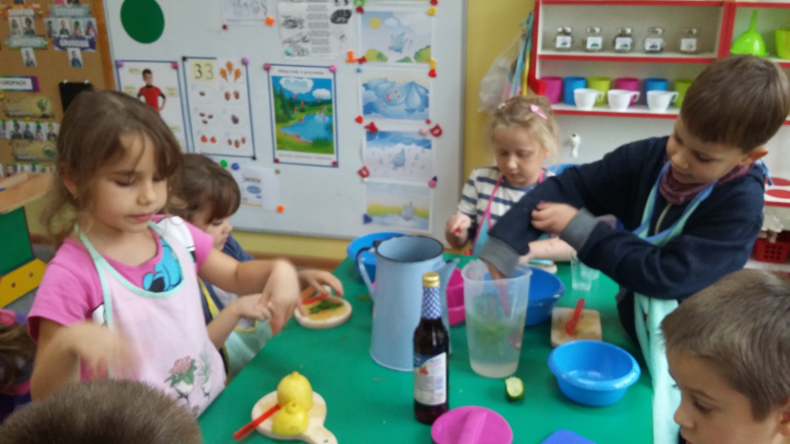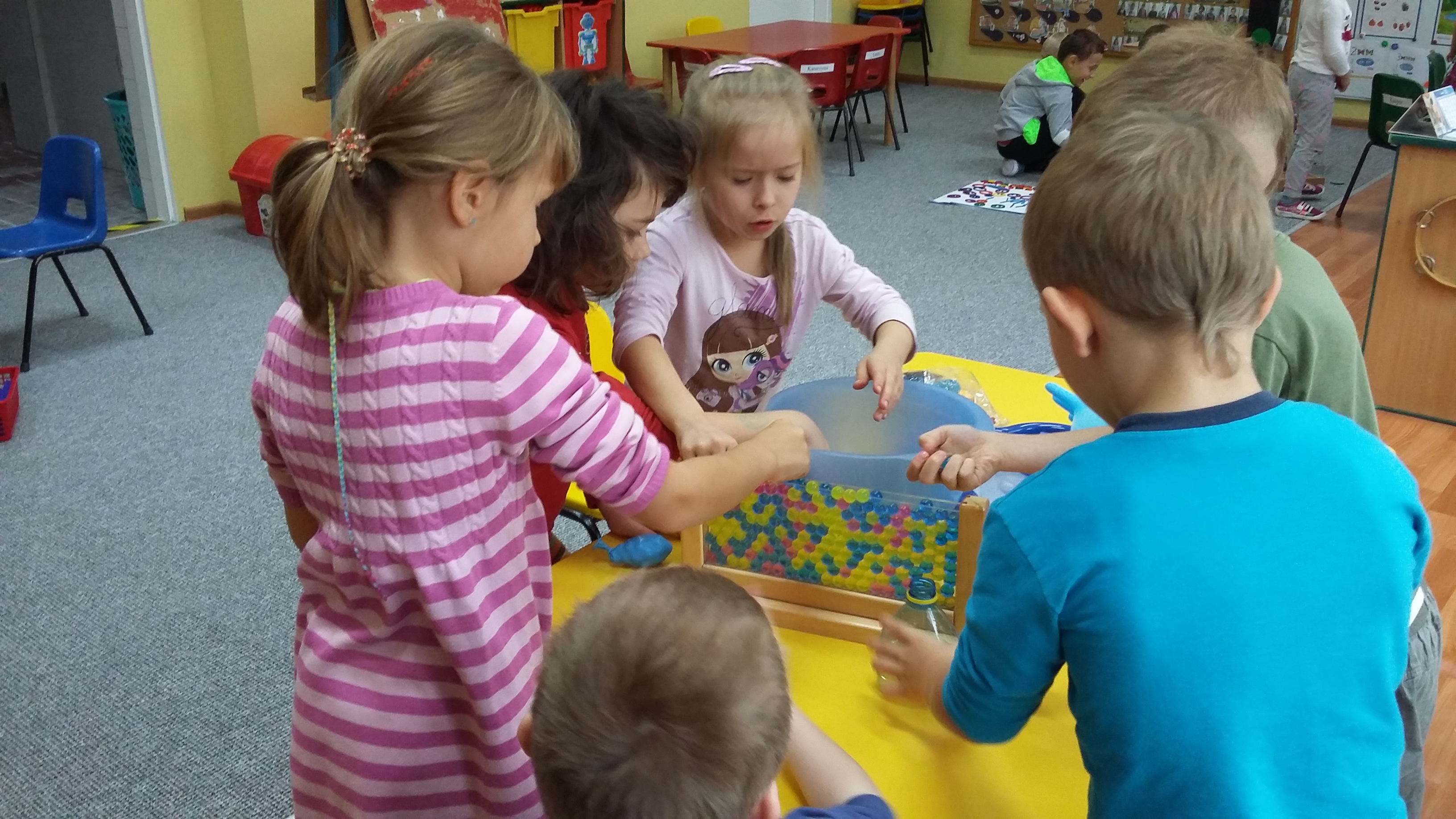 W kąciku „Darów” dzieci tworzyły ilustracje z darów (rzeka, jezioro, morze, deszcz, śnieg). W kąciku twórczym wykonywały pracę plastyczną techniką „Mokre na mokrym” –malowanie wodą i farbami akwarelowymi. W kąciku badawczym obserwowały wodę w różnych stanach skupienia i wykonywały gniotka sensorycznego z żelu florystycznego i balona. W kąciku gospodarczym przygotowywały wodę z cytryną, miętą i sokiem owocowym.