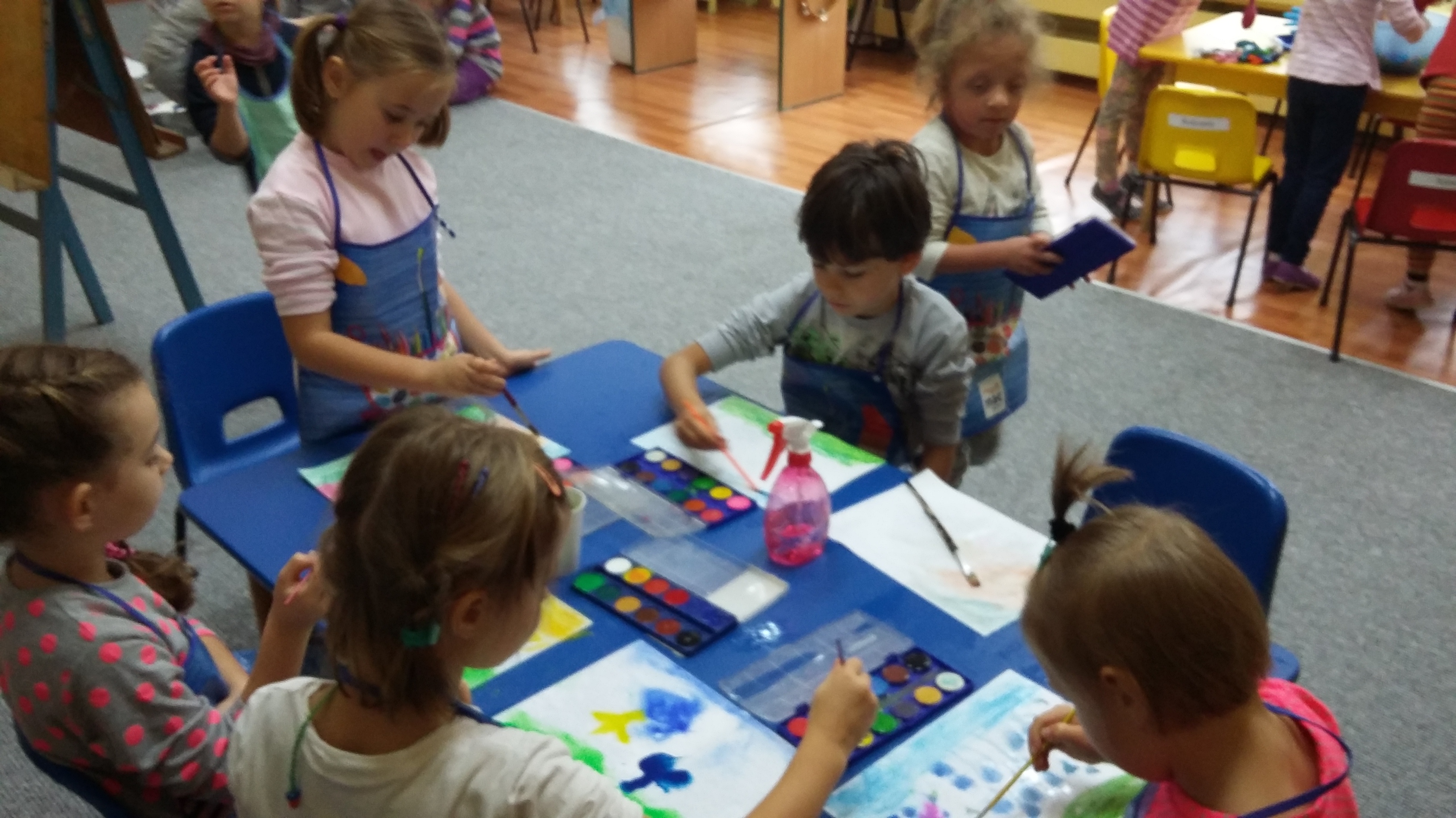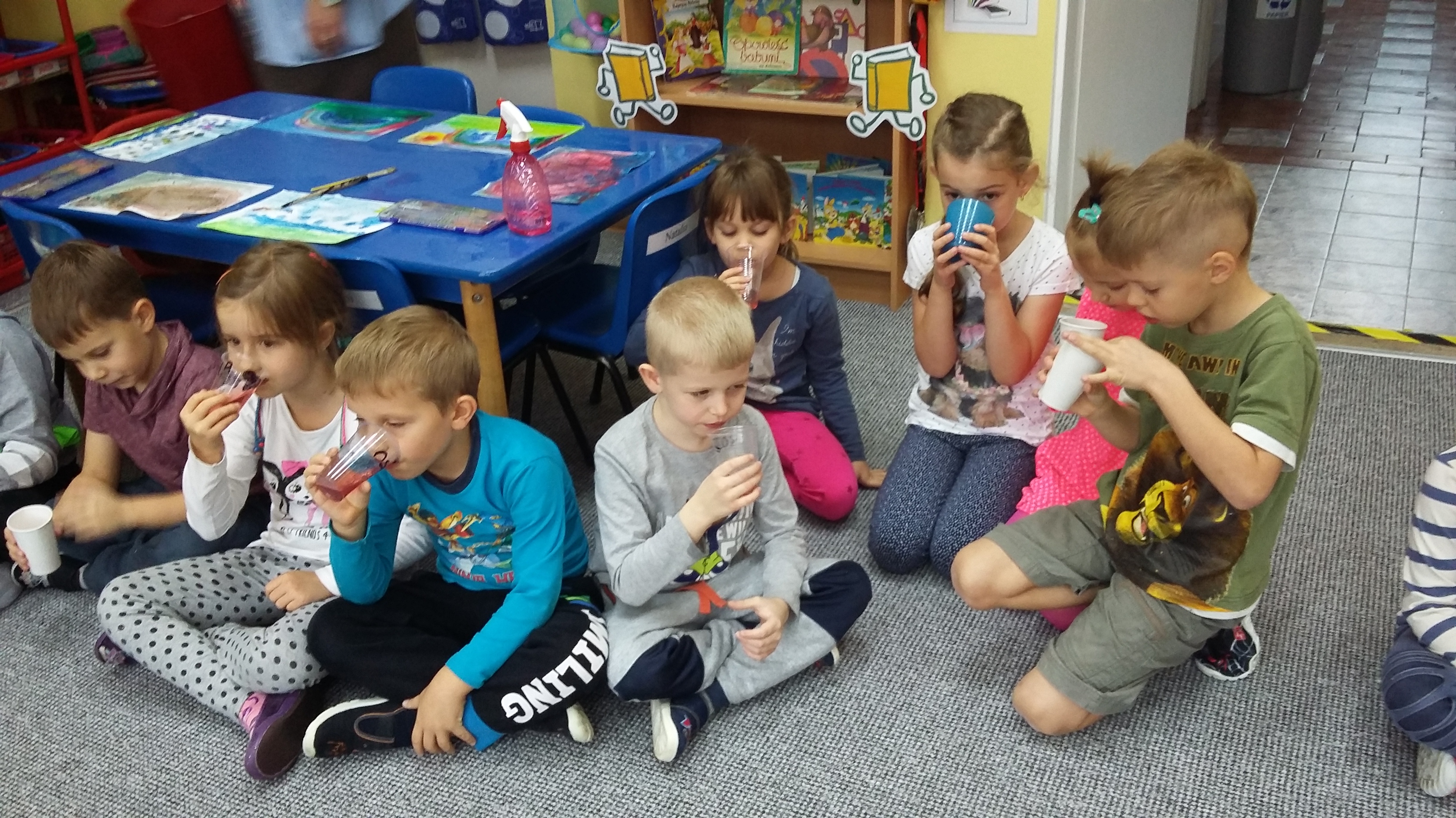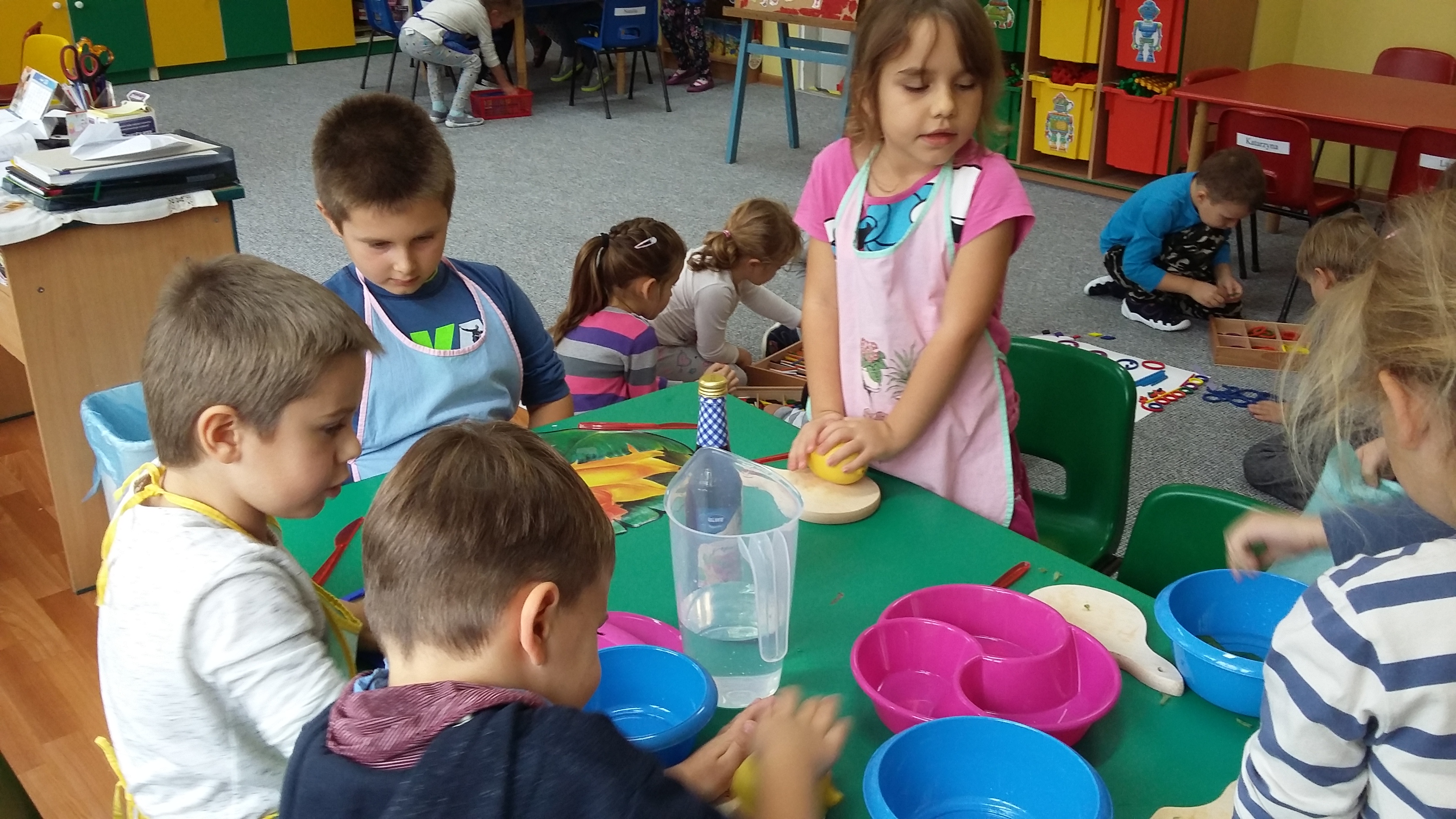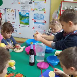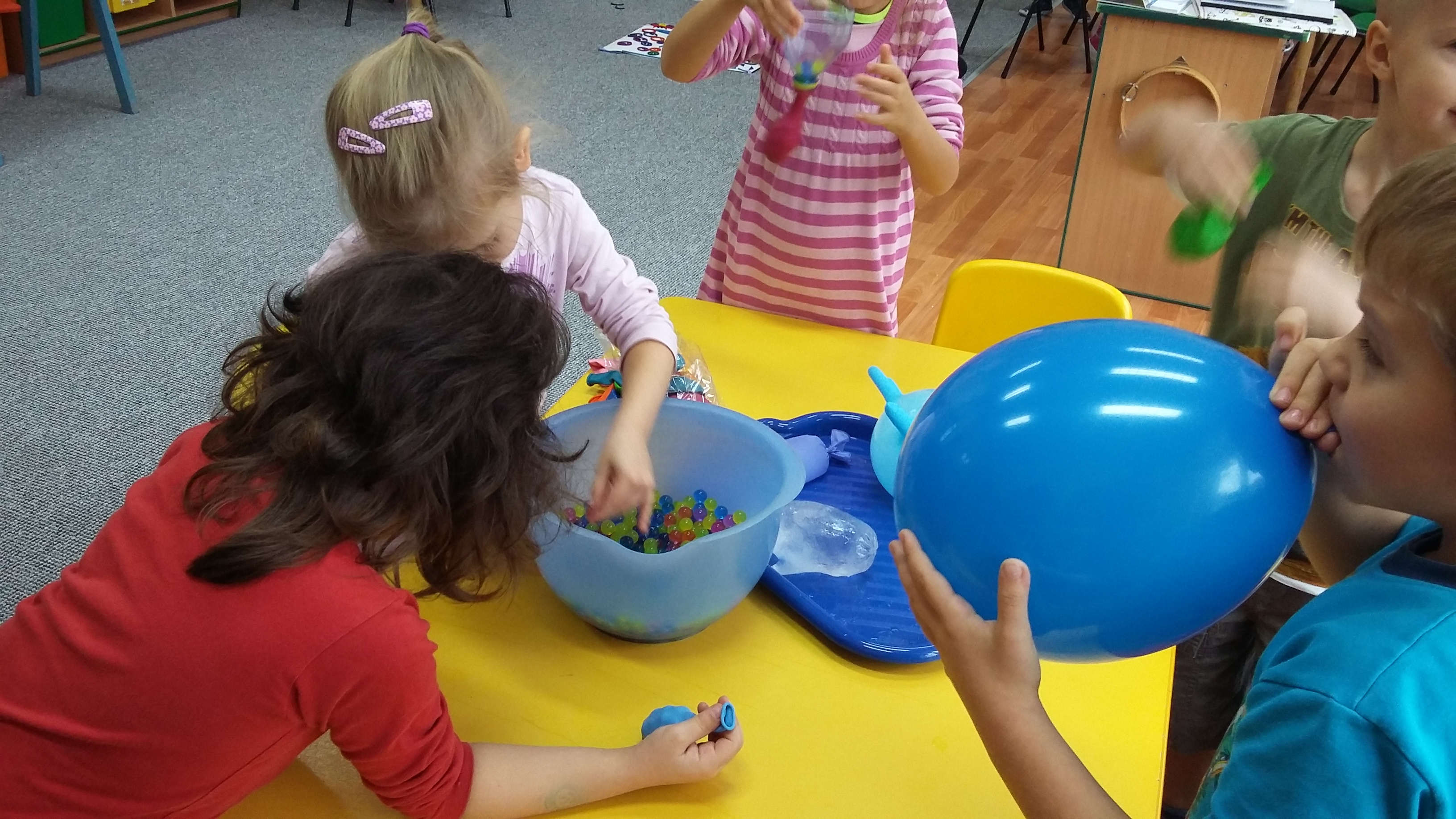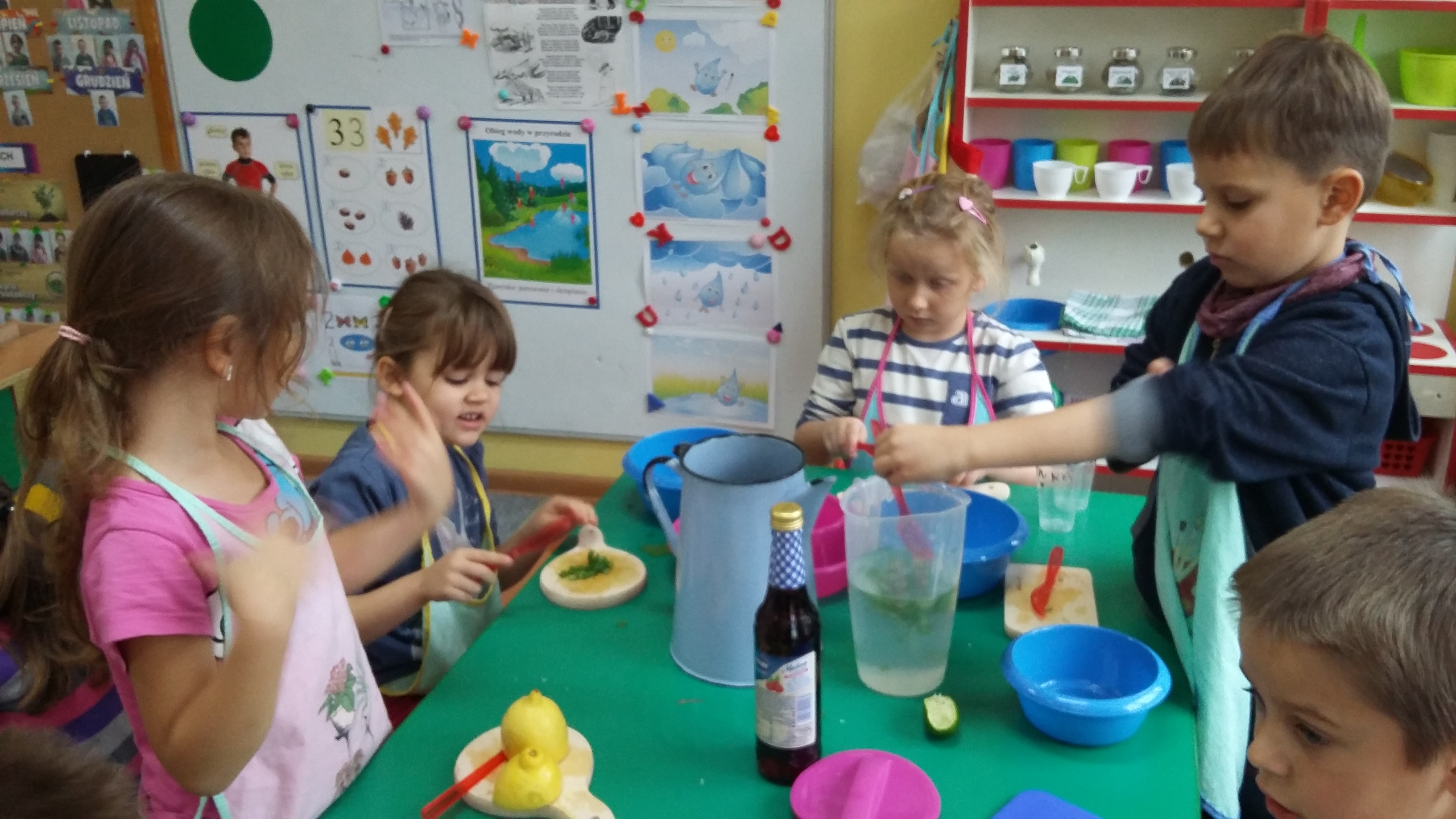 W kąciku „Darów” dzieci tworzyły ilustracje z darów (rzeka, jezioro, morze, deszcz, śnieg). W kąciku twórczym wykonywały pracę plastyczną techniką „Mokre na mokrym” –malowanie wodą i farbami akwarelowymi. W kąciku badawczym obserwowały wodę w różnych stanach skupienia i wykonywały gniotka sensorycznego z żelu florystycznego i balona. W kąciku gospodarczym przygotowywały wodę z cytryną, miętą i sokiem owocowym.