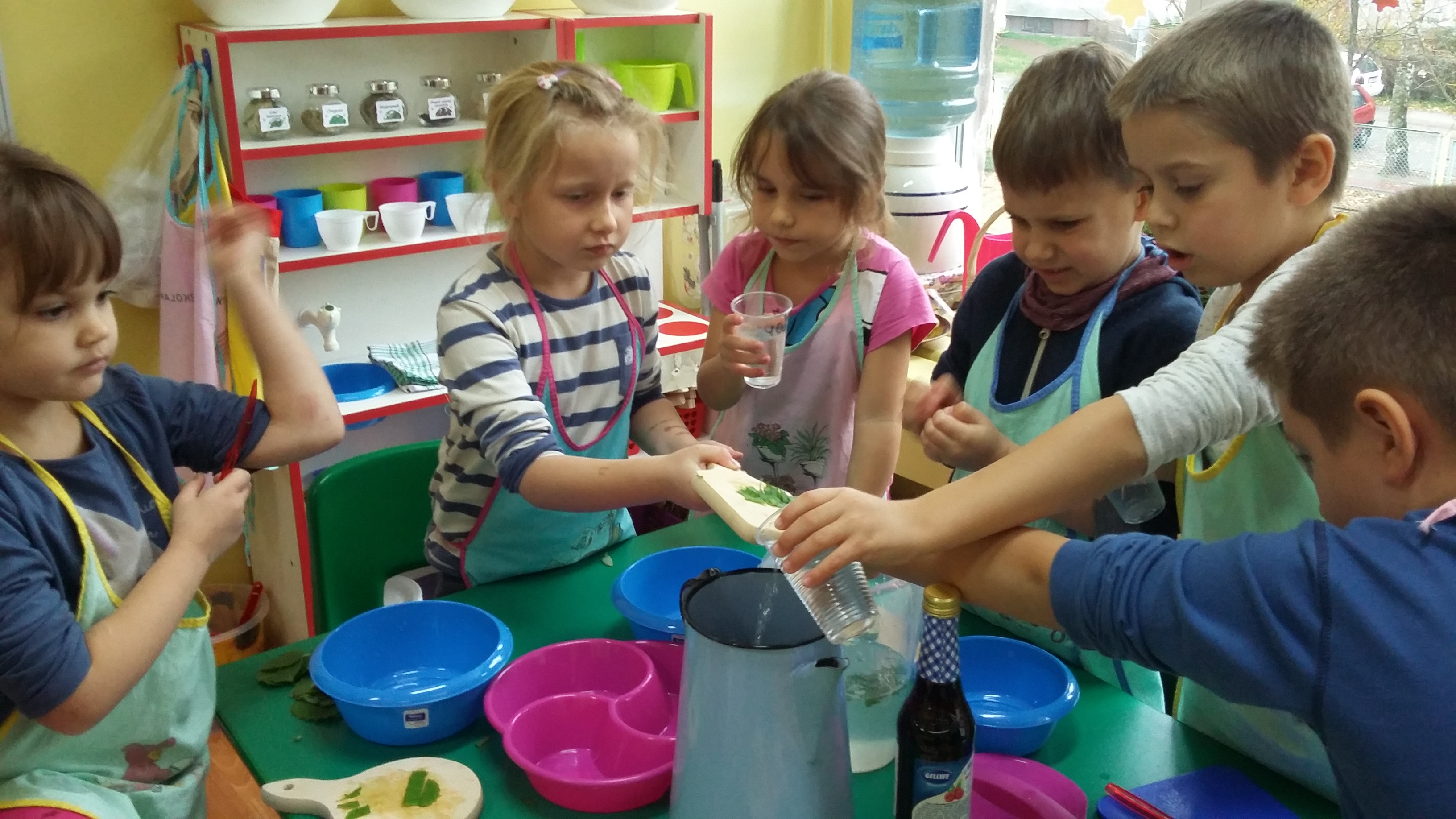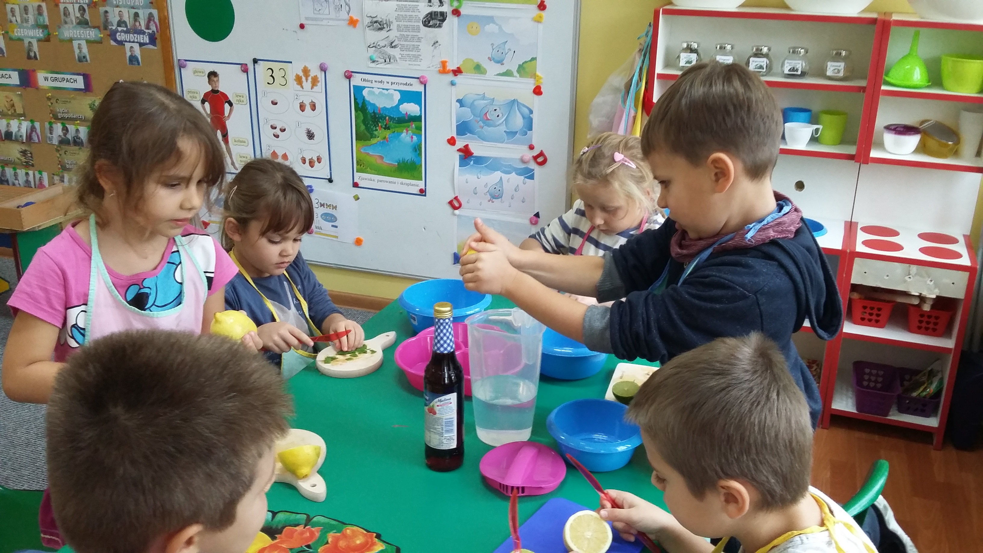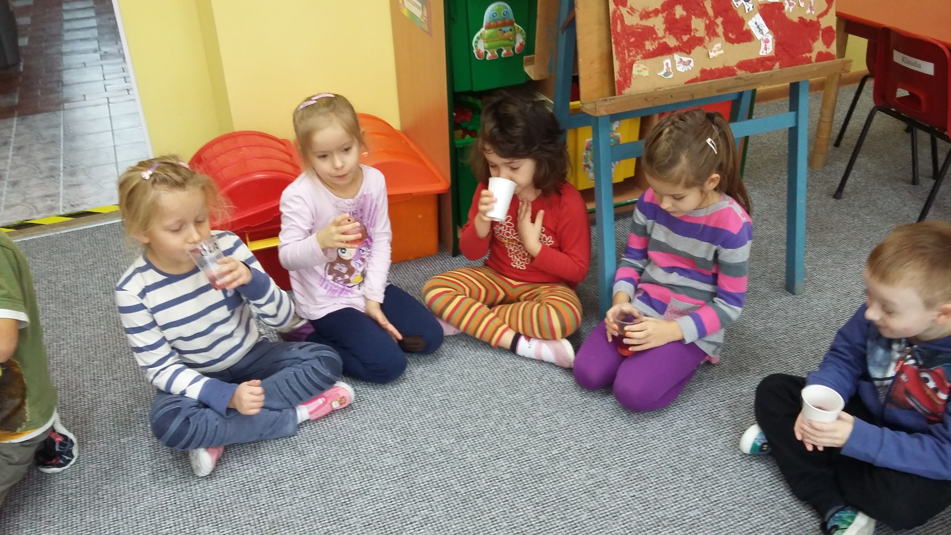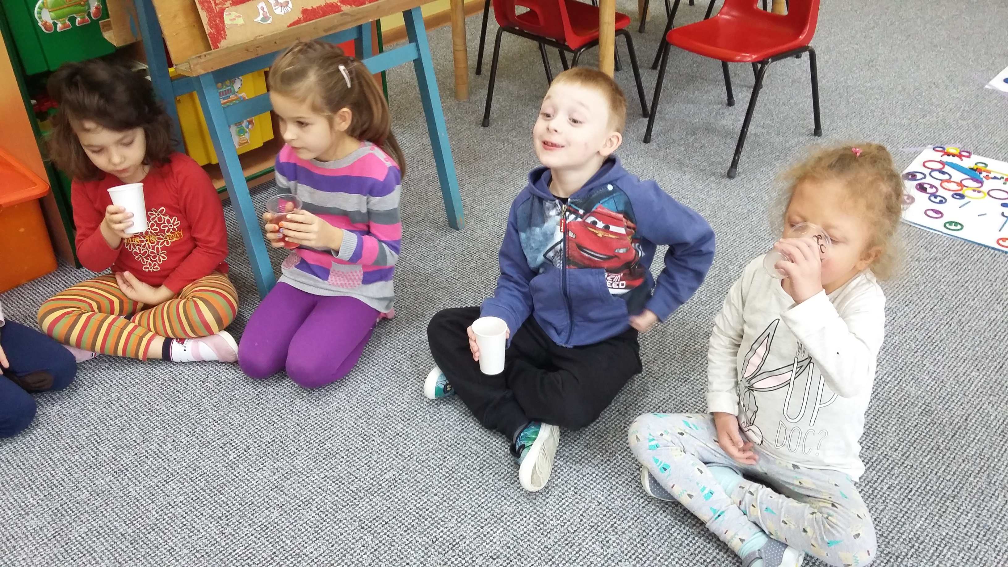 W kąciku „Darów” dzieci tworzyły ilustracje z darów (rzeka, jezioro, morze, deszcz, śnieg). W kąciku twórczym wykonywały pracę plastyczną techniką „Mokre na mokrym” –malowanie wodą i farbami akwarelowymi. W kąciku badawczym obserwowały wodę w różnych stanach skupienia i wykonywały gniotka sensorycznego z żelu florystycznego i balona. W kąciku gospodarczym przygotowywały wodę z cytryną, miętą i sokiem owocowym.