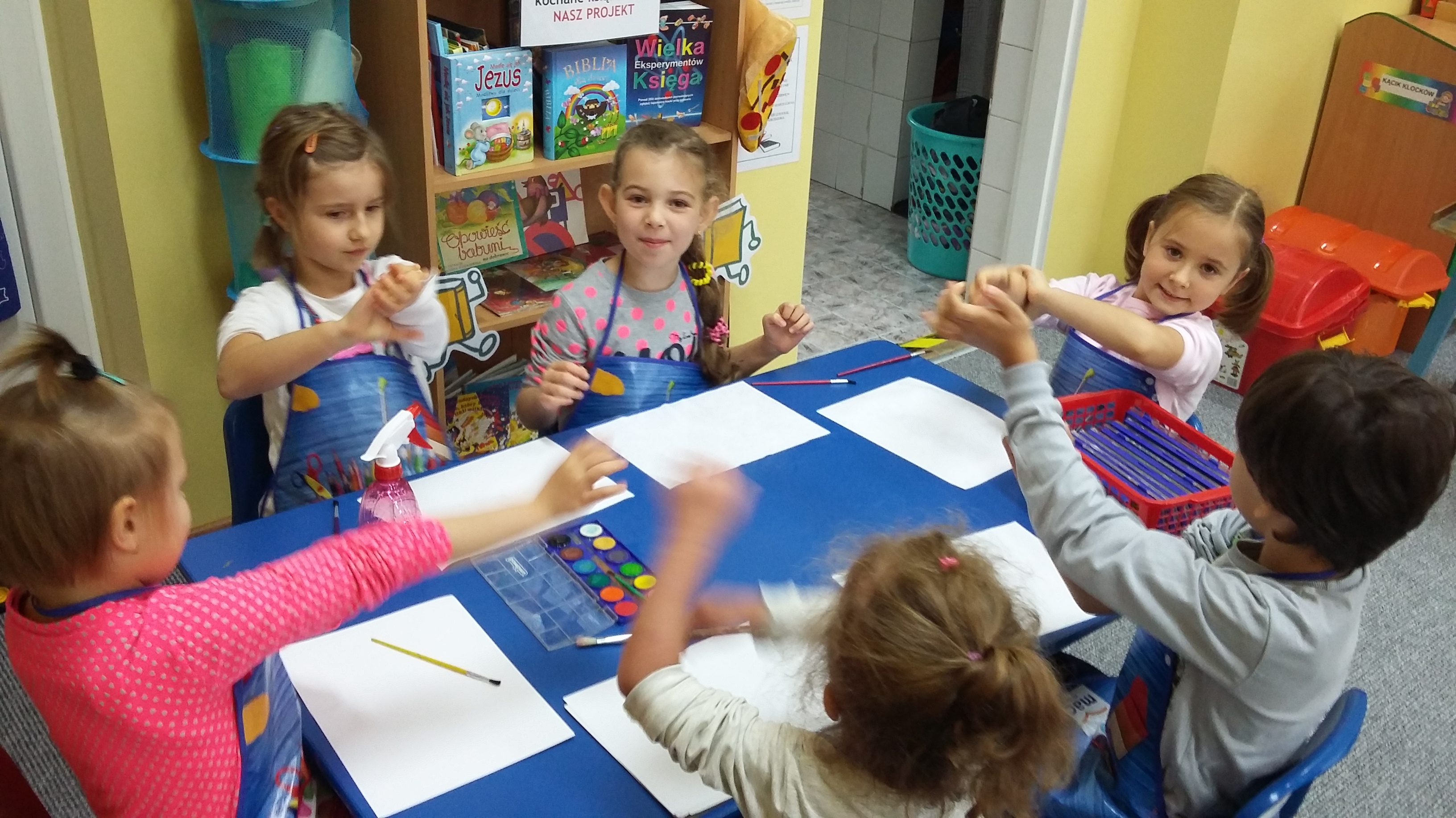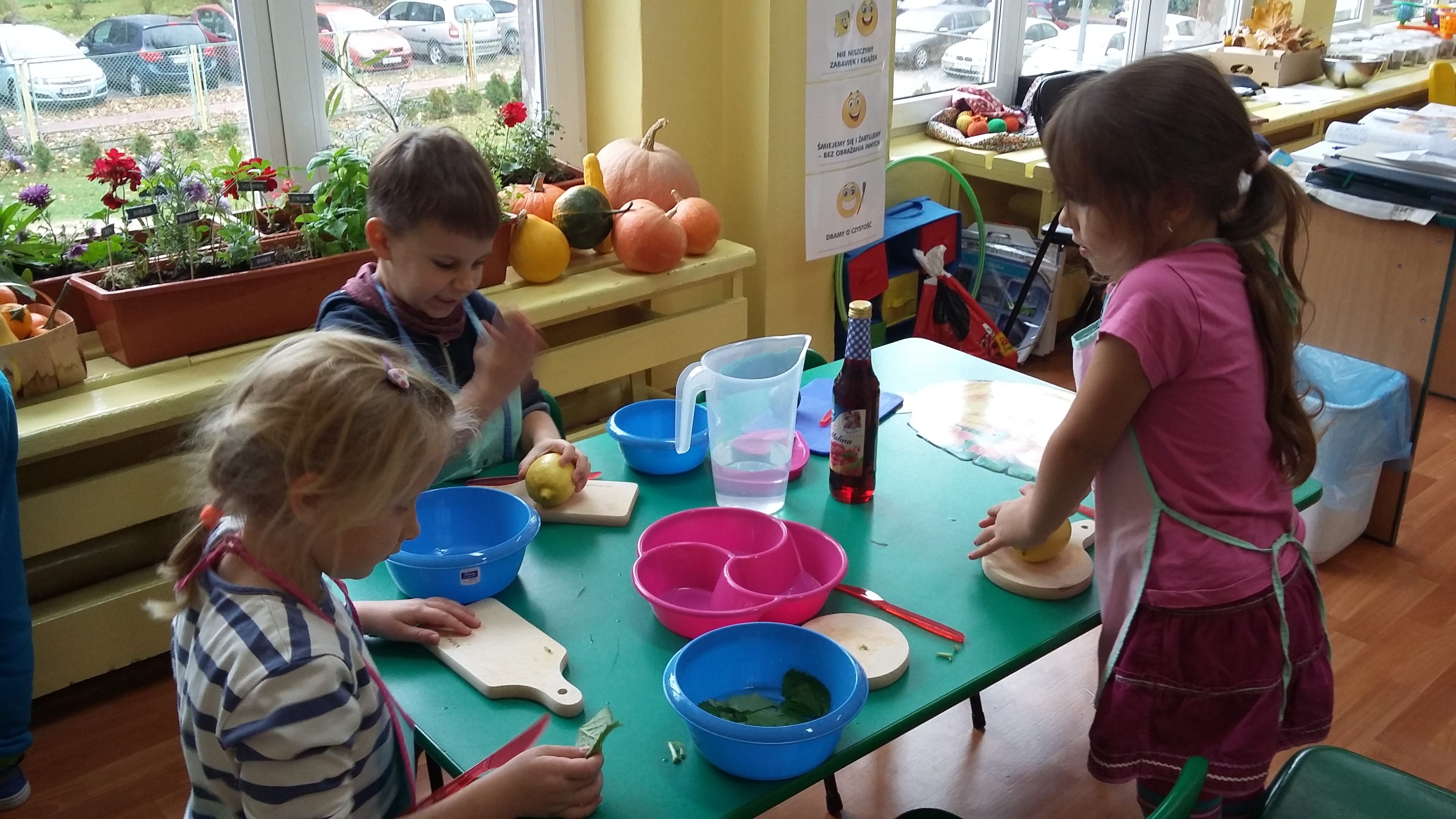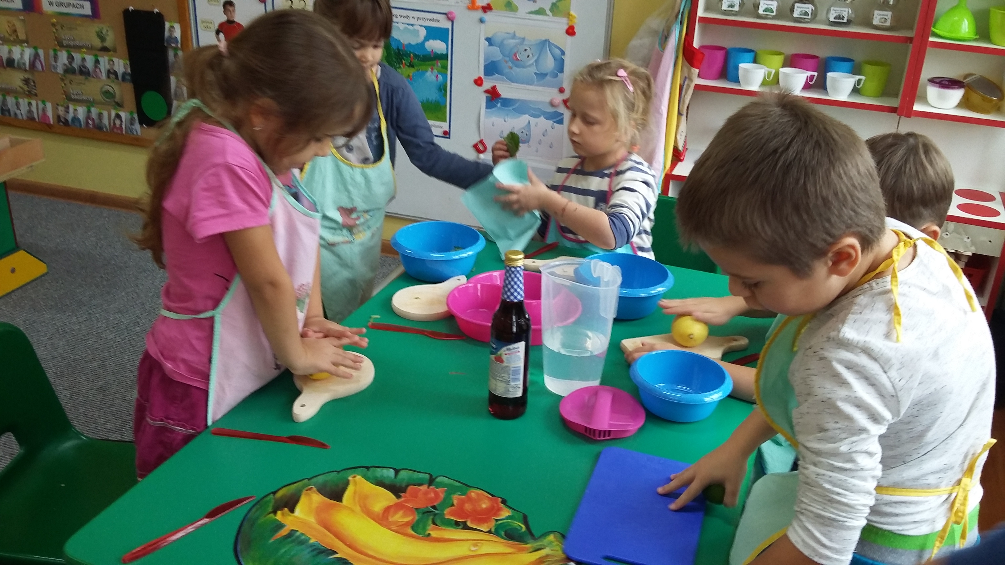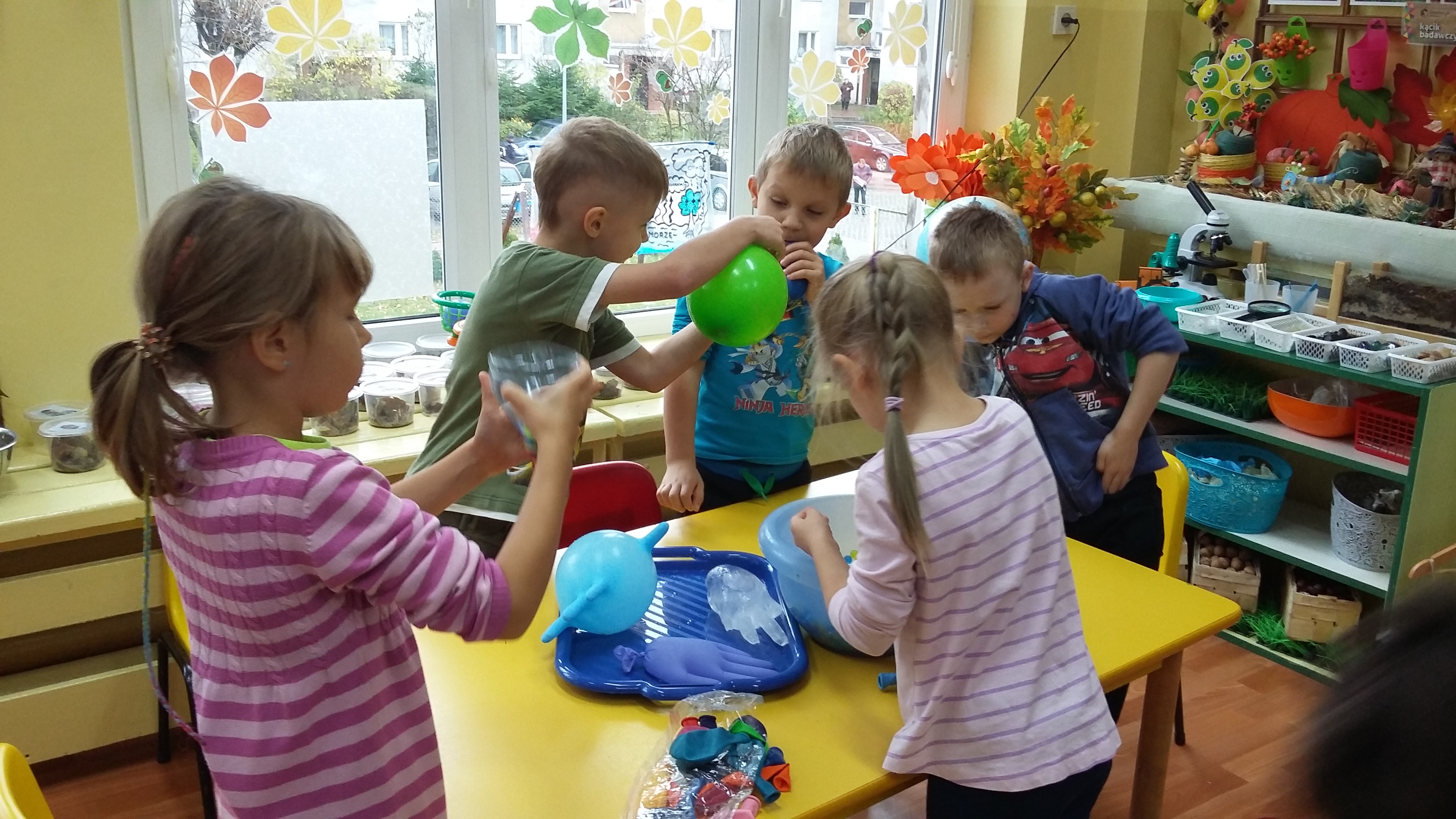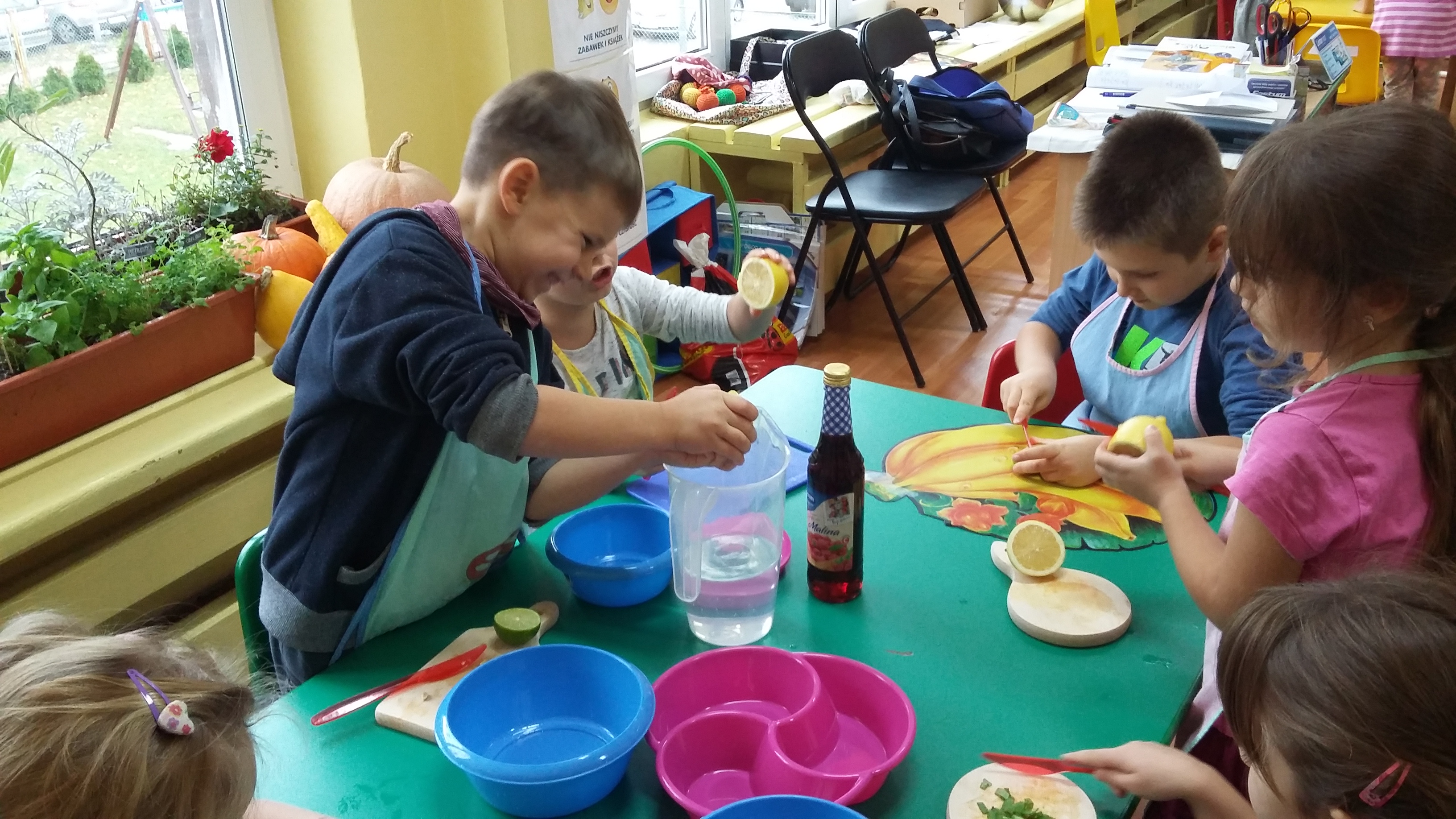 W kąciku „Darów” dzieci tworzyły ilustracje z darów (rzeka, jezioro, morze, deszcz, śnieg). W kąciku twórczym wykonywały pracę plastyczną techniką „Mokre na mokrym” –malowanie wodą i farbami akwarelowymi. W kąciku badawczym obserwowały wodę w różnych stanach skupienia i wykonywały gniotka sensorycznego z żelu florystycznego i balona. W kąciku gospodarczym przygotowywały wodę z cytryną, miętą i sokiem owocowym.