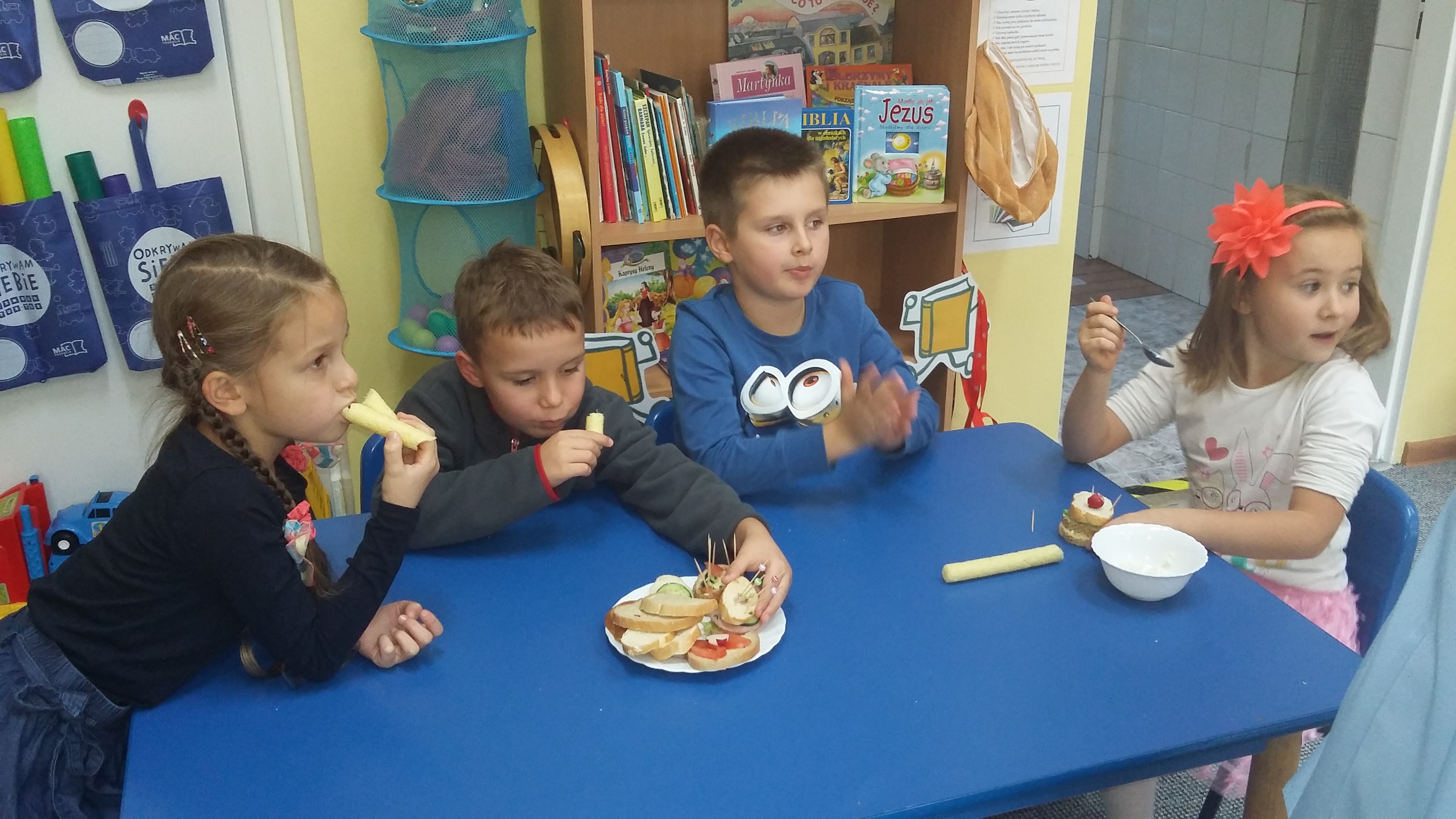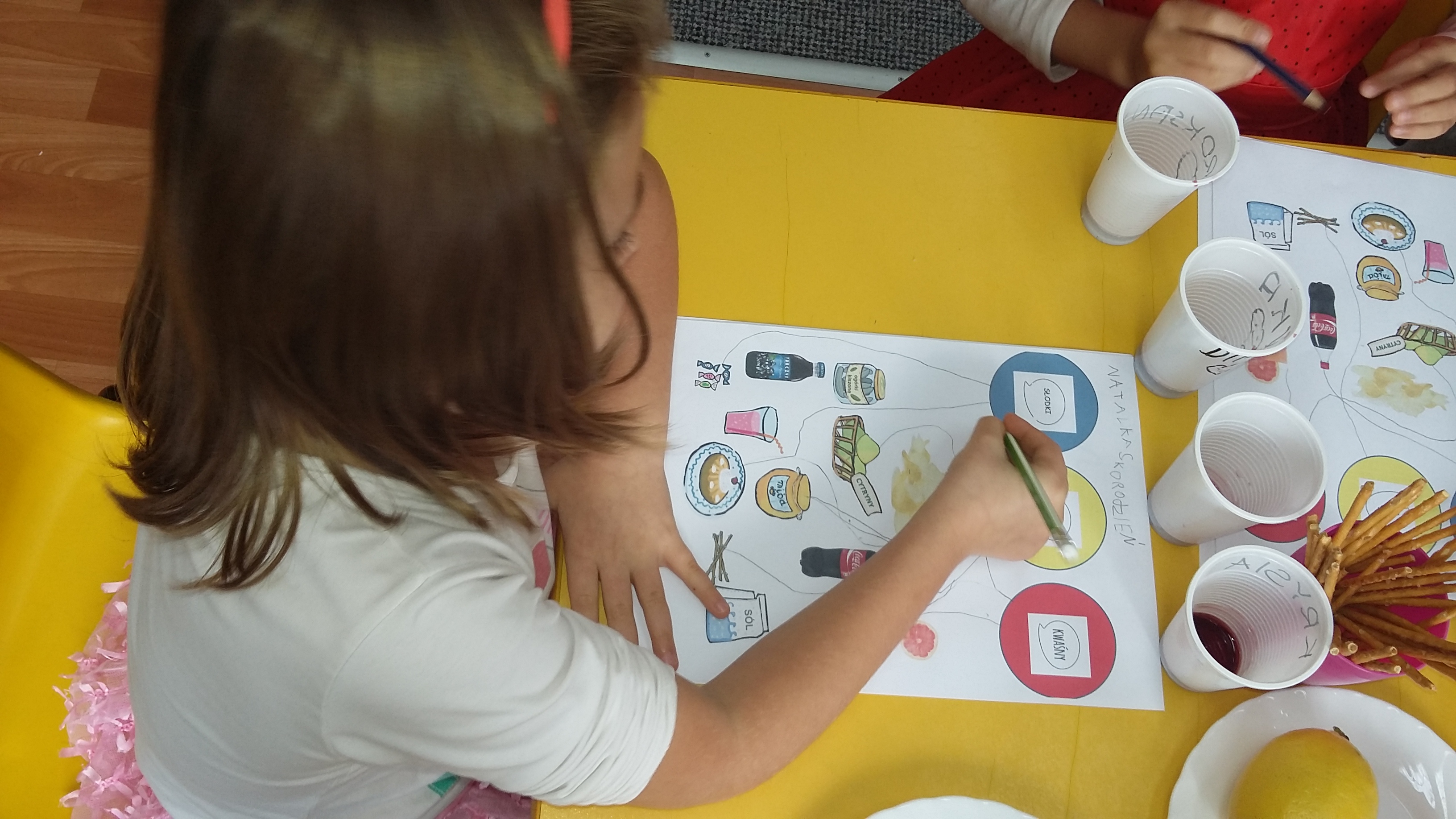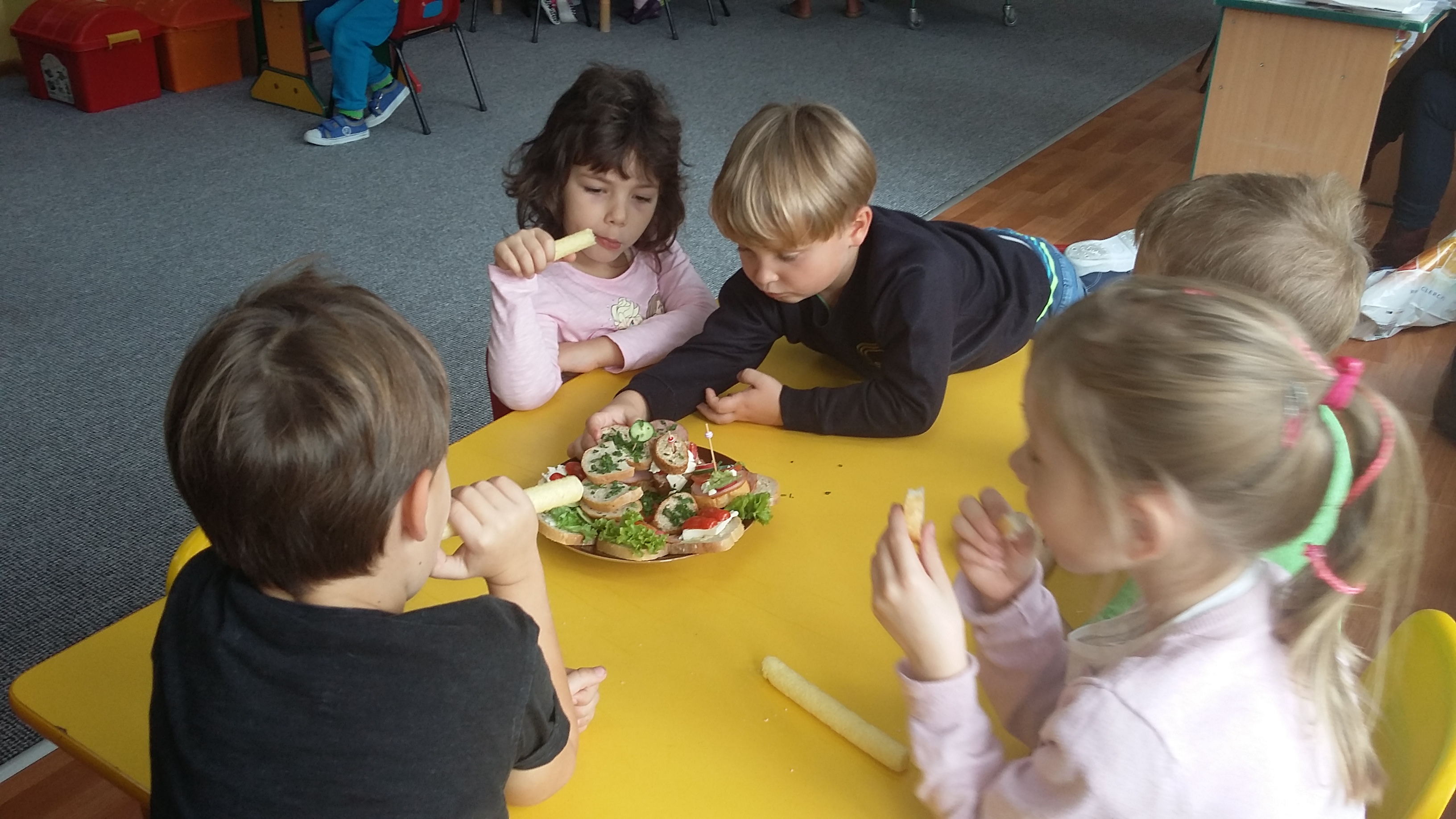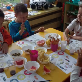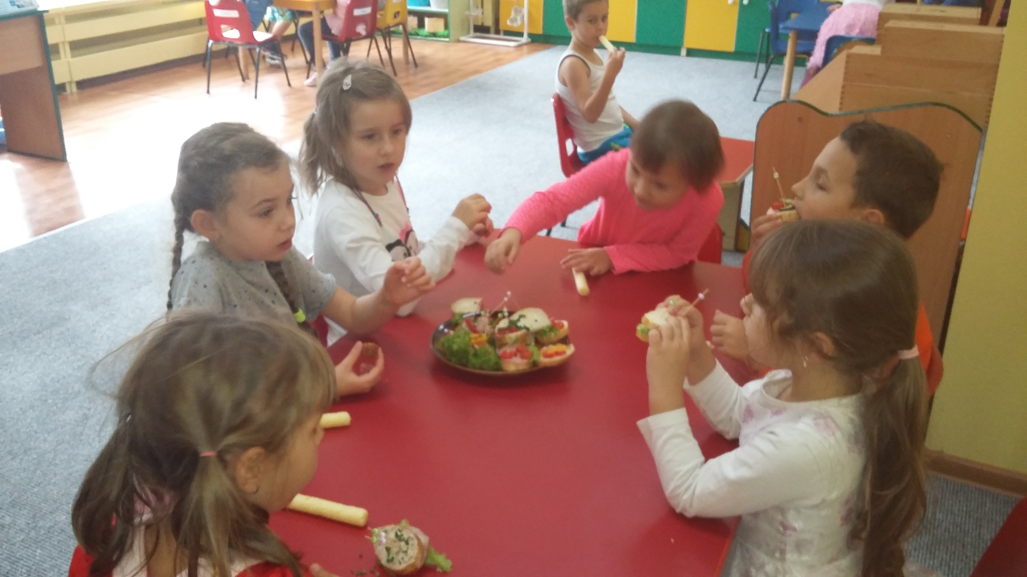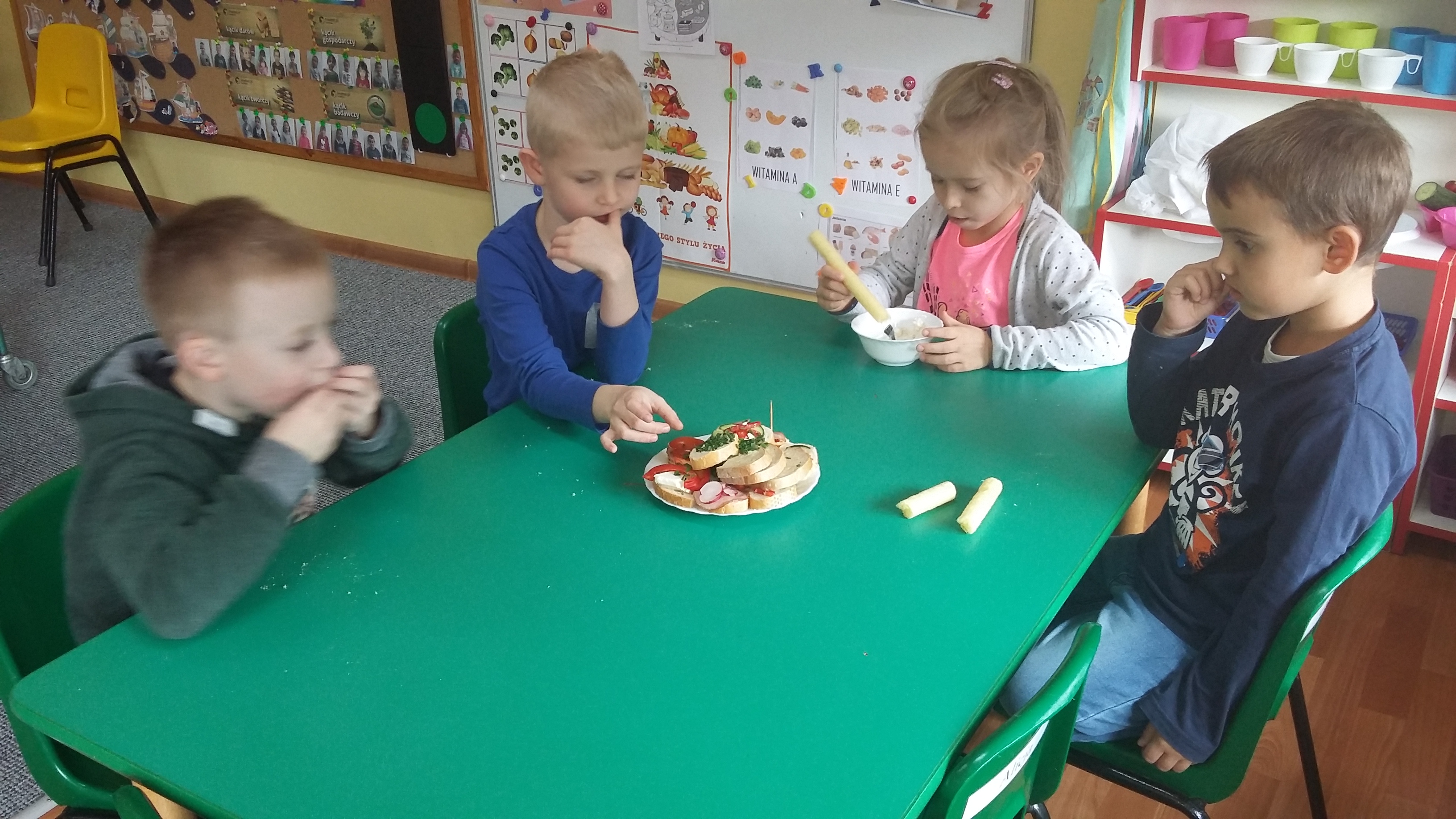 Najlepszym sposobem na naukę jest doświadczanie świata na własnej skórze już od najmłodszych lat – taka idea przyświeca pedagogice Froebla. W ramach jej działalności dzieci mogą uczestniczyć w licznych warsztatach i aktywnościach, które pozwalają poznać otaczający świat. Realizowaliśmy cykl zajęć z zakresu tematyki prozdrowotnej. Rozmawialiśmy o zasadach zdrowego odżywiania, przedszkolaki tworzyły piramidę zdrowego żywienia. Podczas teatrzyku stolikowego Doktor Rybka zachęcił starszaki do dbania o zdrowie. Później dzieci w poszczególnych kącikach realizowały zadania związane z profilaktyką. W kąciku Darów tworzyły zdrowe twarze kobiet i mężczyzn z wykorzystaniem Daru 7, Daru 8, Daru 9 i Daru 10. DAR 7 tworzy zestaw mozaiki geometrycznej złożonej z kół, półkoli, rombów, kwadratów oraz różnych rodzajów trójkątów w następujących kolorach: zielonym, czerwonym, fioletowym, białym, czarnym, niebieskim oraz żółtym. Każda z figur ma średnicę ok. 1 cm. Oprócz poznawania nazw figur, różnicowania kształtów i kolorów, w kontakcie z Darem 7 dziecko ma okazję do komponowania obrazów, łączenia kolorów i figur, układania rytmów, poszukiwania zależności oraz podobieństw. Dar 7 to bogactwo kształtów, kolorów i możliwości. DAR 8 to proste patyczki o zróżnicowanej długości– od 2,5 cm do 15 cm. Spośród każdej długości występują patyczki w takich samych kolorach, jak elementy Daru 7- zielonym, czerwonym, fioletowym, białym, czarnym, niebieskim oraz żółtym. Otrzymując Dar 8 dziecko zyskuje możliwość porównywania długości, odmierzania, nazywania kolorów, układania rytmów, ale także pojedynczych liter czy całych wyrazów. Dar 8 to także doskonałe narzędzie konstrukcyjne. Rozwija sprawność manualną, wyobraźnię przestrzenną, pobudza do poszukiwania i tworzenia. Zestaw kół oraz półkoli w kolorach czerwonym, zielonym, niebieskim, fioletowym, żółtym oraz pomarańczowym to DAR 9. Kształtuje on pojęcie całości oraz połowy. Różnorodność kolorów sprzyja budowaniu obrazów pochodzących wprost z dziecięcej wyobraźni. Magiczny świat kolorowych pół i półkoli jednocześnie inspiruje do twórczości, oraz do poszukiwania całości, cykliczności, logiki i porządku. W Kąciku Twórczym projektowały postacie sportowców z wykorzystaniem naturalnie barwionej masy solnej. W Kąciku Badawczym próbowały różnych pokarmów i płynów i określały ich smak. Swoje spostrzeżenia notowały na karcie pracy. Tworzyły również tabele ulubionych smaków. W Kąciku gospodarczym dzieci robiły zdrowe kanapki z wykorzystaniem produktów zakupionych w zdrowej żywności. Później dzieci ze smakiem zjadły pyszne kanapki.
