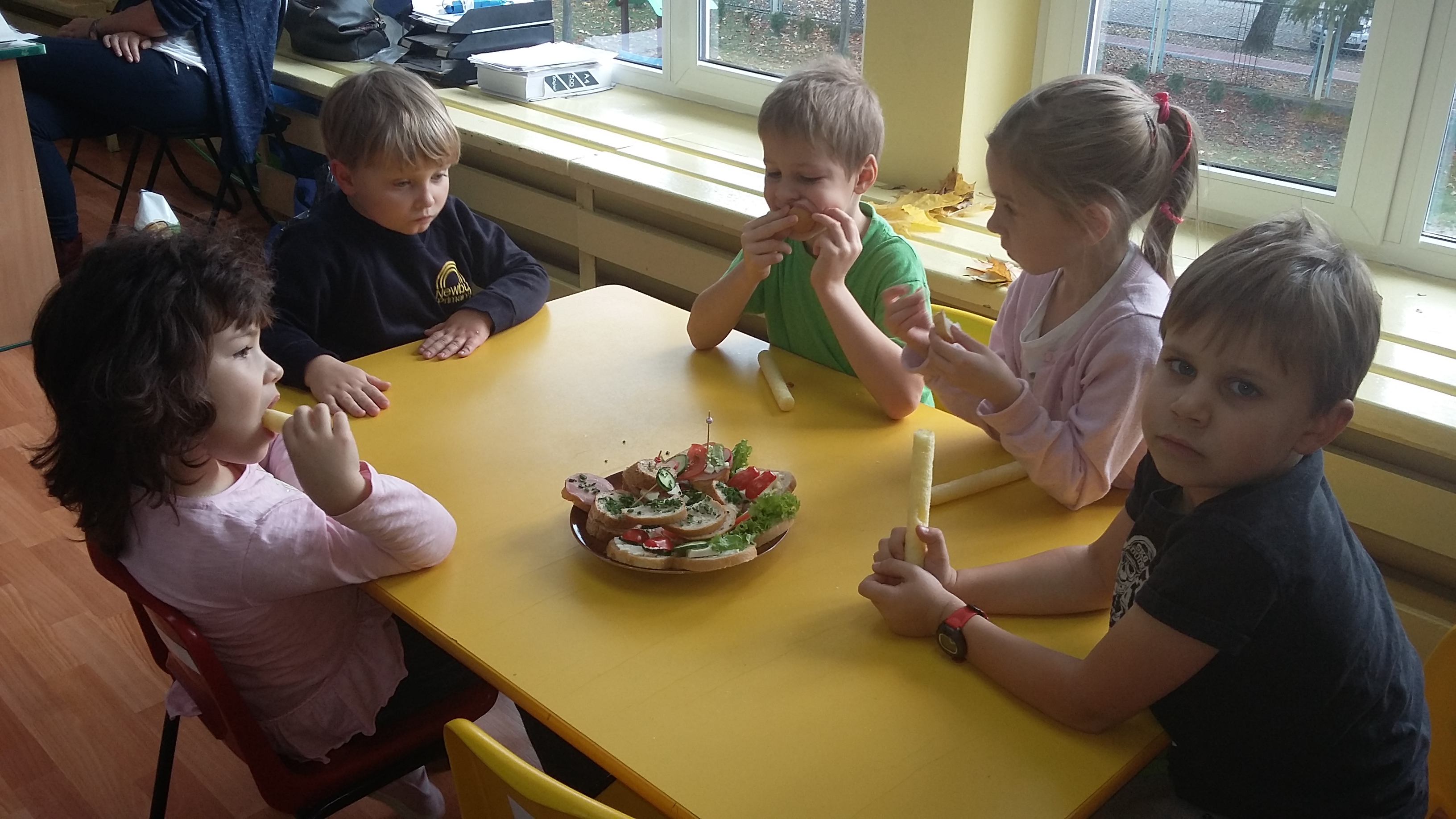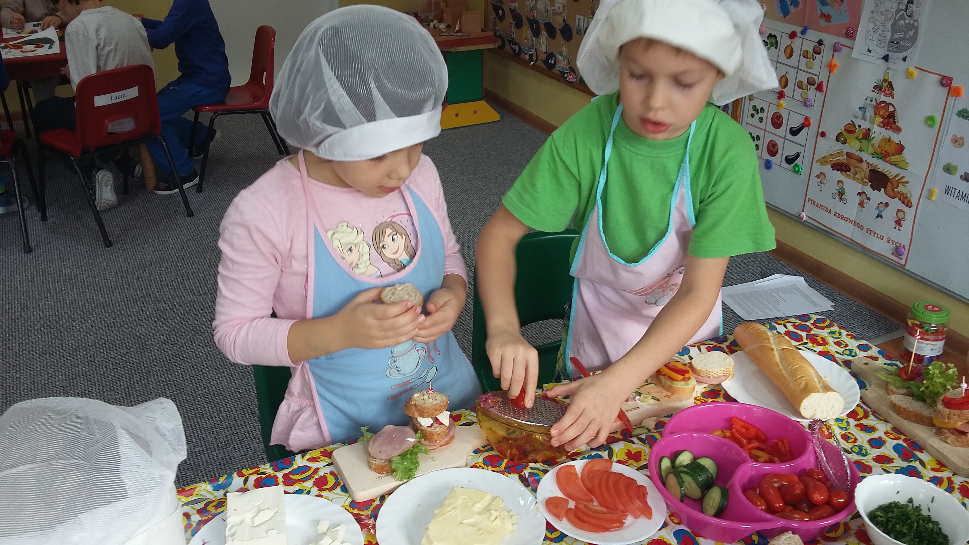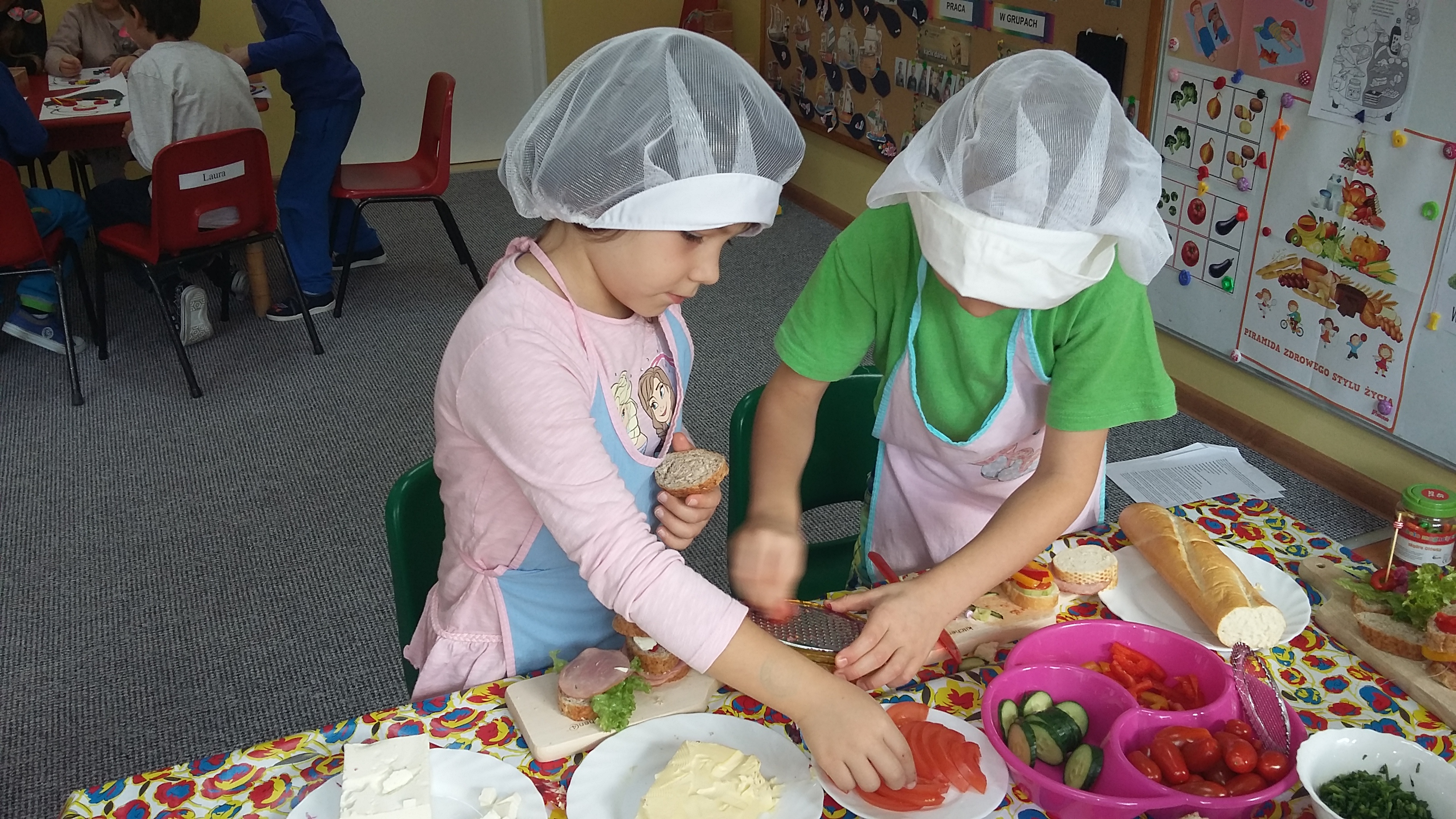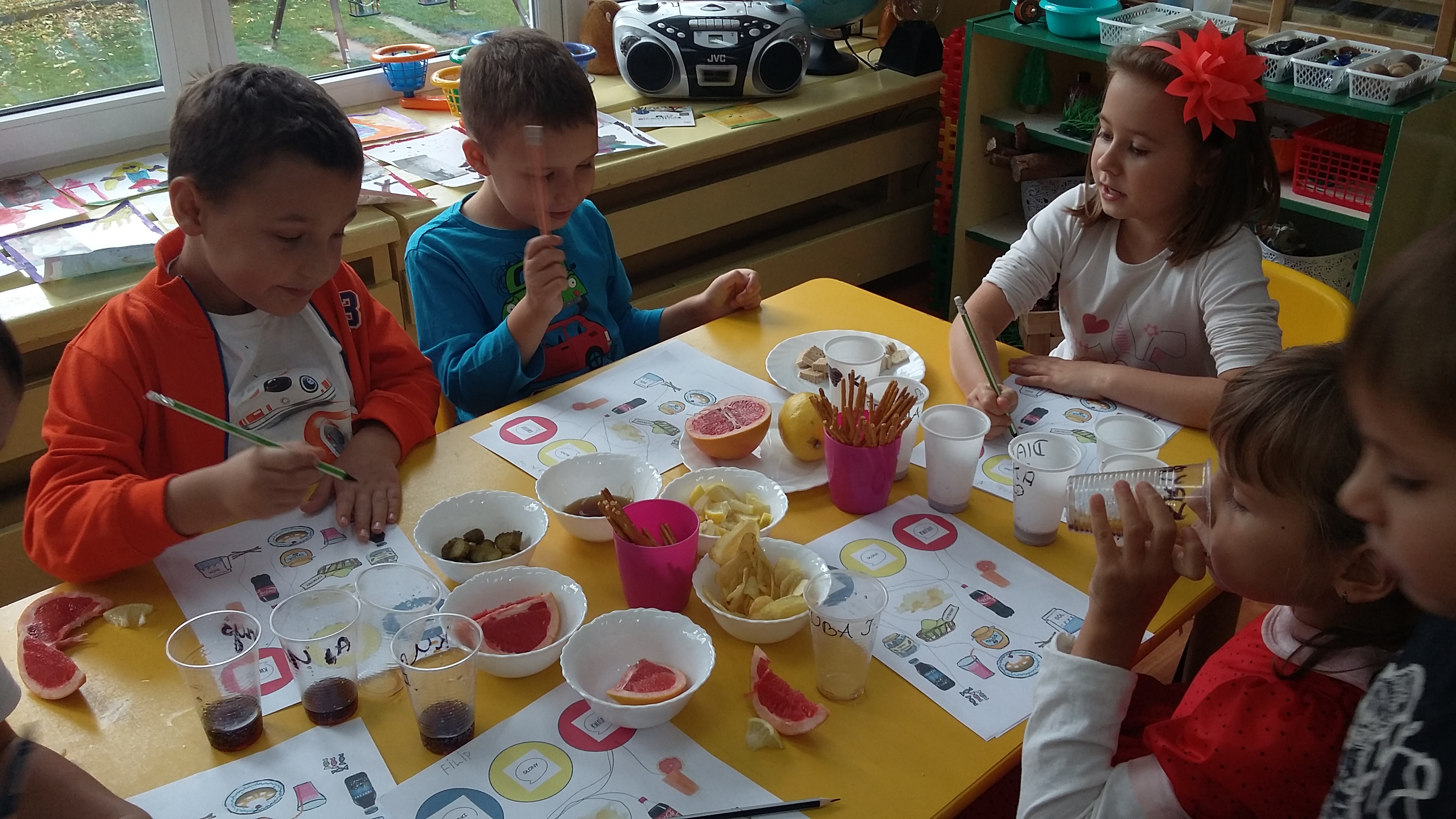 Najlepszym sposobem na naukę jest doświadczanie świata na własnej skórze już od najmłodszych lat – taka idea przyświeca pedagogice Froebla. W ramach jej działalności dzieci mogą uczestniczyć w licznych warsztatach i aktywnościach, które pozwalają poznać otaczający świat. Realizowaliśmy cykl zajęć z zakresu tematyki prozdrowotnej. Rozmawialiśmy o zasadach zdrowego odżywiania, przedszkolaki tworzyły piramidę zdrowego żywienia. Podczas teatrzyku stolikowego Doktor Rybka zachęcił starszaki do dbania o zdrowie. Później dzieci w poszczególnych kącikach realizowały zadania związane z profilaktyką. W kąciku Darów tworzyły zdrowe twarze kobiet i mężczyzn z wykorzystaniem Daru 7, Daru 8, Daru 9 i Daru 10. DAR 7 tworzy zestaw mozaiki geometrycznej złożonej z kół, półkoli, rombów, kwadratów oraz różnych rodzajów trójkątów w następujących kolorach: zielonym, czerwonym, fioletowym, białym, czarnym, niebieskim oraz żółtym. Każda z figur ma średnicę ok. 1 cm. Oprócz poznawania nazw figur, różnicowania kształtów i kolorów, w kontakcie z Darem 7 dziecko ma okazję do komponowania obrazów, łączenia kolorów i figur, układania rytmów, poszukiwania zależności oraz podobieństw. Dar 7 to bogactwo kształtów, kolorów i możliwości. DAR 8 to proste patyczki o zróżnicowanej długości– od 2,5 cm do 15 cm. Spośród każdej długości występują patyczki w takich samych kolorach, jak elementy Daru 7- zielonym, czerwonym, fioletowym, białym, czarnym, niebieskim oraz żółtym. Otrzymując Dar 8 dziecko zyskuje możliwość porównywania długości, odmierzania, nazywania kolorów, układania rytmów, ale także pojedynczych liter czy całych wyrazów. Dar 8 to także doskonałe narzędzie konstrukcyjne. Rozwija sprawność manualną, wyobraźnię przestrzenną, pobudza do poszukiwania i tworzenia. Zestaw kół oraz półkoli w kolorach czerwonym, zielonym, niebieskim, fioletowym, żółtym oraz pomarańczowym to DAR 9. Kształtuje on pojęcie całości oraz połowy. Różnorodność kolorów sprzyja budowaniu obrazów pochodzących wprost z dziecięcej wyobraźni. Magiczny świat kolorowych pół i półkoli jednocześnie inspiruje do twórczości, oraz do poszukiwania całości, cykliczności, logiki i porządku. W Kąciku Twórczym projektowały postacie sportowców z wykorzystaniem naturalnie barwionej masy solnej. W Kąciku Badawczym próbowały różnych pokarmów i płynów i określały ich smak. Swoje spostrzeżenia notowały na karcie pracy. Tworzyły również tabele ulubionych smaków. W Kąciku gospodarczym dzieci robiły zdrowe kanapki z wykorzystaniem produktów zakupionych w zdrowej żywności. Później dzieci ze smakiem zjadły pyszne kanapki.