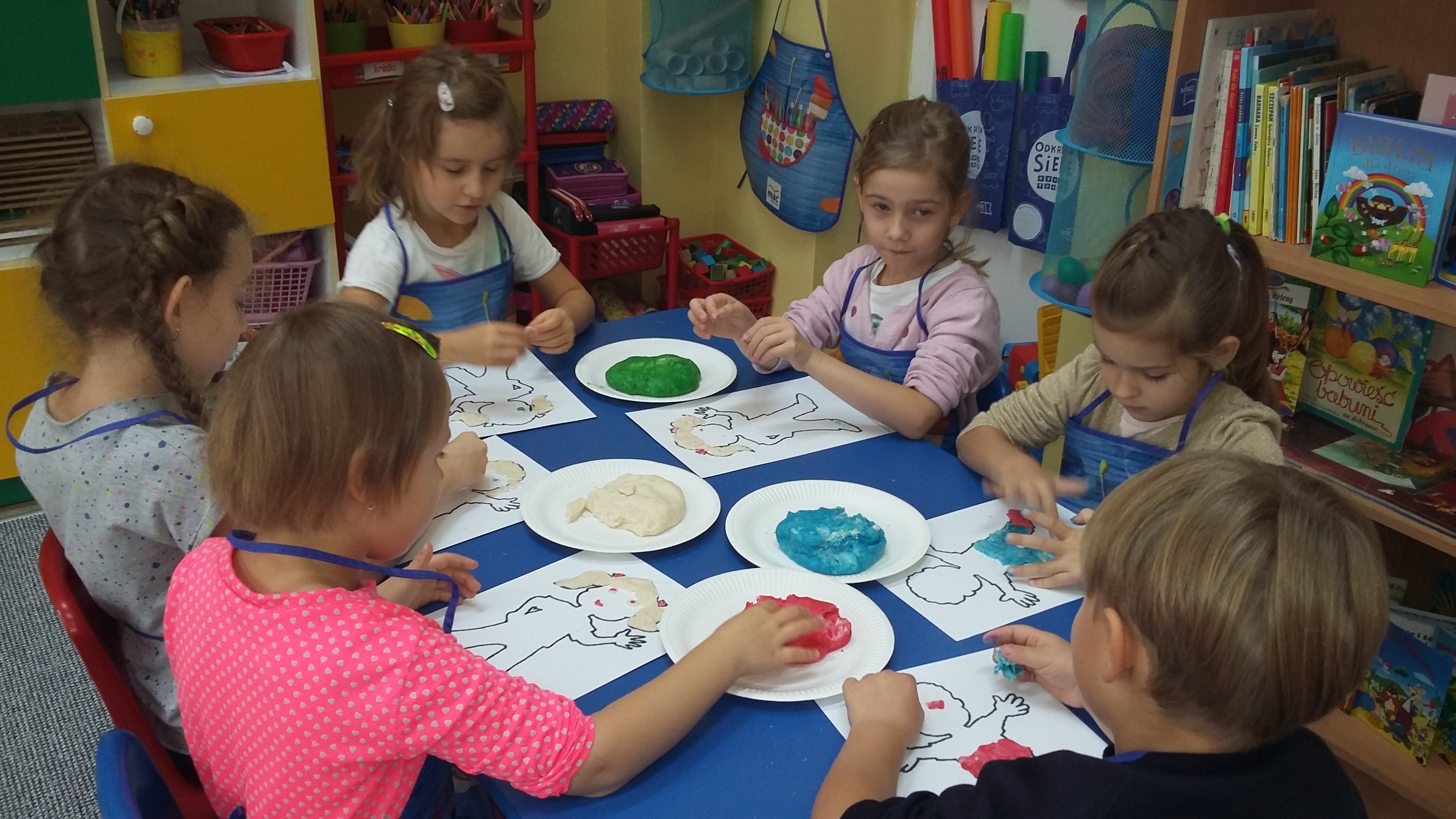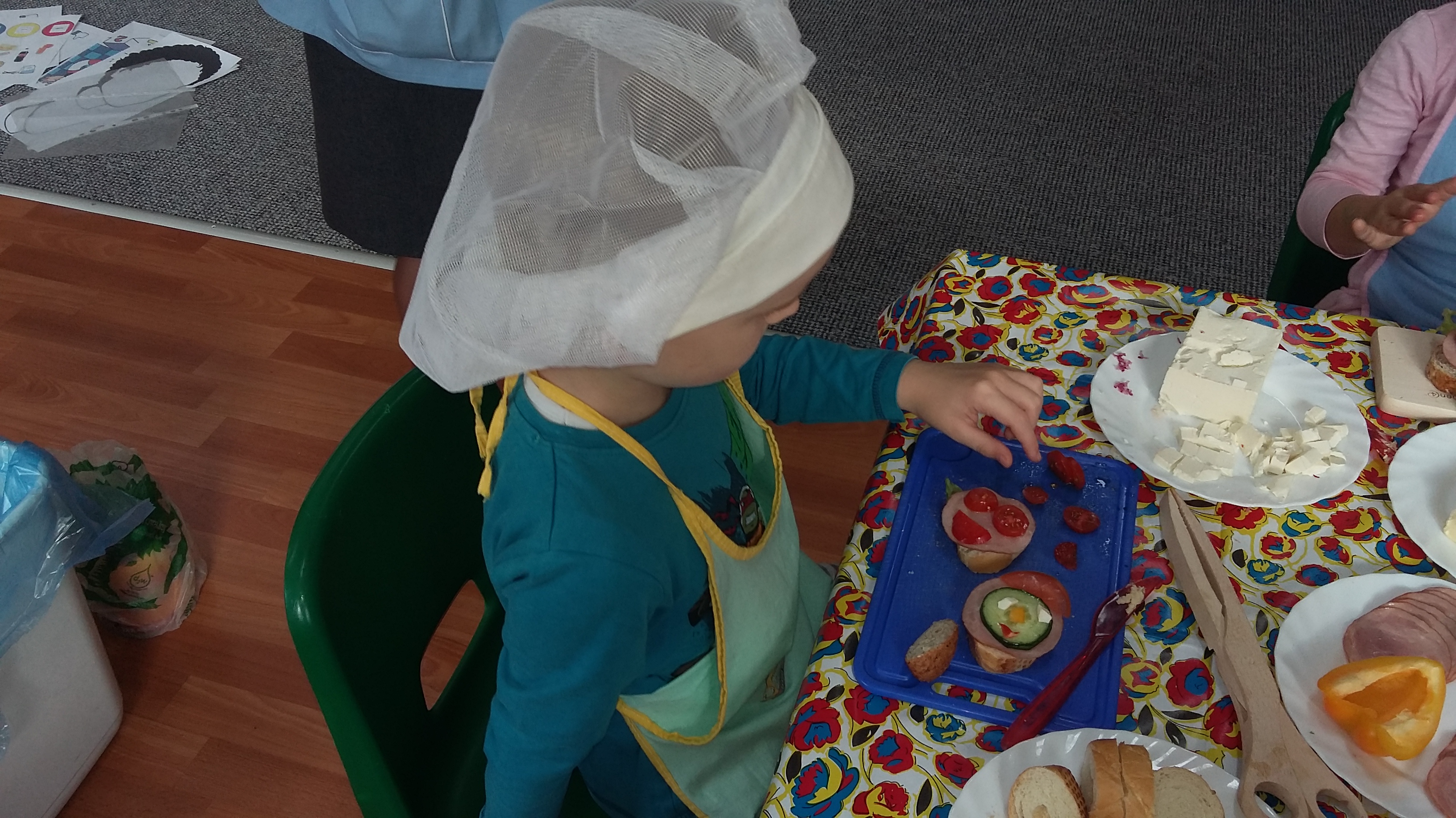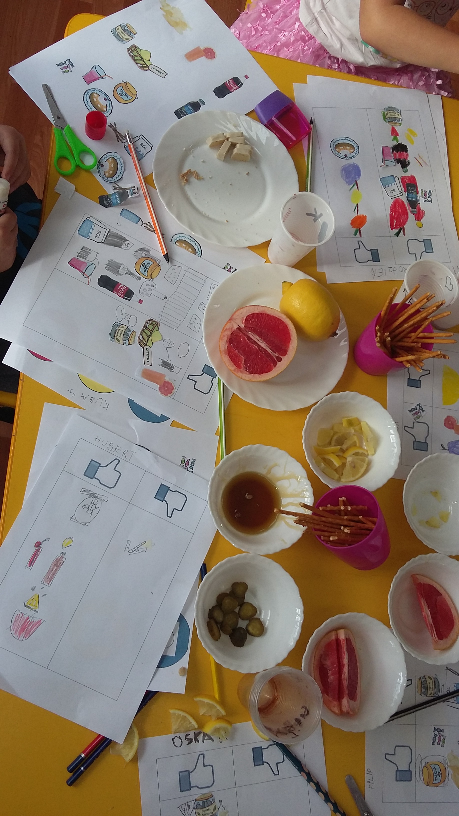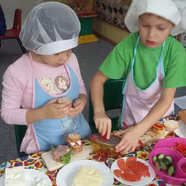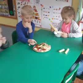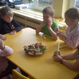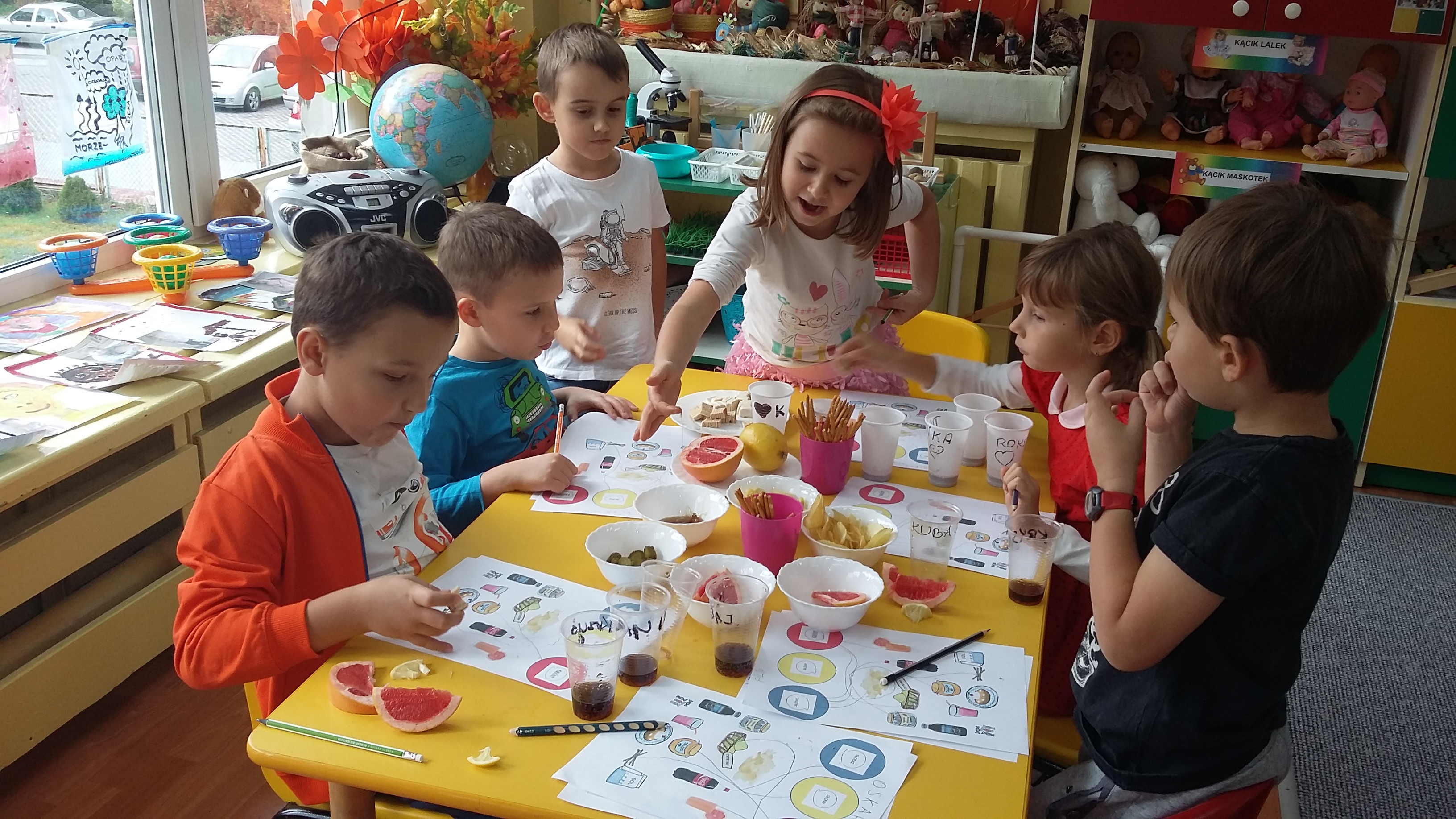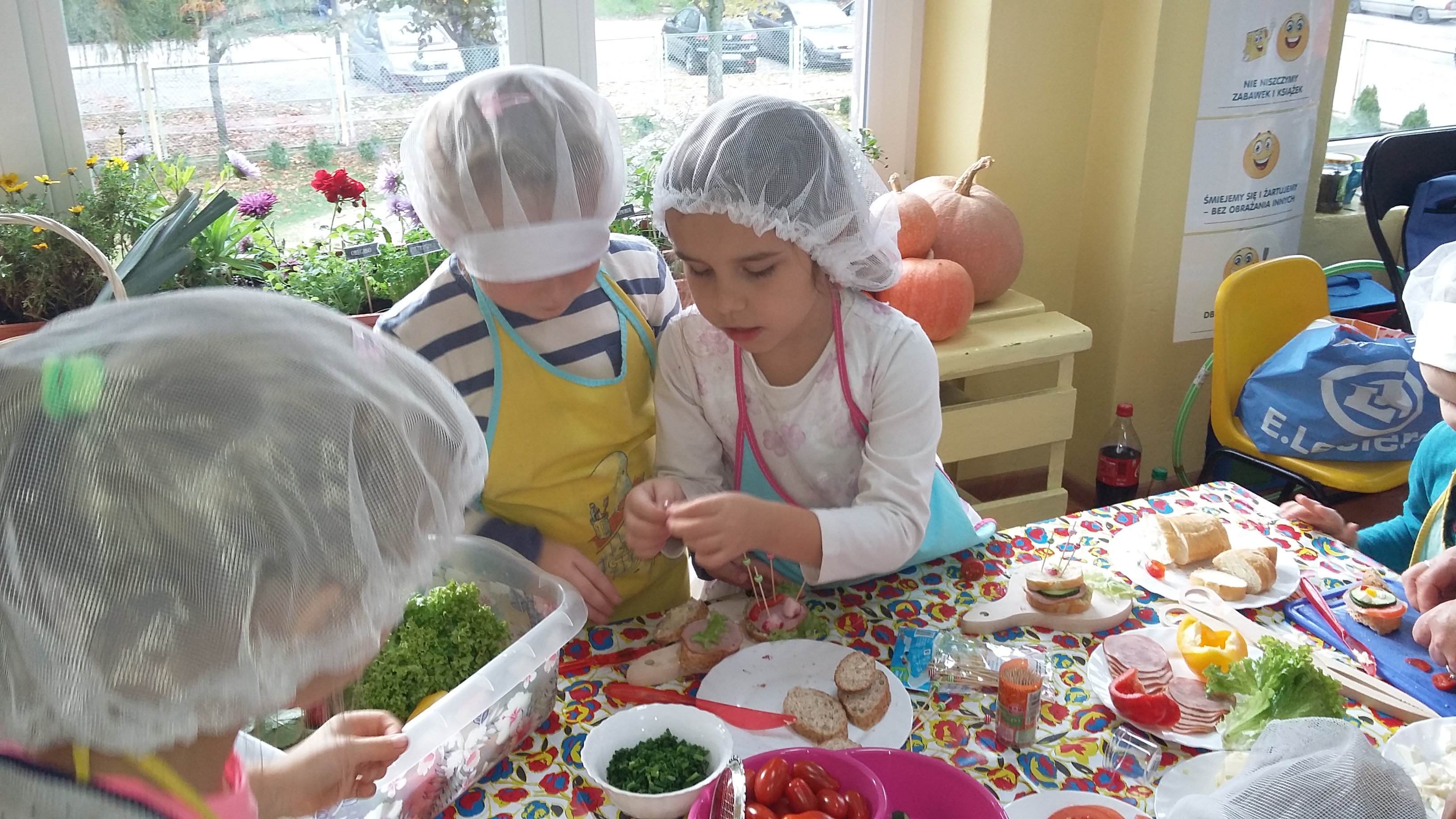 Najlepszym sposobem na naukę jest doświadczanie świata na własnej skórze już od najmłodszych lat – taka idea przyświeca pedagogice Froebla. W ramach jej działalności dzieci mogą uczestniczyć w licznych warsztatach i aktywnościach, które pozwalają poznać otaczający świat. Realizowaliśmy cykl zajęć z zakresu tematyki prozdrowotnej. Rozmawialiśmy o zasadach zdrowego odżywiania, przedszkolaki tworzyły piramidę zdrowego żywienia. Podczas teatrzyku stolikowego Doktor Rybka zachęcił starszaki do dbania o zdrowie. Później dzieci w poszczególnych kącikach realizowały zadania związane z profilaktyką. W kąciku Darów tworzyły zdrowe twarze kobiet i mężczyzn z wykorzystaniem Daru 7, Daru 8, Daru 9 i Daru 10. DAR 7 tworzy zestaw mozaiki geometrycznej złożonej z kół, półkoli, rombów, kwadratów oraz różnych rodzajów trójkątów w następujących kolorach: zielonym, czerwonym, fioletowym, białym, czarnym, niebieskim oraz żółtym. Każda z figur ma średnicę ok. 1 cm. Oprócz poznawania nazw figur, różnicowania kształtów i kolorów, w kontakcie z Darem 7 dziecko ma okazję do komponowania obrazów, łączenia kolorów i figur, układania rytmów, poszukiwania zależności oraz podobieństw. Dar 7 to bogactwo kształtów, kolorów i możliwości. DAR 8 to proste patyczki o zróżnicowanej długości– od 2,5 cm do 15 cm. Spośród każdej długości występują patyczki w takich samych kolorach, jak elementy Daru 7- zielonym, czerwonym, fioletowym, białym, czarnym, niebieskim oraz żółtym. Otrzymując Dar 8 dziecko zyskuje możliwość porównywania długości, odmierzania, nazywania kolorów, układania rytmów, ale także pojedynczych liter czy całych wyrazów. Dar 8 to także doskonałe narzędzie konstrukcyjne. Rozwija sprawność manualną, wyobraźnię przestrzenną, pobudza do poszukiwania i tworzenia. Zestaw kół oraz półkoli w kolorach czerwonym, zielonym, niebieskim, fioletowym, żółtym oraz pomarańczowym to DAR 9. Kształtuje on pojęcie całości oraz połowy. Różnorodność kolorów sprzyja budowaniu obrazów pochodzących wprost z dziecięcej wyobraźni. Magiczny świat kolorowych pół i półkoli jednocześnie inspiruje do twórczości, oraz do poszukiwania całości, cykliczności, logiki i porządku. W Kąciku Twórczym projektowały postacie sportowców z wykorzystaniem naturalnie barwionej masy solnej. W Kąciku Badawczym próbowały różnych pokarmów i płynów i określały ich smak. Swoje spostrzeżenia notowały na karcie pracy. Tworzyły również tabele ulubionych smaków. W Kąciku gospodarczym dzieci robiły zdrowe kanapki z wykorzystaniem produktów zakupionych w zdrowej żywności. Później dzieci ze smakiem zjadły pyszne kanapki.