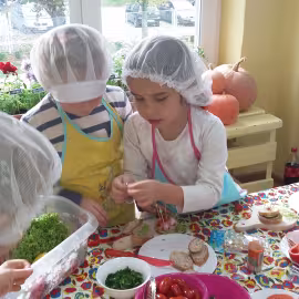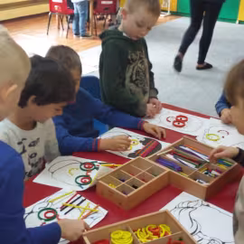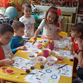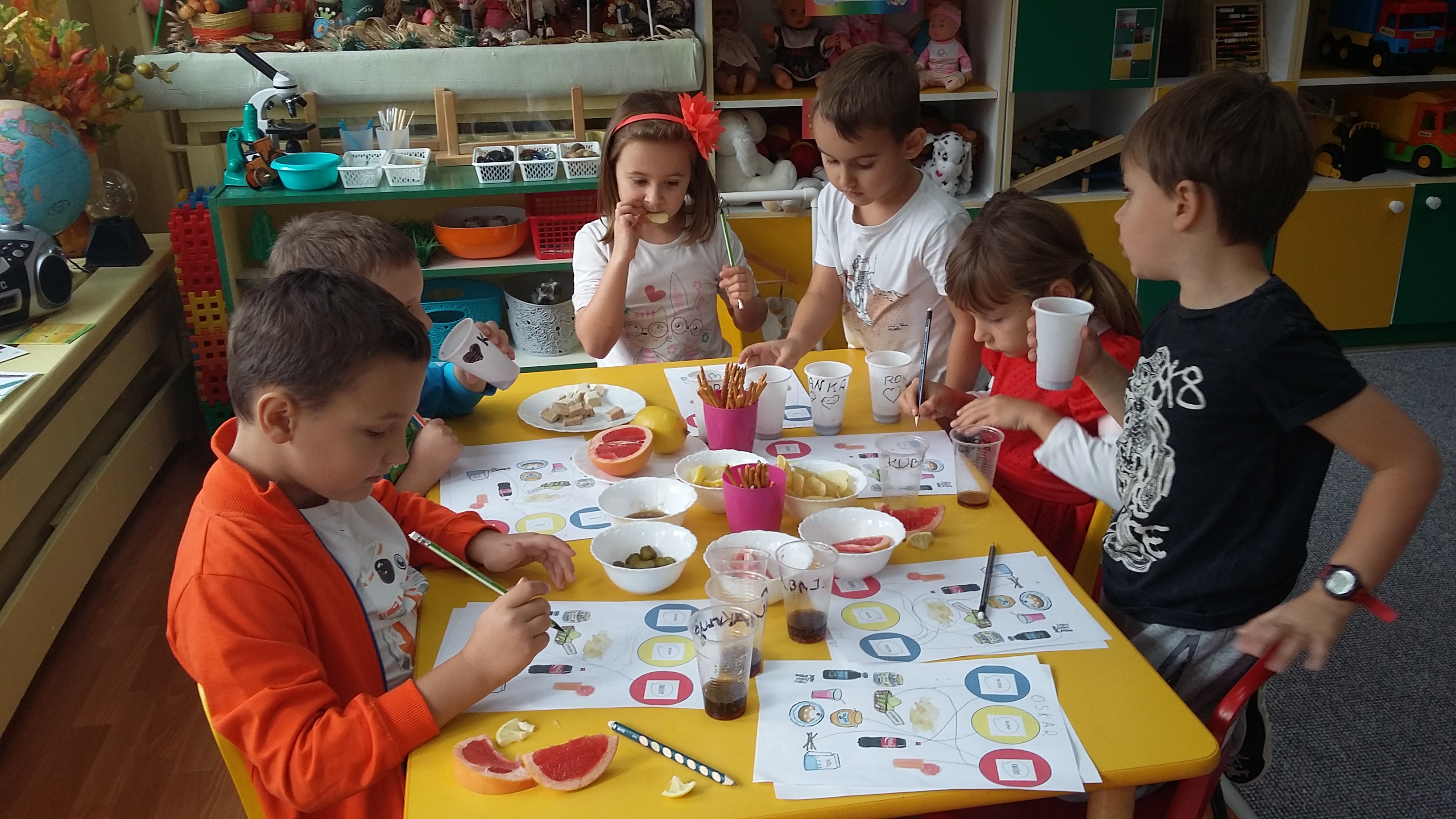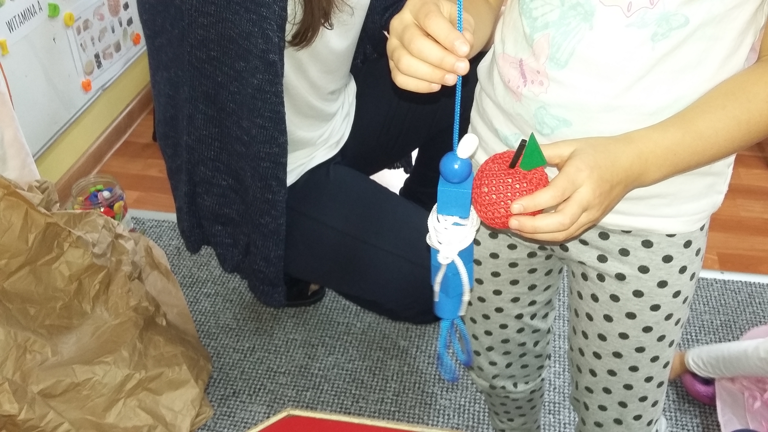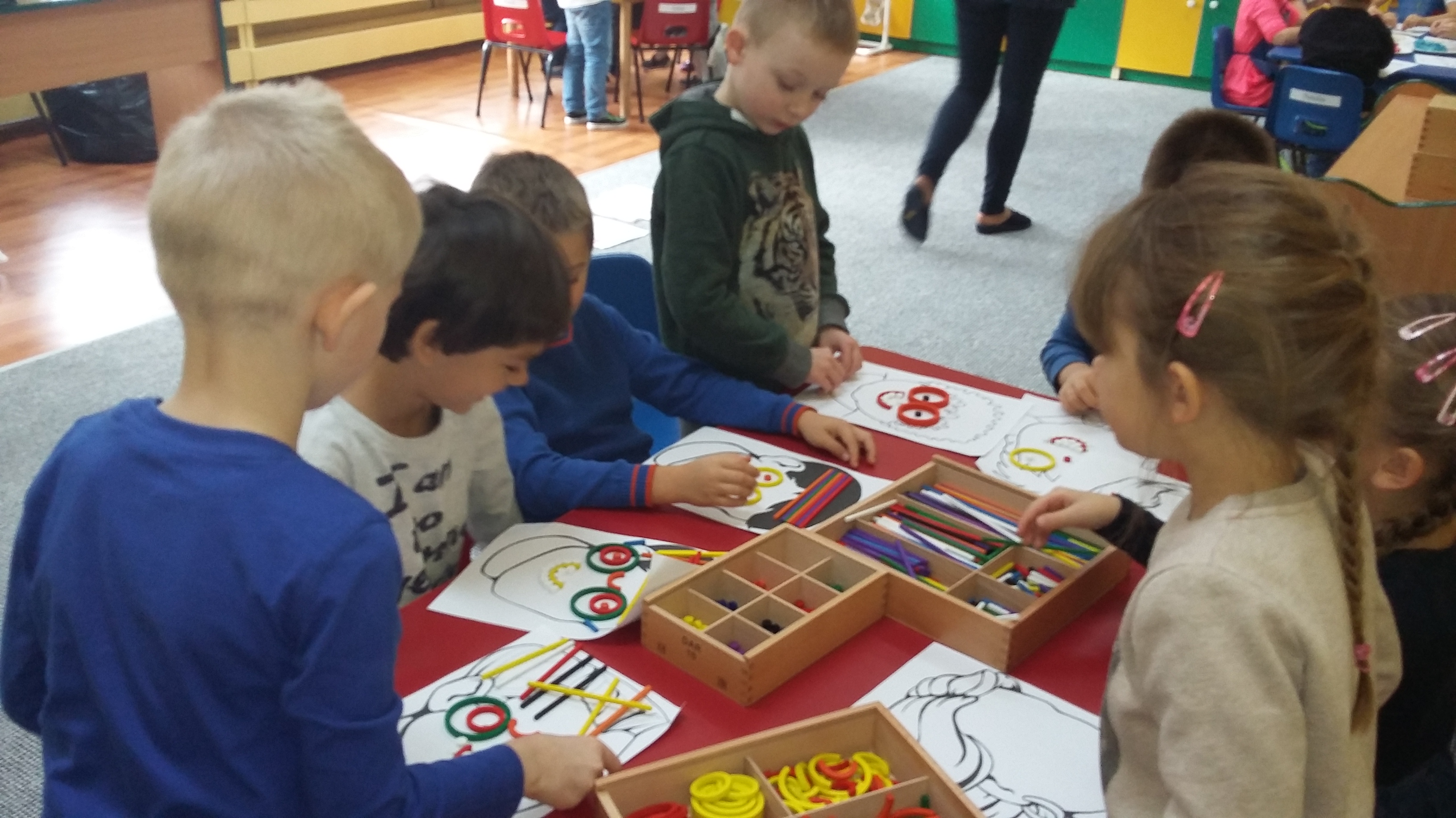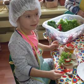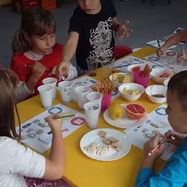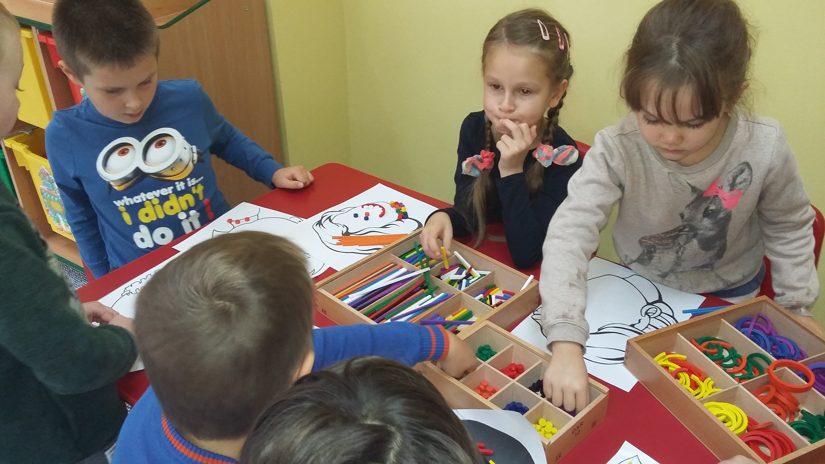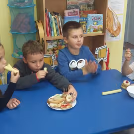 Najlepszym sposobem na naukę jest doświadczanie świata na własnej skórze już od najmłodszych lat – taka idea przyświeca pedagogice Froebla. W ramach jej działalności dzieci mogą uczestniczyć w licznych warsztatach i aktywnościach, które pozwalają poznać otaczający świat. Realizowaliśmy cykl zajęć z zakresu tematyki prozdrowotnej. Rozmawialiśmy o zasadach zdrowego odżywiania, przedszkolaki tworzyły piramidę zdrowego żywienia. Podczas teatrzyku stolikowego Doktor Rybka zachęcił starszaki do dbania o zdrowie. Później dzieci w poszczególnych kącikach realizowały zadania związane z profilaktyką. W kąciku Darów tworzyły zdrowe twarze kobiet i mężczyzn z wykorzystaniem Daru 7, Daru 8, Daru 9 i Daru 10. DAR 7 tworzy zestaw mozaiki geometrycznej złożonej z kół, półkoli, rombów, kwadratów oraz różnych rodzajów trójkątów w następujących kolorach: zielonym, czerwonym, fioletowym, białym, czarnym, niebieskim oraz żółtym. Każda z figur ma średnicę ok. 1 cm. Oprócz poznawania nazw figur, różnicowania kształtów i kolorów, w kontakcie z Darem 7 dziecko ma okazję do komponowania obrazów, łączenia kolorów i figur, układania rytmów, poszukiwania zależności oraz podobieństw. Dar 7 to bogactwo kształtów, kolorów i możliwości. DAR 8 to proste patyczki o zróżnicowanej długości– od 2,5 cm do 15 cm. Spośród każdej długości występują patyczki w takich samych kolorach, jak elementy Daru 7- zielonym, czerwonym, fioletowym, białym, czarnym, niebieskim oraz żółtym. Otrzymując Dar 8 dziecko zyskuje możliwość porównywania długości, odmierzania, nazywania kolorów, układania rytmów, ale także pojedynczych liter czy całych wyrazów. Dar 8 to także doskonałe narzędzie konstrukcyjne. Rozwija sprawność manualną, wyobraźnię przestrzenną, pobudza do poszukiwania i tworzenia. Zestaw kół oraz półkoli w kolorach czerwonym, zielonym, niebieskim, fioletowym, żółtym oraz pomarańczowym to DAR 9. Kształtuje on pojęcie całości oraz połowy. Różnorodność kolorów sprzyja budowaniu obrazów pochodzących wprost z dziecięcej wyobraźni. Magiczny świat kolorowych pół i półkoli jednocześnie inspiruje do twórczości, oraz do poszukiwania całości, cykliczności, logiki i porządku. W Kąciku Twórczym projektowały postacie sportowców z wykorzystaniem naturalnie barwionej masy solnej. W Kąciku Badawczym próbowały różnych pokarmów i płynów i określały ich smak. Swoje spostrzeżenia notowały na karcie pracy. Tworzyły również tabele ulubionych smaków. W Kąciku gospodarczym dzieci robiły zdrowe kanapki z wykorzystaniem produktów zakupionych w zdrowej żywności. Później dzieci ze smakiem zjadły pyszne kanapki.