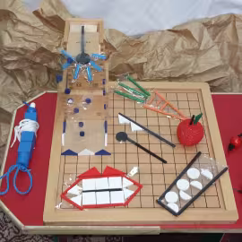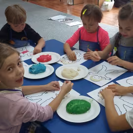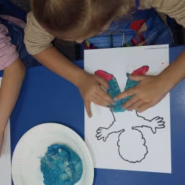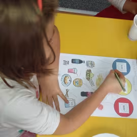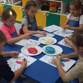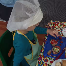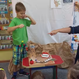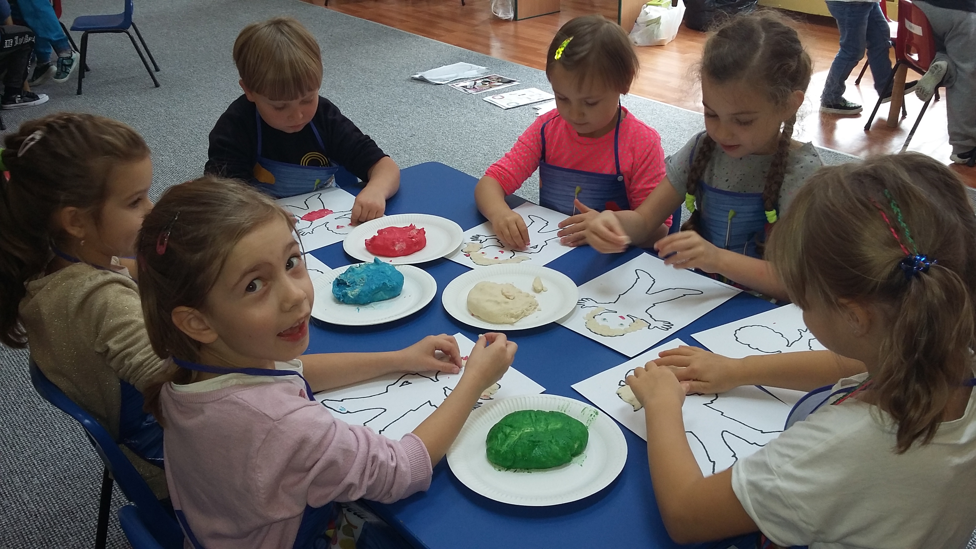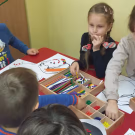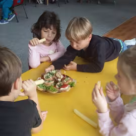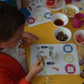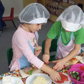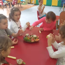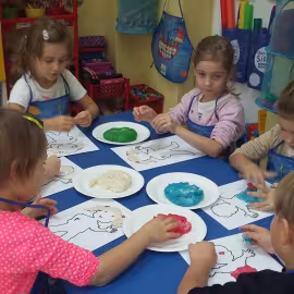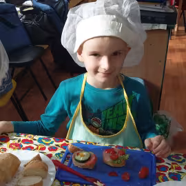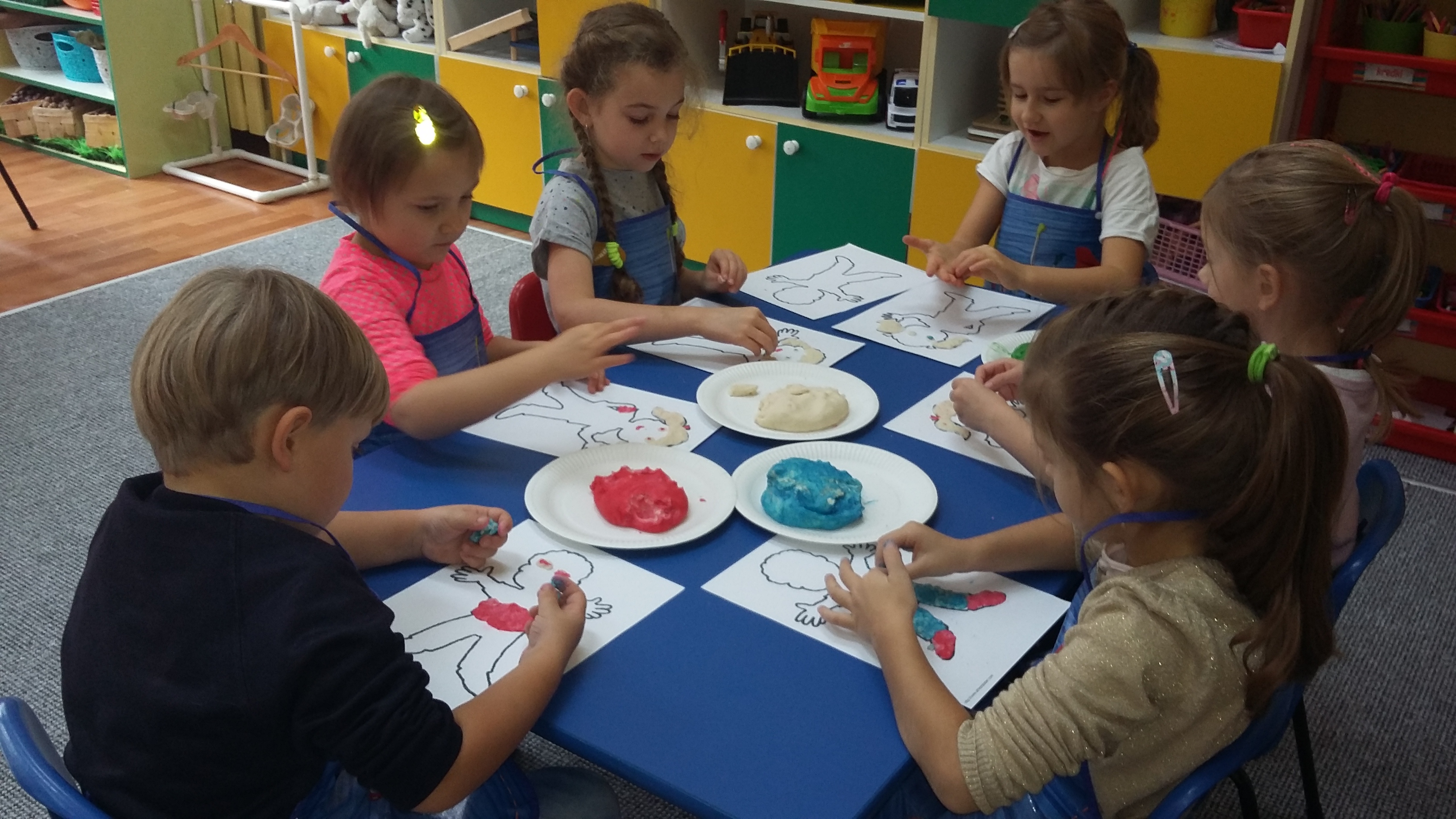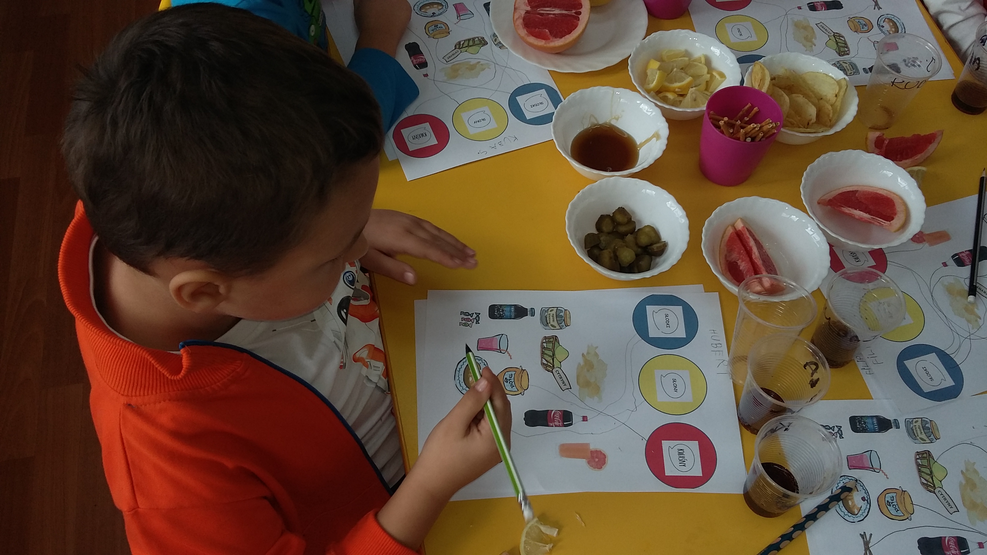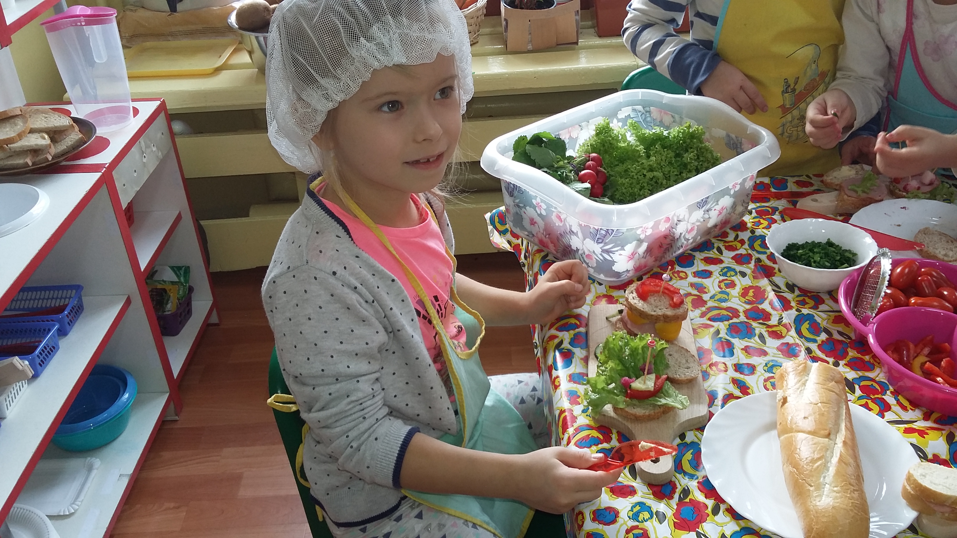 Najlepszym sposobem na naukę jest doświadczanie świata na własnej skórze już od najmłodszych lat – taka idea przyświeca pedagogice Froebla. W ramach jej działalności dzieci mogą uczestniczyć w licznych warsztatach i aktywnościach, które pozwalają poznać otaczający świat. Realizowaliśmy cykl zajęć z zakresu tematyki prozdrowotnej. Rozmawialiśmy o zasadach zdrowego odżywiania, przedszkolaki tworzyły piramidę zdrowego żywienia. Podczas teatrzyku stolikowego Doktor Rybka zachęcił starszaki do dbania o zdrowie. Później dzieci w poszczególnych kącikach realizowały zadania związane z profilaktyką. W kąciku Darów tworzyły zdrowe twarze kobiet i mężczyzn z wykorzystaniem Daru 7, Daru 8, Daru 9 i Daru 10. DAR 7 tworzy zestaw mozaiki geometrycznej złożonej z kół, półkoli, rombów, kwadratów oraz różnych rodzajów trójkątów w następujących kolorach: zielonym, czerwonym, fioletowym, białym, czarnym, niebieskim oraz żółtym. Każda z figur ma średnicę ok. 1 cm. Oprócz poznawania nazw figur, różnicowania kształtów i kolorów, w kontakcie z Darem 7 dziecko ma okazję do komponowania obrazów, łączenia kolorów i figur, układania rytmów, poszukiwania zależności oraz podobieństw. Dar 7 to bogactwo kształtów, kolorów i możliwości. DAR 8 to proste patyczki o zróżnicowanej długości– od 2,5 cm do 15 cm. Spośród każdej długości występują patyczki w takich samych kolorach, jak elementy Daru 7- zielonym, czerwonym, fioletowym, białym, czarnym, niebieskim oraz żółtym. Otrzymując Dar 8 dziecko zyskuje możliwość porównywania długości, odmierzania, nazywania kolorów, układania rytmów, ale także pojedynczych liter czy całych wyrazów. Dar 8 to także doskonałe narzędzie konstrukcyjne. Rozwija sprawność manualną, wyobraźnię przestrzenną, pobudza do poszukiwania i tworzenia. Zestaw kół oraz półkoli w kolorach czerwonym, zielonym, niebieskim, fioletowym, żółtym oraz pomarańczowym to DAR 9. Kształtuje on pojęcie całości oraz połowy. Różnorodność kolorów sprzyja budowaniu obrazów pochodzących wprost z dziecięcej wyobraźni. Magiczny świat kolorowych pół i półkoli jednocześnie inspiruje do twórczości, oraz do poszukiwania całości, cykliczności, logiki i porządku. W Kąciku Twórczym projektowały postacie sportowców z wykorzystaniem naturalnie barwionej masy solnej. W Kąciku Badawczym próbowały różnych pokarmów i płynów i określały ich smak. Swoje spostrzeżenia notowały na karcie pracy. Tworzyły również tabele ulubionych smaków. W Kąciku gospodarczym dzieci robiły zdrowe kanapki z wykorzystaniem produktów zakupionych w zdrowej żywności. Później dzieci ze smakiem zjadły pyszne kanapki.