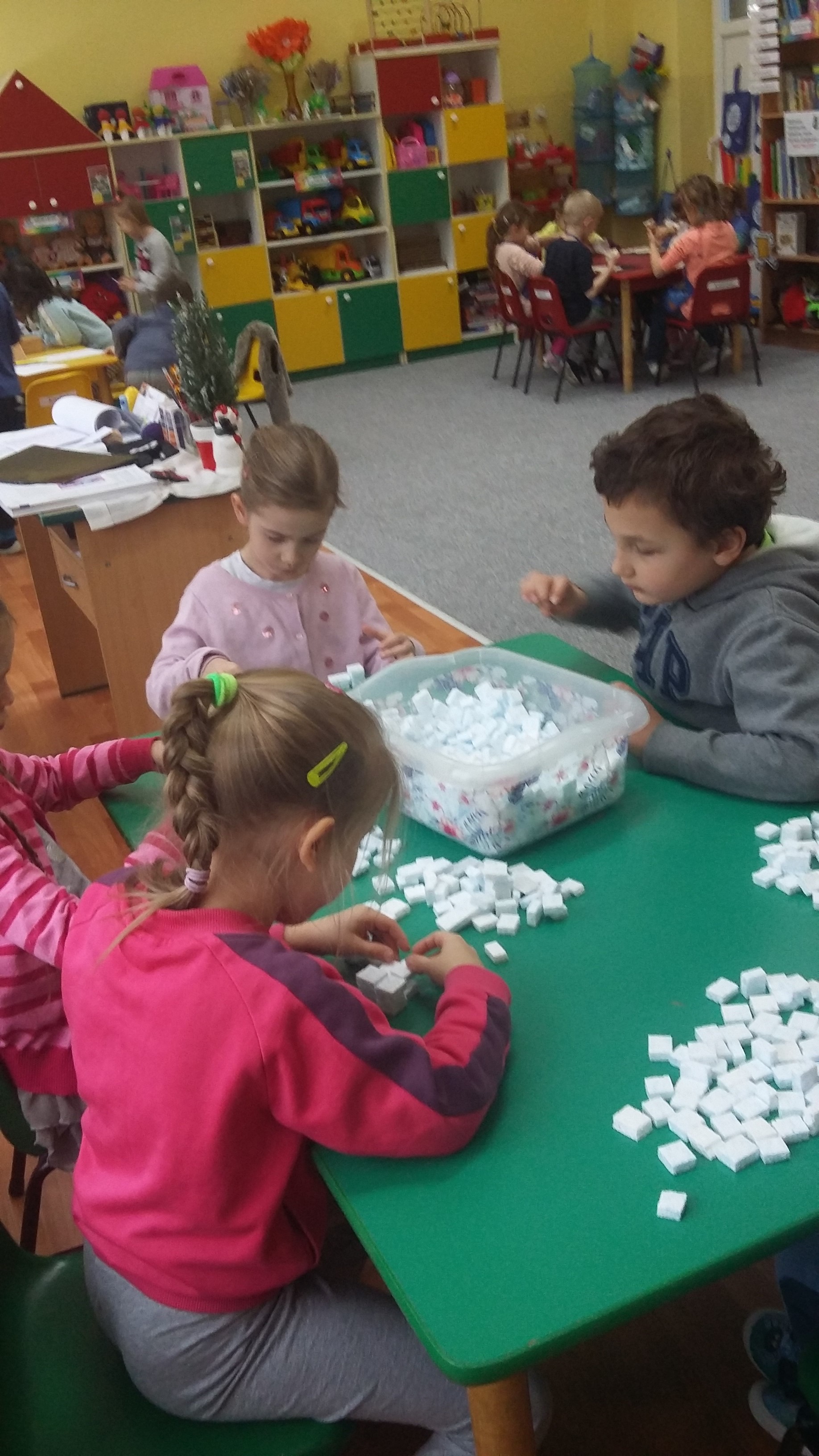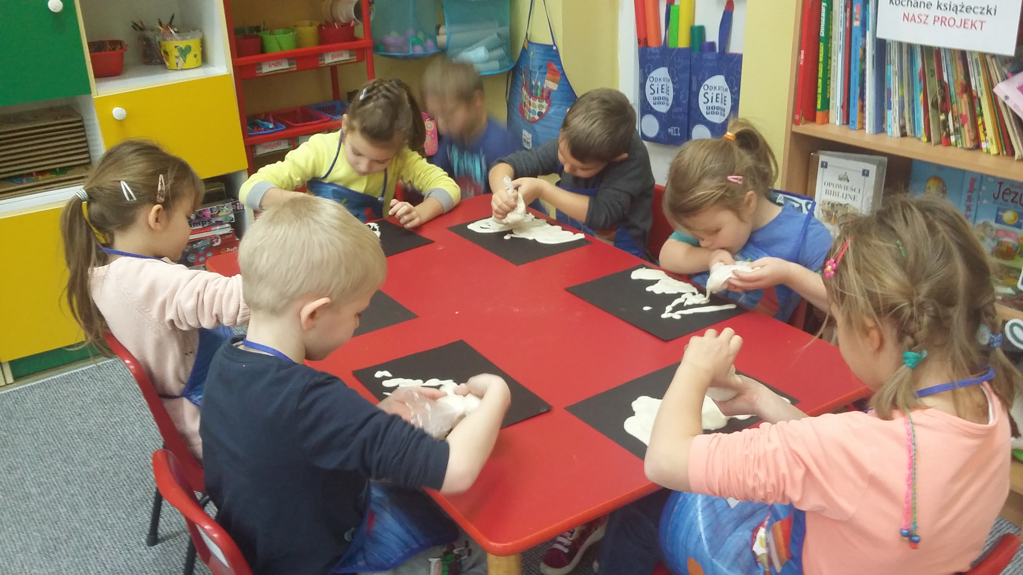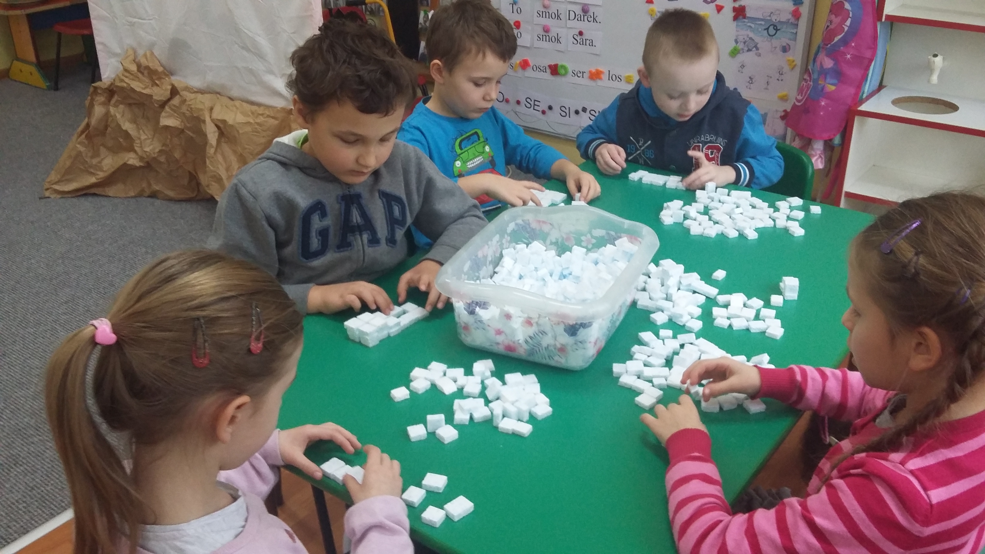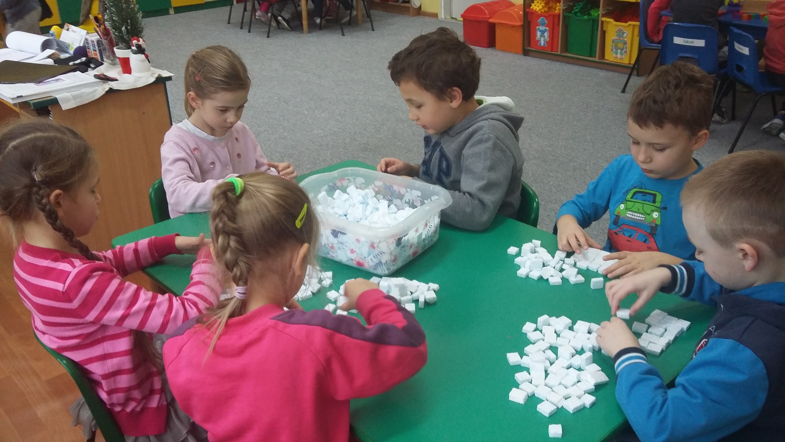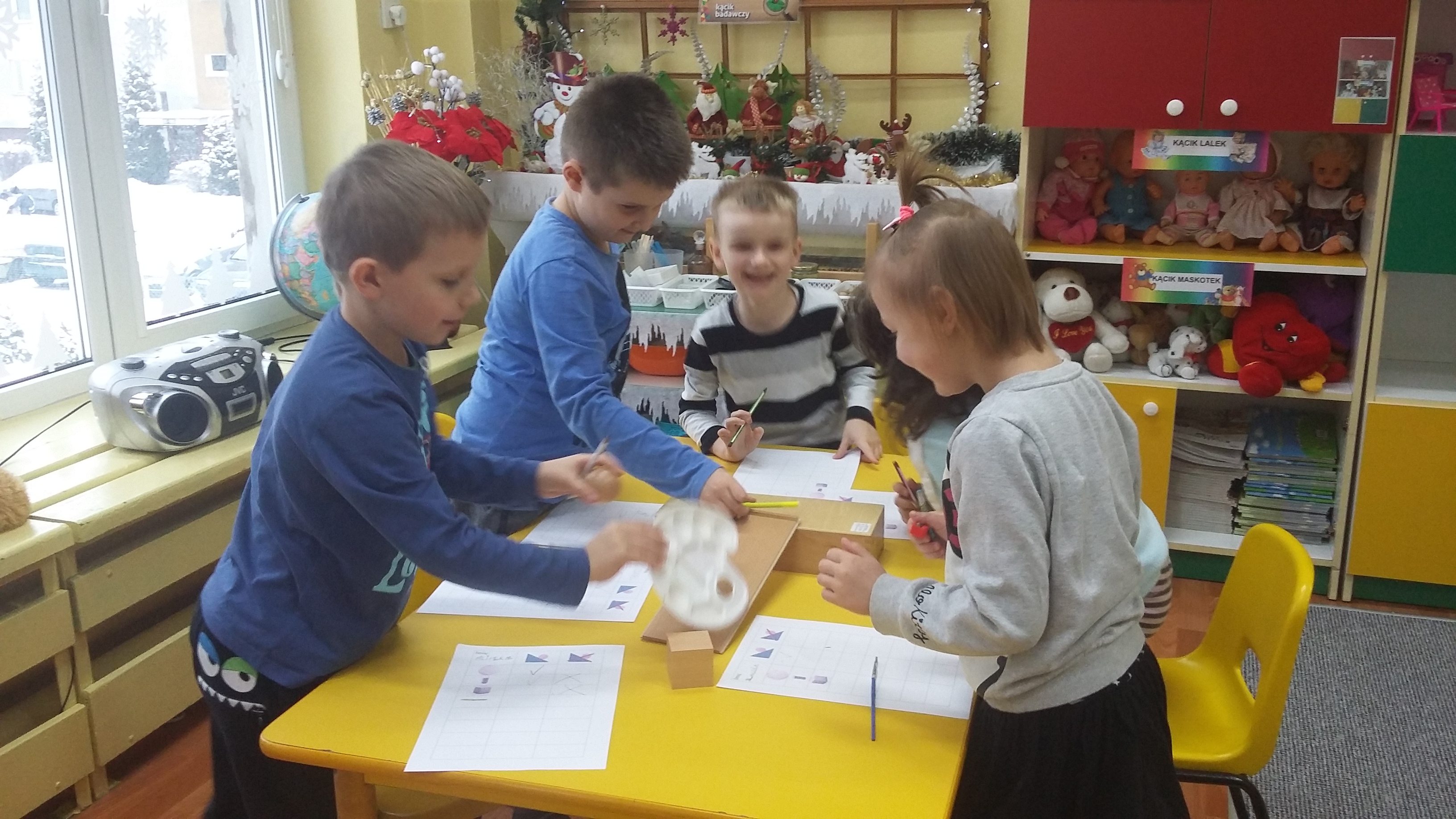W czasie realizacji tematu kompleksowego „Tworzymy obrazy- zimowe krajobrazy” poprzez słuchanie opowiadań dzieci poznały m. in. elementy krajobrazu górskiego. Inscenizacja teatrzyku cieni o „Krainie trzech gór” uświadomiła dzieciom konieczność niesienia pomocy innym oraz w ciekawy sposób przedstawiła zjawisko toczenia się figur przestrzennych tj. kula, sześcian i walec z daru 2. Dzieci bardzo aktywnie współpracowały w kącikach zabawowo- zadaniowych. W Kąciku Darów budowały makietę Trzech gór z wykorzystaniem darów przestrzennych oraz pudełek po darach. Dodatkowo dzieci wzbogaciły swoją budowlę o zjeżdżalnię i wyciągi narciarskie. W Kąciku Twórczym dzieci sporządziły rozwodnioną masę solną, którą wyciskały przez zrobiony ze zwykłej torebki foliowej „rękaw cukierniczy”. Tym samym tworzyły krajobraz z teatrzyku z Porannego kręgu. W Kąciku Badawczym przedszkolaki sprawdzały pojęcia matematyczne w praktyce. Z pudełka po darze 1 zrobiły pochylnię, za pomocą, której klasyfikowały przedmioty, które się toczą, a które nie. Swoje spostrzeżenia skrzętnie notowały na karcie pracy. W Kąciku Gospodarczym układały trzy góry z wykorzystaniem barwionych i pociętych kawałków styropianu. Zadanie nie było łatwe ze względu na „lekkość” materiału budowlanego jakim były styropianowe cegiełki.