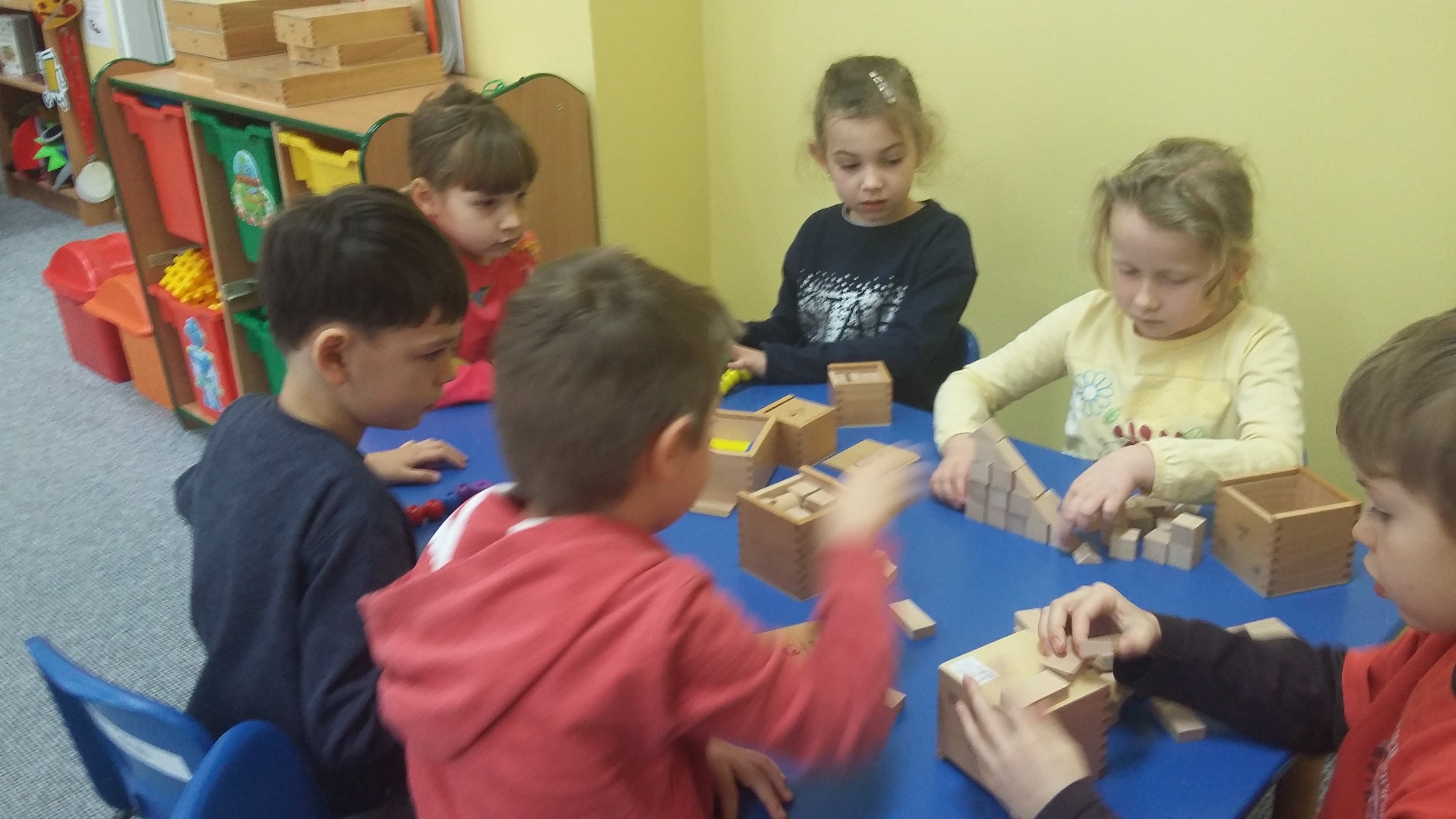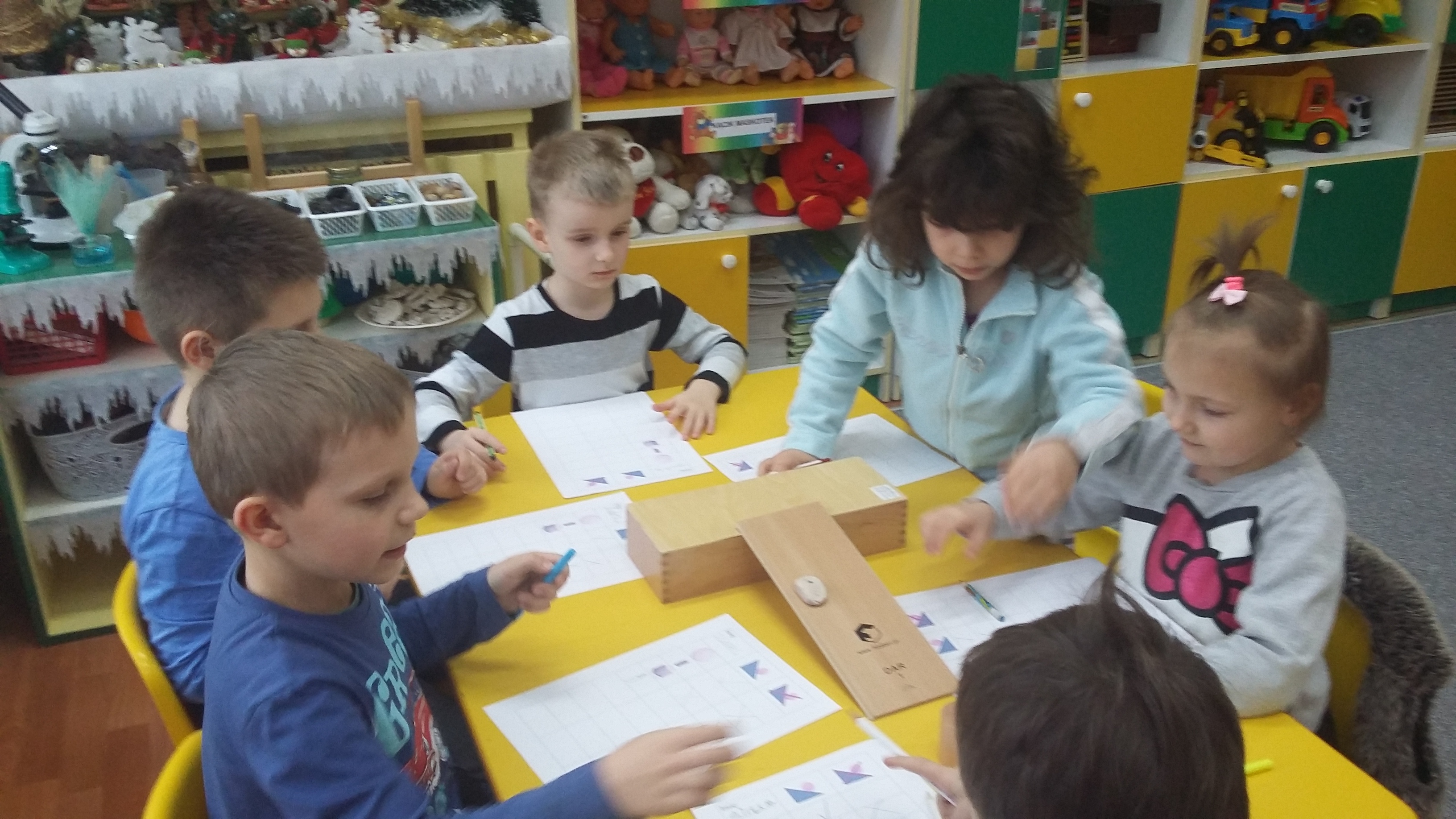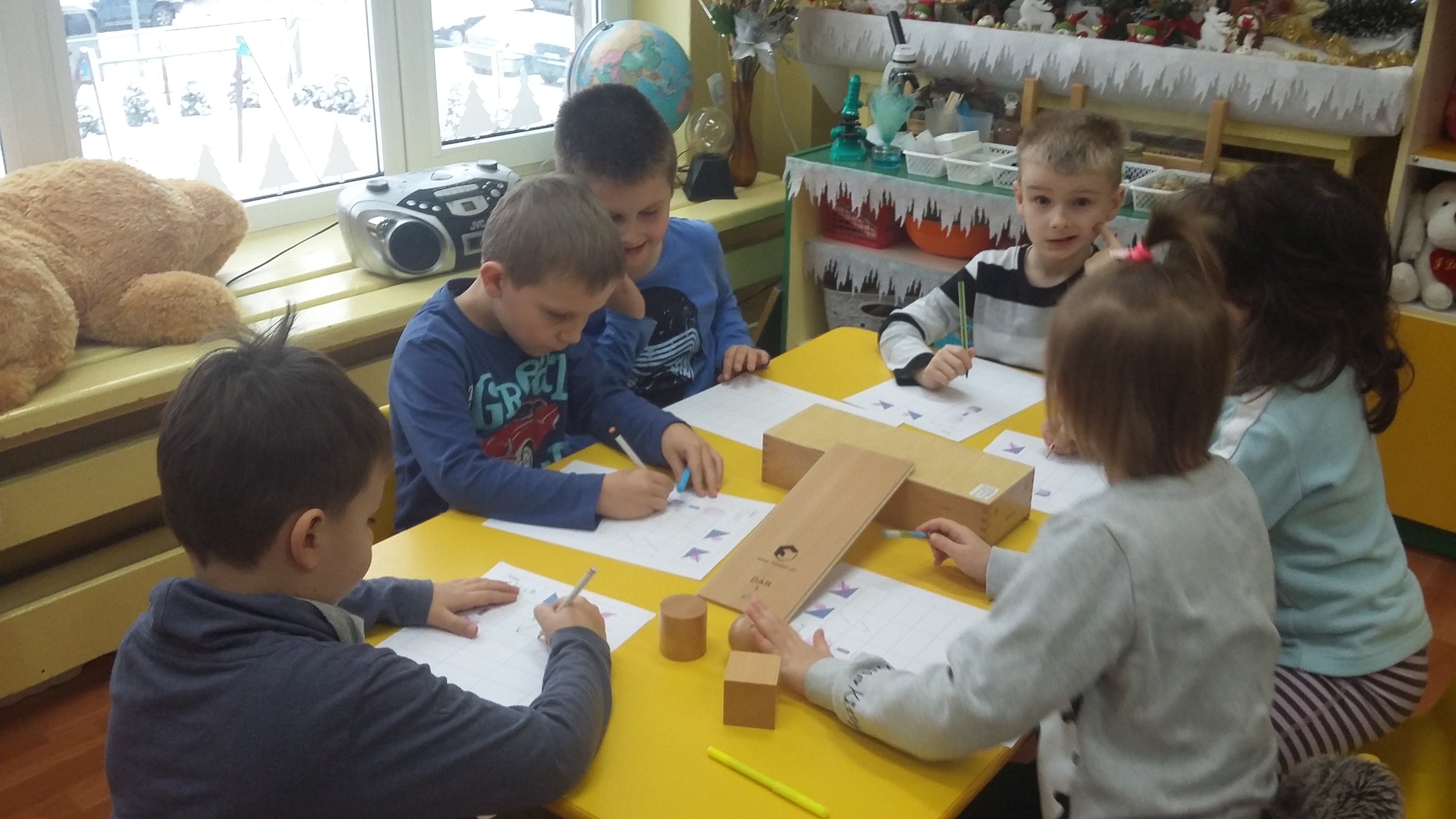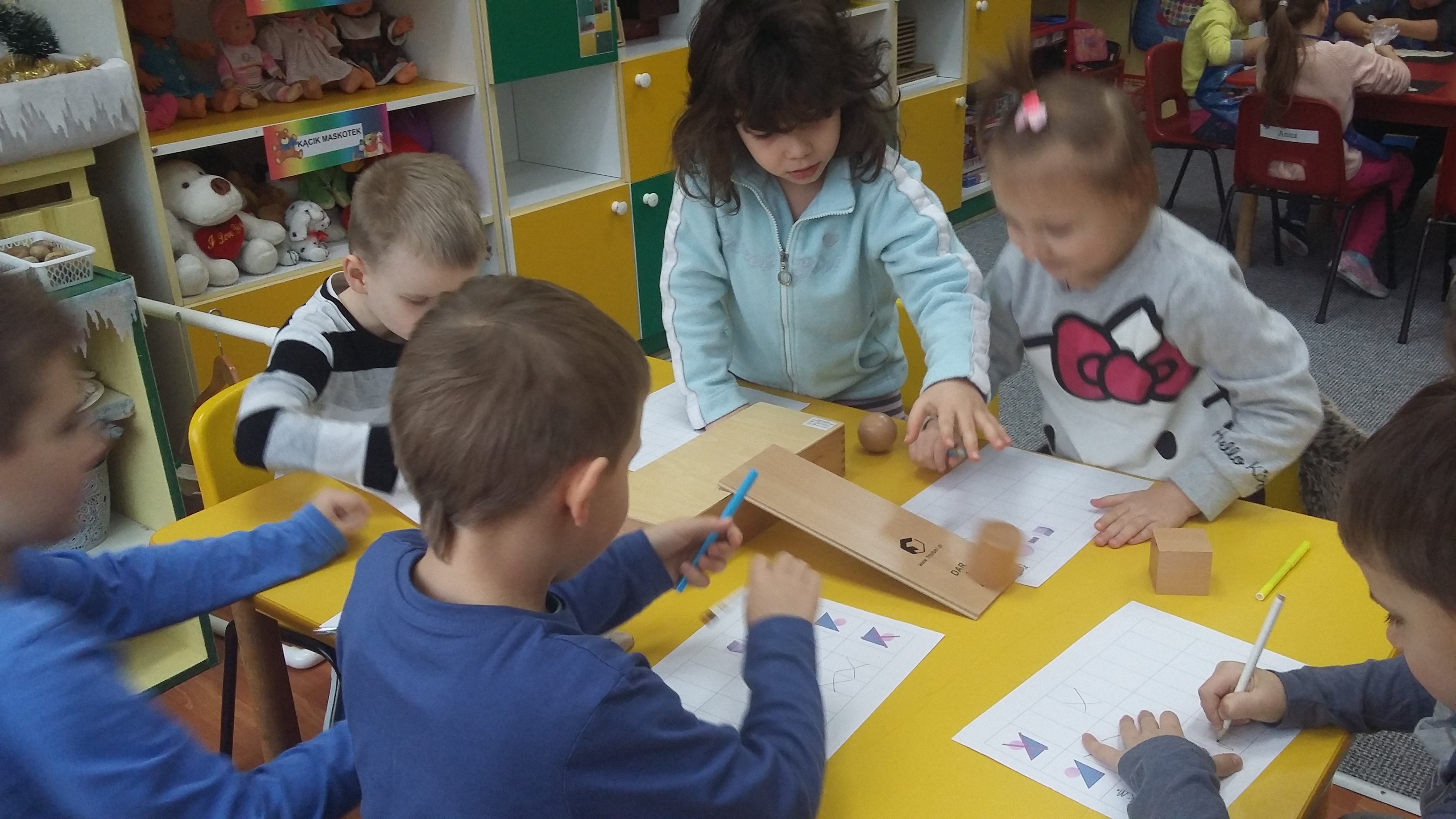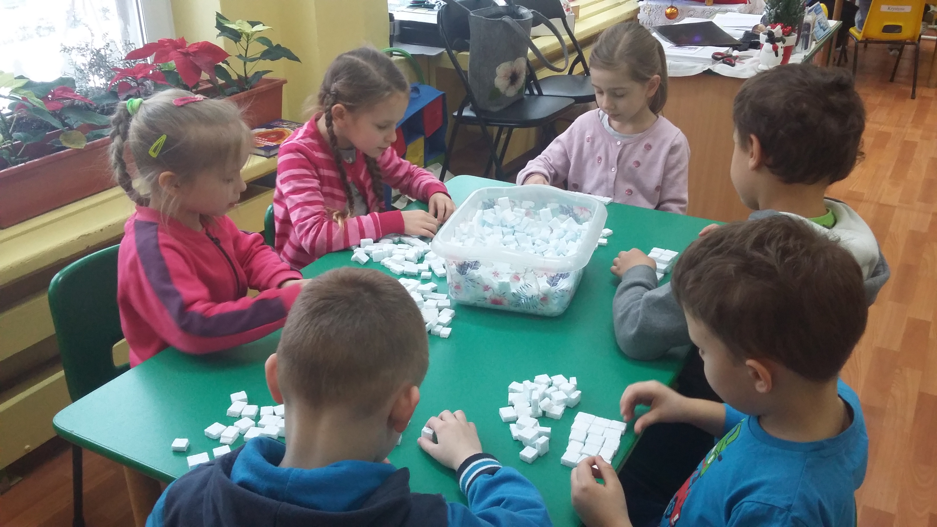 W czasie realizacji tematu kompleksowego „Tworzymy obrazy- zimowe krajobrazy” poprzez słuchanie opowiadań dzieci poznały m. in. elementy krajobrazu górskiego. Inscenizacja teatrzyku cieni o „Krainie trzech gór” uświadomiła dzieciom konieczność niesienia pomocy innym oraz w ciekawy sposób przedstawiła zjawisko toczenia się figur przestrzennych tj. kula, sześcian i walec z daru 2. Dzieci bardzo aktywnie współpracowały w kącikach zabawowo- zadaniowych. W Kąciku Darów budowały makietę Trzech gór z wykorzystaniem darów przestrzennych oraz pudełek po darach. Dodatkowo dzieci wzbogaciły swoją budowlę o zjeżdżalnię i wyciągi narciarskie. W Kąciku Twórczym dzieci sporządziły rozwodnioną masę solną, którą wyciskały przez zrobiony ze zwykłej torebki foliowej „rękaw cukierniczy”. Tym samym tworzyły krajobraz z teatrzyku z Porannego kręgu. W Kąciku Badawczym przedszkolaki sprawdzały pojęcia matematyczne w praktyce. Z pudełka po darze 1 zrobiły pochylnię, za pomocą, której klasyfikowały przedmioty, które się toczą, a które nie. Swoje spostrzeżenia skrzętnie notowały na karcie pracy. W Kąciku Gospodarczym układały trzy góry z wykorzystaniem barwionych i pociętych kawałków styropianu. Zadanie nie było łatwe ze względu na „lekkość” materiału budowlanego jakim były styropianowe cegiełki.