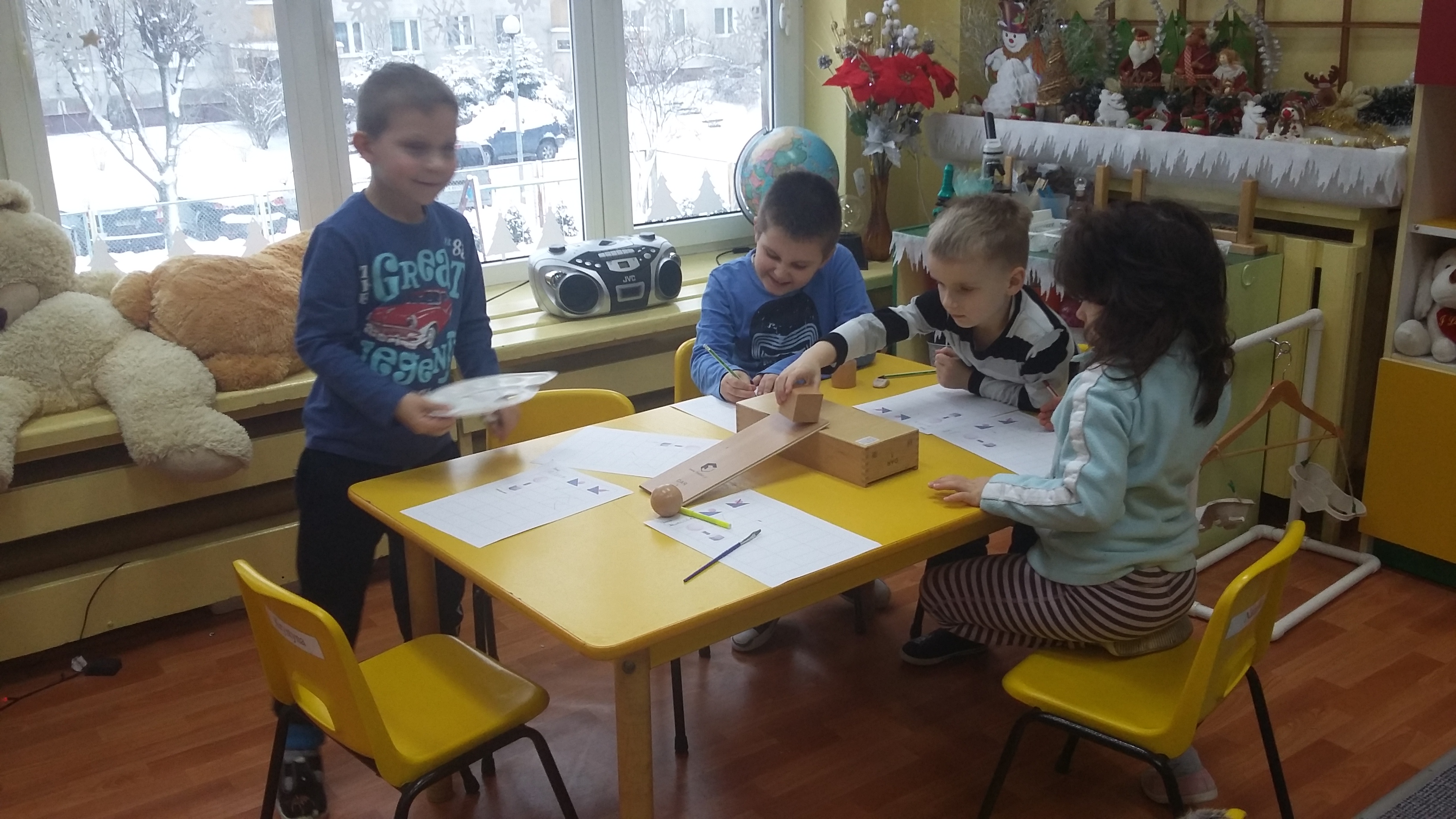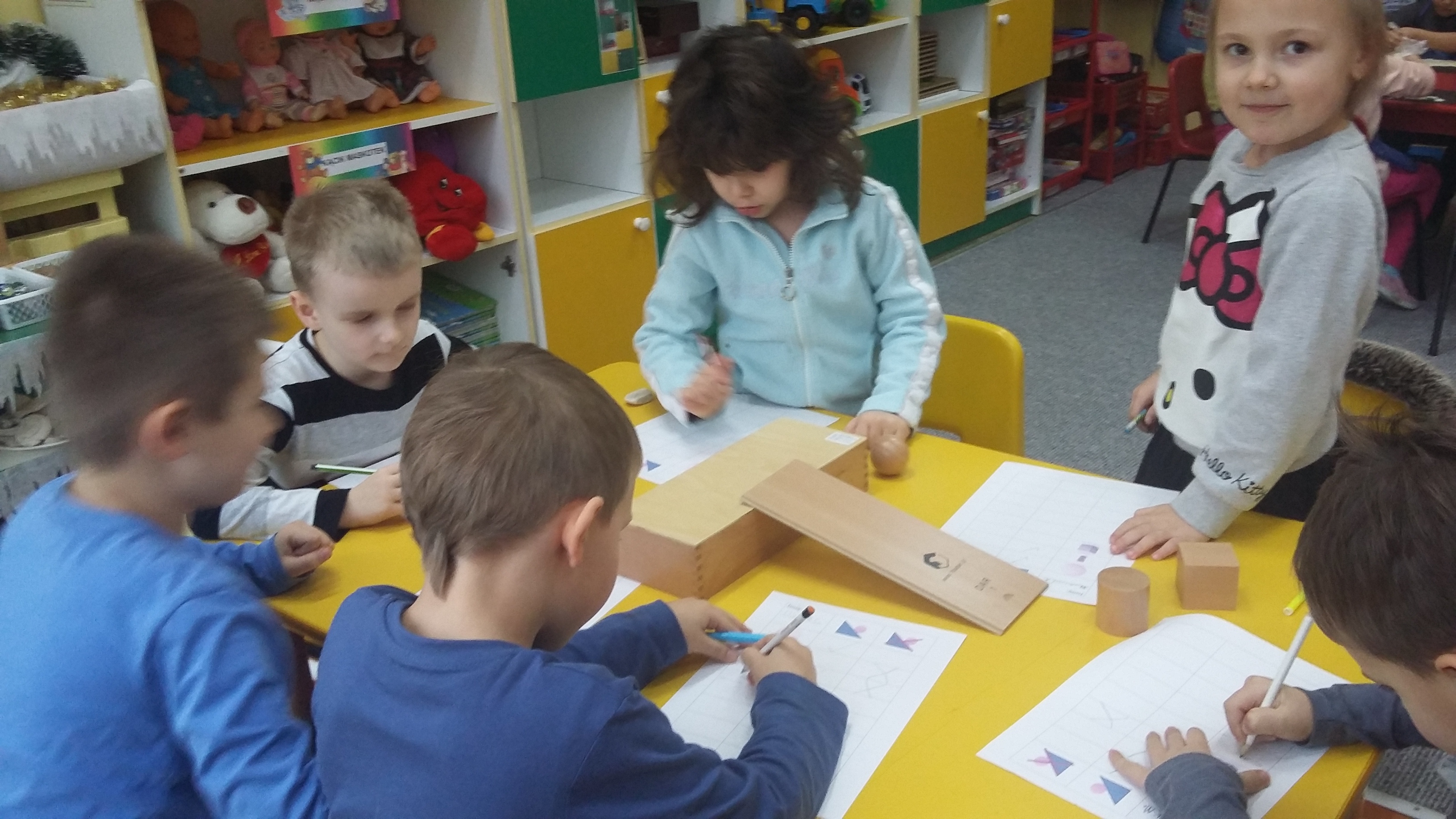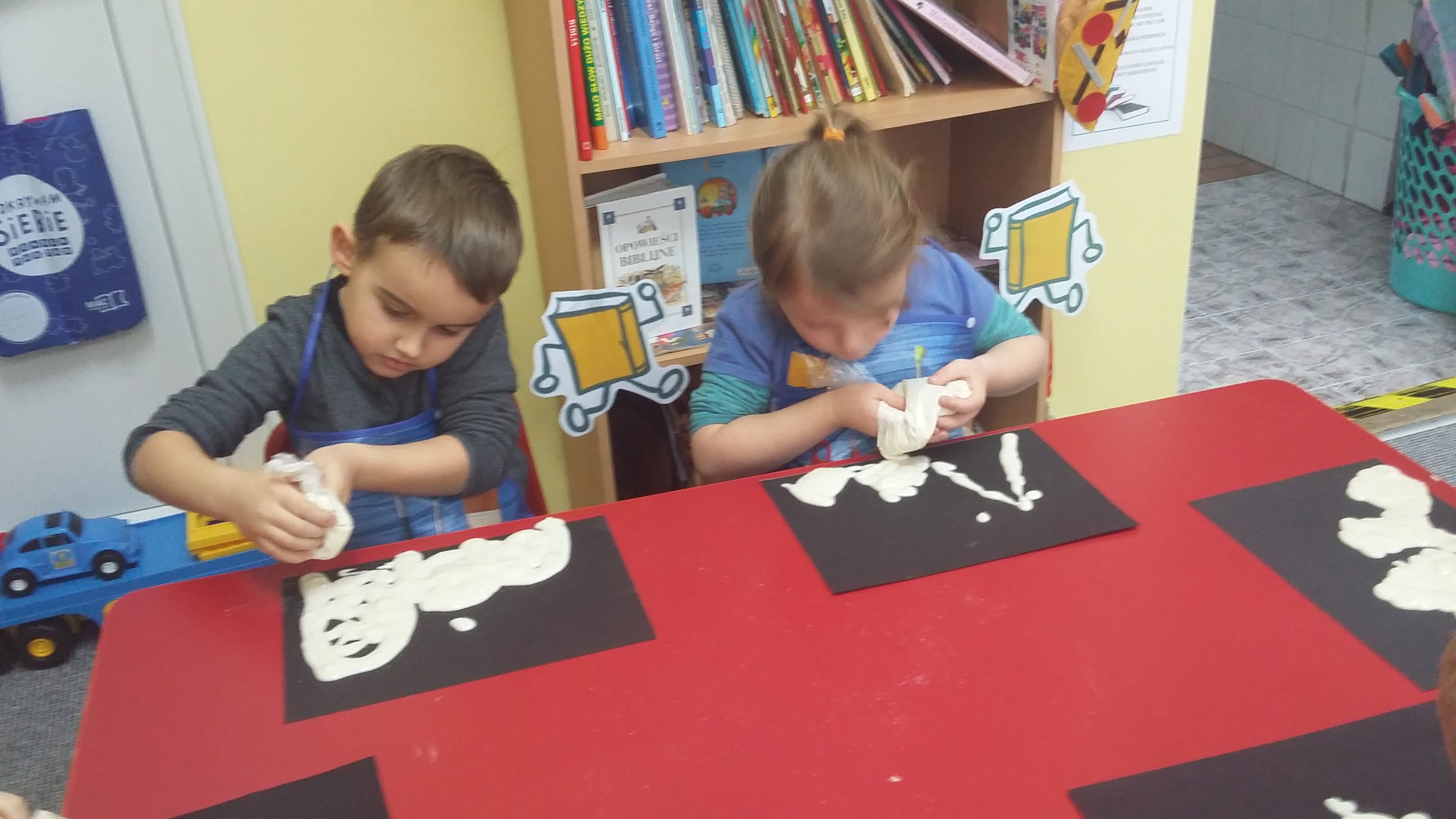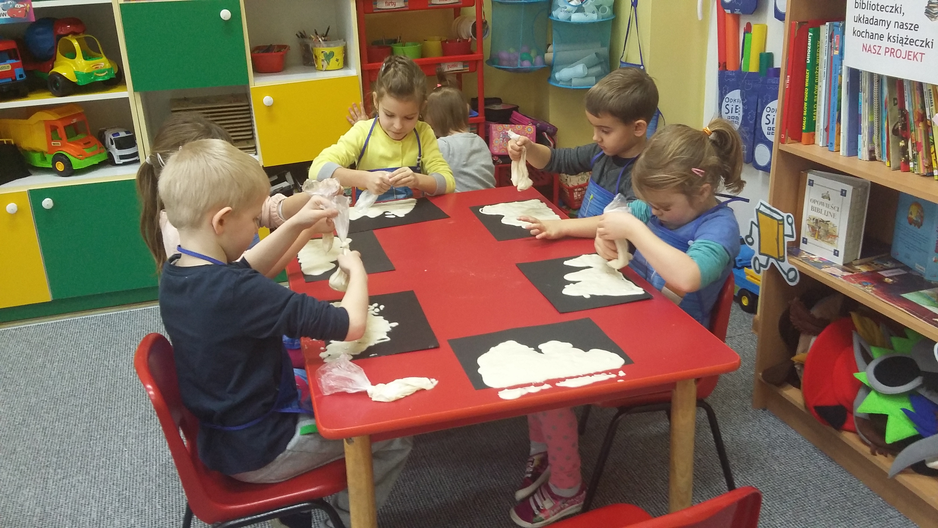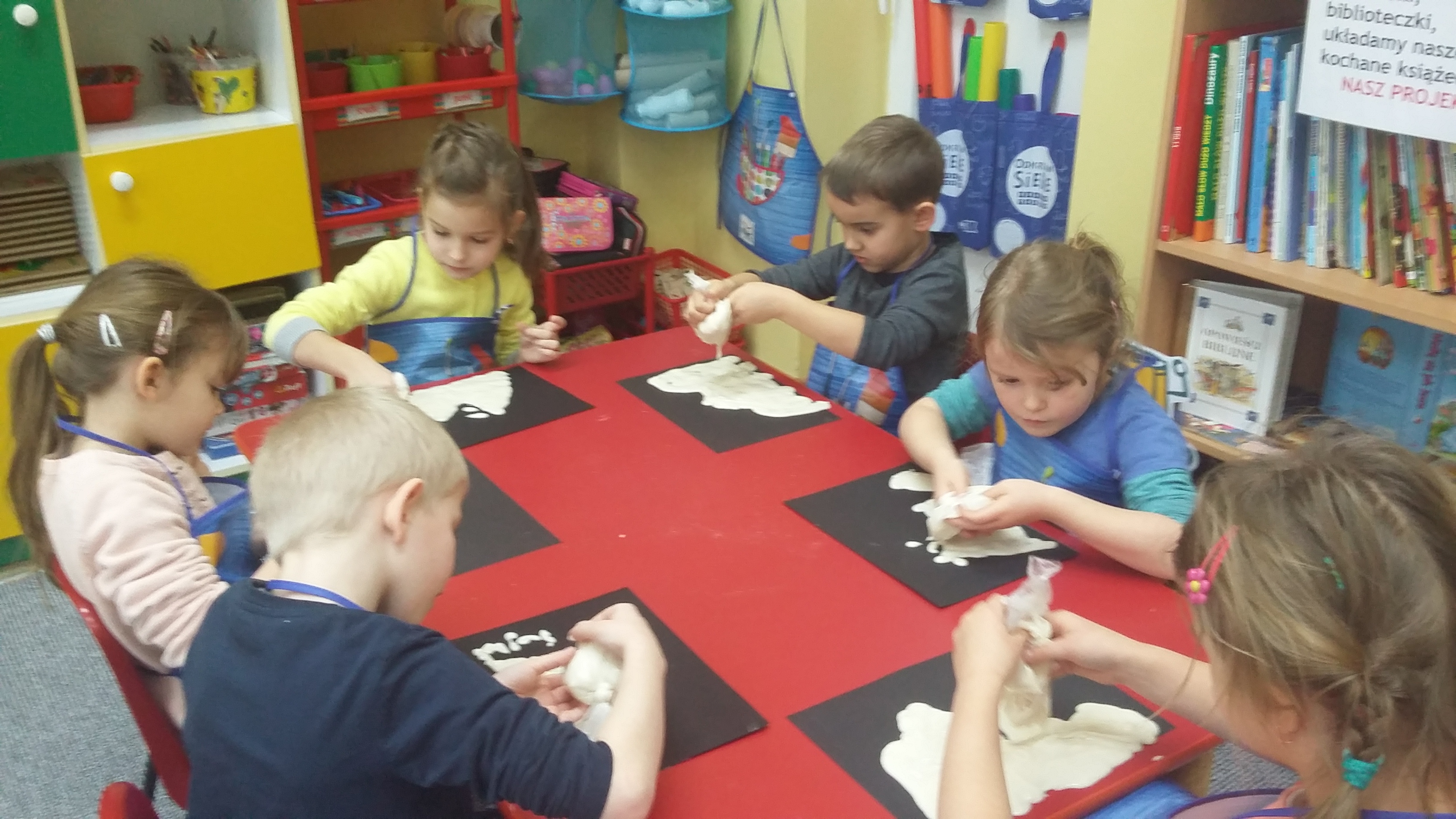 W czasie realizacji tematu kompleksowego „Tworzymy obrazy- zimowe krajobrazy” poprzez słuchanie opowiadań dzieci poznały m. in. elementy krajobrazu górskiego. Inscenizacja teatrzyku cieni o „Krainie trzech gór” uświadomiła dzieciom konieczność niesienia pomocy innym oraz w ciekawy sposób przedstawiła zjawisko toczenia się figur przestrzennych tj. kula, sześcian i walec z daru 2. Dzieci bardzo aktywnie współpracowały w kącikach zabawowo- zadaniowych. W Kąciku Darów budowały makietę Trzech gór z wykorzystaniem darów przestrzennych oraz pudełek po darach. Dodatkowo dzieci wzbogaciły swoją budowlę o zjeżdżalnię i wyciągi narciarskie. W Kąciku Twórczym dzieci sporządziły rozwodnioną masę solną, którą wyciskały przez zrobiony ze zwykłej torebki foliowej „rękaw cukierniczy”. Tym samym tworzyły krajobraz z teatrzyku z Porannego kręgu. W Kąciku Badawczym przedszkolaki sprawdzały pojęcia matematyczne w praktyce. Z pudełka po darze 1 zrobiły pochylnię, za pomocą, której klasyfikowały przedmioty, które się toczą, a które nie. Swoje spostrzeżenia skrzętnie notowały na karcie pracy. W Kąciku Gospodarczym układały trzy góry z wykorzystaniem barwionych i pociętych kawałków styropianu. Zadanie nie było łatwe ze względu na „lekkość” materiału budowlanego jakim były styropianowe cegiełki.