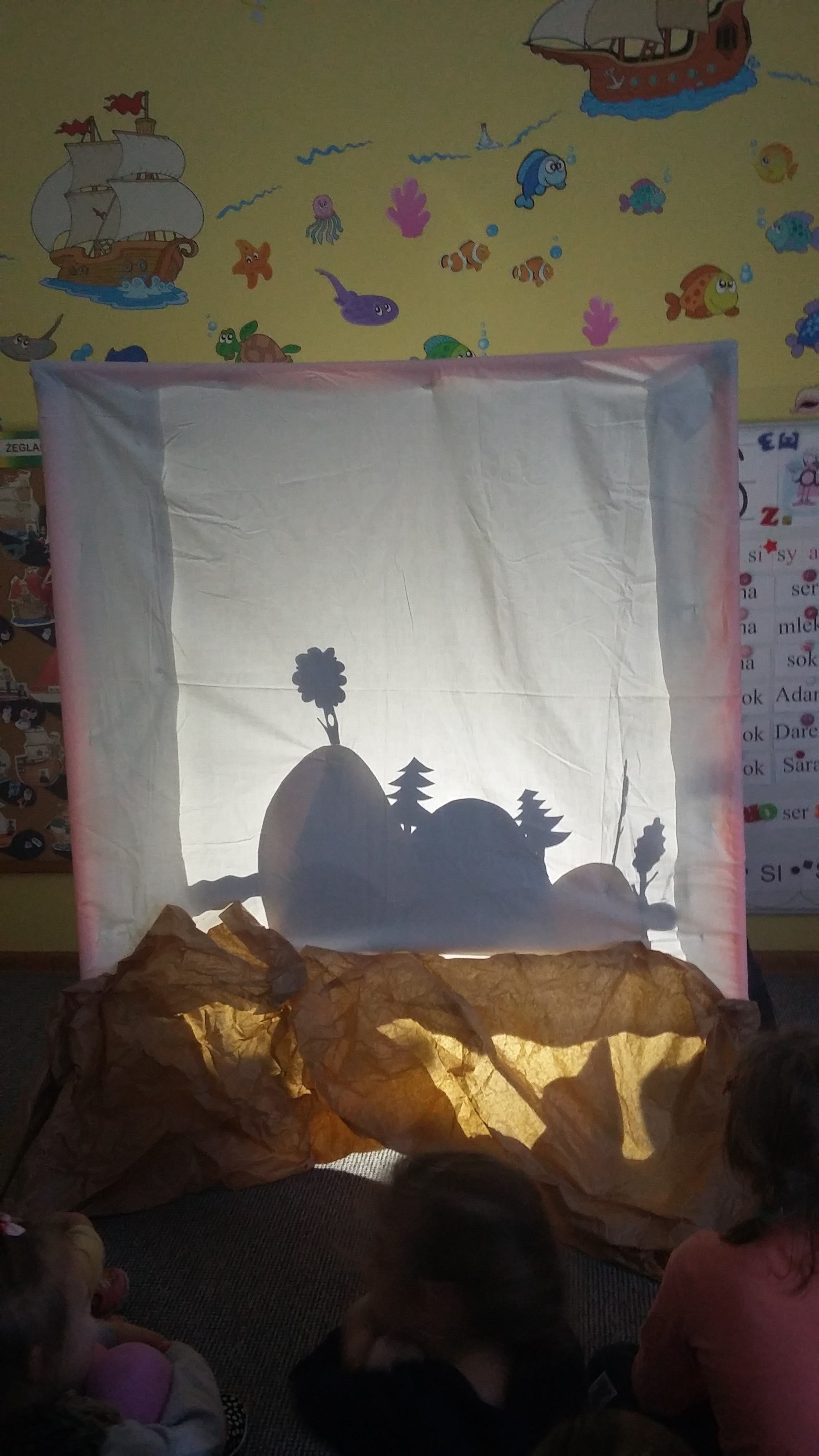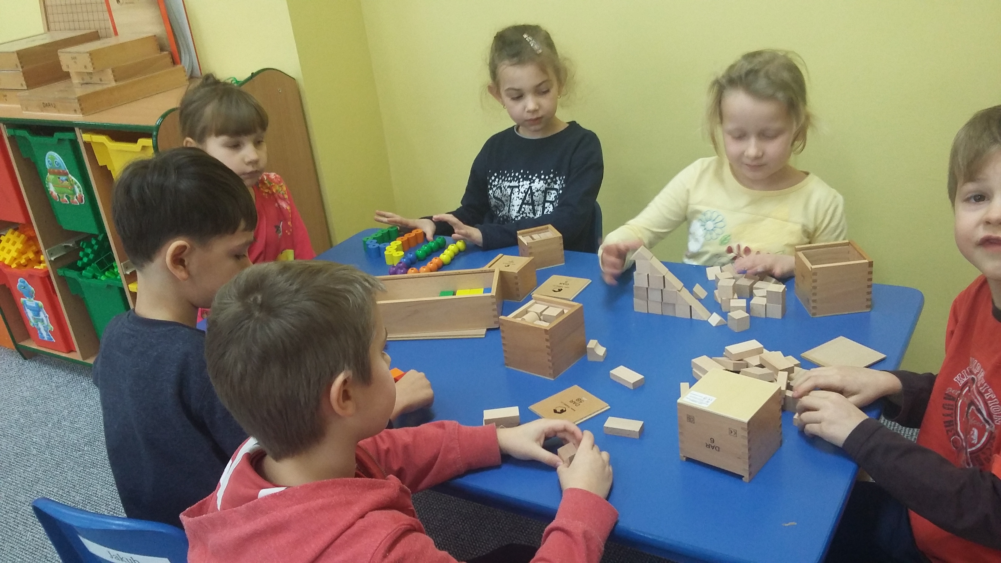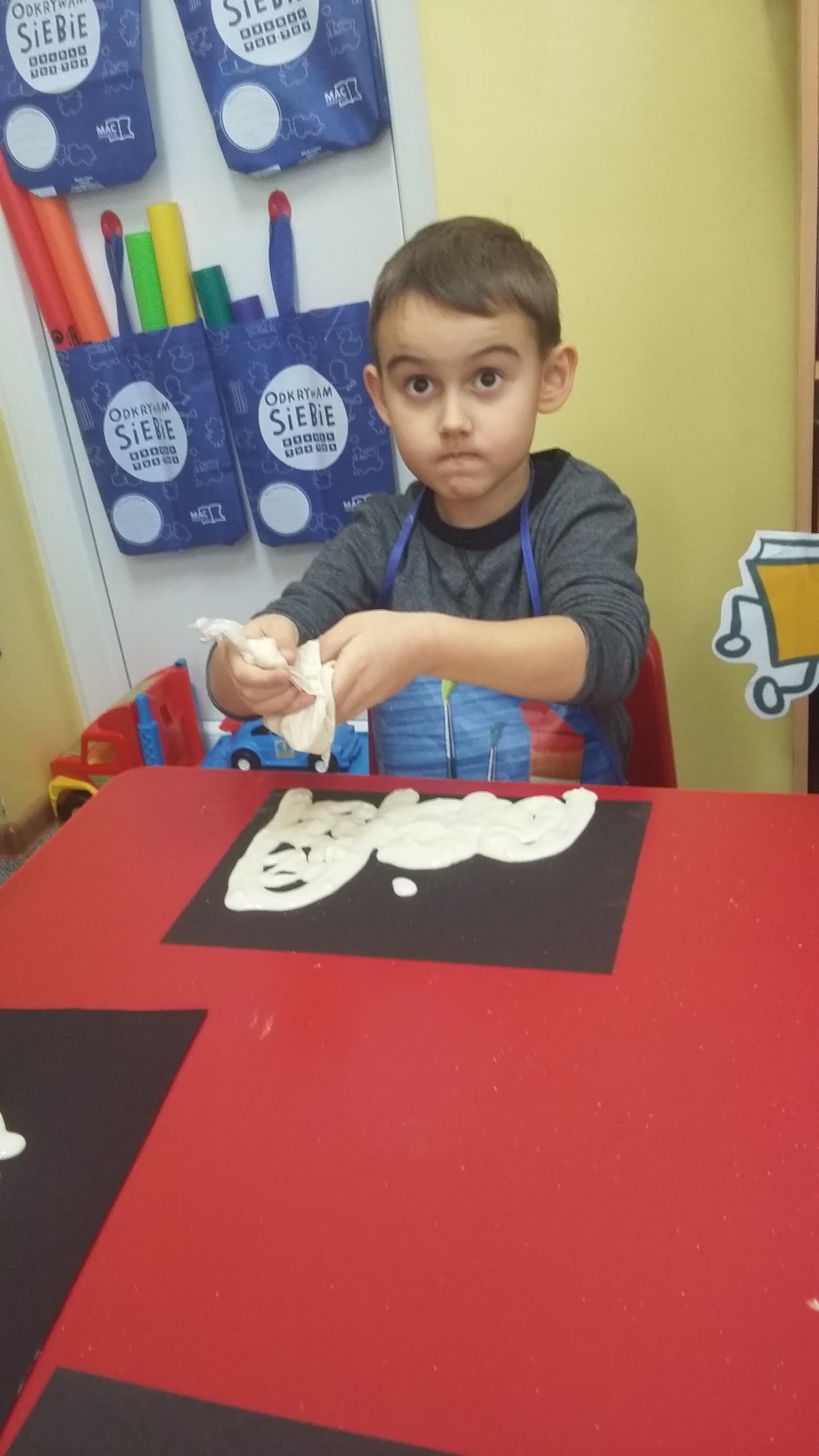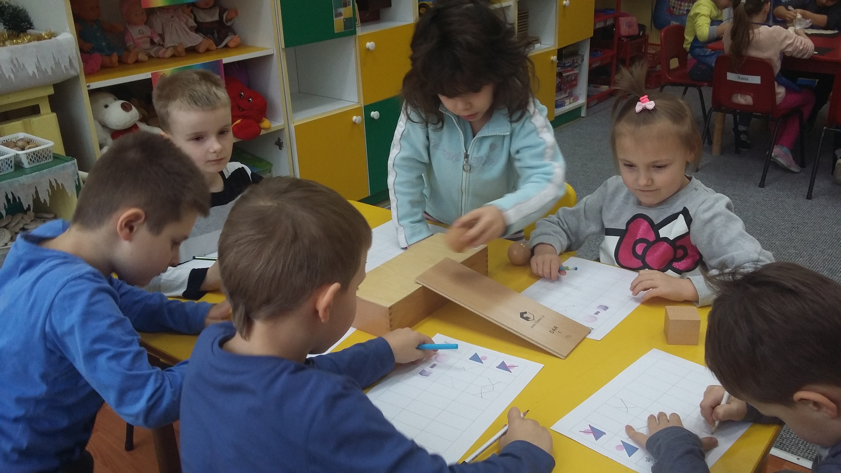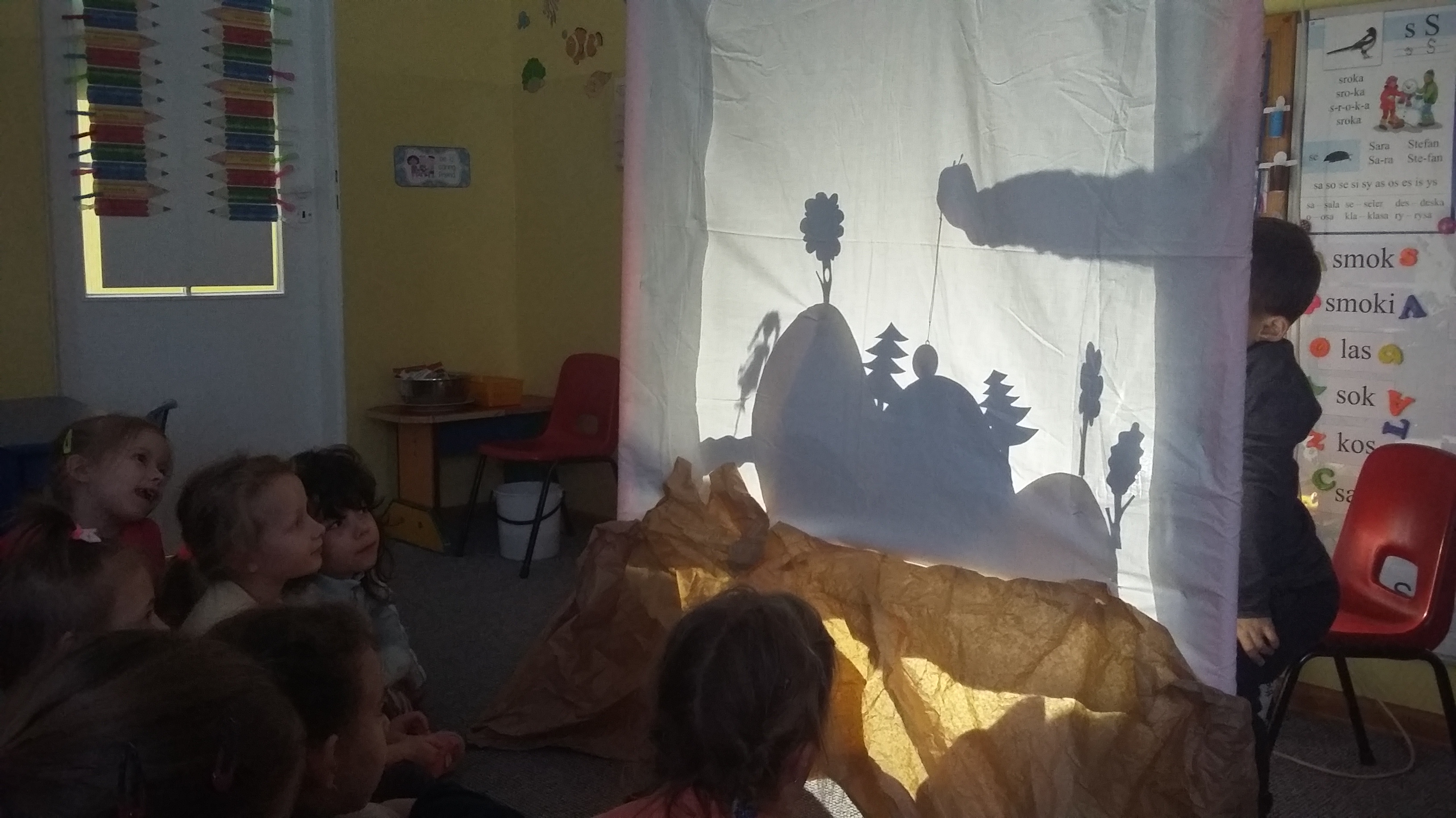 W czasie realizacji tematu kompleksowego „Tworzymy obrazy- zimowe krajobrazy” poprzez słuchanie opowiadań dzieci poznały m. in. elementy krajobrazu górskiego. Inscenizacja teatrzyku cieni o „Krainie trzech gór” uświadomiła dzieciom konieczność niesienia pomocy innym oraz w ciekawy sposób przedstawiła zjawisko toczenia się figur przestrzennych tj. kula, sześcian i walec z daru 2. Dzieci bardzo aktywnie współpracowały w kącikach zabawowo- zadaniowych. W Kąciku Darów budowały makietę Trzech gór z wykorzystaniem darów przestrzennych oraz pudełek po darach. Dodatkowo dzieci wzbogaciły swoją budowlę o zjeżdżalnię i wyciągi narciarskie. W Kąciku Twórczym dzieci sporządziły rozwodnioną masę solną, którą wyciskały przez zrobiony ze zwykłej torebki foliowej „rękaw cukierniczy”. Tym samym tworzyły krajobraz z teatrzyku z Porannego kręgu. W Kąciku Badawczym przedszkolaki sprawdzały pojęcia matematyczne w praktyce. Z pudełka po darze 1 zrobiły pochylnię, za pomocą, której klasyfikowały przedmioty, które się toczą, a które nie. Swoje spostrzeżenia skrzętnie notowały na karcie pracy. W Kąciku Gospodarczym układały trzy góry z wykorzystaniem barwionych i pociętych kawałków styropianu. Zadanie nie było łatwe ze względu na „lekkość” materiału budowlanego jakim były styropianowe cegiełki.