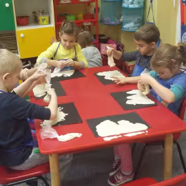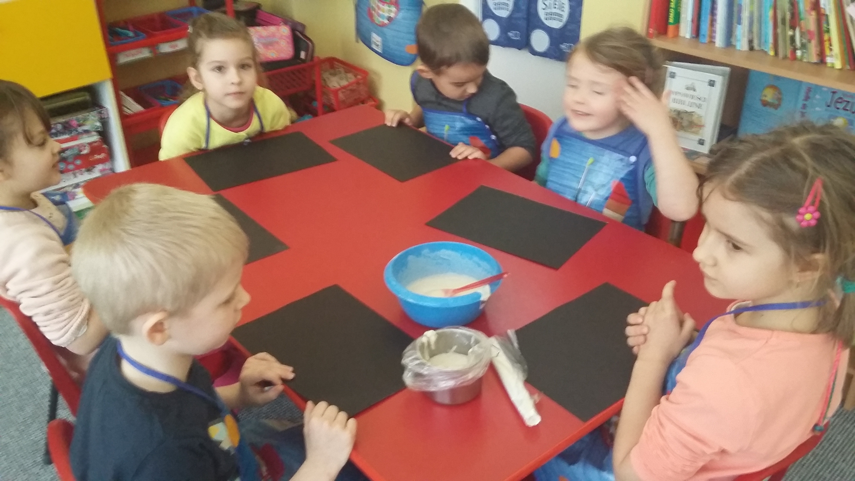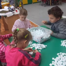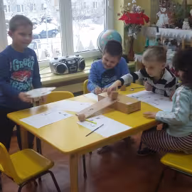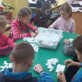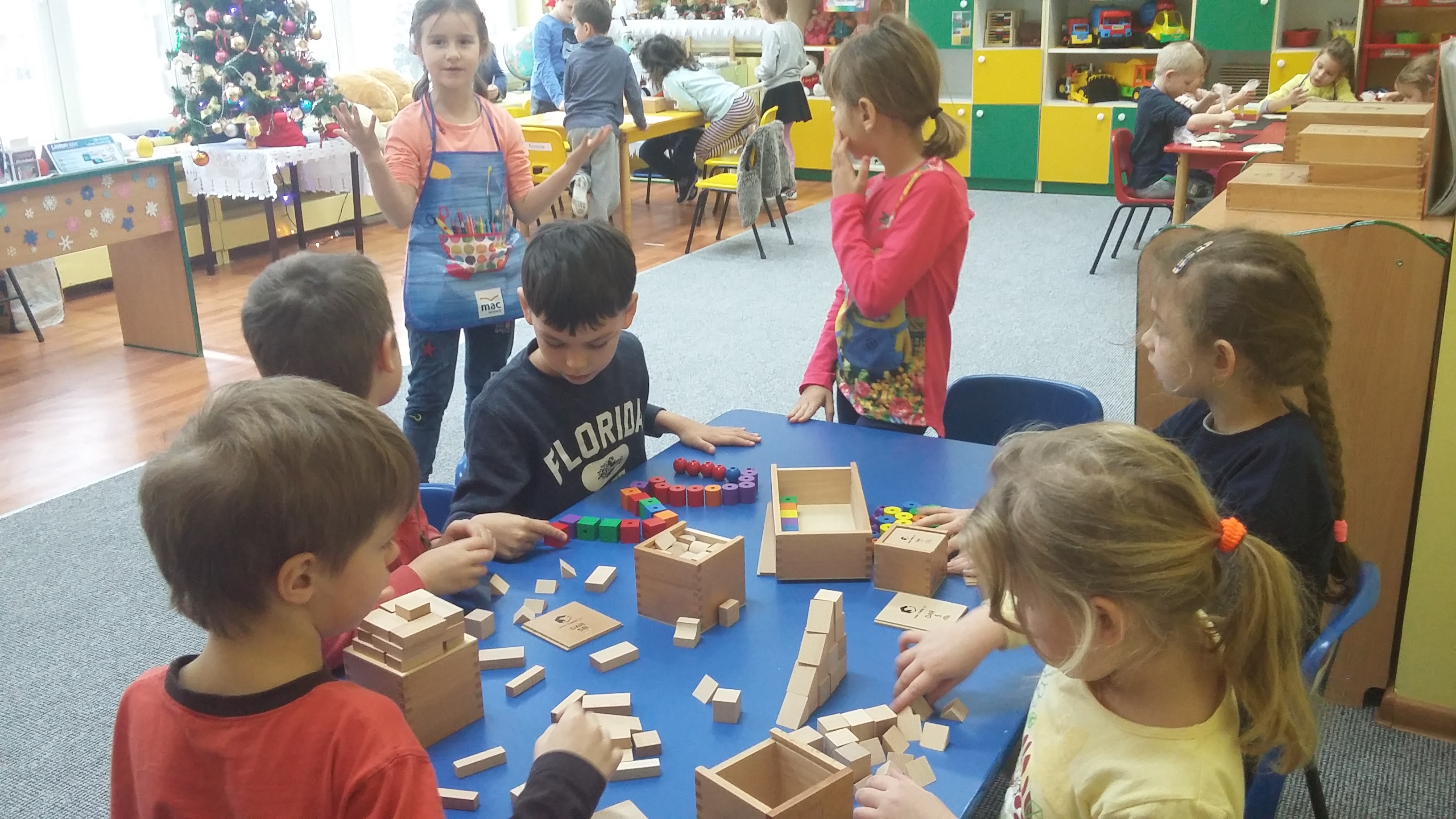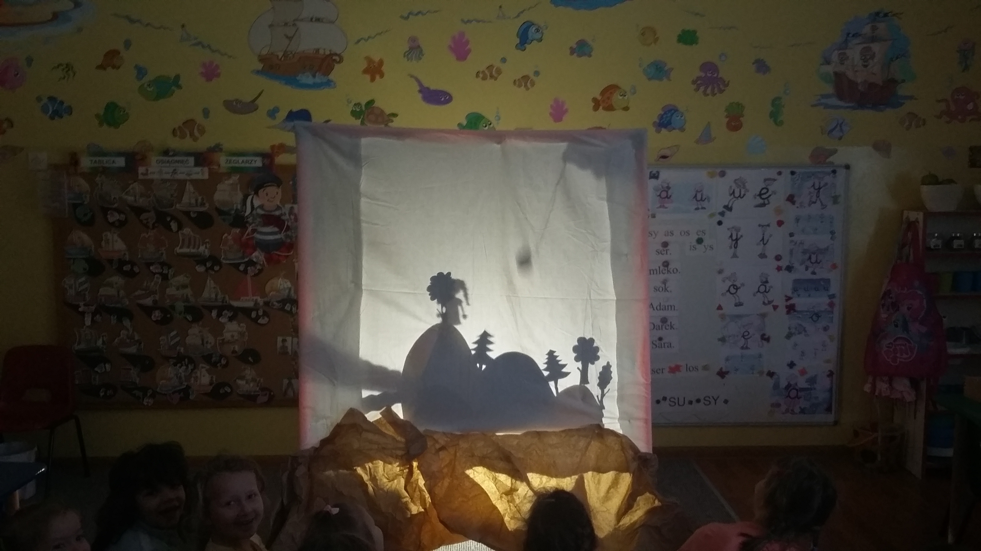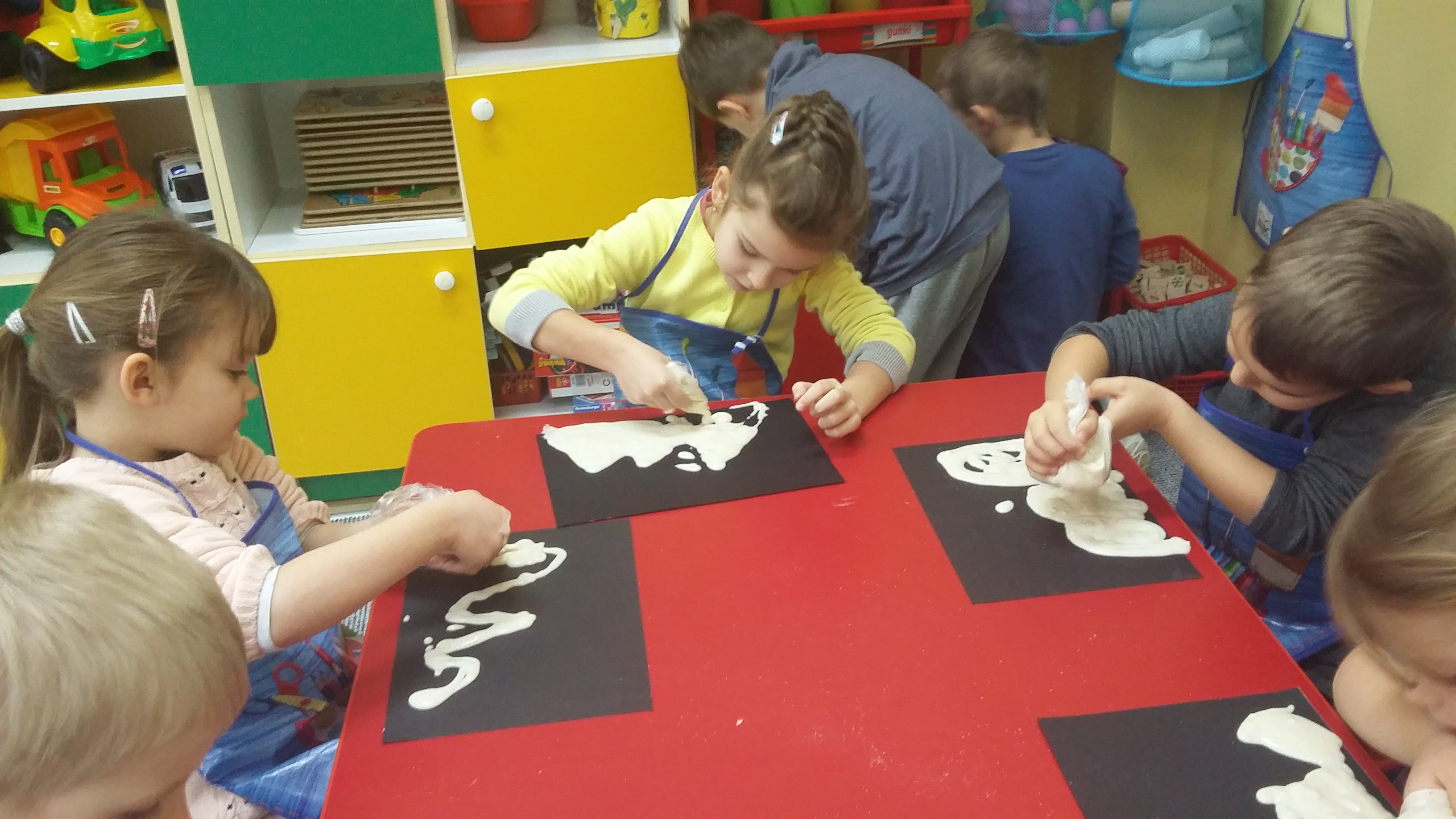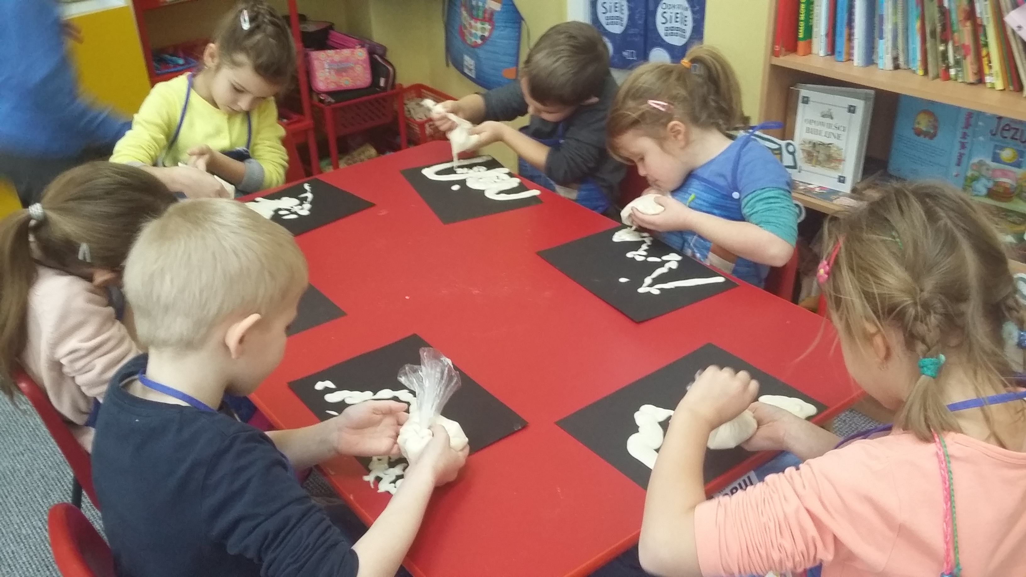 W czasie realizacji tematu kompleksowego „Tworzymy obrazy- zimowe krajobrazy” poprzez słuchanie opowiadań dzieci poznały m. in. elementy krajobrazu górskiego. Inscenizacja teatrzyku cieni o „Krainie trzech gór” uświadomiła dzieciom konieczność niesienia pomocy innym oraz w ciekawy sposób przedstawiła zjawisko toczenia się figur przestrzennych tj. kula, sześcian i walec z daru 2. Dzieci bardzo aktywnie współpracowały w kącikach zabawowo- zadaniowych. W Kąciku Darów budowały makietę Trzech gór z wykorzystaniem darów przestrzennych oraz pudełek po darach. Dodatkowo dzieci wzbogaciły swoją budowlę o zjeżdżalnię i wyciągi narciarskie. W Kąciku Twórczym dzieci sporządziły rozwodnioną masę solną, którą wyciskały przez zrobiony ze zwykłej torebki foliowej „rękaw cukierniczy”. Tym samym tworzyły krajobraz z teatrzyku z Porannego kręgu. W Kąciku Badawczym przedszkolaki sprawdzały pojęcia matematyczne w praktyce. Z pudełka po darze 1 zrobiły pochylnię, za pomocą, której klasyfikowały przedmioty, które się toczą, a które nie. Swoje spostrzeżenia skrzętnie notowały na karcie pracy. W Kąciku Gospodarczym układały trzy góry z wykorzystaniem barwionych i pociętych kawałków styropianu. Zadanie nie było łatwe ze względu na „lekkość” materiału budowlanego jakim były styropianowe cegiełki.