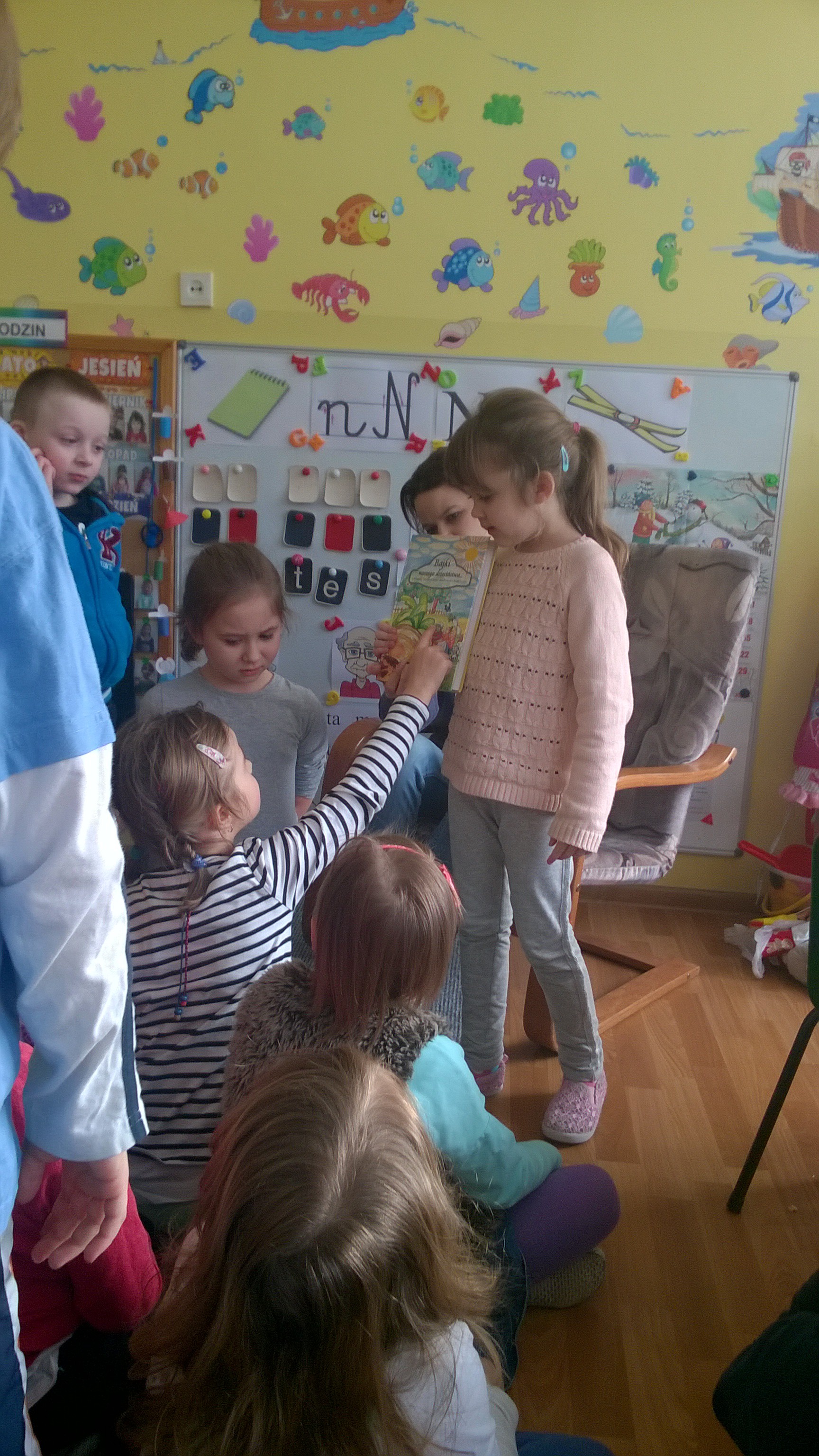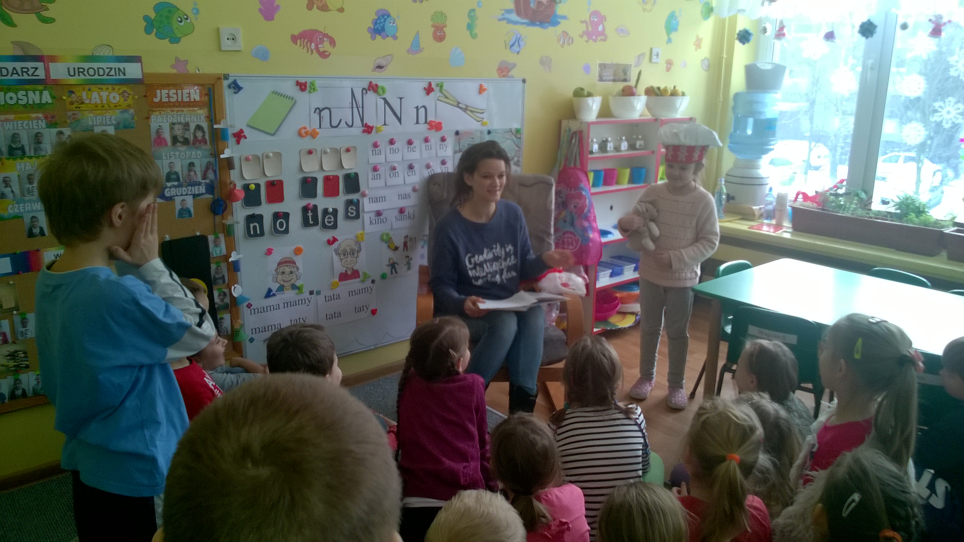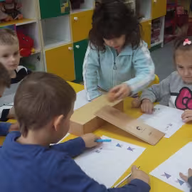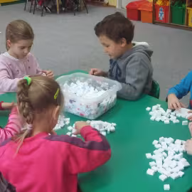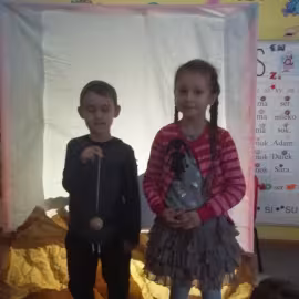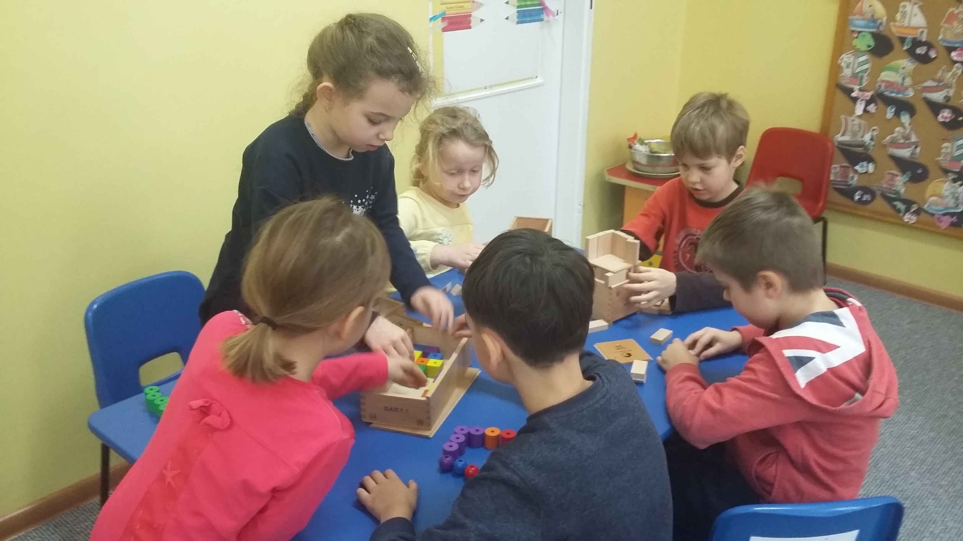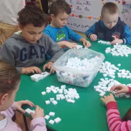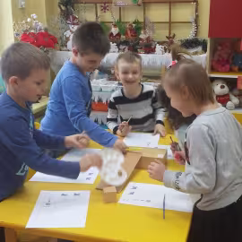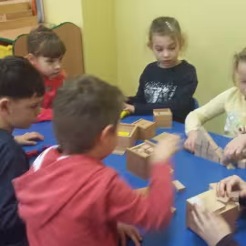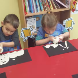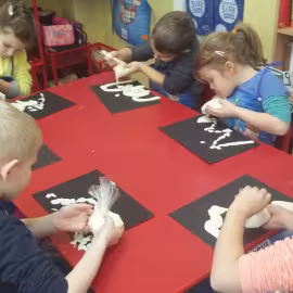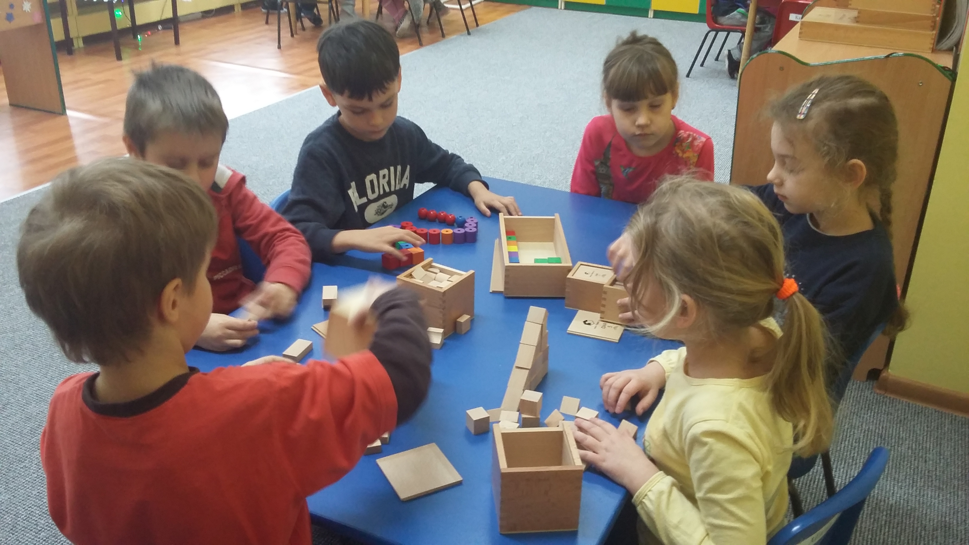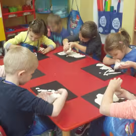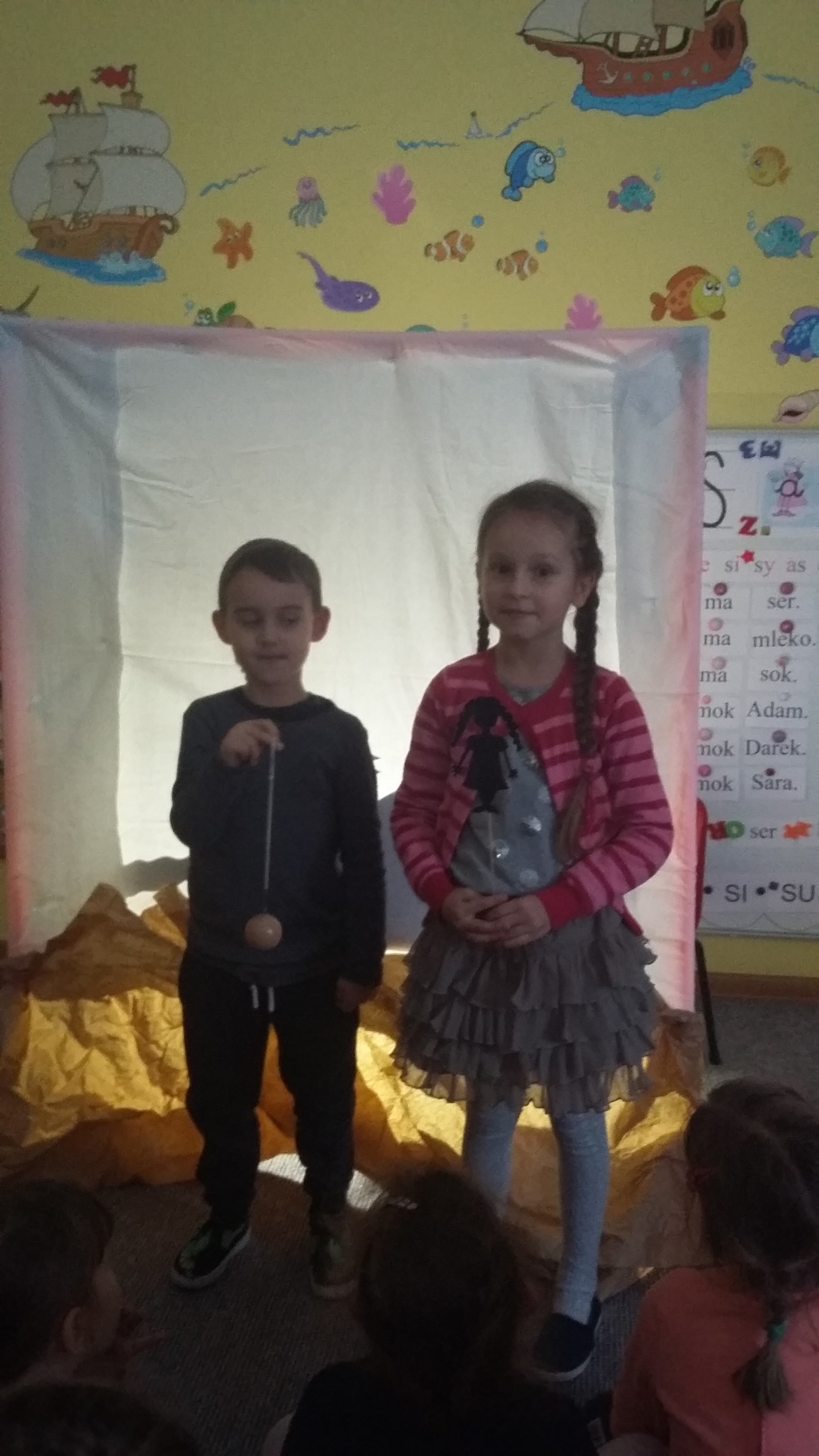 W czasie realizacji tematu kompleksowego „Tworzymy obrazy- zimowe krajobrazy” poprzez słuchanie opowiadań dzieci poznały m. in. elementy krajobrazu górskiego. Inscenizacja teatrzyku cieni o „Krainie trzech gór” uświadomiła dzieciom konieczność niesienia pomocy innym oraz w ciekawy sposób przedstawiła zjawisko toczenia się figur przestrzennych tj. kula, sześcian i walec z daru 2. Dzieci bardzo aktywnie współpracowały w kącikach zabawowo- zadaniowych. W Kąciku Darów budowały makietę Trzech gór z wykorzystaniem darów przestrzennych oraz pudełek po darach. Dodatkowo dzieci wzbogaciły swoją budowlę o zjeżdżalnię i wyciągi narciarskie. W Kąciku Twórczym dzieci sporządziły rozwodnioną masę solną, którą wyciskały przez zrobiony ze zwykłej torebki foliowej „rękaw cukierniczy”. Tym samym tworzyły krajobraz z teatrzyku z Porannego kręgu. W Kąciku Badawczym przedszkolaki sprawdzały pojęcia matematyczne w praktyce. Z pudełka po darze 1 zrobiły pochylnię, za pomocą, której klasyfikowały przedmioty, które się toczą, a które nie. Swoje spostrzeżenia skrzętnie notowały na karcie pracy. W Kąciku Gospodarczym układały trzy góry z wykorzystaniem barwionych i pociętych kawałków styropianu. Zadanie nie było łatwe ze względu na „lekkość” materiału budowlanego jakim były styropianowe cegiełki.