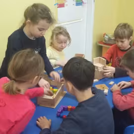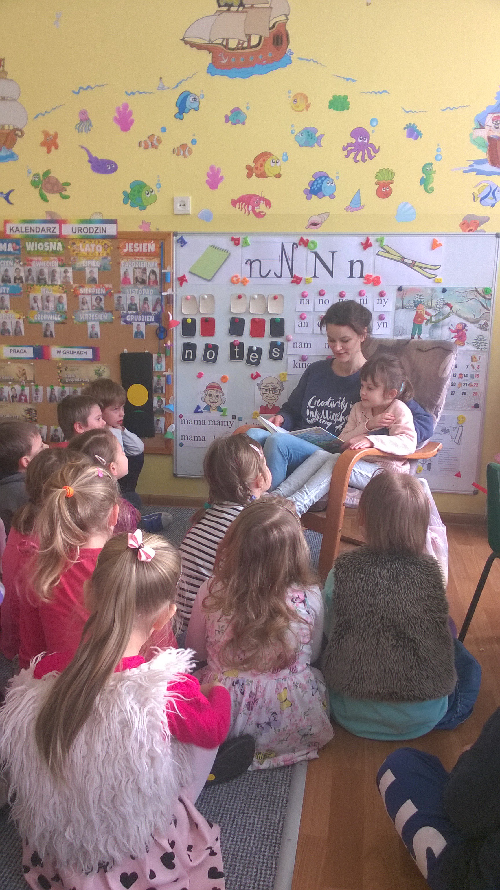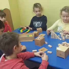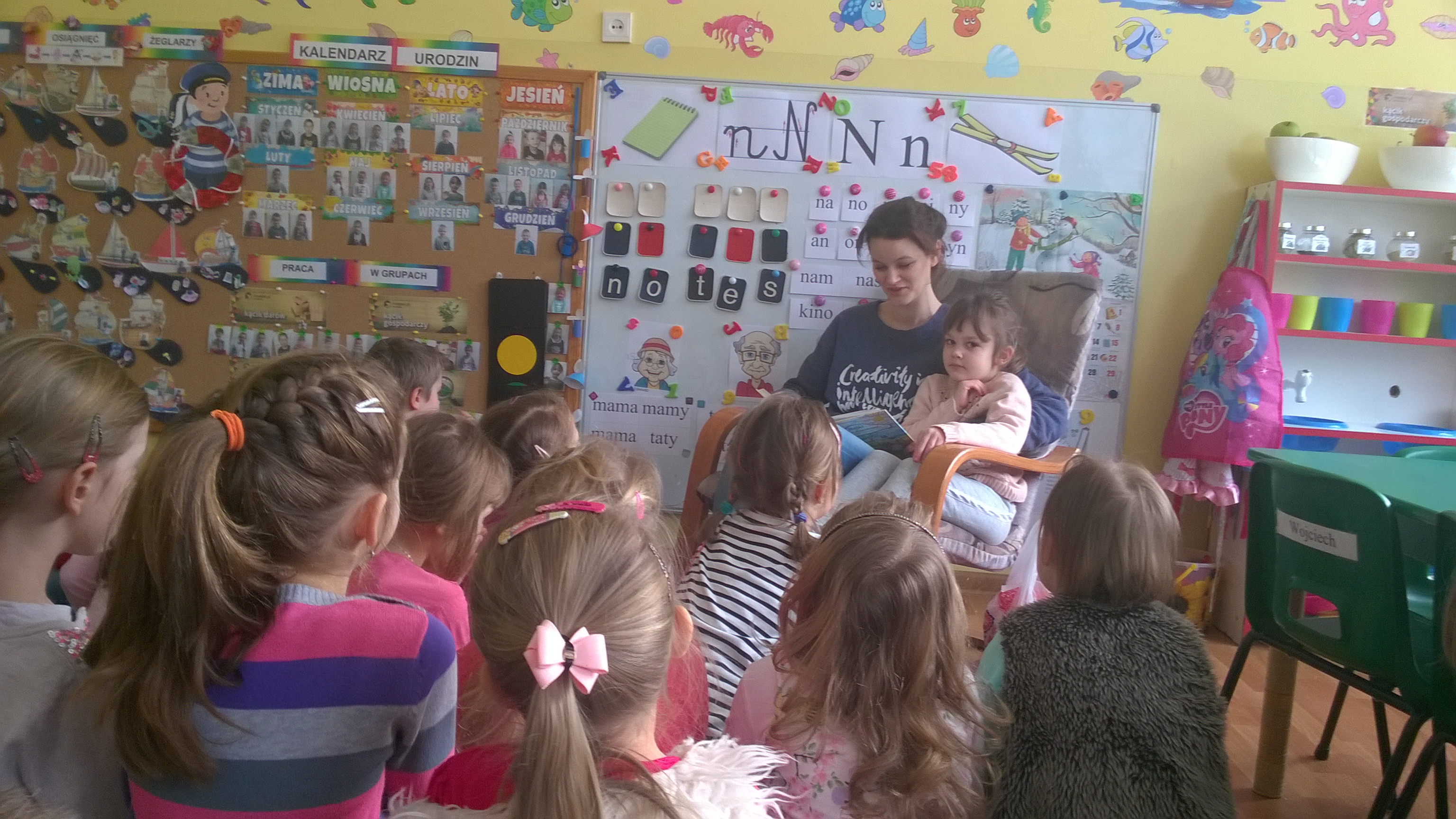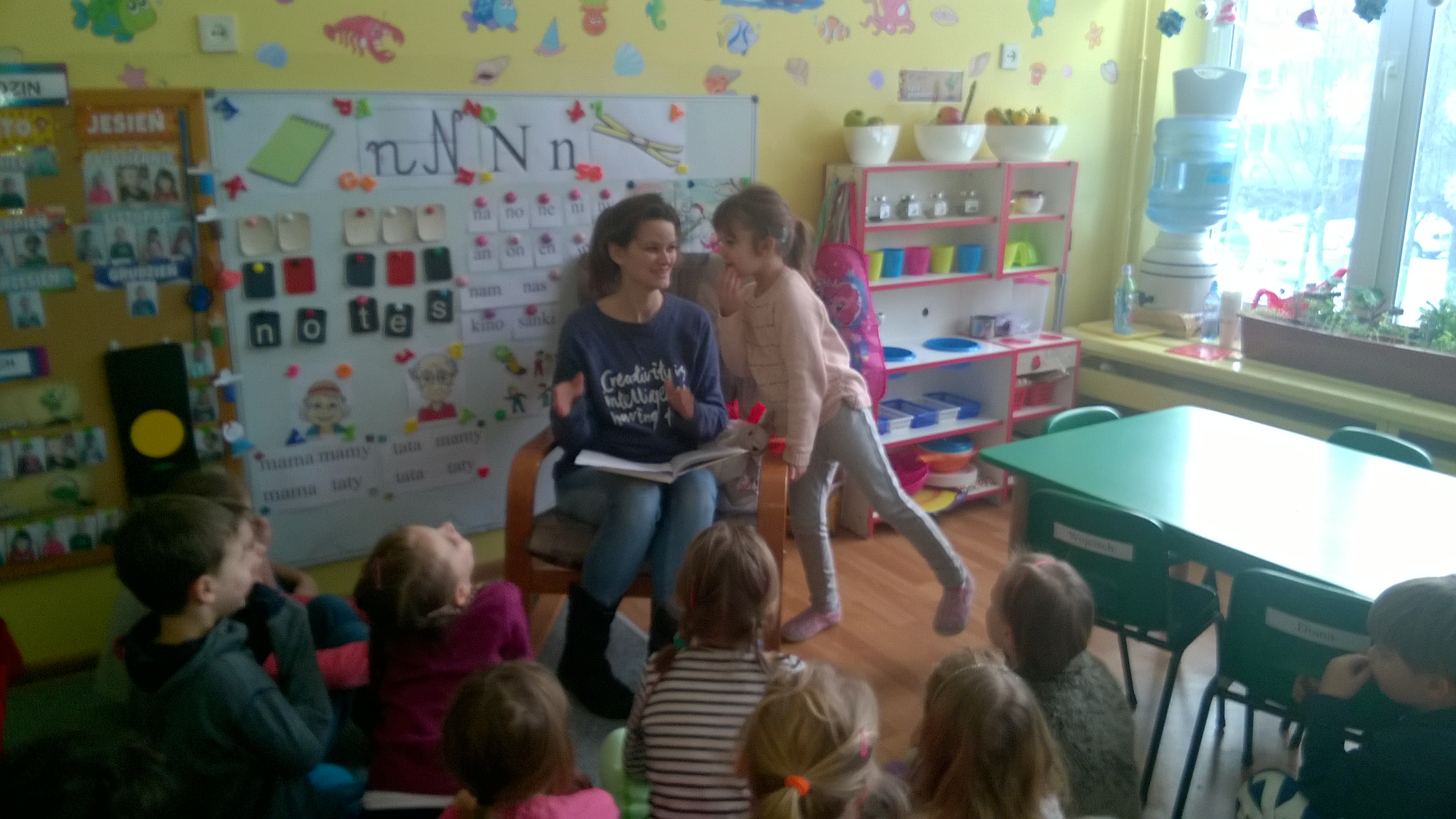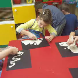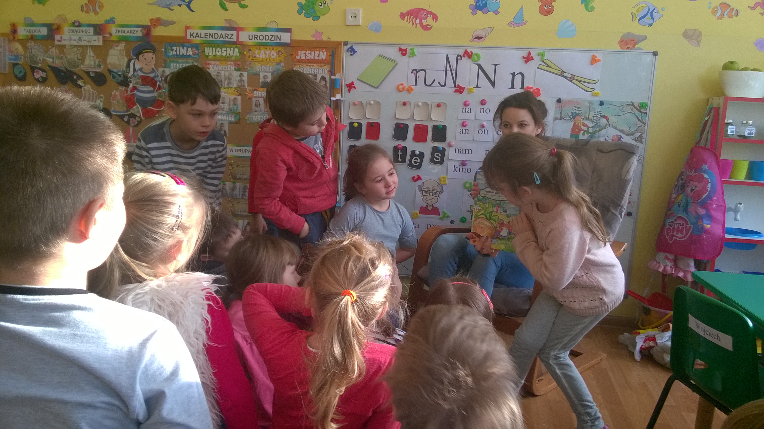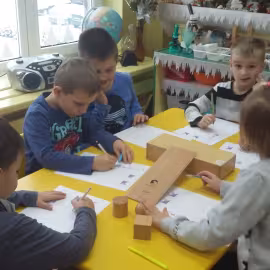 W czasie realizacji tematu kompleksowego „Tworzymy obrazy- zimowe krajobrazy” poprzez słuchanie opowiadań dzieci poznały m. in. elementy krajobrazu górskiego. Inscenizacja teatrzyku cieni o „Krainie trzech gór” uświadomiła dzieciom konieczność niesienia pomocy innym oraz w ciekawy sposób przedstawiła zjawisko toczenia się figur przestrzennych tj. kula, sześcian i walec z daru 2. Dzieci bardzo aktywnie współpracowały w kącikach zabawowo- zadaniowych. W Kąciku Darów budowały makietę Trzech gór z wykorzystaniem darów przestrzennych oraz pudełek po darach. Dodatkowo dzieci wzbogaciły swoją budowlę o zjeżdżalnię i wyciągi narciarskie. W Kąciku Twórczym dzieci sporządziły rozwodnioną masę solną, którą wyciskały przez zrobiony ze zwykłej torebki foliowej „rękaw cukierniczy”. Tym samym tworzyły krajobraz z teatrzyku z Porannego kręgu. W Kąciku Badawczym przedszkolaki sprawdzały pojęcia matematyczne w praktyce. Z pudełka po darze 1 zrobiły pochylnię, za pomocą, której klasyfikowały przedmioty, które się toczą, a które nie. Swoje spostrzeżenia skrzętnie notowały na karcie pracy. W Kąciku Gospodarczym układały trzy góry z wykorzystaniem barwionych i pociętych kawałków styropianu. Zadanie nie było łatwe ze względu na „lekkość” materiału budowlanego jakim były styropianowe cegiełki.