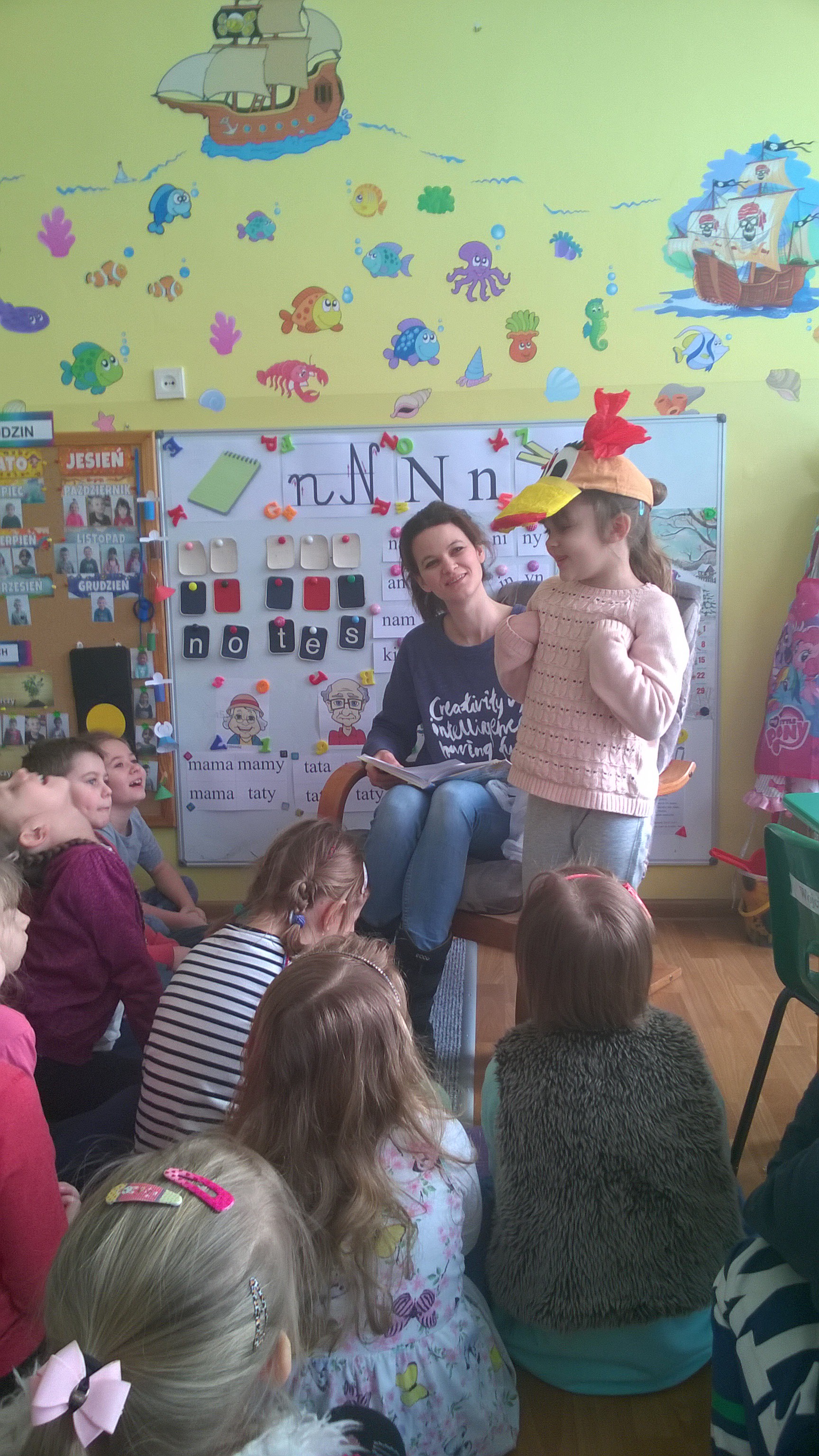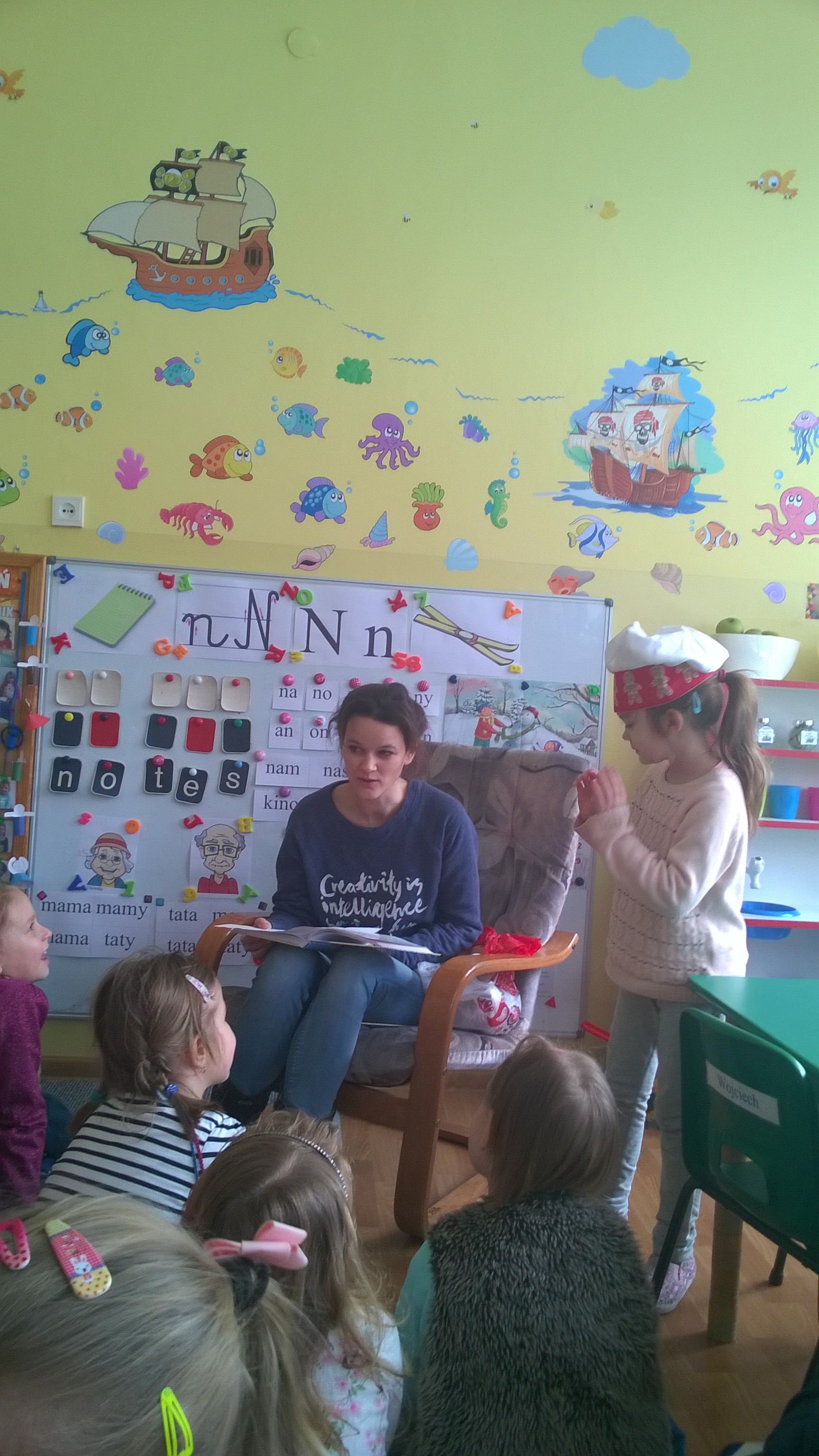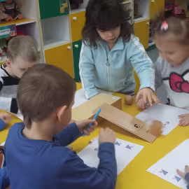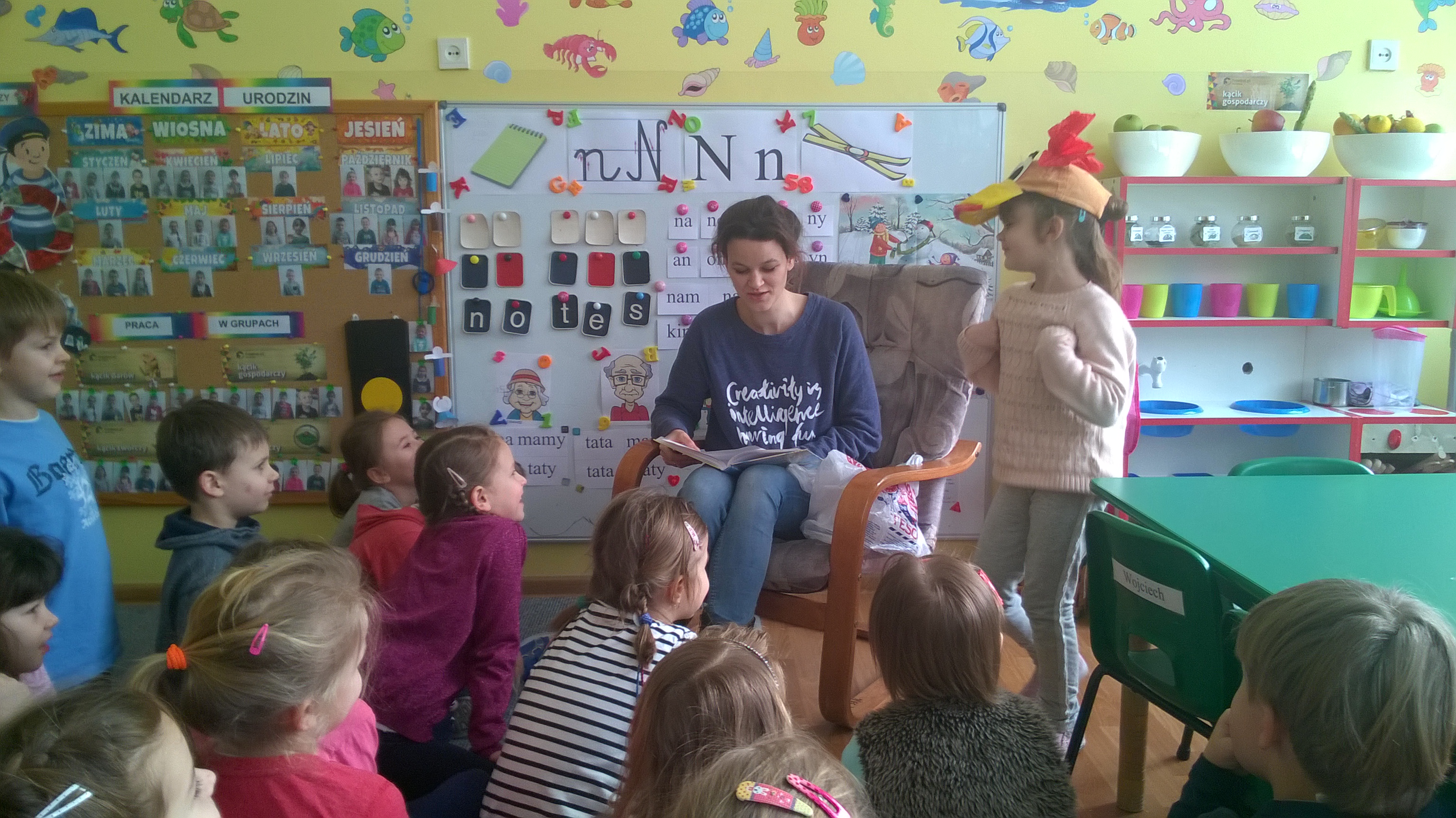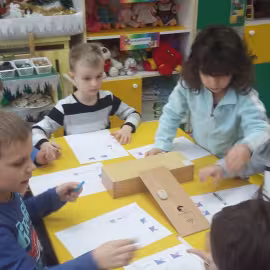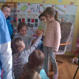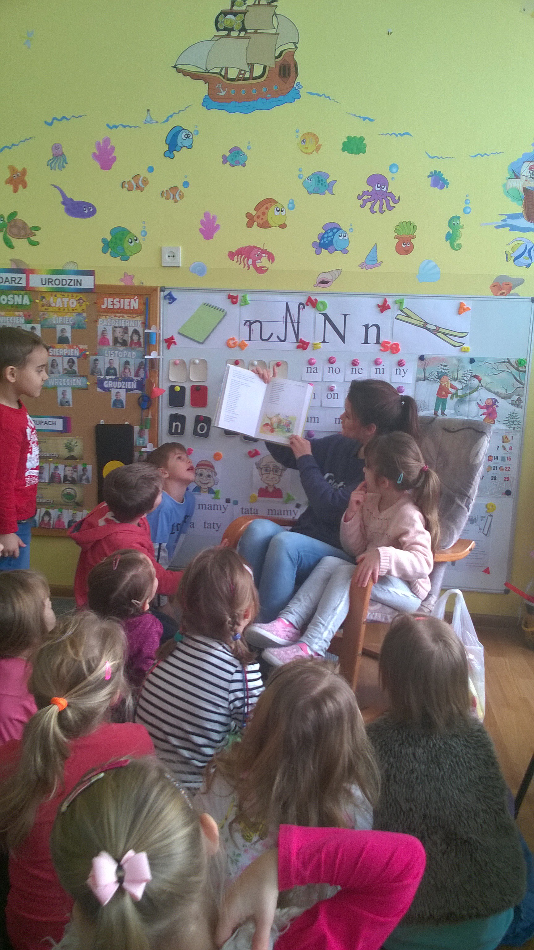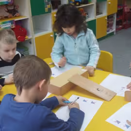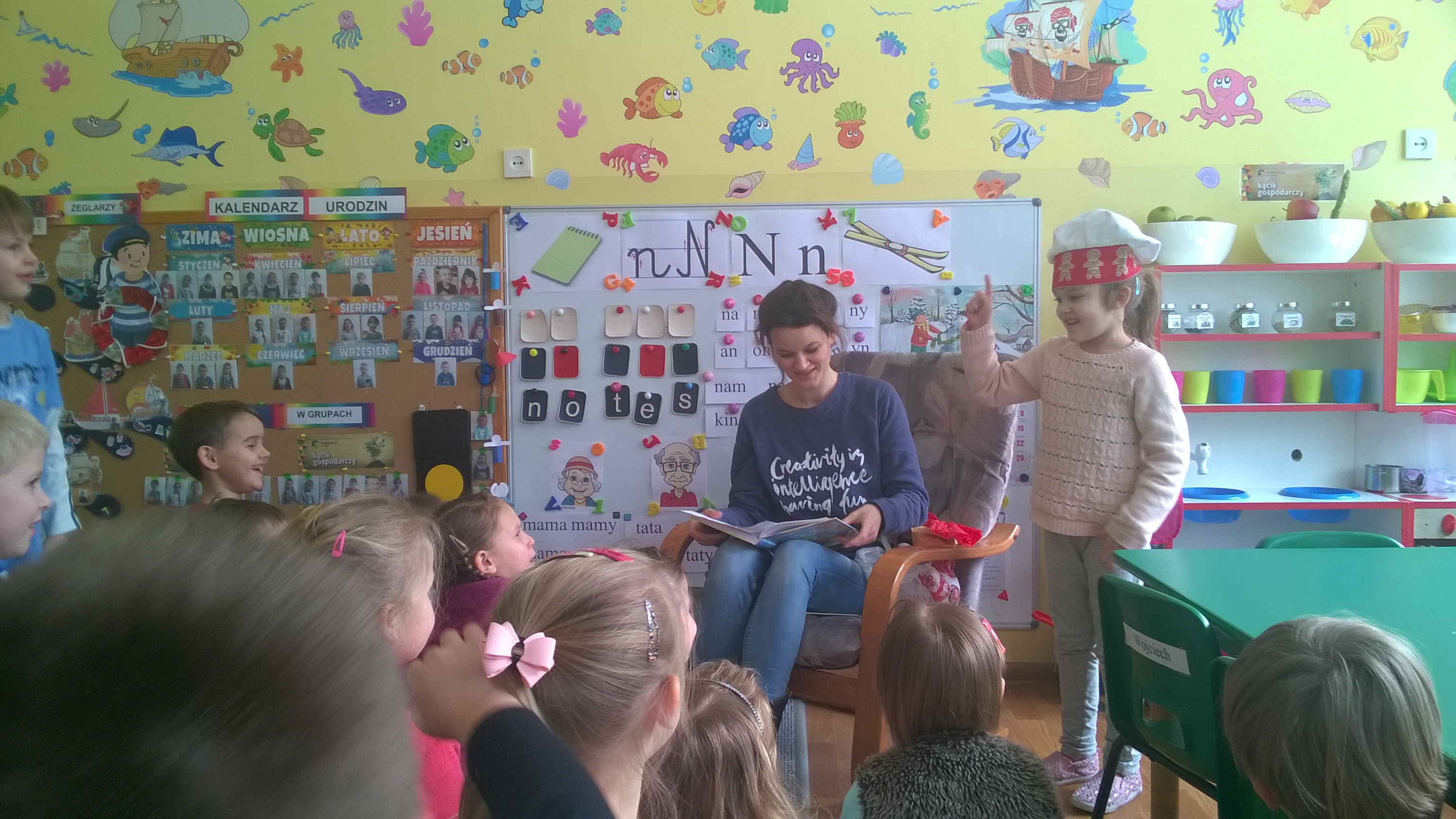 W czasie realizacji tematu kompleksowego „Tworzymy obrazy- zimowe krajobrazy” poprzez słuchanie opowiadań dzieci poznały m. in. elementy krajobrazu górskiego. Inscenizacja teatrzyku cieni o „Krainie trzech gór” uświadomiła dzieciom konieczność niesienia pomocy innym oraz w ciekawy sposób przedstawiła zjawisko toczenia się figur przestrzennych tj. kula, sześcian i walec z daru 2. Dzieci bardzo aktywnie współpracowały w kącikach zabawowo- zadaniowych. W Kąciku Darów budowały makietę Trzech gór z wykorzystaniem darów przestrzennych oraz pudełek po darach. Dodatkowo dzieci wzbogaciły swoją budowlę o zjeżdżalnię i wyciągi narciarskie. W Kąciku Twórczym dzieci sporządziły rozwodnioną masę solną, którą wyciskały przez zrobiony ze zwykłej torebki foliowej „rękaw cukierniczy”. Tym samym tworzyły krajobraz z teatrzyku z Porannego kręgu. W Kąciku Badawczym przedszkolaki sprawdzały pojęcia matematyczne w praktyce. Z pudełka po darze 1 zrobiły pochylnię, za pomocą, której klasyfikowały przedmioty, które się toczą, a które nie. Swoje spostrzeżenia skrzętnie notowały na karcie pracy. W Kąciku Gospodarczym układały trzy góry z wykorzystaniem barwionych i pociętych kawałków styropianu. Zadanie nie było łatwe ze względu na „lekkość” materiału budowlanego jakim były styropianowe cegiełki.