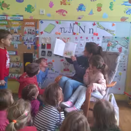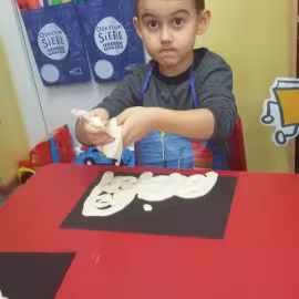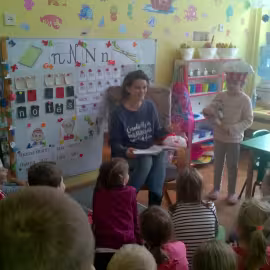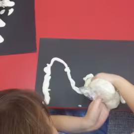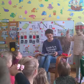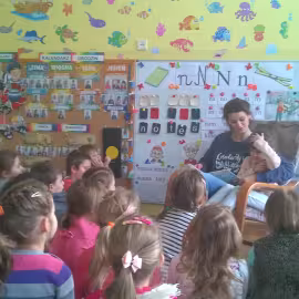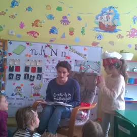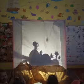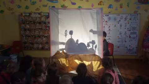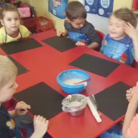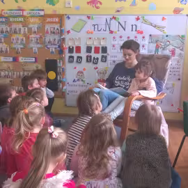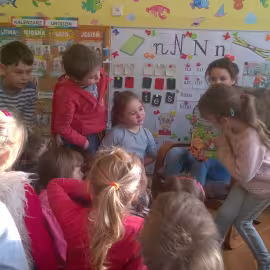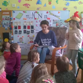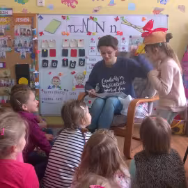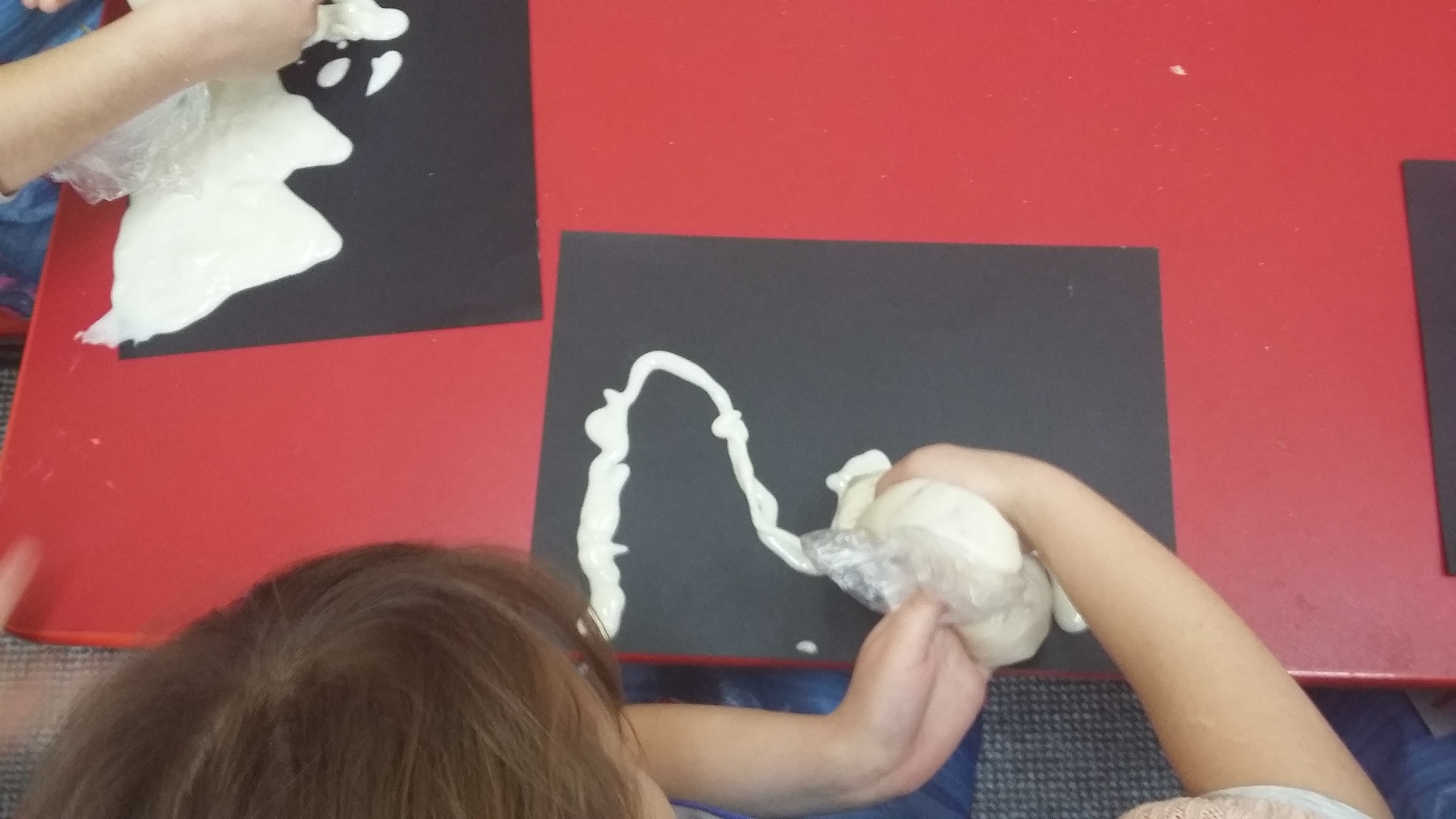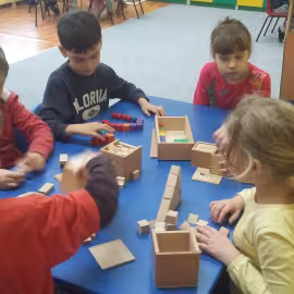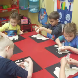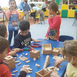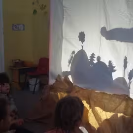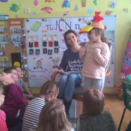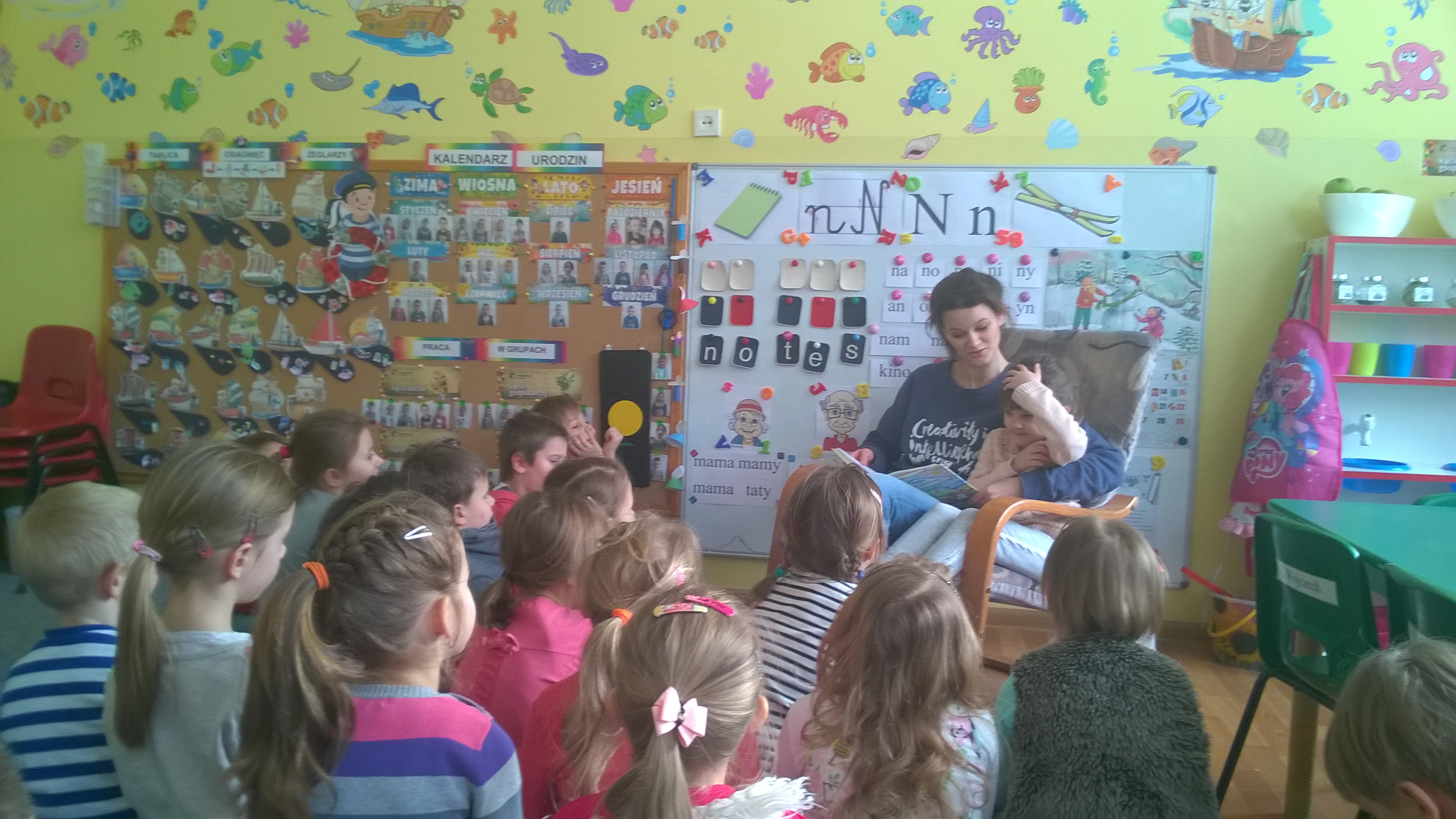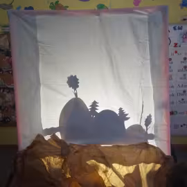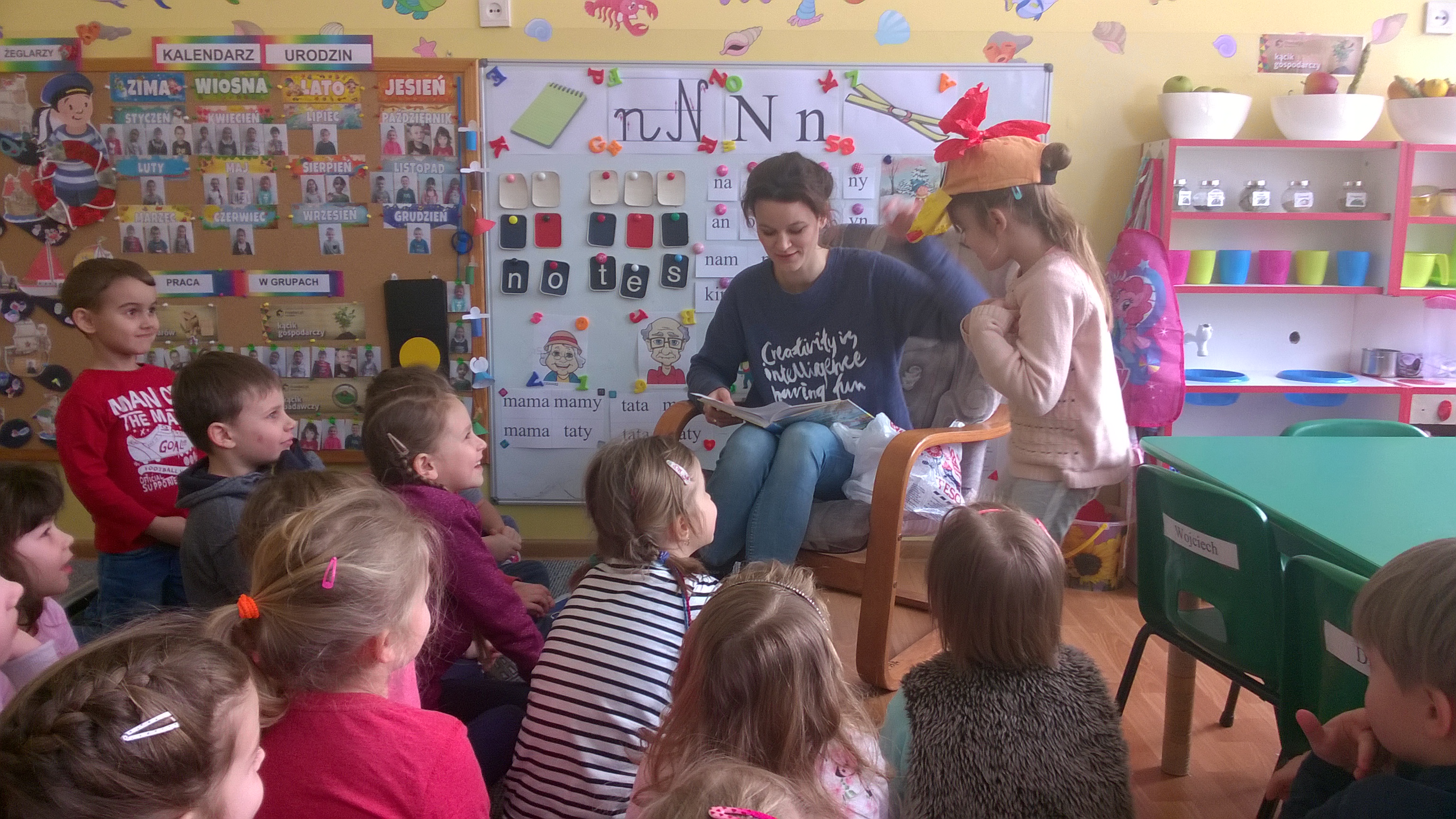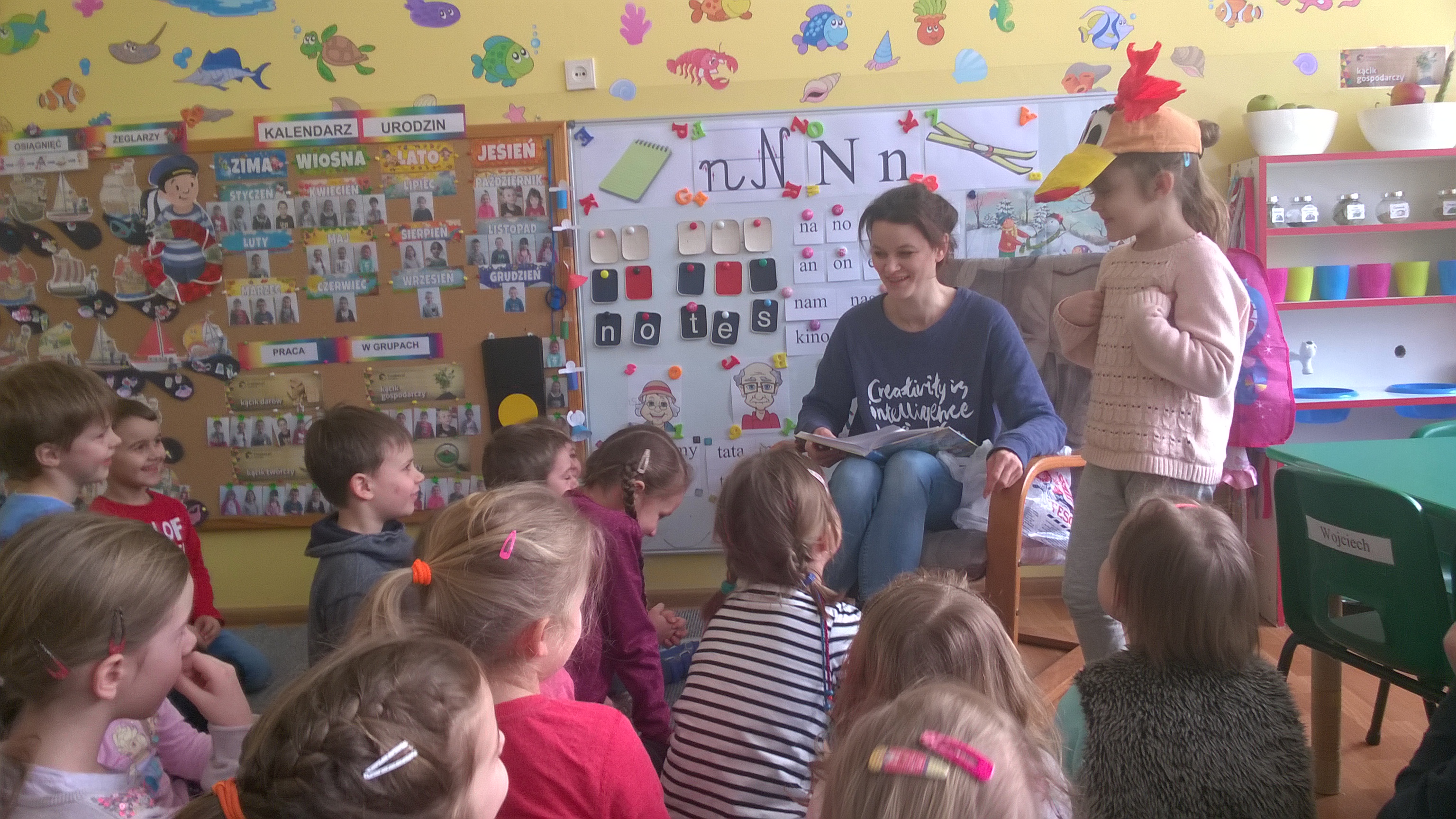 W czasie realizacji tematu kompleksowego „Tworzymy obrazy- zimowe krajobrazy” poprzez słuchanie opowiadań dzieci poznały m. in. elementy krajobrazu górskiego. Inscenizacja teatrzyku cieni o „Krainie trzech gór” uświadomiła dzieciom konieczność niesienia pomocy innym oraz w ciekawy sposób przedstawiła zjawisko toczenia się figur przestrzennych tj. kula, sześcian i walec z daru 2. Dzieci bardzo aktywnie współpracowały w kącikach zabawowo- zadaniowych. W Kąciku Darów budowały makietę Trzech gór z wykorzystaniem darów przestrzennych oraz pudełek po darach. Dodatkowo dzieci wzbogaciły swoją budowlę o zjeżdżalnię i wyciągi narciarskie. W Kąciku Twórczym dzieci sporządziły rozwodnioną masę solną, którą wyciskały przez zrobiony ze zwykłej torebki foliowej „rękaw cukierniczy”. Tym samym tworzyły krajobraz z teatrzyku z Porannego kręgu. W Kąciku Badawczym przedszkolaki sprawdzały pojęcia matematyczne w praktyce. Z pudełka po darze 1 zrobiły pochylnię, za pomocą, której klasyfikowały przedmioty, które się toczą, a które nie. Swoje spostrzeżenia skrzętnie notowały na karcie pracy. W Kąciku Gospodarczym układały trzy góry z wykorzystaniem barwionych i pociętych kawałków styropianu. Zadanie nie było łatwe ze względu na „lekkość” materiału budowlanego jakim były styropianowe cegiełki.