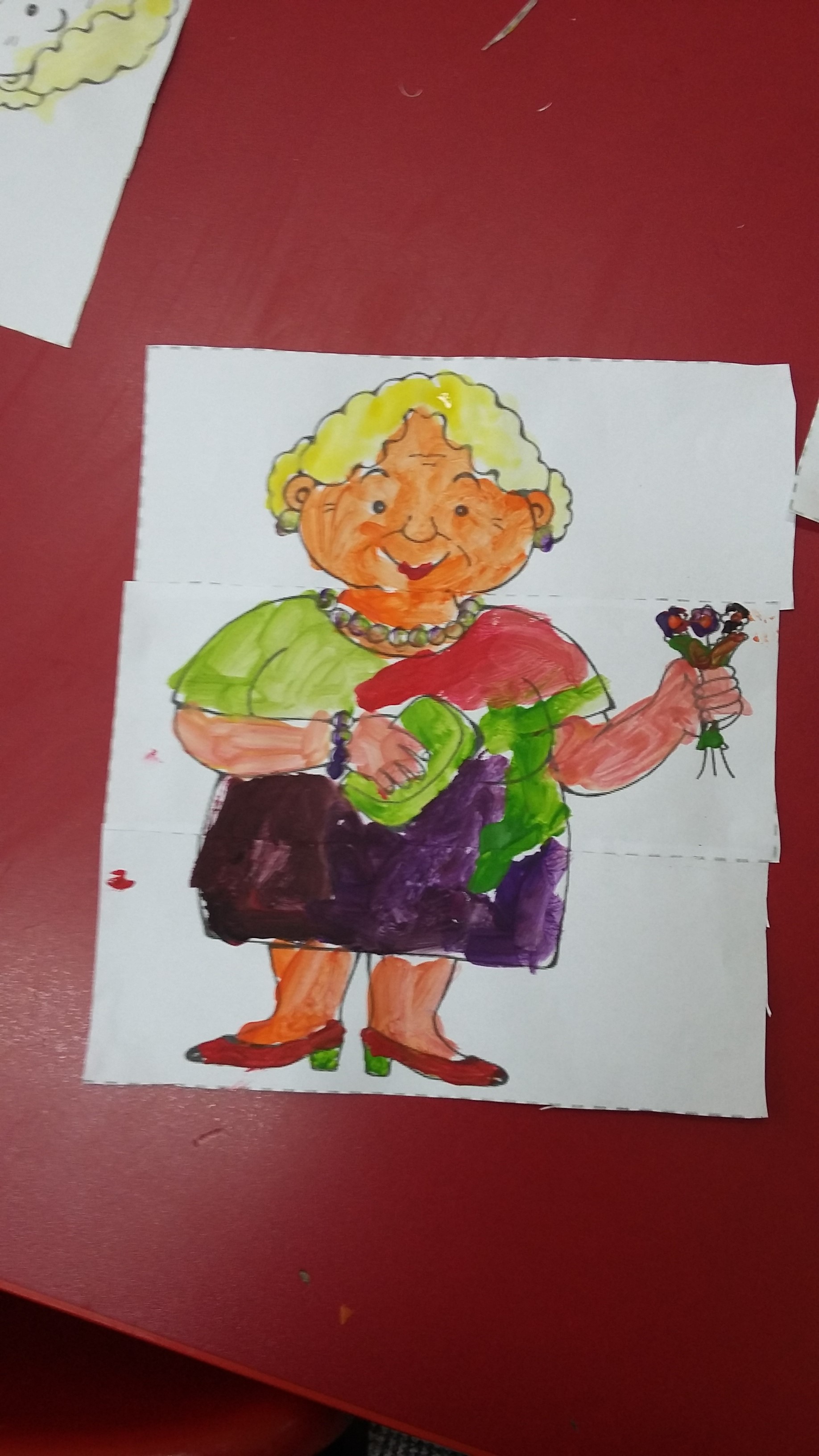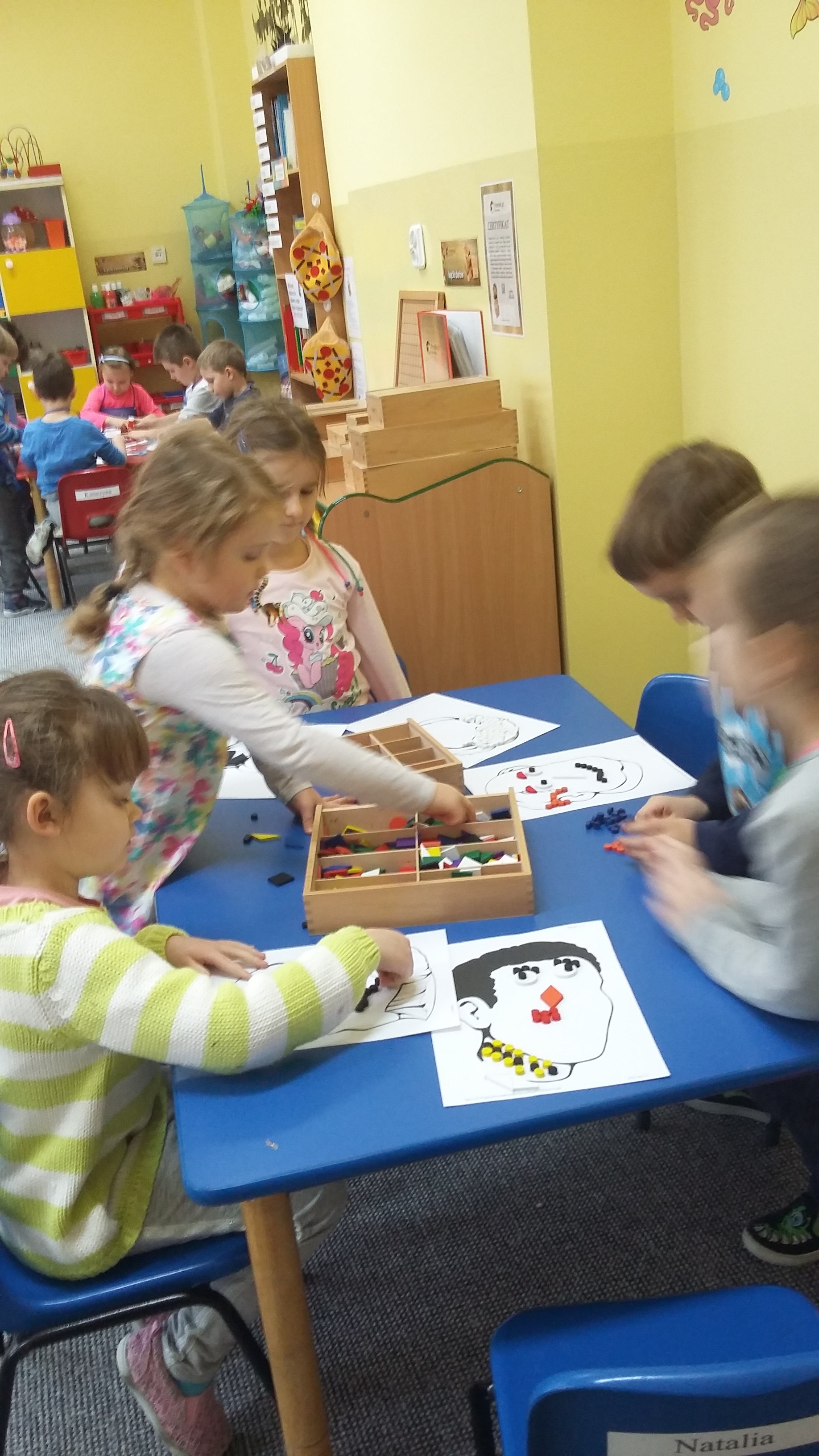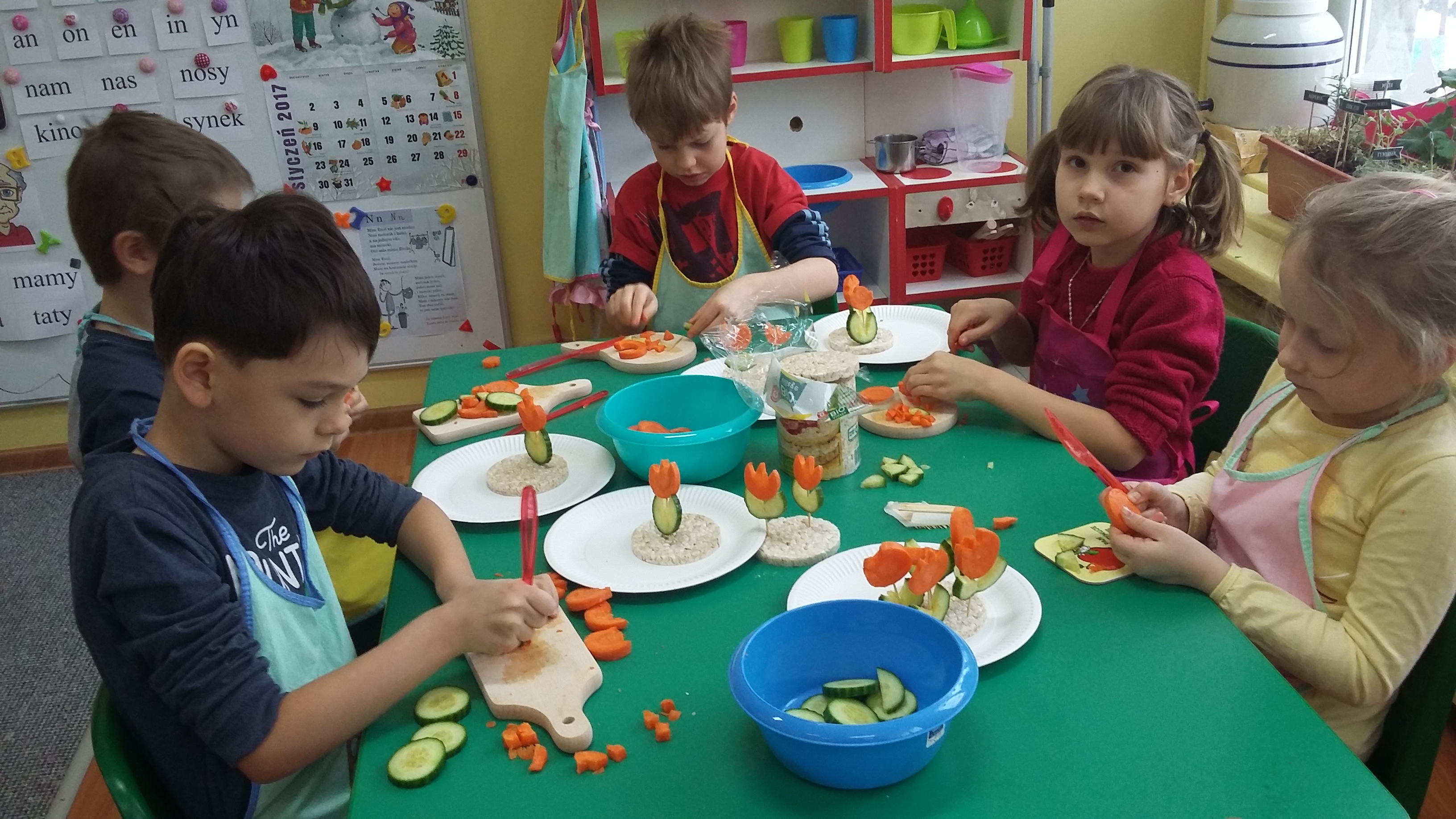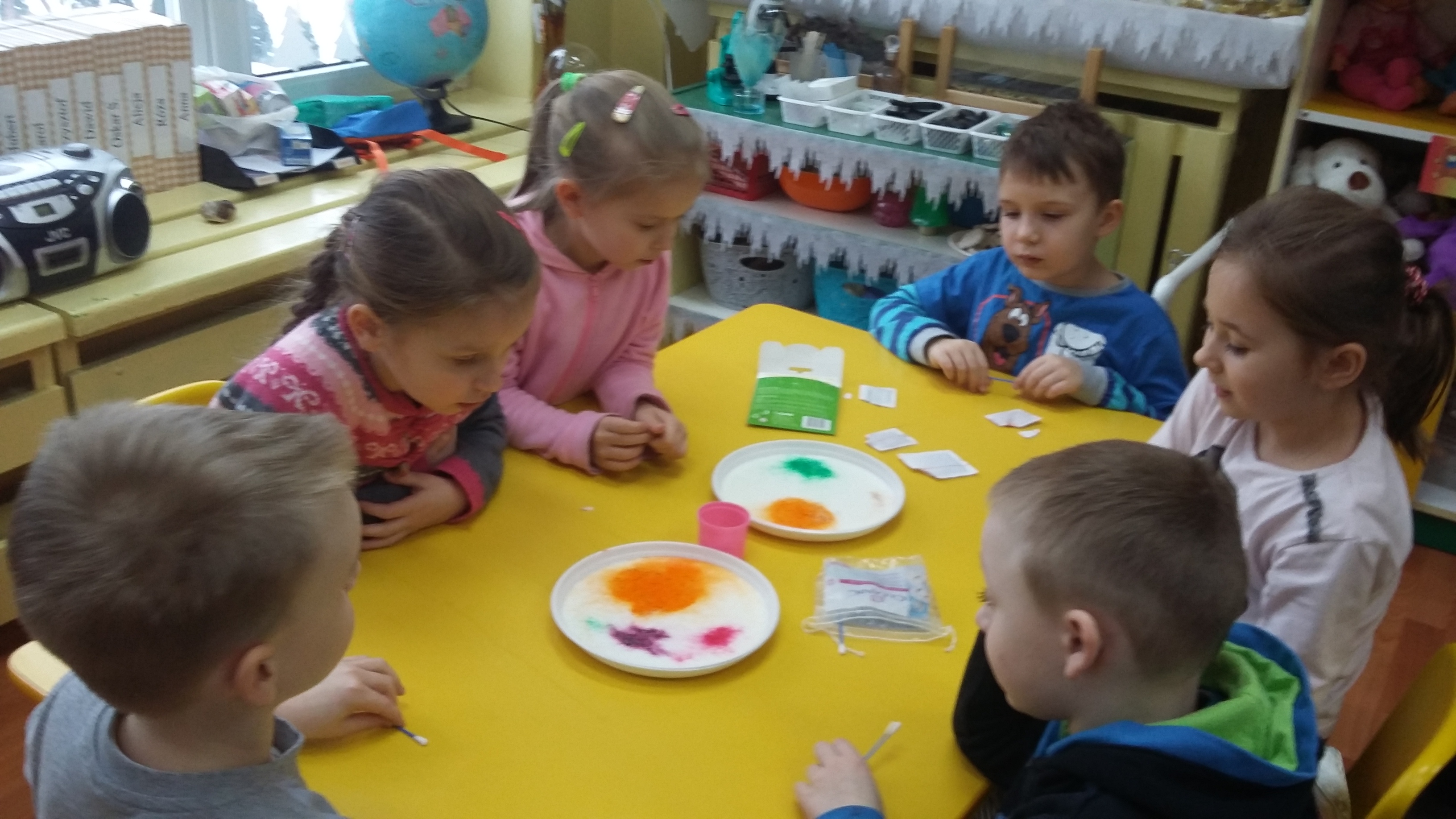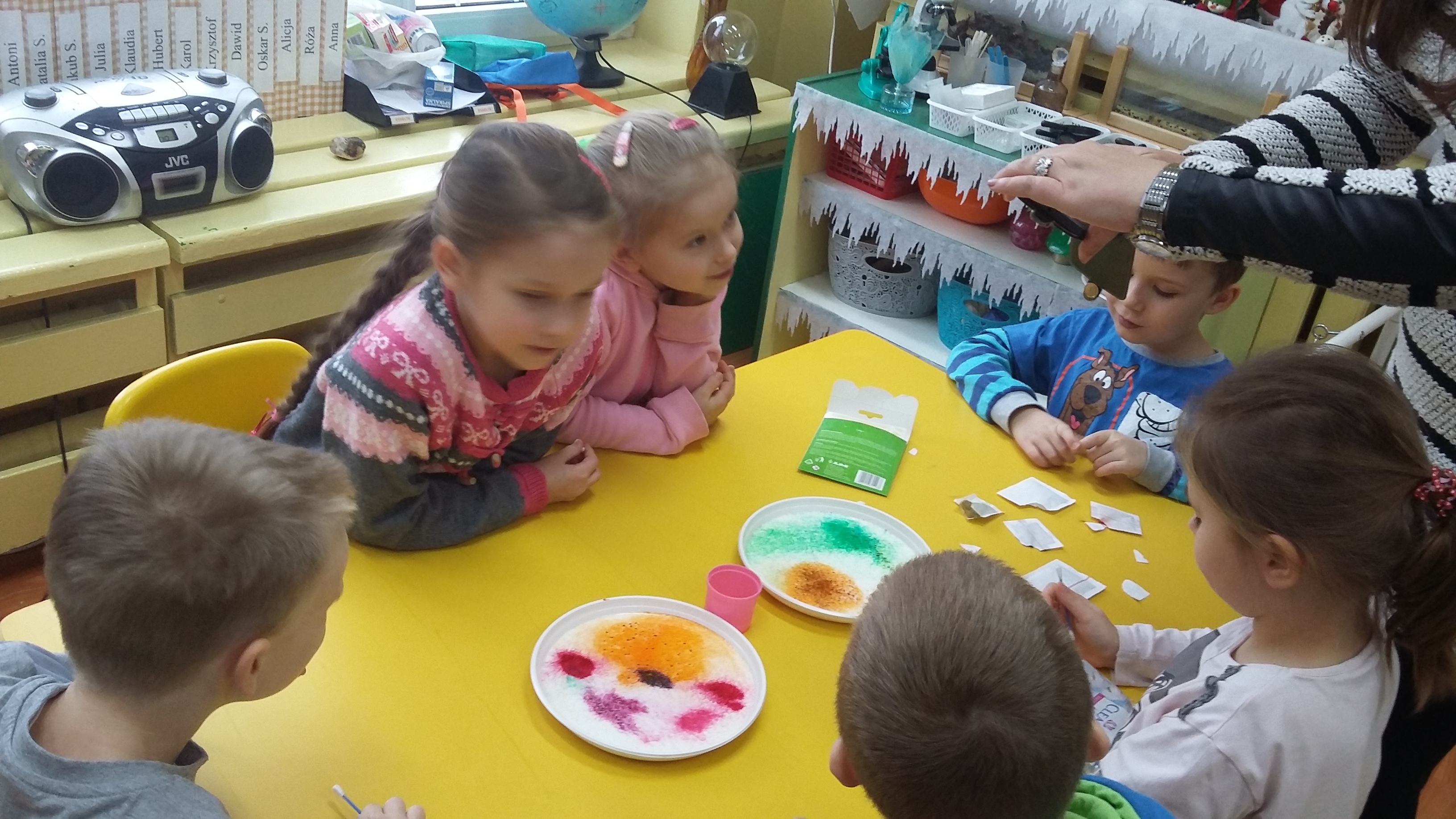 Nasza wyliczanka była również pretekstem do dzielenia wyrazów: Babcia i Dziadek na sylaby oraz głoski oraz do czytania obu tych wyrazów. Później dzieci rozpoczęły aktywności w kącikach zabawowo- zadaniowych. W kąciku darów starszaki układały twarz dziadka z daru 7 i 10. Powstały prawdziwe portrety. W kąciku twórczym artyści układali postać babci, którą później malowali farbami. Praca w kąciku badawczym zaplanowana była w postaci eksperymentu z kolorowymi barwnikami rozpuszczonymi w mleku oraz patyczka zanurzonego w płynie do mycia naczyń. Magiczne działanie mleka i płynu powodowało powstanie kolorowych wirów oraz mieszanie się kolorów. W kąciku gospodarczym przedszkolaki wykonywały niezwykle apetyczne tulipany dla Babci i Dziadka z marchewki, ogórka, wafli ryżowych oraz wykałaczek. Kwiatki wyglądały niezwykle efektownie i smacznie, niestety nie przetrwały, ponieważ zostały zjedzone ze smakiem. Ten dzień froeblowski upłynął nam pod znakiem przygotowań do Dnia Babci i Dziadka.