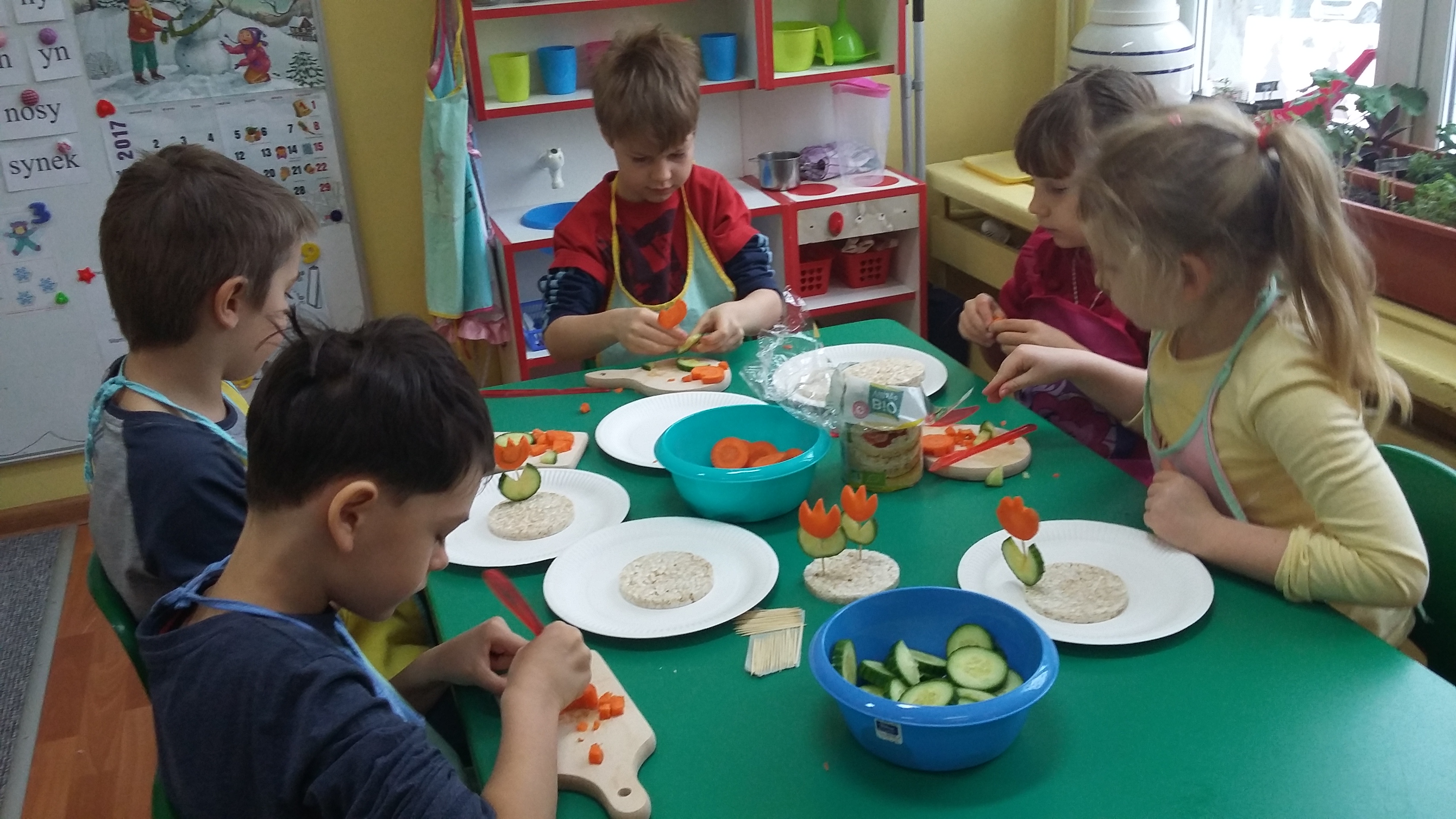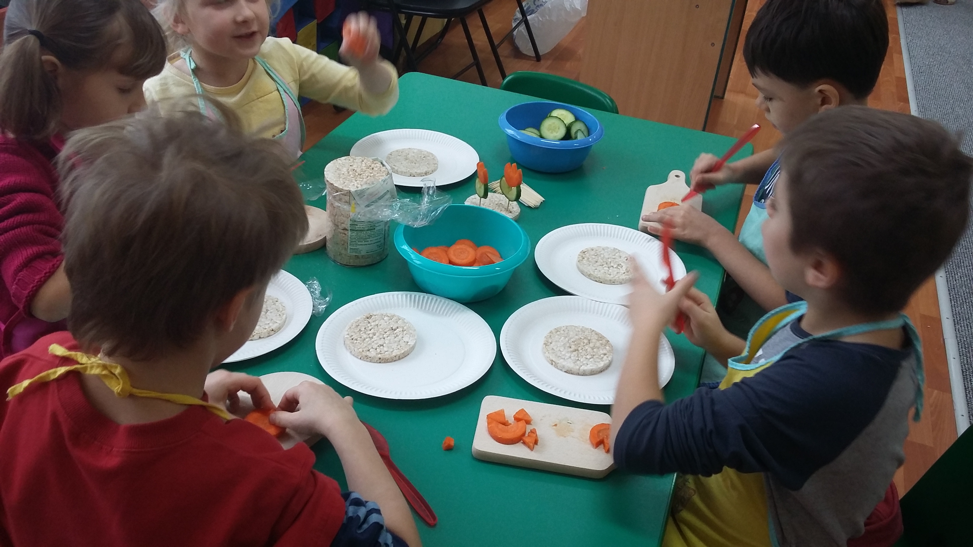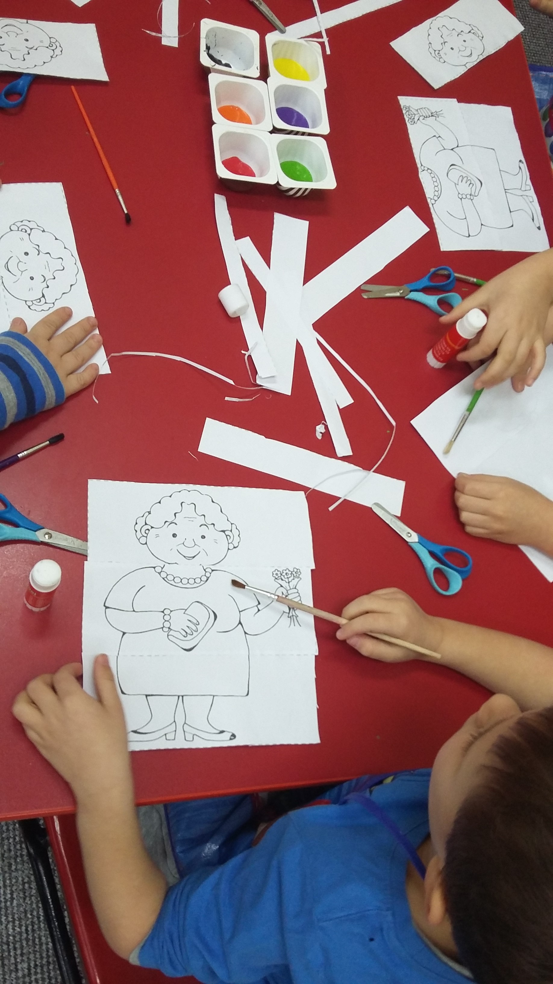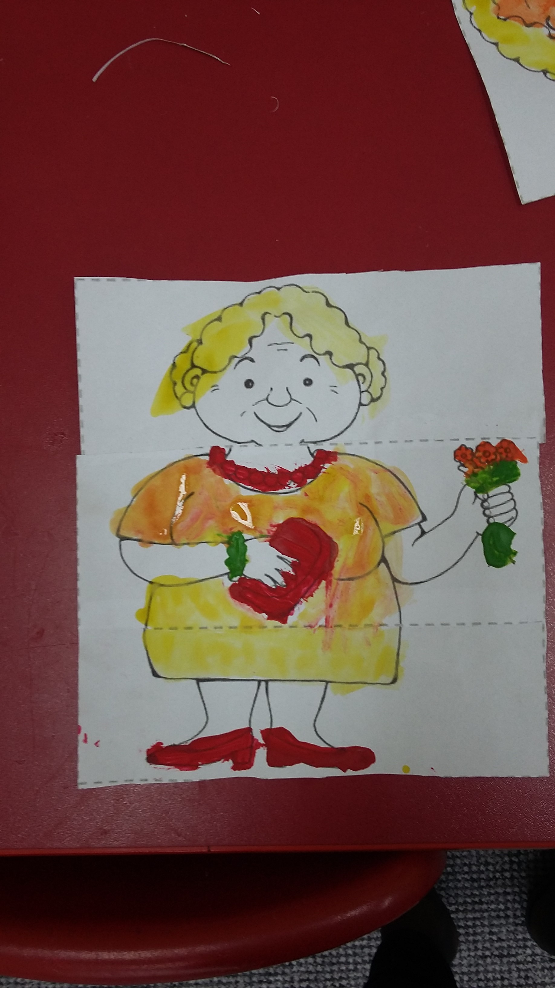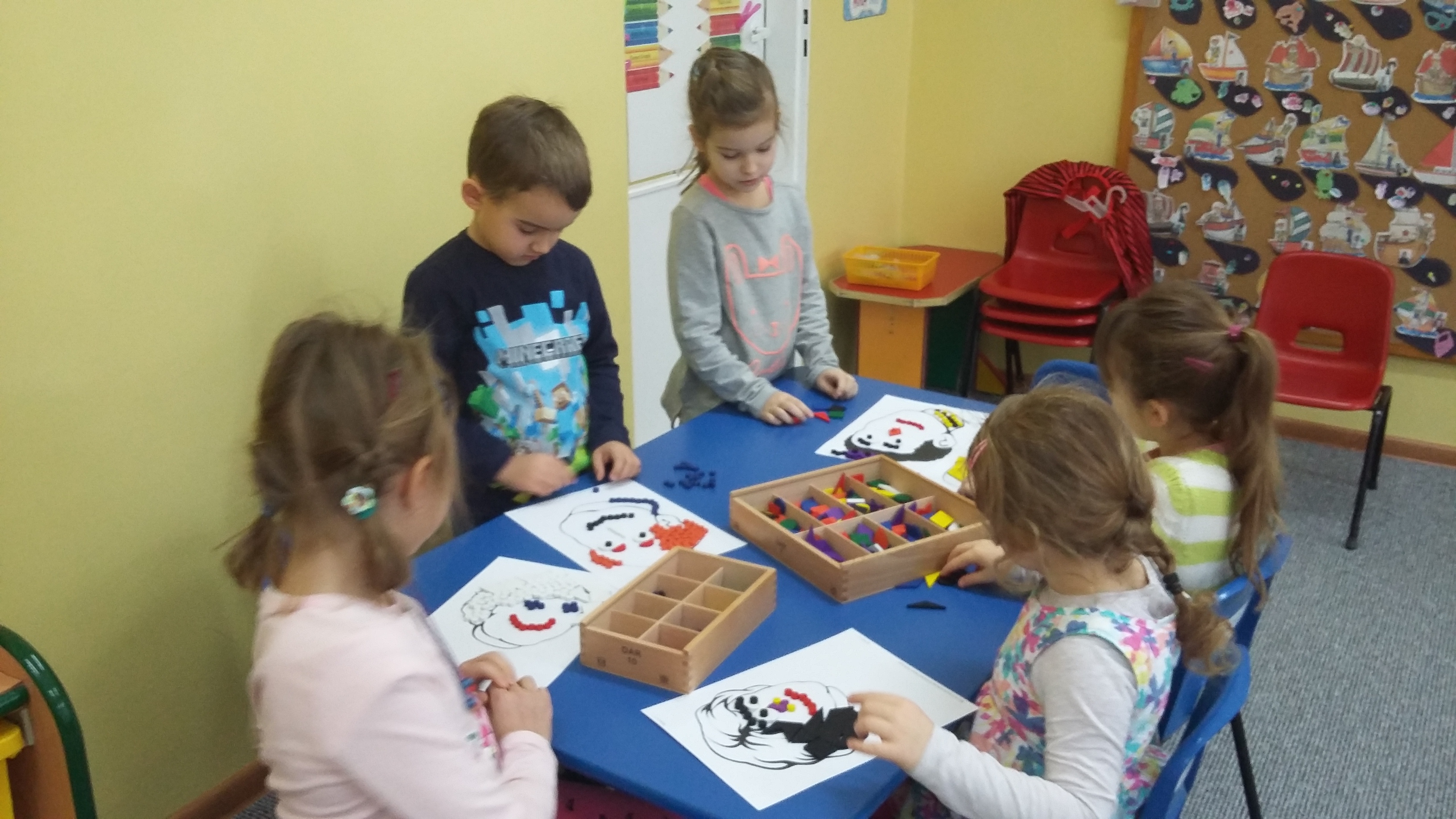 Nasza wyliczanka była również pretekstem do dzielenia wyrazów: Babcia i Dziadek na sylaby oraz głoski oraz do czytania obu tych wyrazów. Później dzieci rozpoczęły aktywności w kącikach zabawowo- zadaniowych. W kąciku darów starszaki układały twarz dziadka z daru 7 i 10. Powstały prawdziwe portrety. W kąciku twórczym artyści układali postać babci, którą później malowali farbami. Praca w kąciku badawczym zaplanowana była w postaci eksperymentu z kolorowymi barwnikami rozpuszczonymi w mleku oraz patyczka zanurzonego w płynie do mycia naczyń. Magiczne działanie mleka i płynu powodowało powstanie kolorowych wirów oraz mieszanie się kolorów. W kąciku gospodarczym przedszkolaki wykonywały niezwykle apetyczne tulipany dla Babci i Dziadka z marchewki, ogórka, wafli ryżowych oraz wykałaczek. Kwiatki wyglądały niezwykle efektownie i smacznie, niestety nie przetrwały, ponieważ zostały zjedzone ze smakiem. Ten dzień froeblowski upłynął nam pod znakiem przygotowań do Dnia Babci i Dziadka.