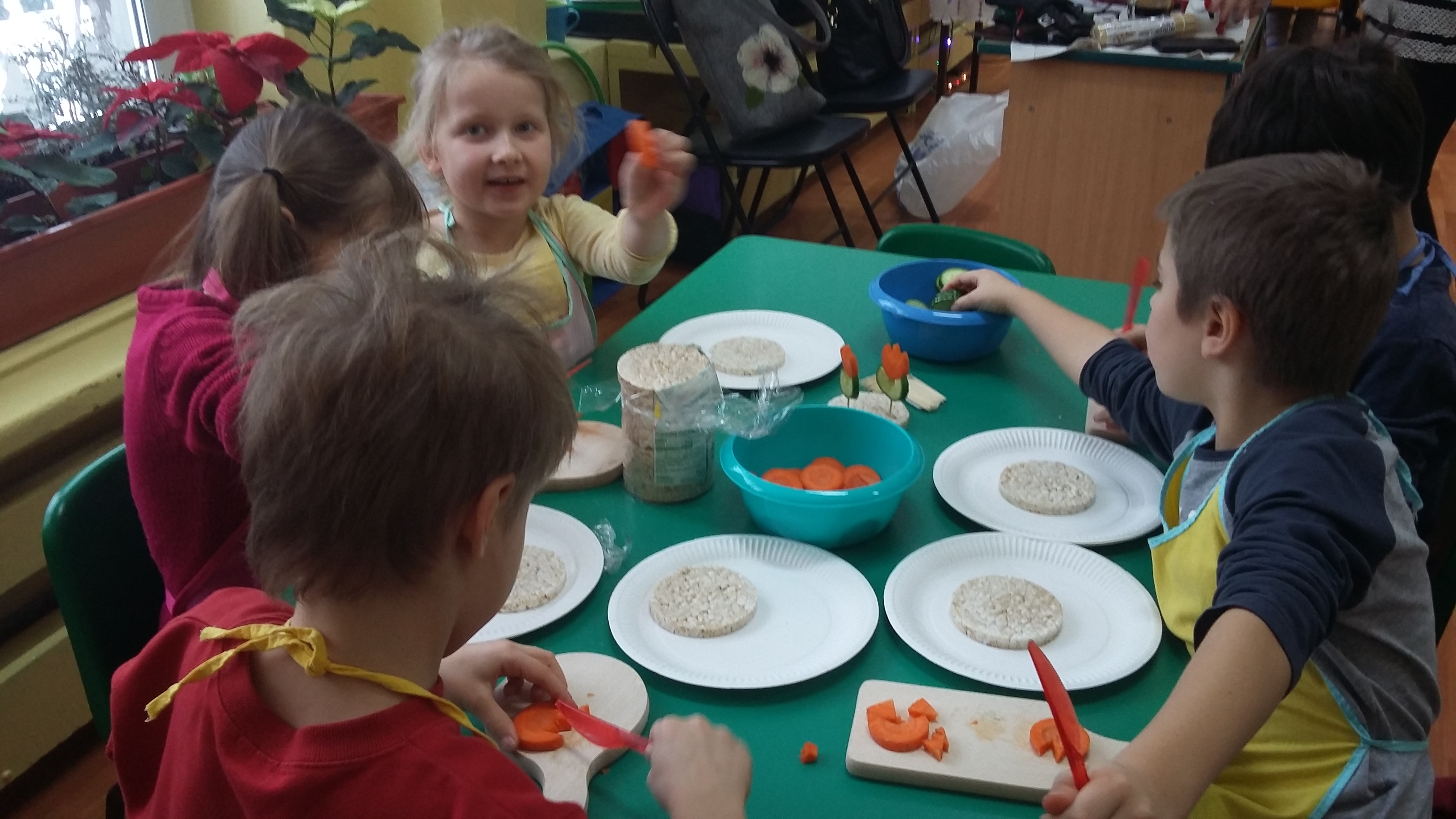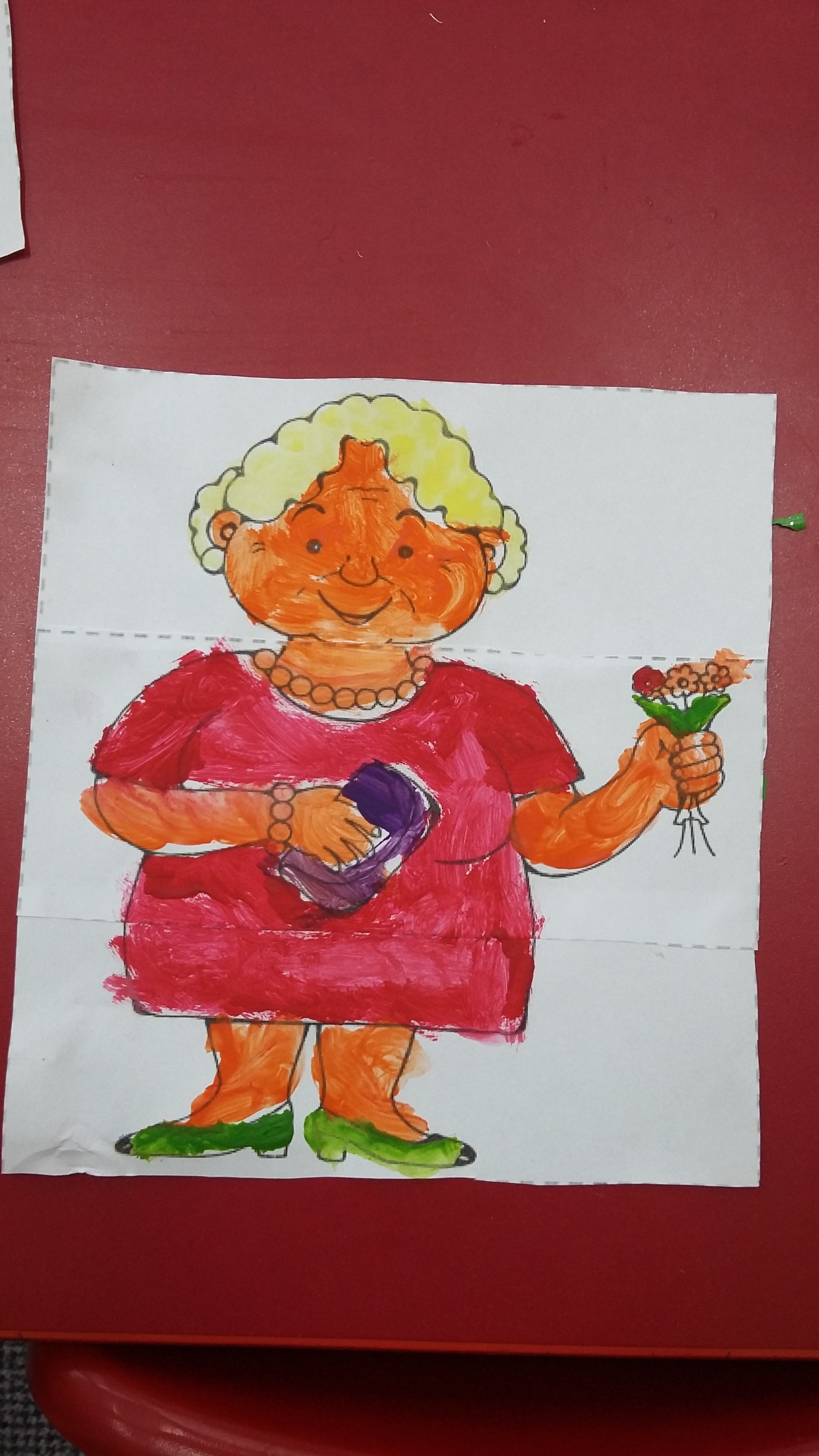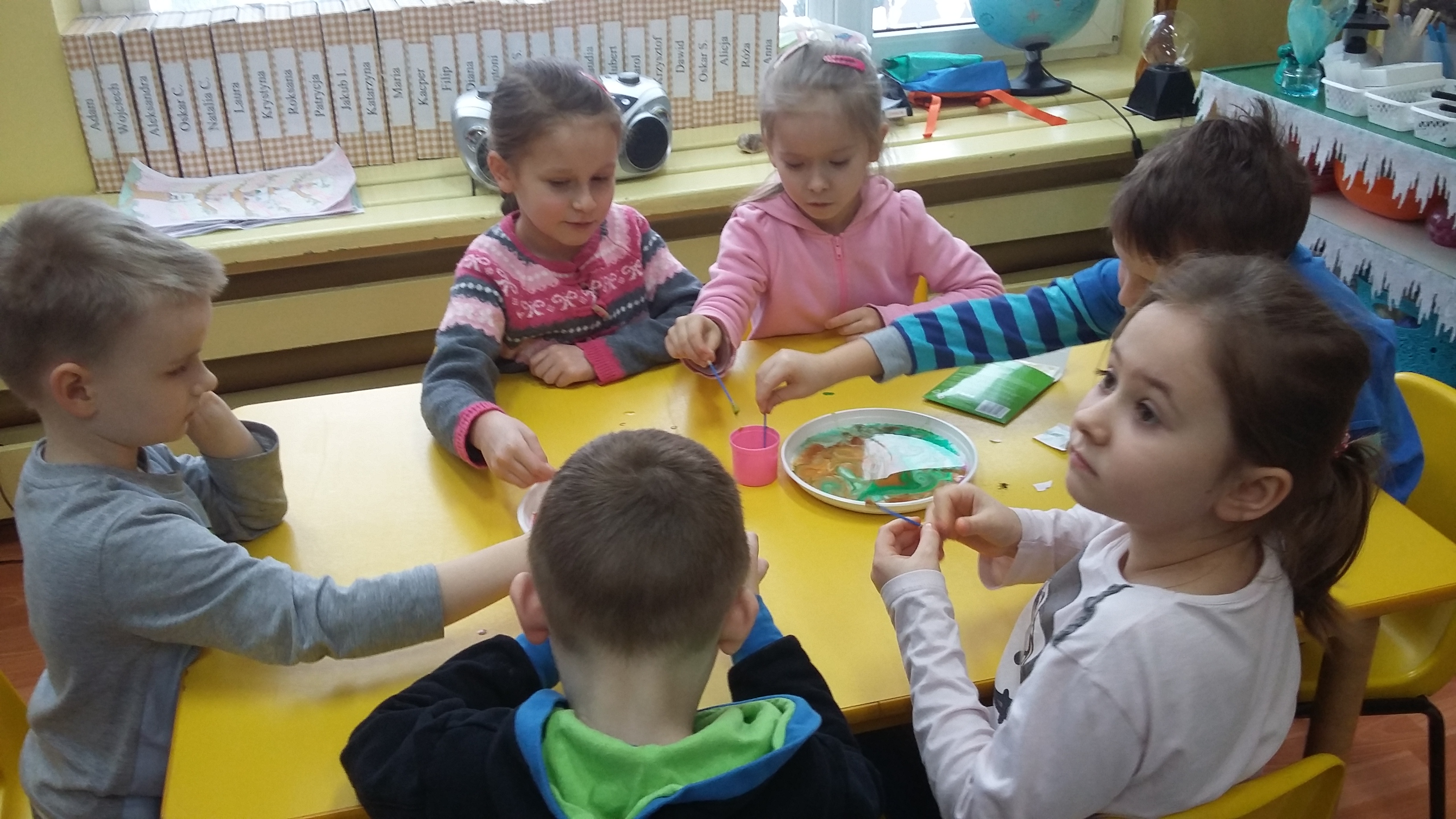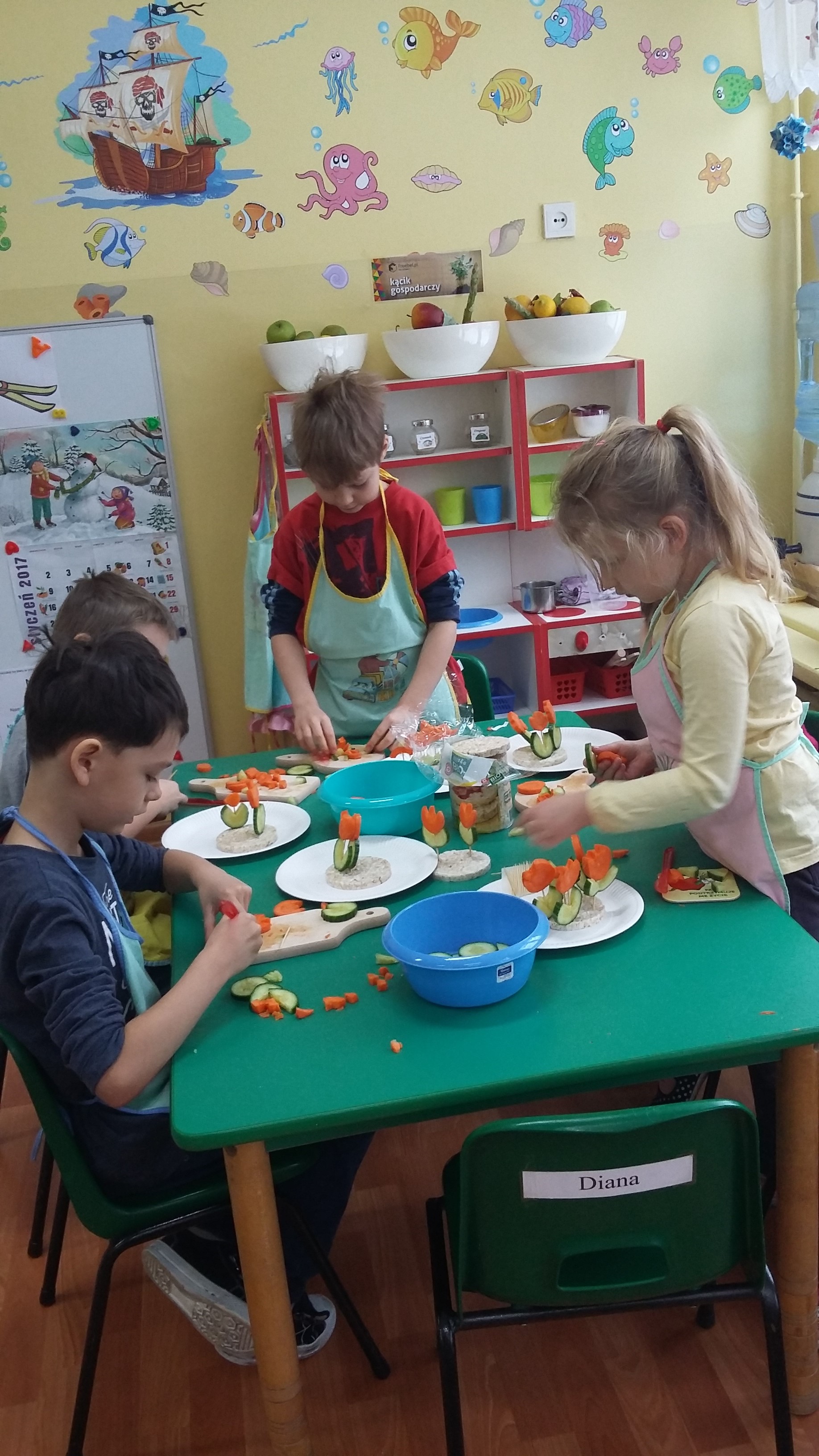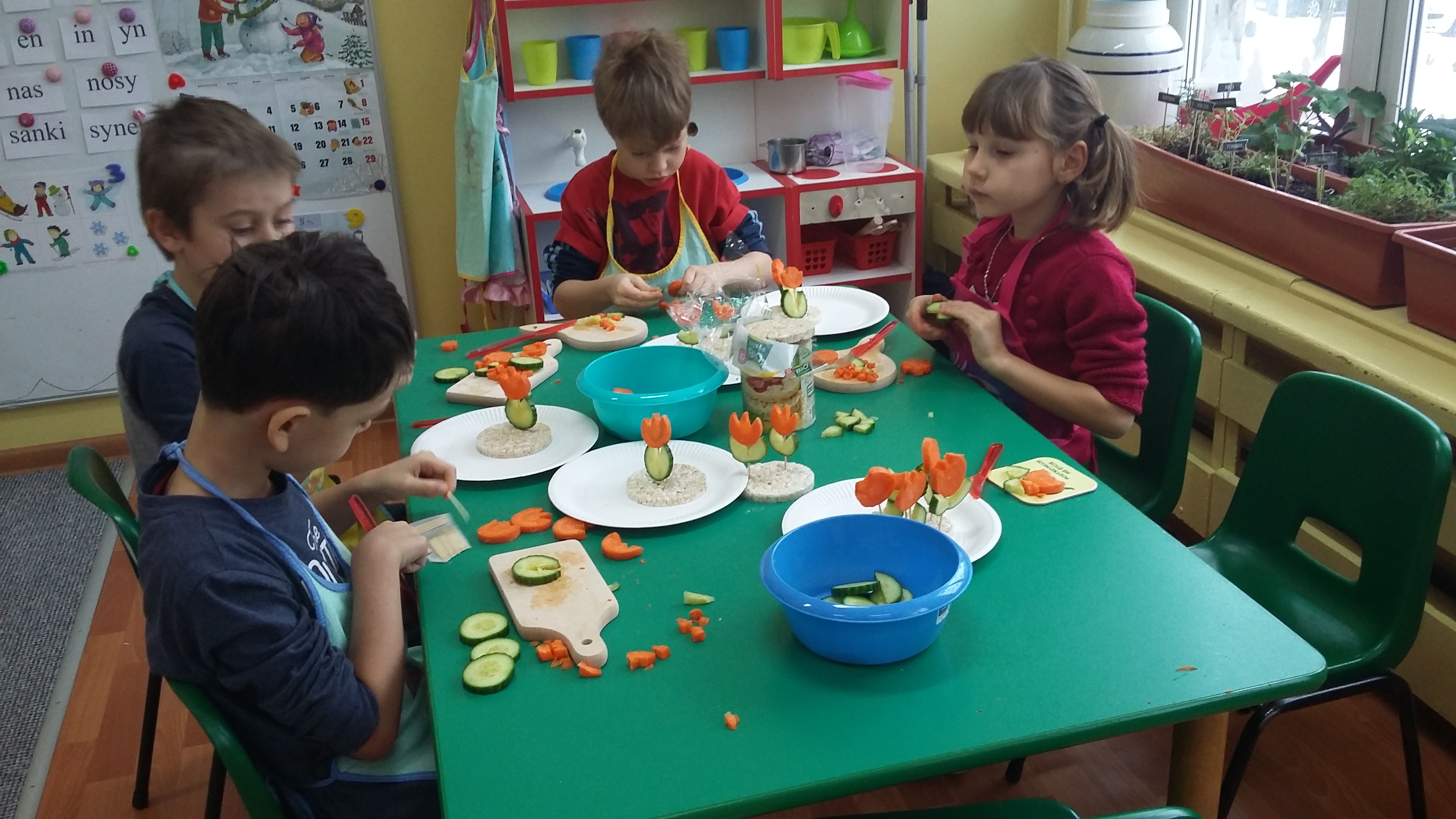 Nasza wyliczanka była również pretekstem do dzielenia wyrazów: Babcia i Dziadek na sylaby oraz głoski oraz do czytania obu tych wyrazów. Później dzieci rozpoczęły aktywności w kącikach zabawowo- zadaniowych. W kąciku darów starszaki układały twarz dziadka z daru 7 i 10. Powstały prawdziwe portrety. W kąciku twórczym artyści układali postać babci, którą później malowali farbami. Praca w kąciku badawczym zaplanowana była w postaci eksperymentu z kolorowymi barwnikami rozpuszczonymi w mleku oraz patyczka zanurzonego w płynie do mycia naczyń. Magiczne działanie mleka i płynu powodowało powstanie kolorowych wirów oraz mieszanie się kolorów. W kąciku gospodarczym przedszkolaki wykonywały niezwykle apetyczne tulipany dla Babci i Dziadka z marchewki, ogórka, wafli ryżowych oraz wykałaczek. Kwiatki wyglądały niezwykle efektownie i smacznie, niestety nie przetrwały, ponieważ zostały zjedzone ze smakiem. Ten dzień froeblowski upłynął nam pod znakiem przygotowań do Dnia Babci i Dziadka.