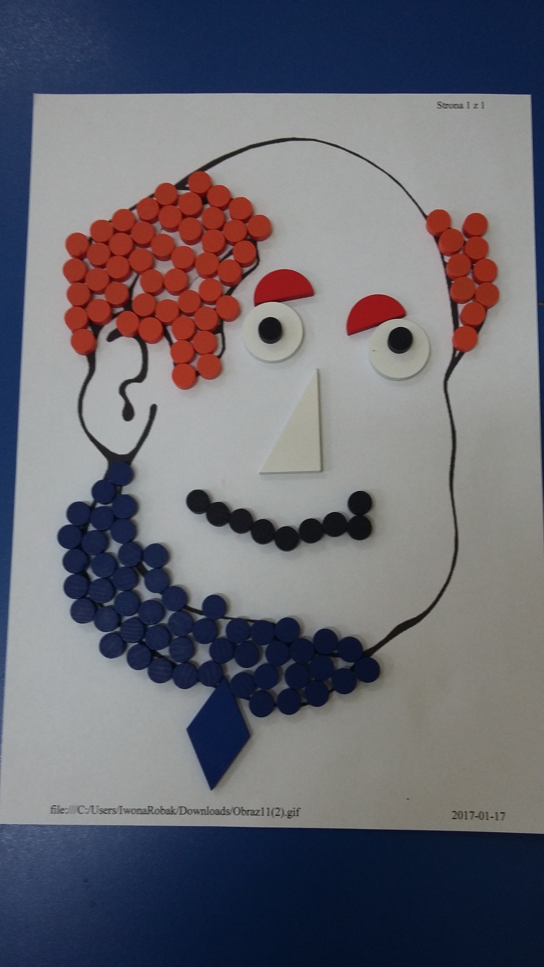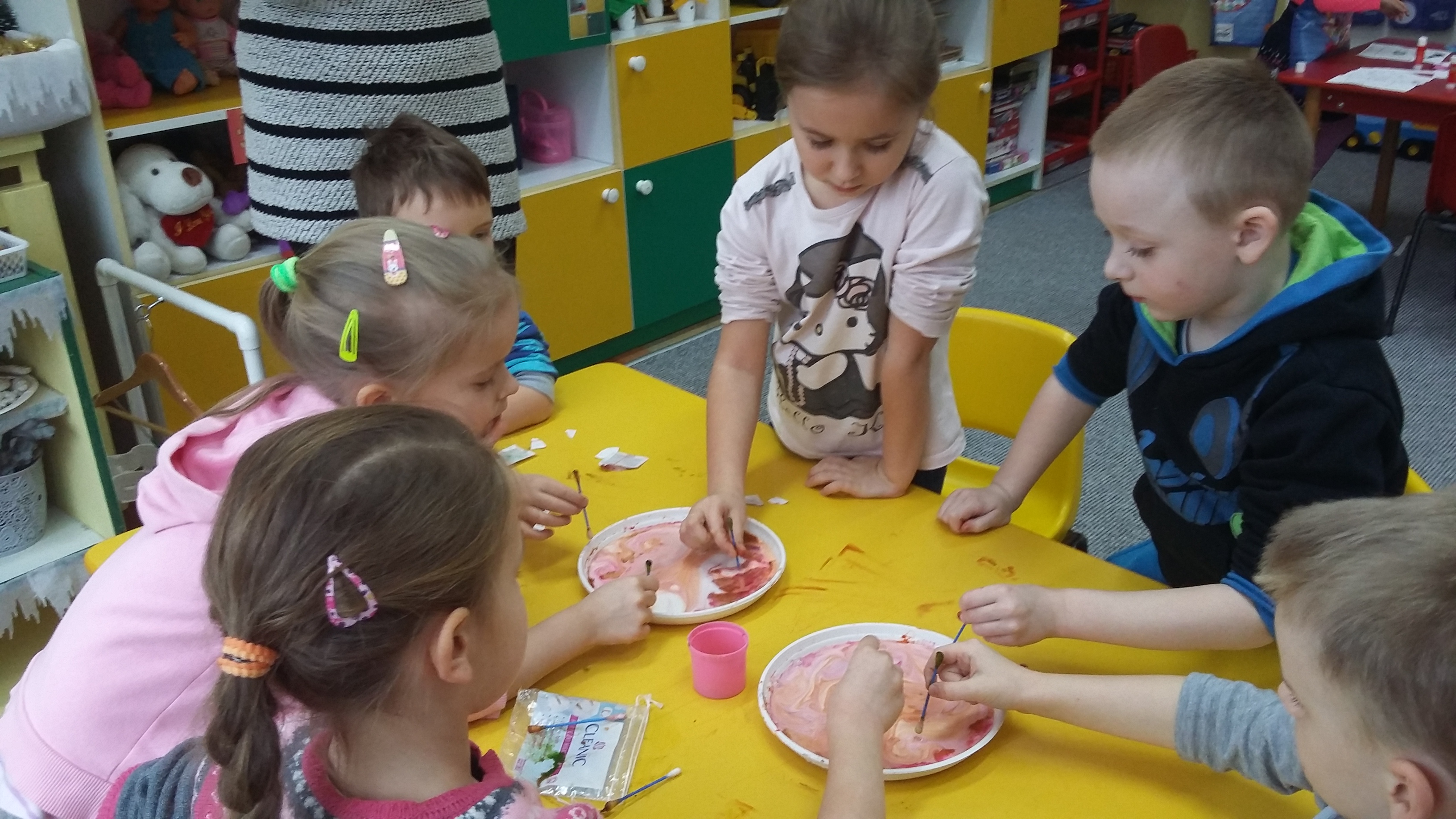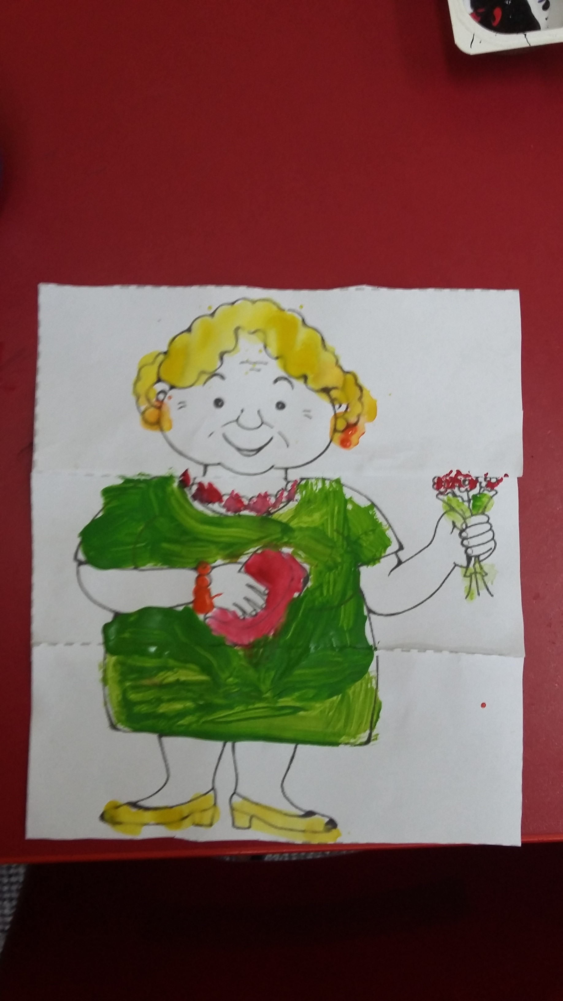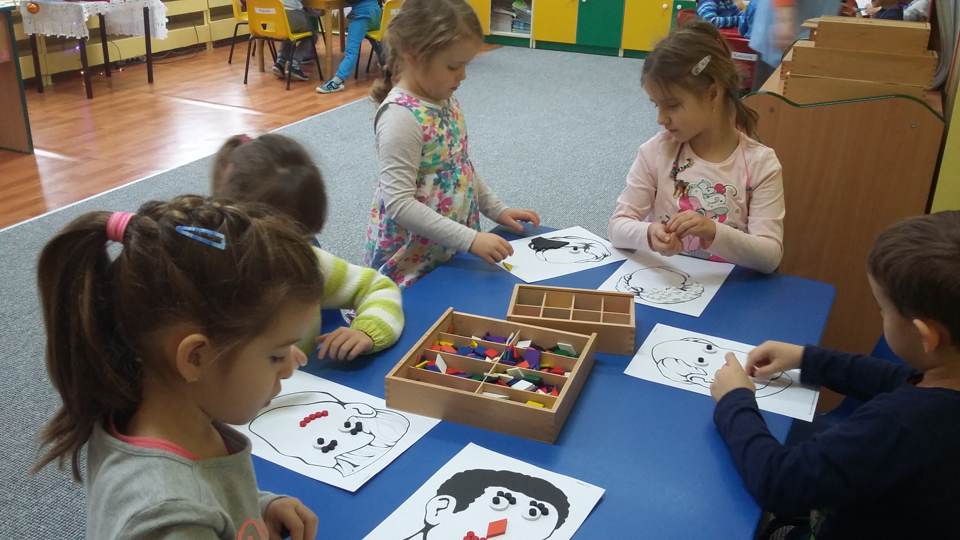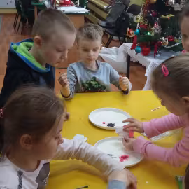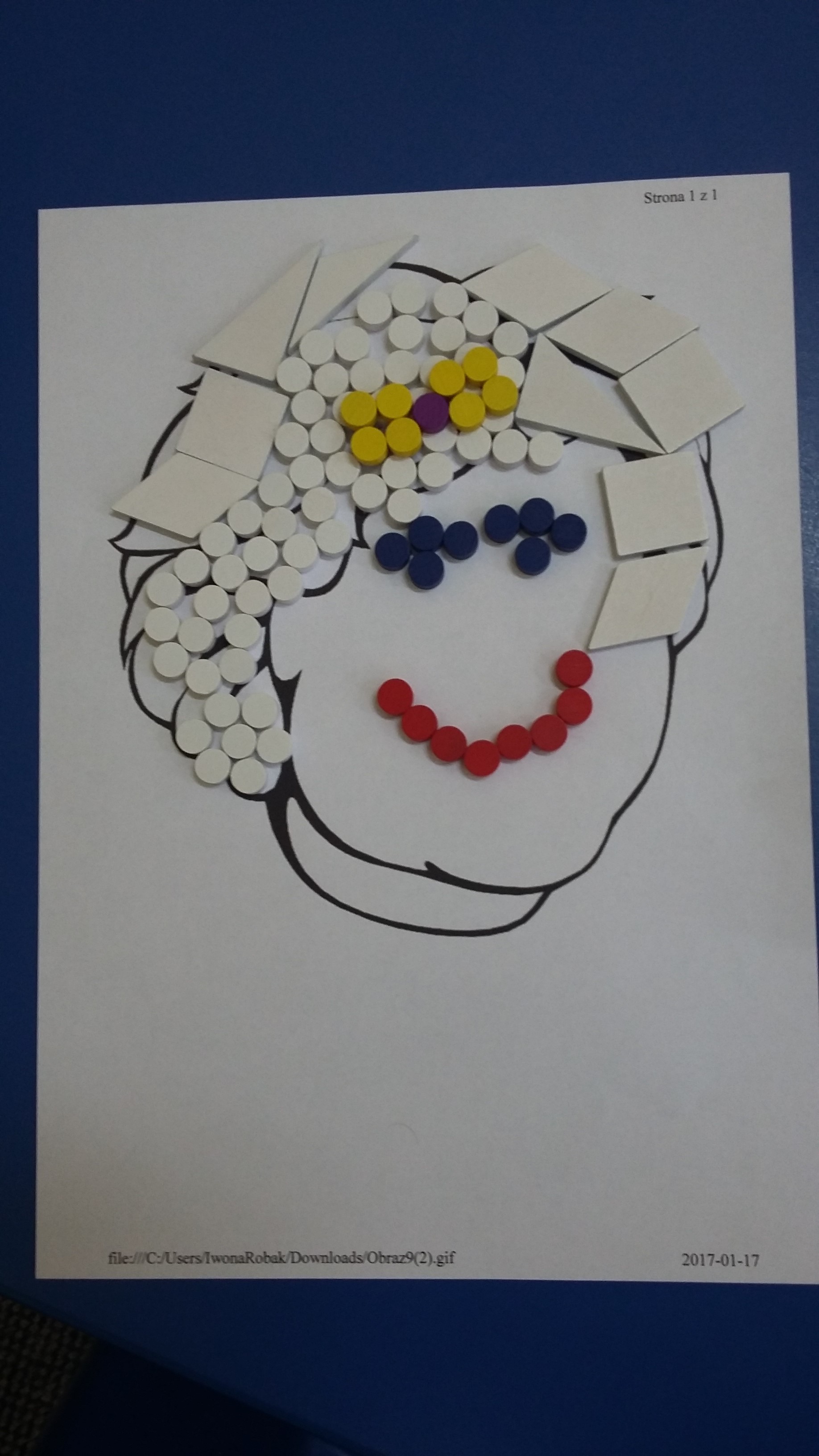 Nasza wyliczanka była również pretekstem do dzielenia wyrazów: Babcia i Dziadek na sylaby oraz głoski oraz do czytania obu tych wyrazów. Później dzieci rozpoczęły aktywności w kącikach zabawowo- zadaniowych. W kąciku darów starszaki układały twarz dziadka z daru 7 i 10. Powstały prawdziwe portrety. W kąciku twórczym artyści układali postać babci, którą później malowali farbami. Praca w kąciku badawczym zaplanowana była w postaci eksperymentu z kolorowymi barwnikami rozpuszczonymi w mleku oraz patyczka zanurzonego w płynie do mycia naczyń. Magiczne działanie mleka i płynu powodowało powstanie kolorowych wirów oraz mieszanie się kolorów. W kąciku gospodarczym przedszkolaki wykonywały niezwykle apetyczne tulipany dla Babci i Dziadka z marchewki, ogórka, wafli ryżowych oraz wykałaczek. Kwiatki wyglądały niezwykle efektownie i smacznie, niestety nie przetrwały, ponieważ zostały zjedzone ze smakiem. Ten dzień froeblowski upłynął nam pod znakiem przygotowań do Dnia Babci i Dziadka.