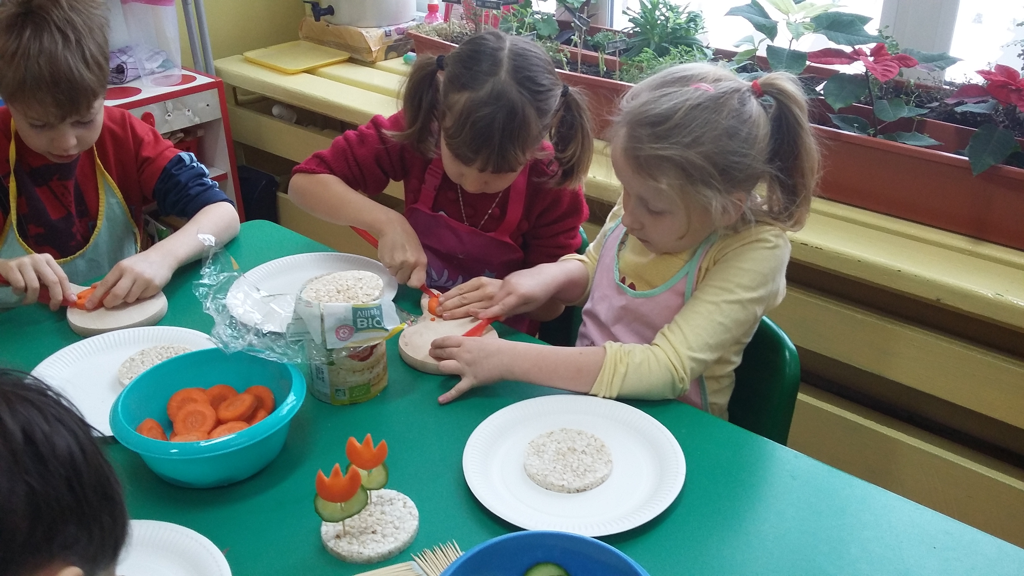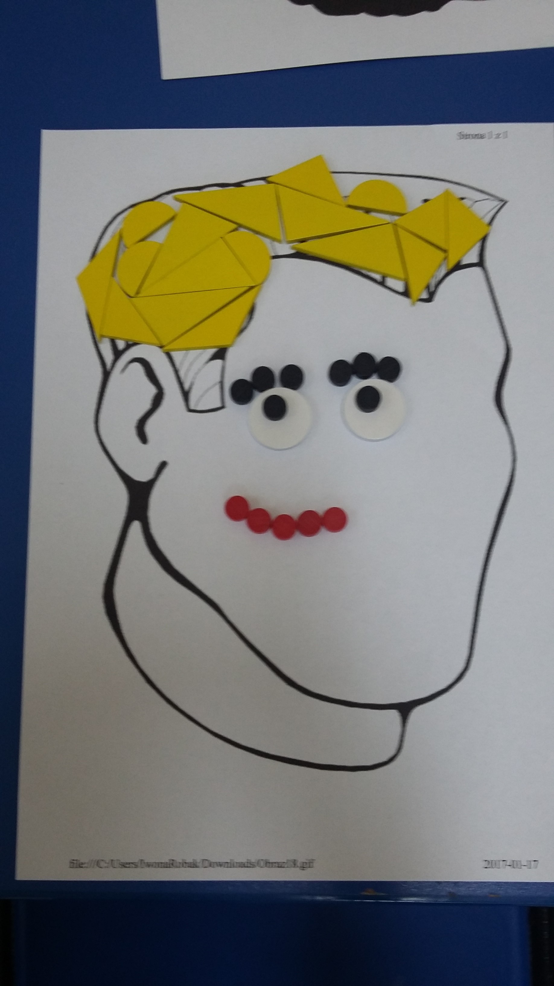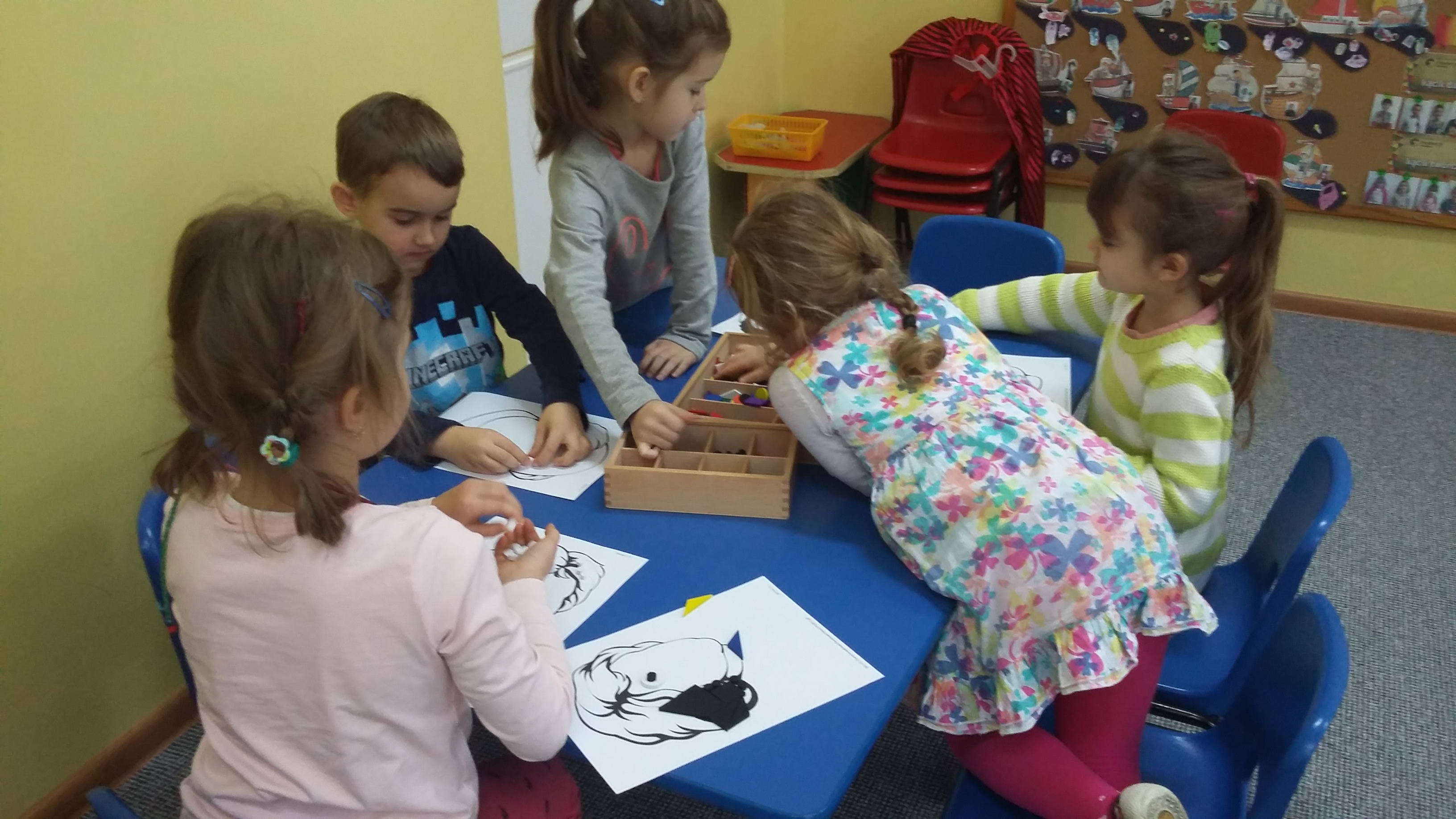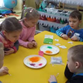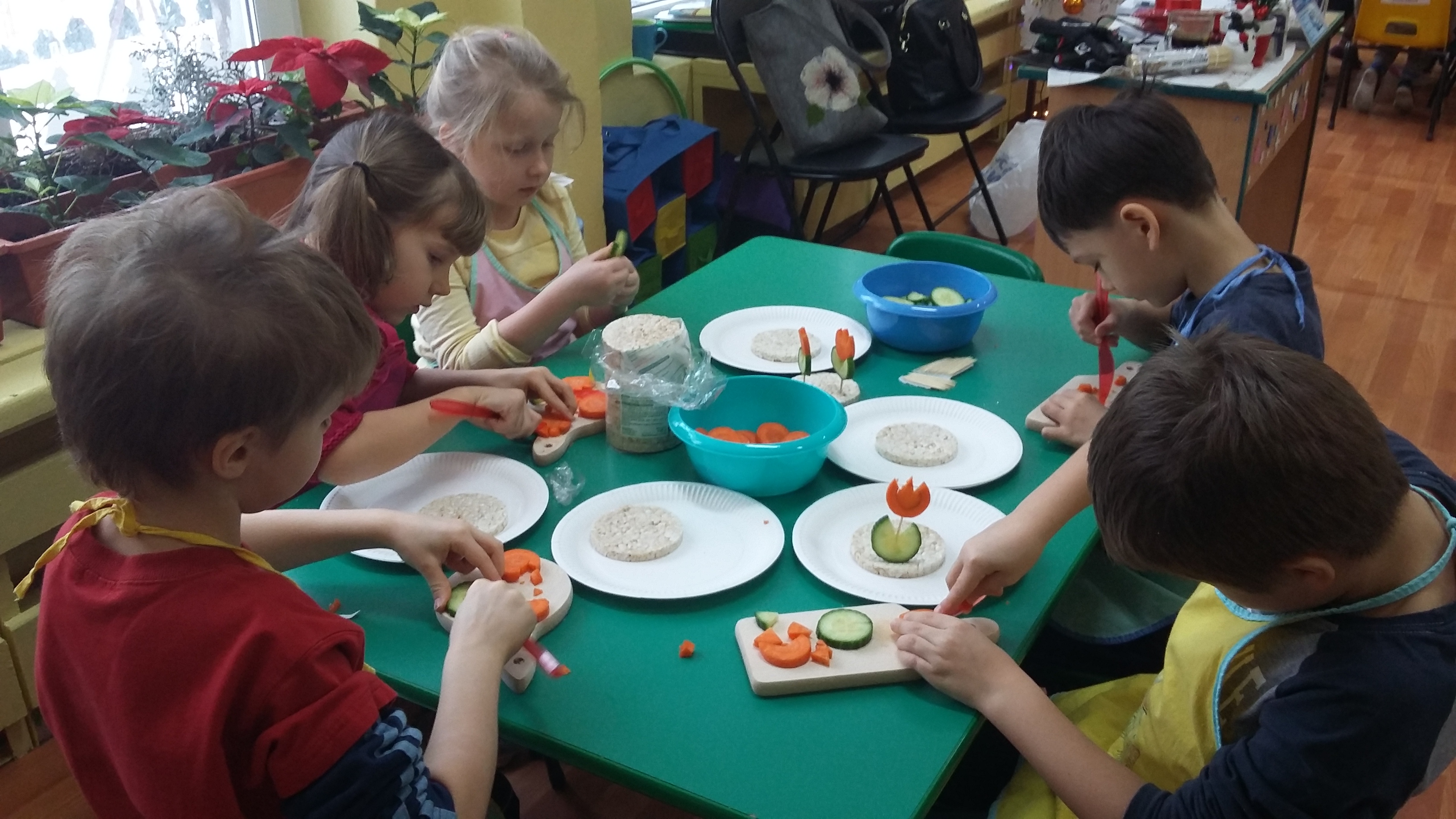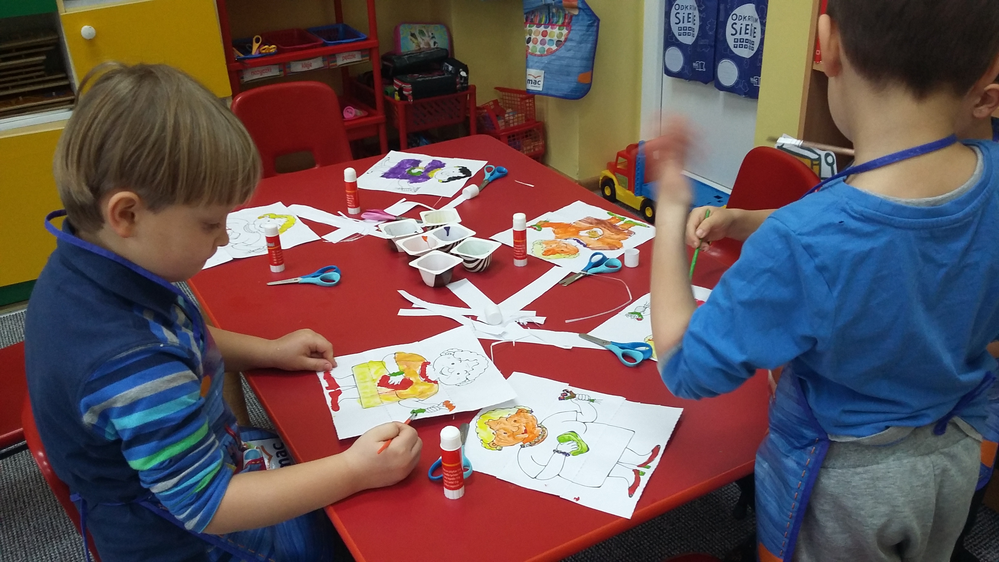 Nasza wyliczanka była również pretekstem do dzielenia wyrazów: Babcia i Dziadek na sylaby oraz głoski oraz do czytania obu tych wyrazów. Później dzieci rozpoczęły aktywności w kącikach zabawowo- zadaniowych. W kąciku darów starszaki układały twarz dziadka z daru 7 i 10. Powstały prawdziwe portrety. W kąciku twórczym artyści układali postać babci, którą później malowali farbami. Praca w kąciku badawczym zaplanowana była w postaci eksperymentu z kolorowymi barwnikami rozpuszczonymi w mleku oraz patyczka zanurzonego w płynie do mycia naczyń. Magiczne działanie mleka i płynu powodowało powstanie kolorowych wirów oraz mieszanie się kolorów. W kąciku gospodarczym przedszkolaki wykonywały niezwykle apetyczne tulipany dla Babci i Dziadka z marchewki, ogórka, wafli ryżowych oraz wykałaczek. Kwiatki wyglądały niezwykle efektownie i smacznie, niestety nie przetrwały, ponieważ zostały zjedzone ze smakiem. Ten dzień froeblowski upłynął nam pod znakiem przygotowań do Dnia Babci i Dziadka.