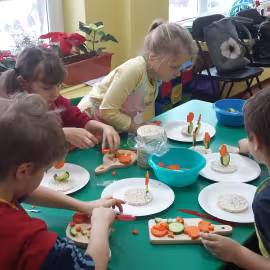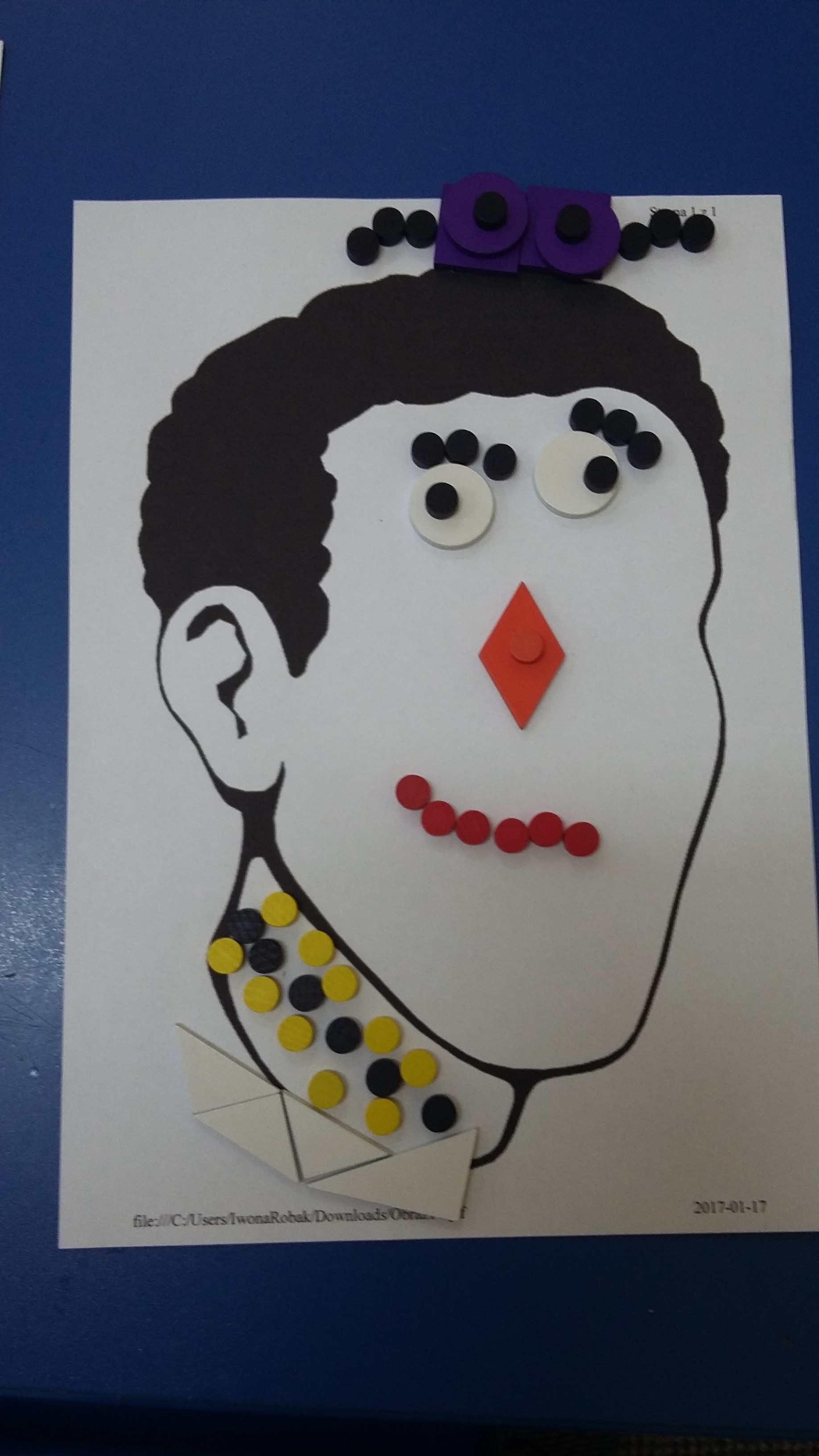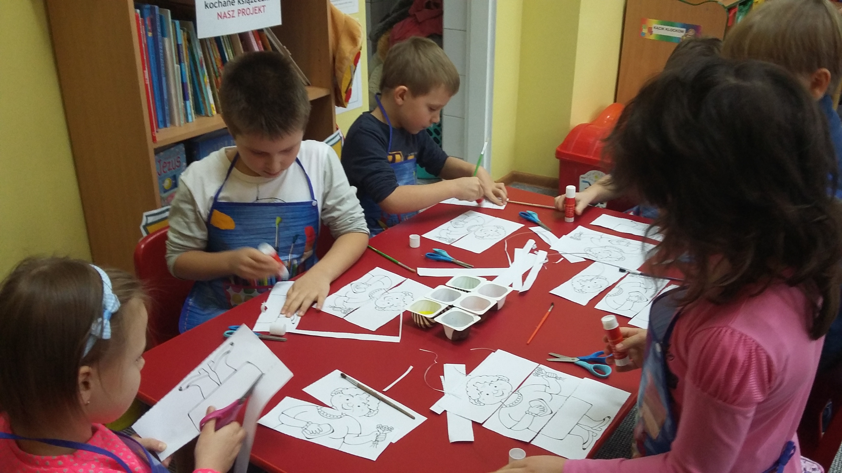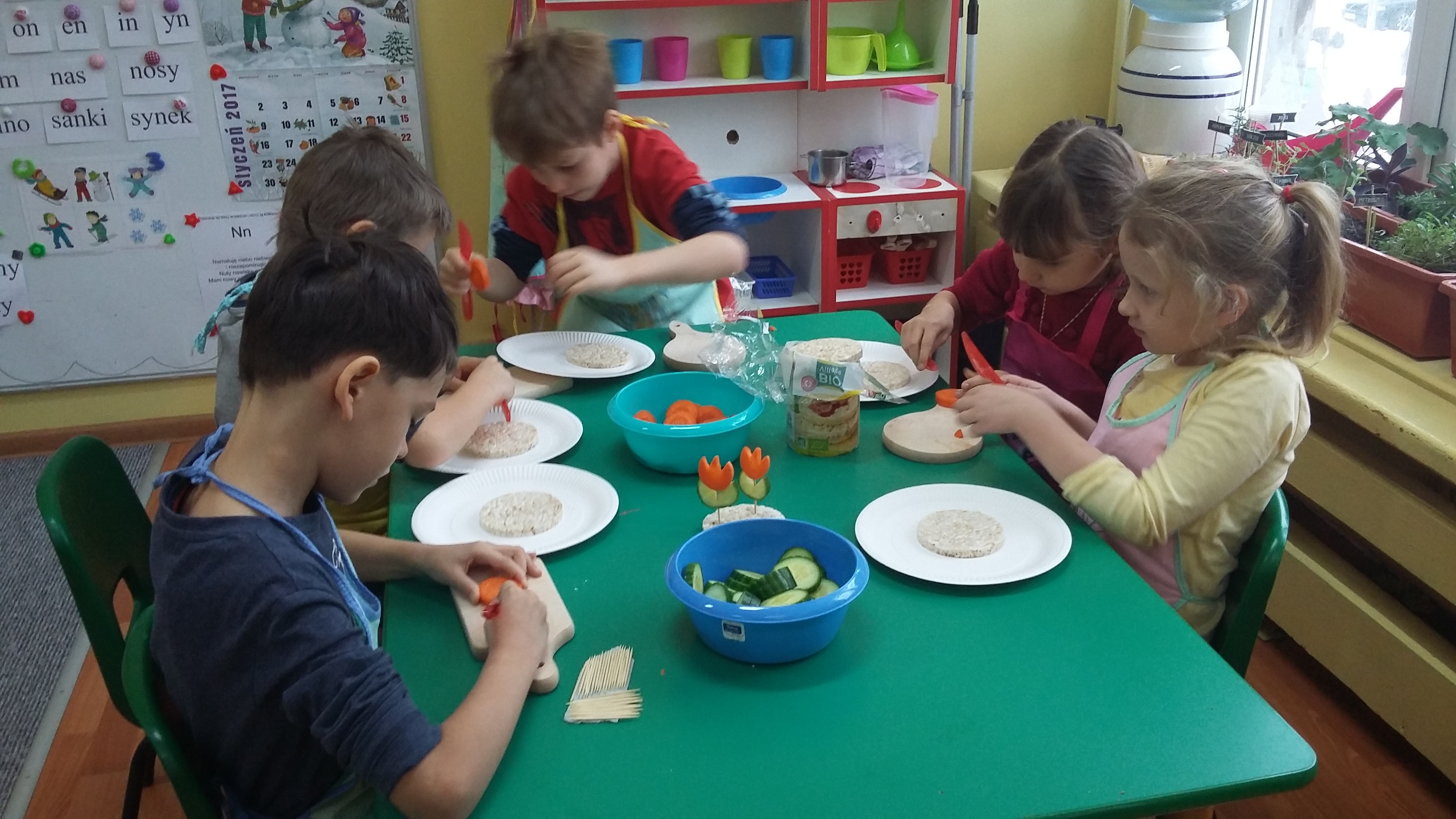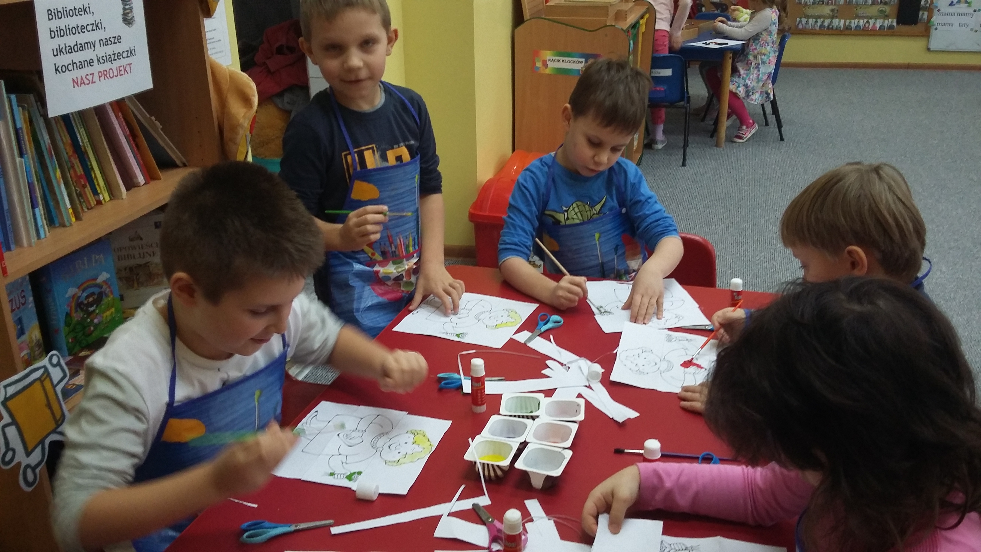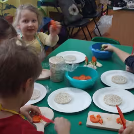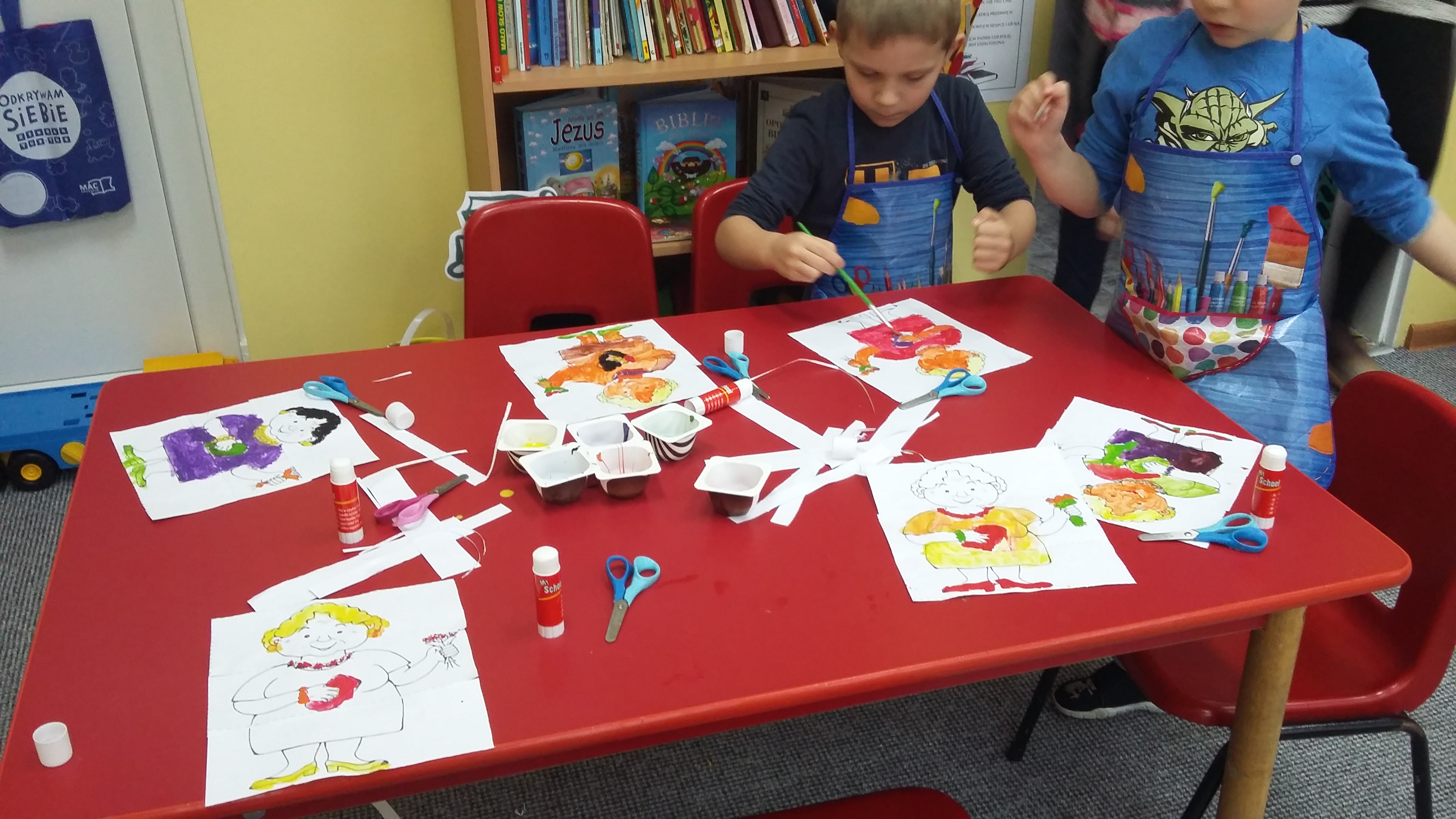 Nasza wyliczanka była również pretekstem do dzielenia wyrazów: Babcia i Dziadek na sylaby oraz głoski oraz do czytania obu tych wyrazów. Później dzieci rozpoczęły aktywności w kącikach zabawowo- zadaniowych. W kąciku darów starszaki układały twarz dziadka z daru 7 i 10. Powstały prawdziwe portrety. W kąciku twórczym artyści układali postać babci, którą później malowali farbami. Praca w kąciku badawczym zaplanowana była w postaci eksperymentu z kolorowymi barwnikami rozpuszczonymi w mleku oraz patyczka zanurzonego w płynie do mycia naczyń. Magiczne działanie mleka i płynu powodowało powstanie kolorowych wirów oraz mieszanie się kolorów. W kąciku gospodarczym przedszkolaki wykonywały niezwykle apetyczne tulipany dla Babci i Dziadka z marchewki, ogórka, wafli ryżowych oraz wykałaczek. Kwiatki wyglądały niezwykle efektownie i smacznie, niestety nie przetrwały, ponieważ zostały zjedzone ze smakiem. Ten dzień froeblowski upłynął nam pod znakiem przygotowań do Dnia Babci i Dziadka.