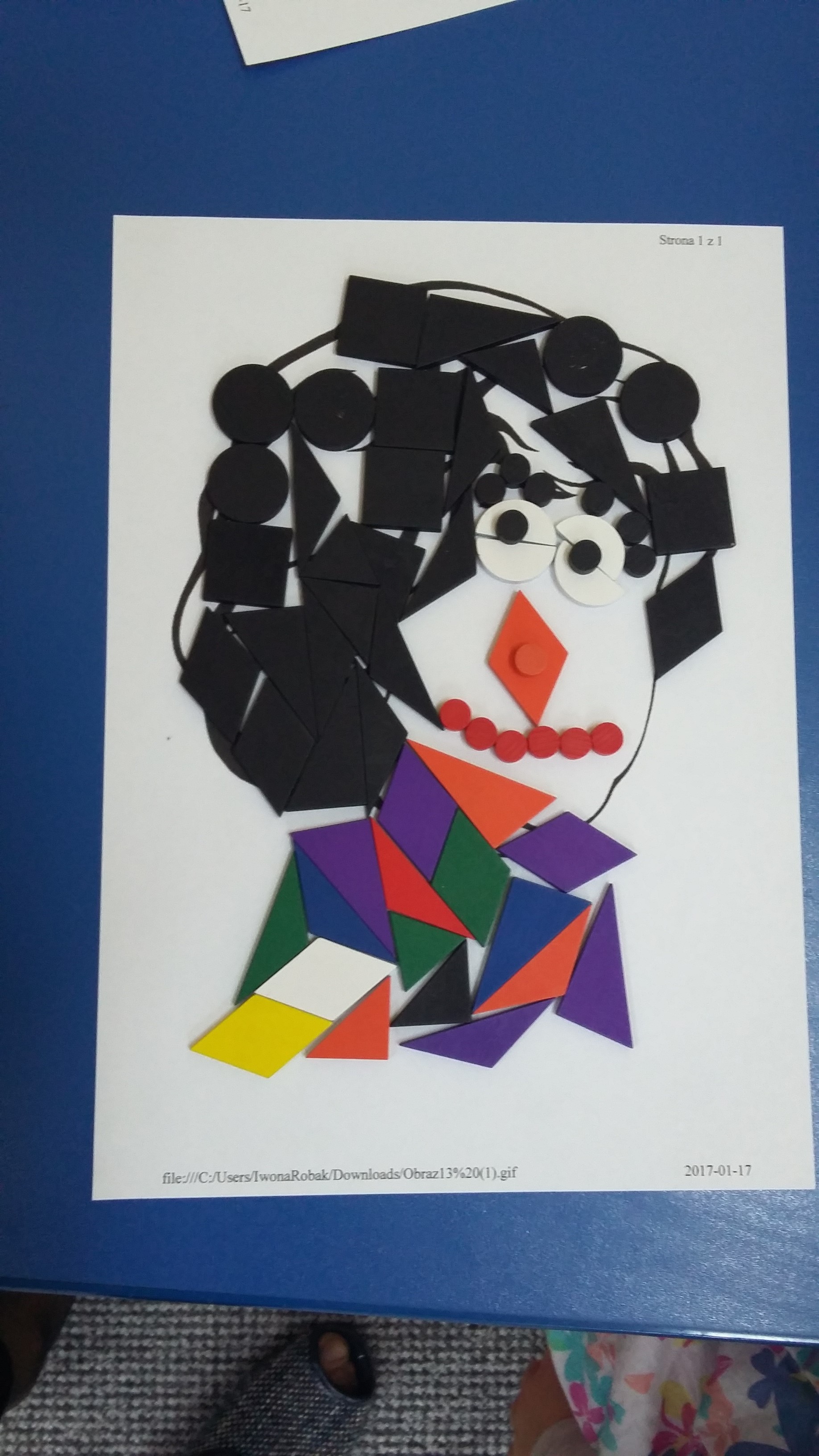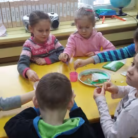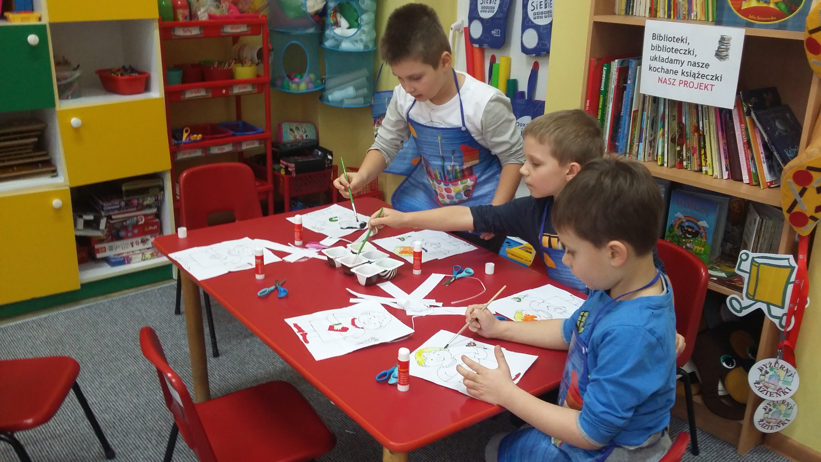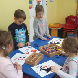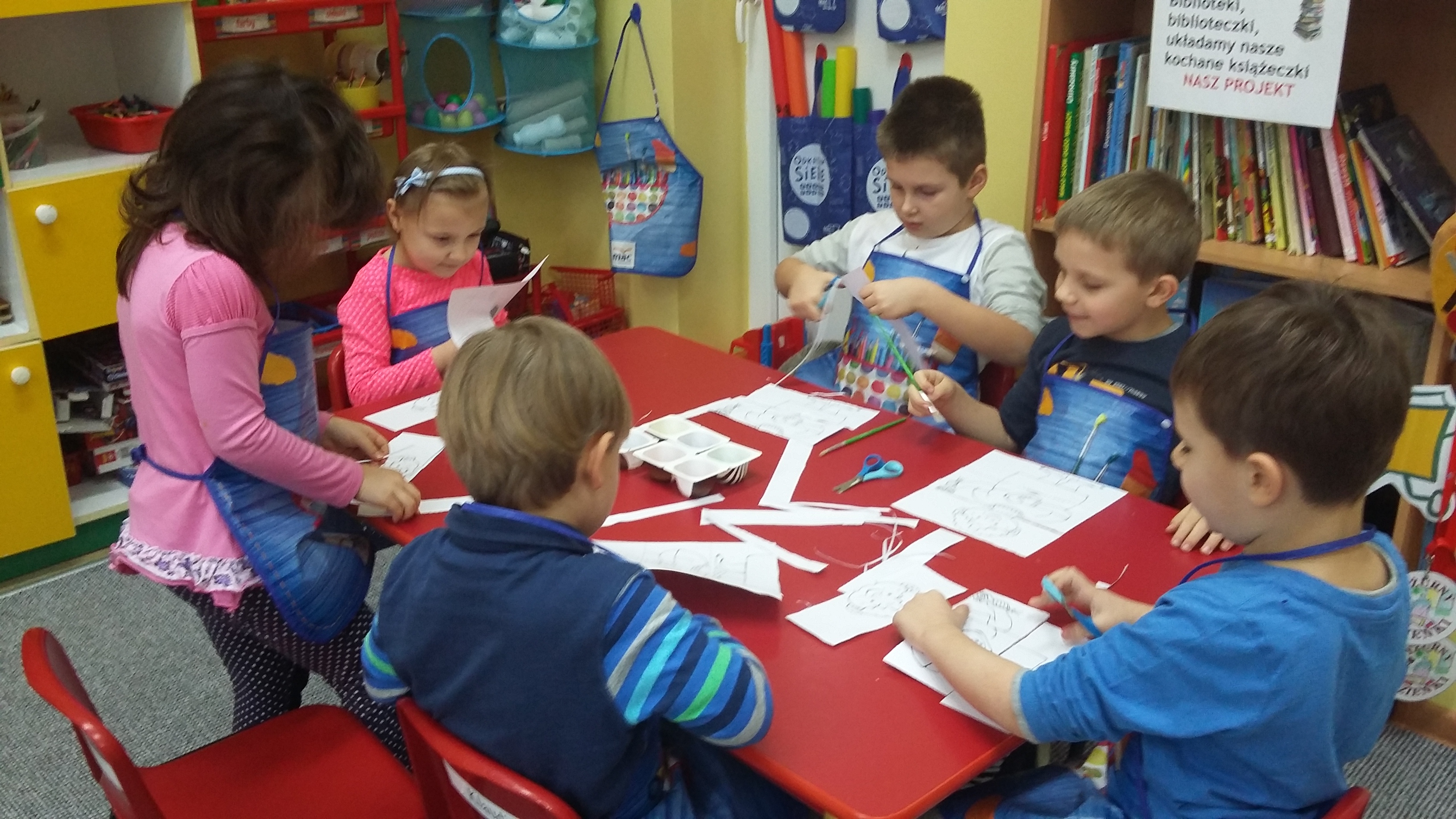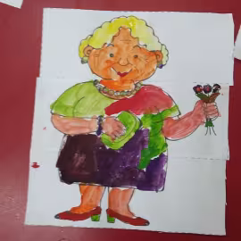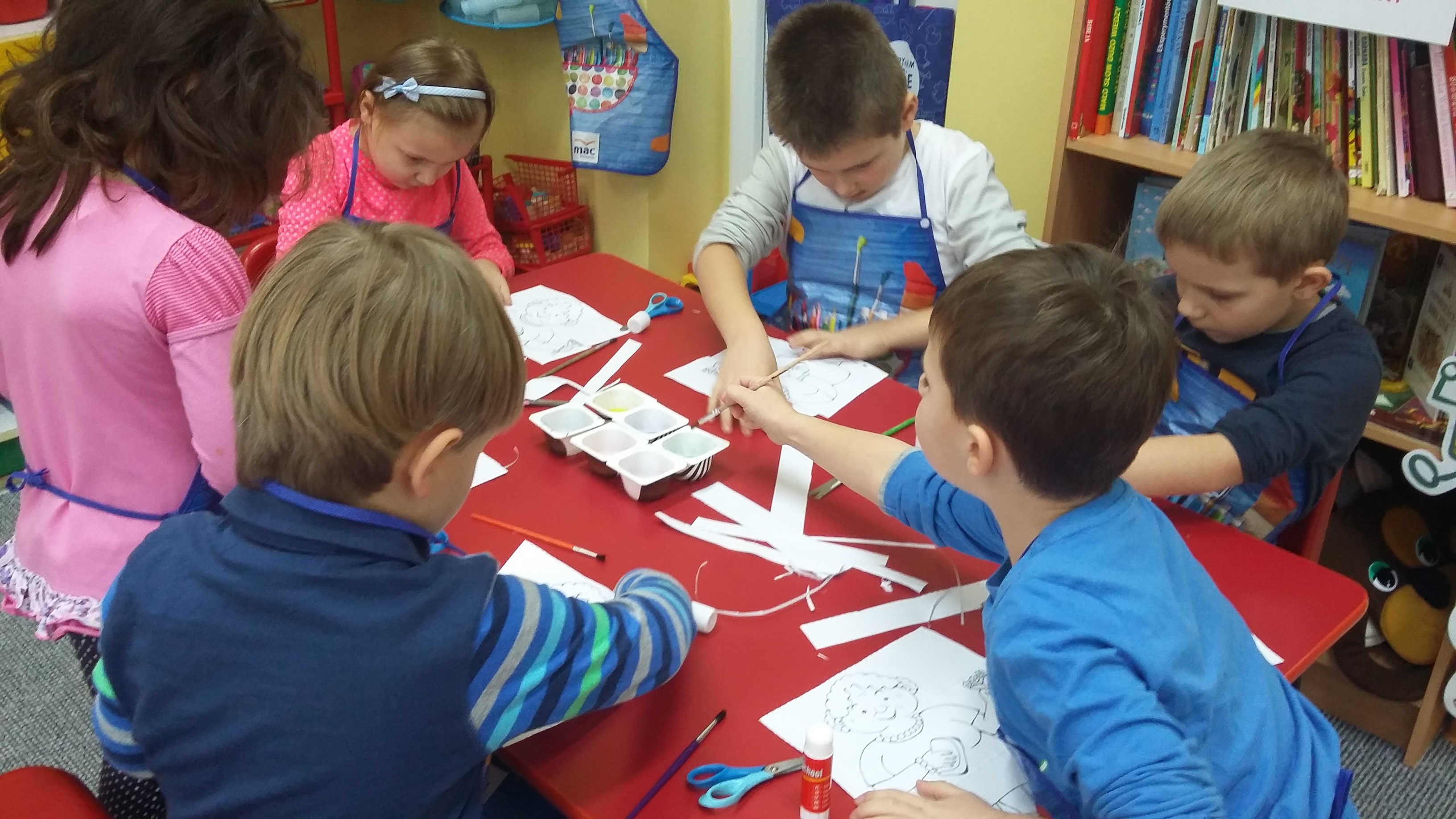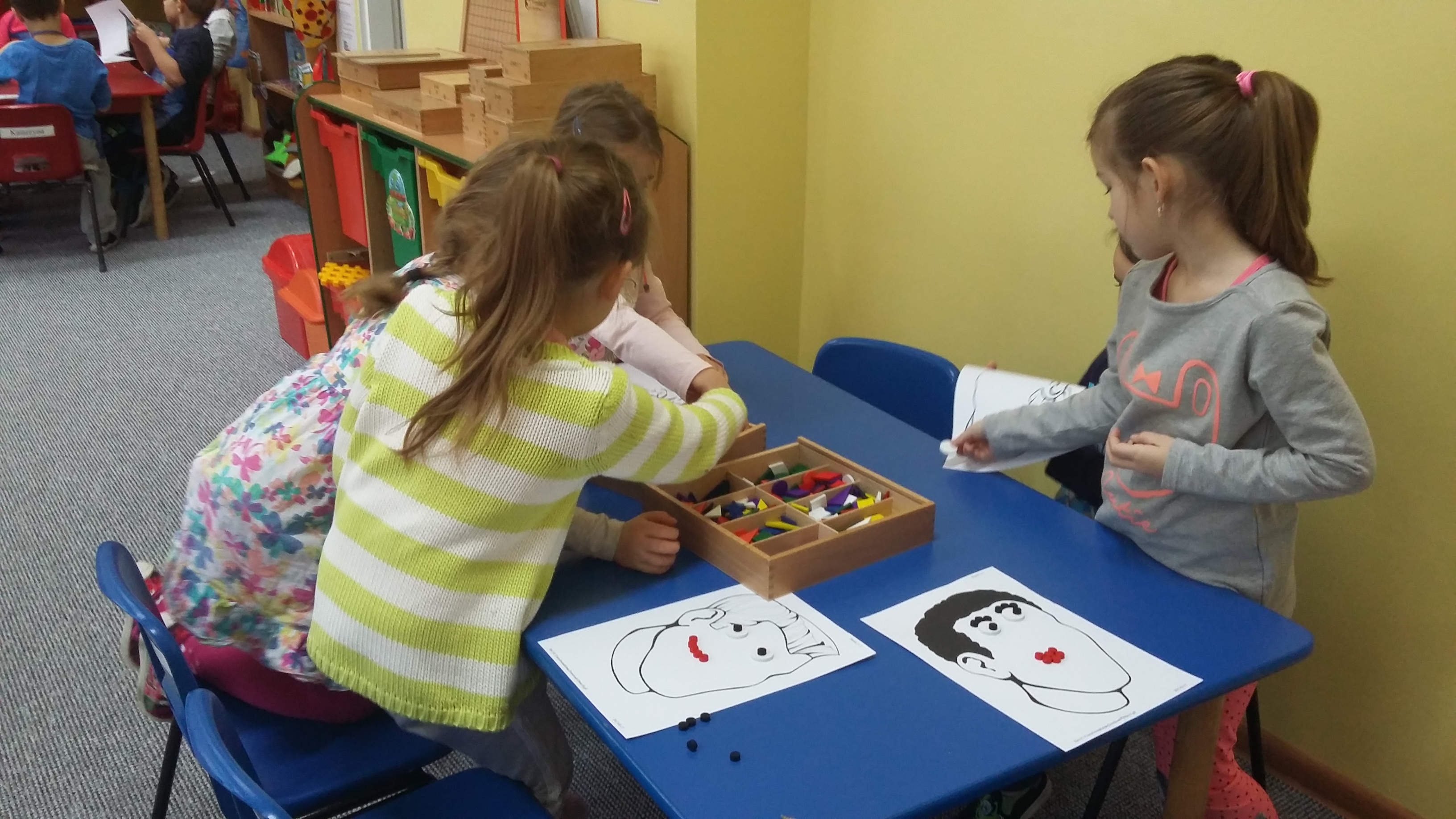 Nasza wyliczanka była również pretekstem do dzielenia wyrazów: Babcia i Dziadek na sylaby oraz głoski oraz do czytania obu tych wyrazów. Później dzieci rozpoczęły aktywności w kącikach zabawowo- zadaniowych. W kąciku darów starszaki układały twarz dziadka z daru 7 i 10. Powstały prawdziwe portrety. W kąciku twórczym artyści układali postać babci, którą później malowali farbami. Praca w kąciku badawczym zaplanowana była w postaci eksperymentu z kolorowymi barwnikami rozpuszczonymi w mleku oraz patyczka zanurzonego w płynie do mycia naczyń. Magiczne działanie mleka i płynu powodowało powstanie kolorowych wirów oraz mieszanie się kolorów. W kąciku gospodarczym przedszkolaki wykonywały niezwykle apetyczne tulipany dla Babci i Dziadka z marchewki, ogórka, wafli ryżowych oraz wykałaczek. Kwiatki wyglądały niezwykle efektownie i smacznie, niestety nie przetrwały, ponieważ zostały zjedzone ze smakiem. Ten dzień froeblowski upłynął nam pod znakiem przygotowań do Dnia Babci i Dziadka.