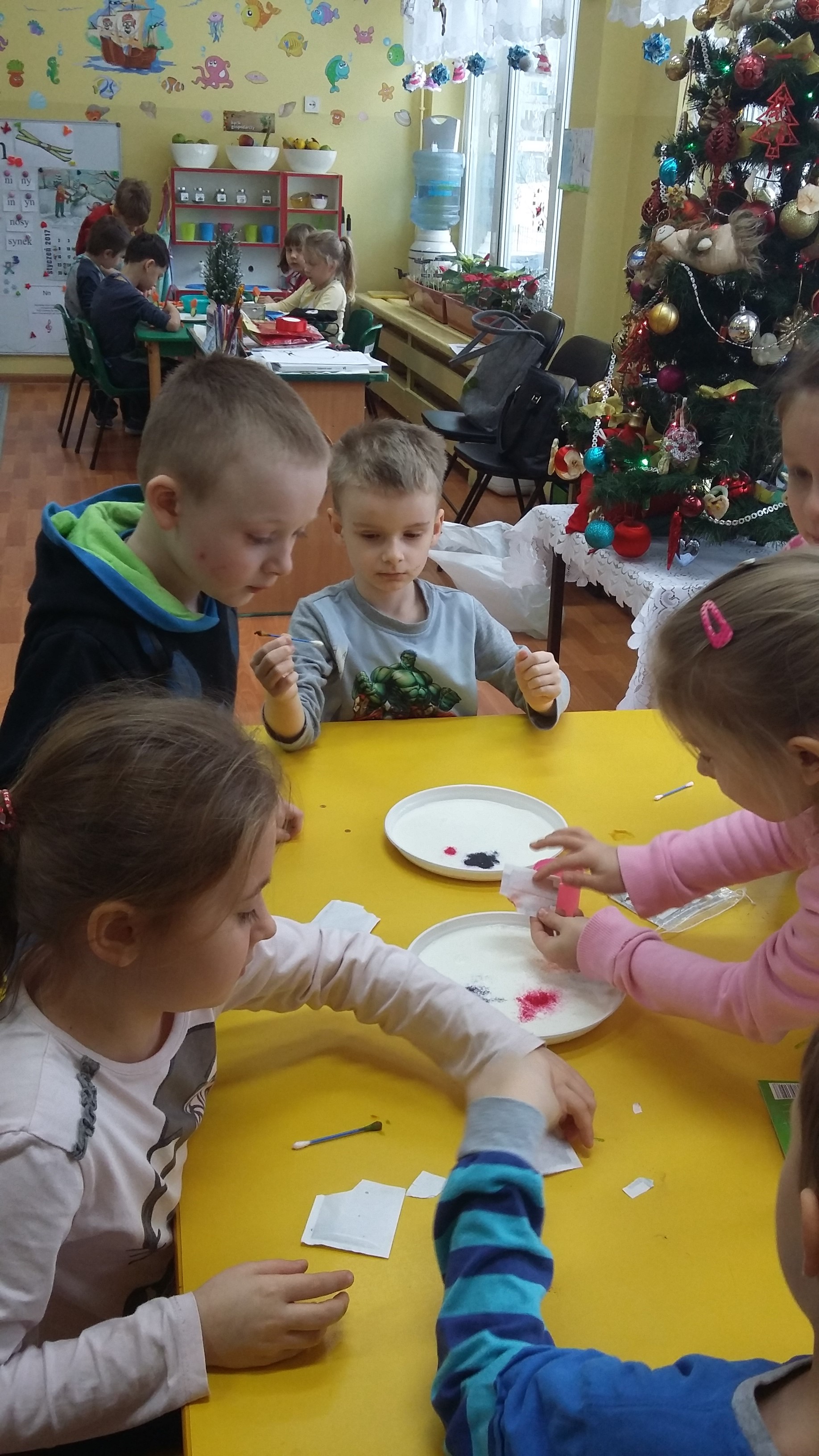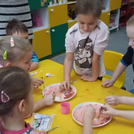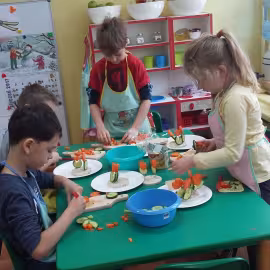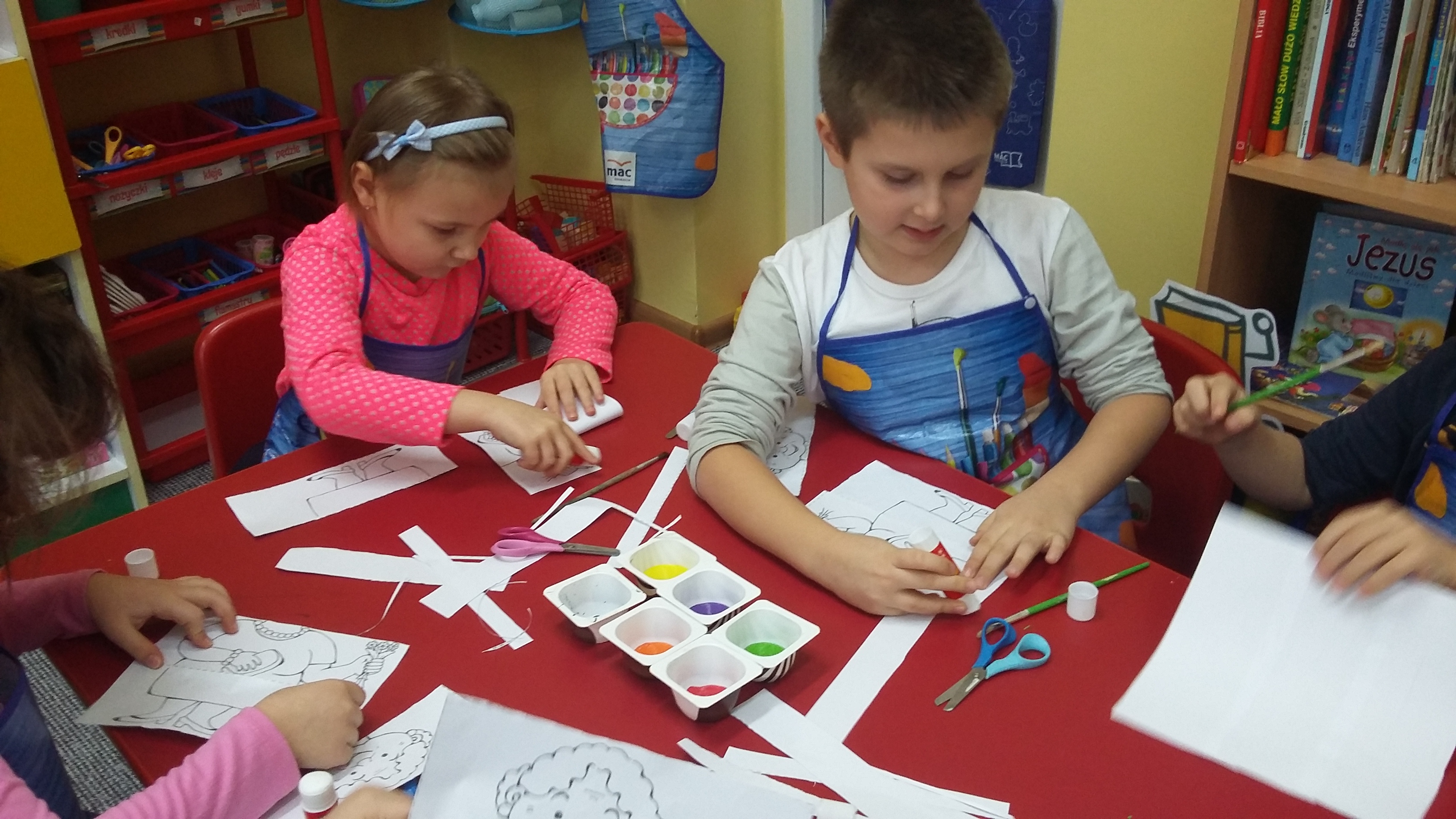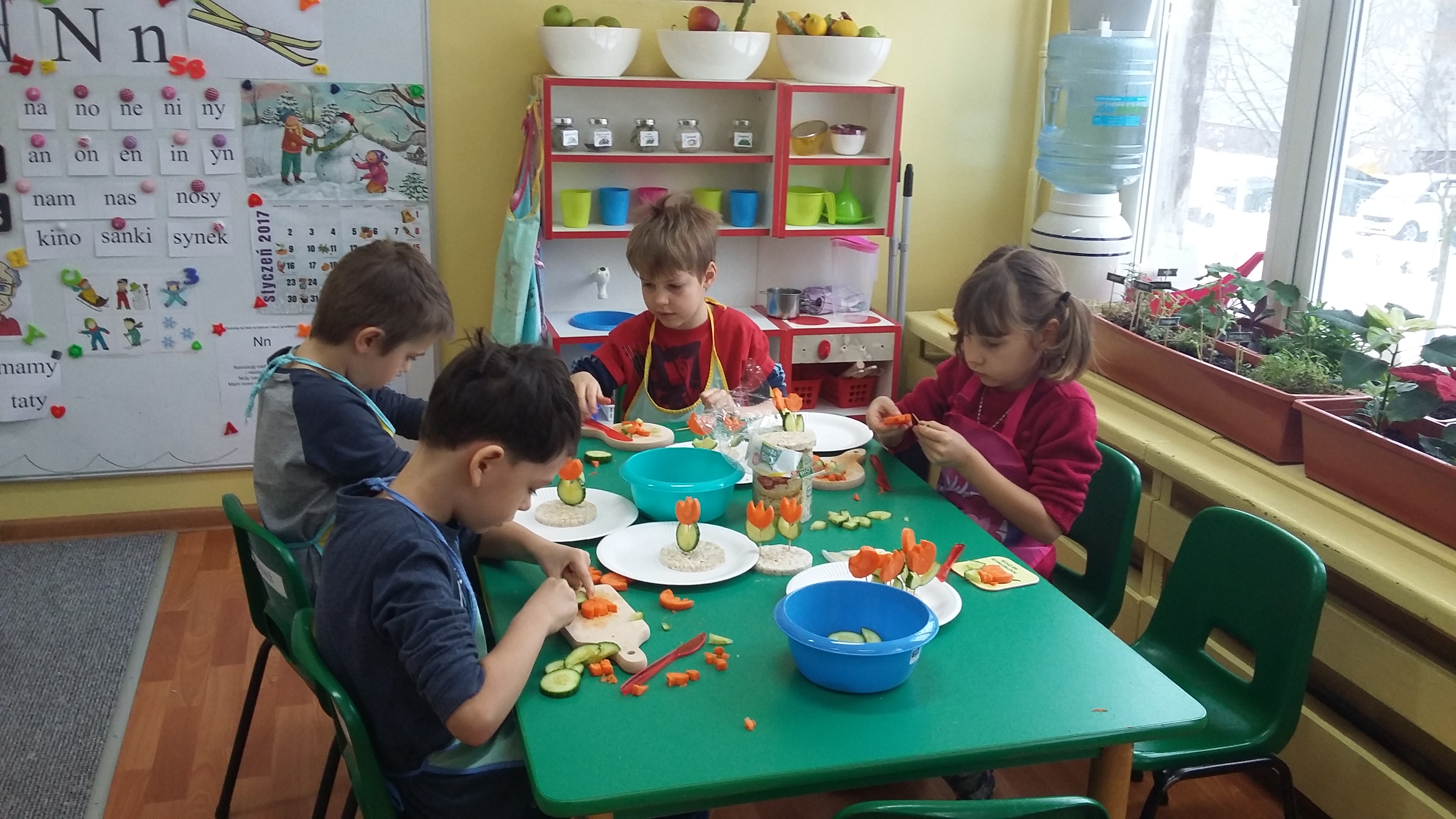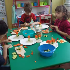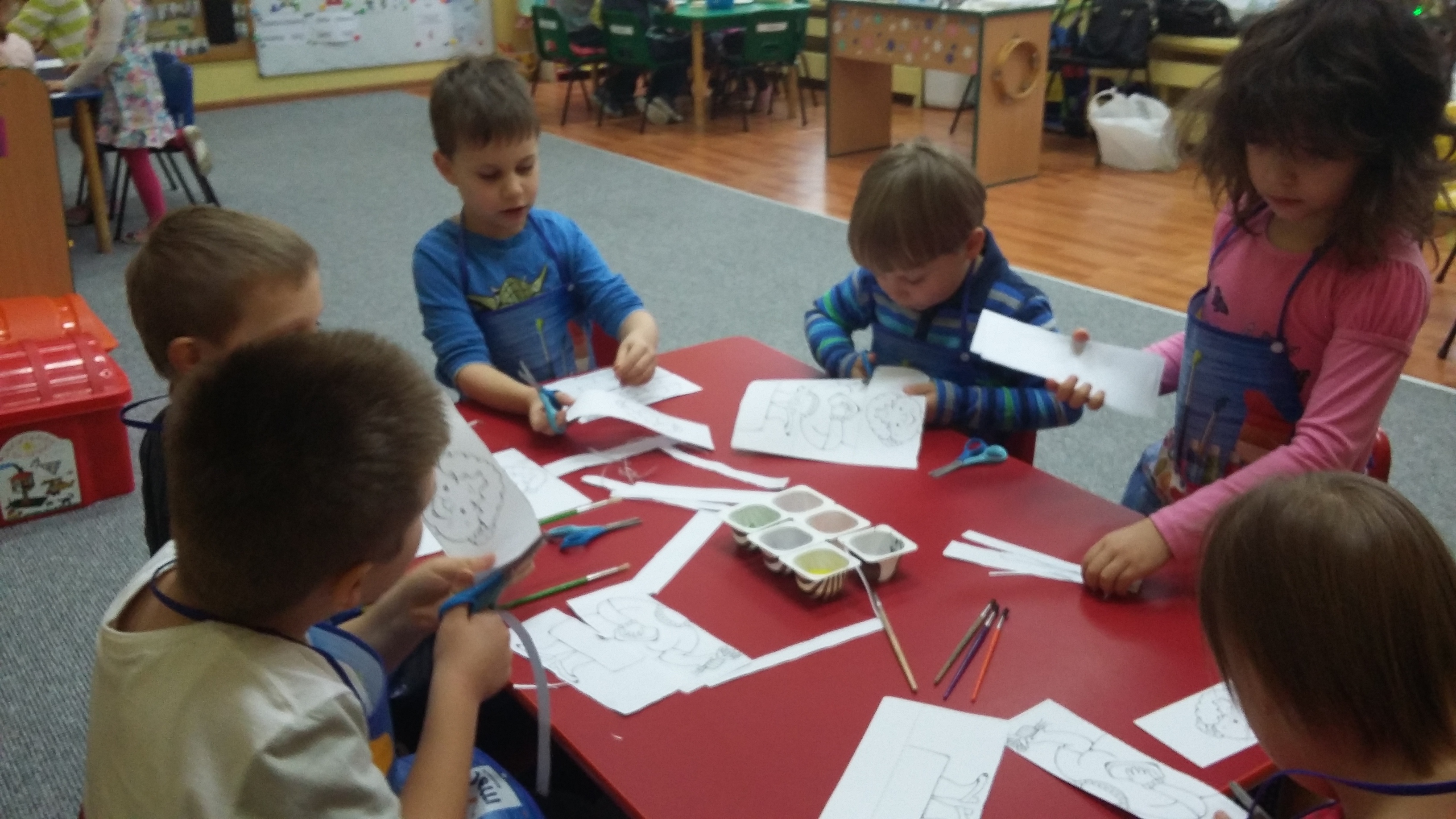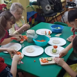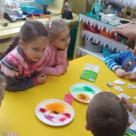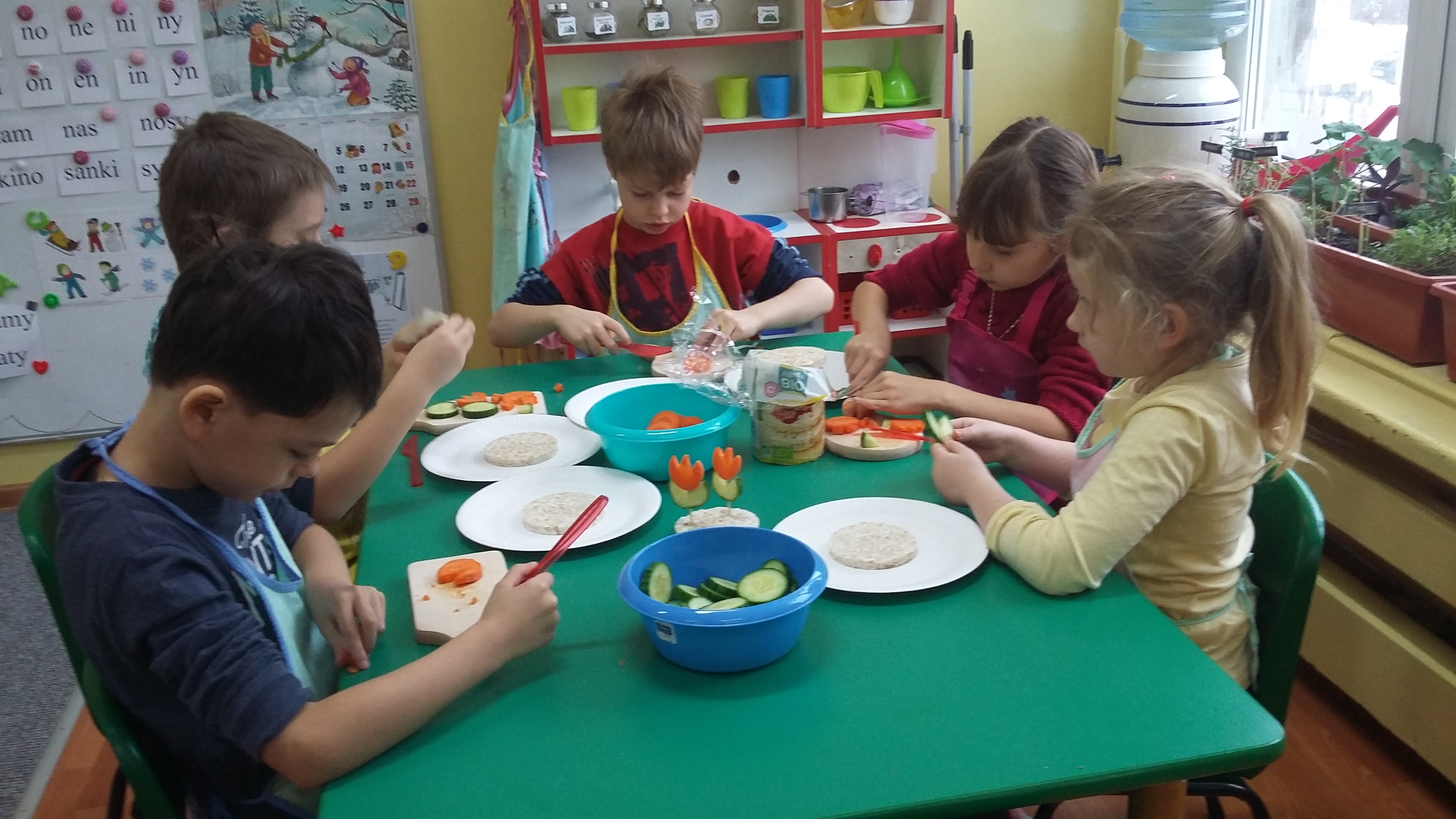 Nasza wyliczanka była również pretekstem do dzielenia wyrazów: Babcia i Dziadek na sylaby oraz głoski oraz do czytania obu tych wyrazów. Później dzieci rozpoczęły aktywności w kącikach zabawowo- zadaniowych. W kąciku darów starszaki układały twarz dziadka z daru 7 i 10. Powstały prawdziwe portrety. W kąciku twórczym artyści układali postać babci, którą później malowali farbami. Praca w kąciku badawczym zaplanowana była w postaci eksperymentu z kolorowymi barwnikami rozpuszczonymi w mleku oraz patyczka zanurzonego w płynie do mycia naczyń. Magiczne działanie mleka i płynu powodowało powstanie kolorowych wirów oraz mieszanie się kolorów. W kąciku gospodarczym przedszkolaki wykonywały niezwykle apetyczne tulipany dla Babci i Dziadka z marchewki, ogórka, wafli ryżowych oraz wykałaczek. Kwiatki wyglądały niezwykle efektownie i smacznie, niestety nie przetrwały, ponieważ zostały zjedzone ze smakiem. Ten dzień froeblowski upłynął nam pod znakiem przygotowań do Dnia Babci i Dziadka.