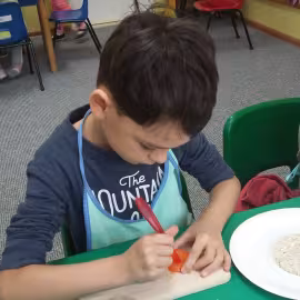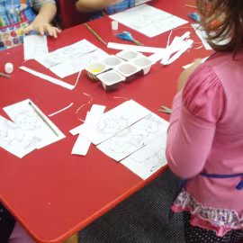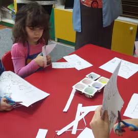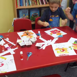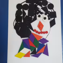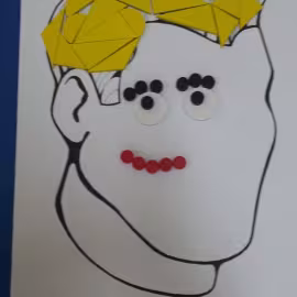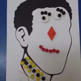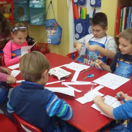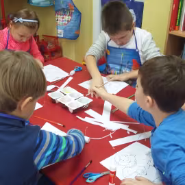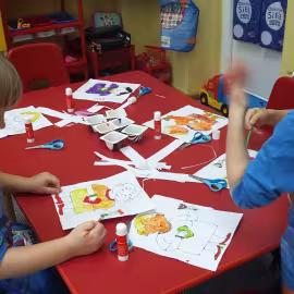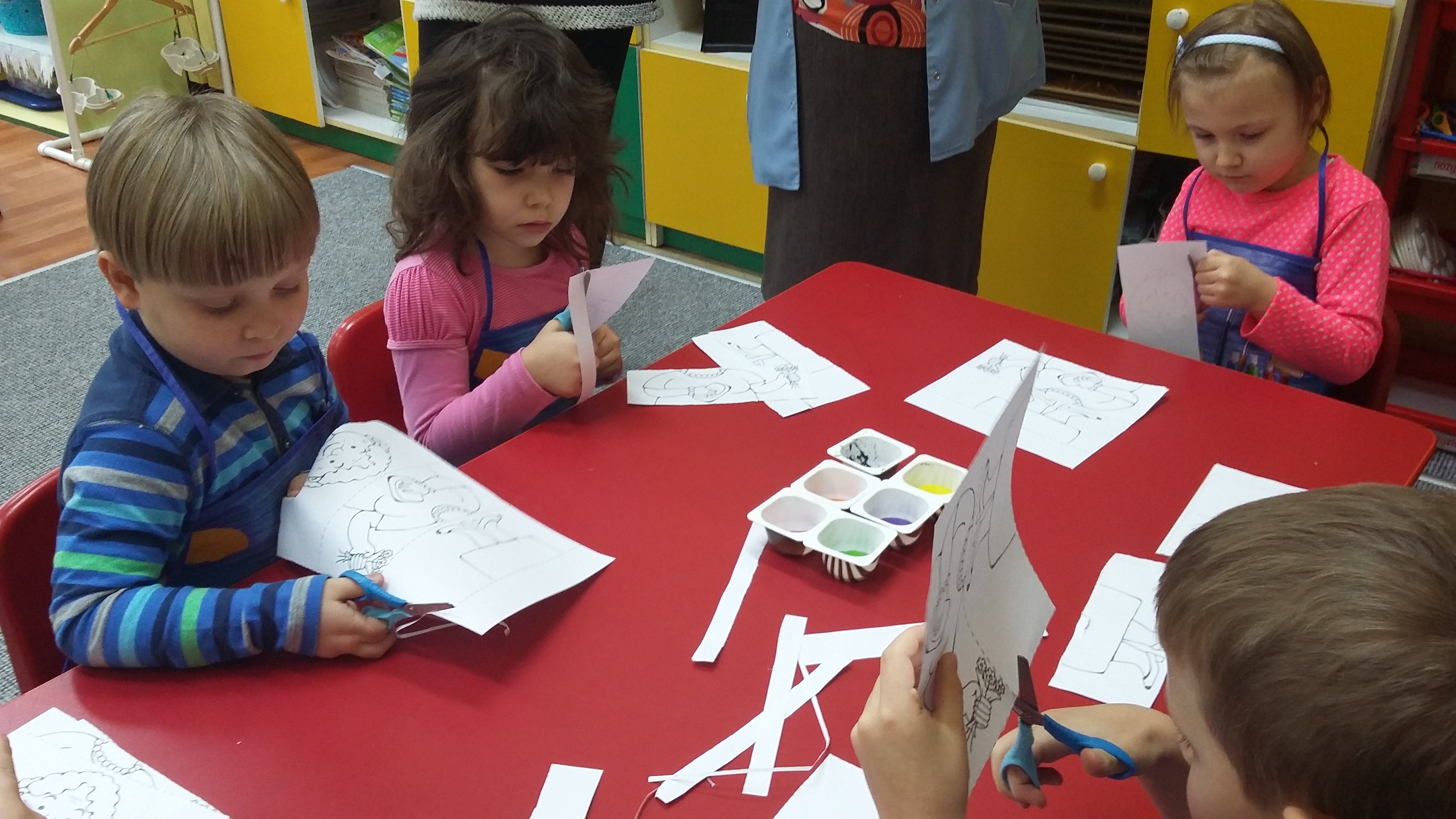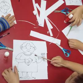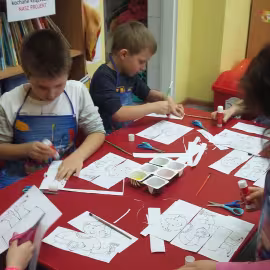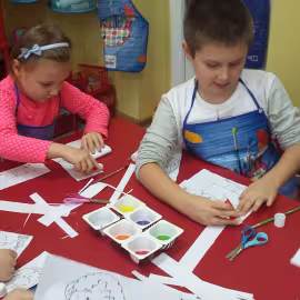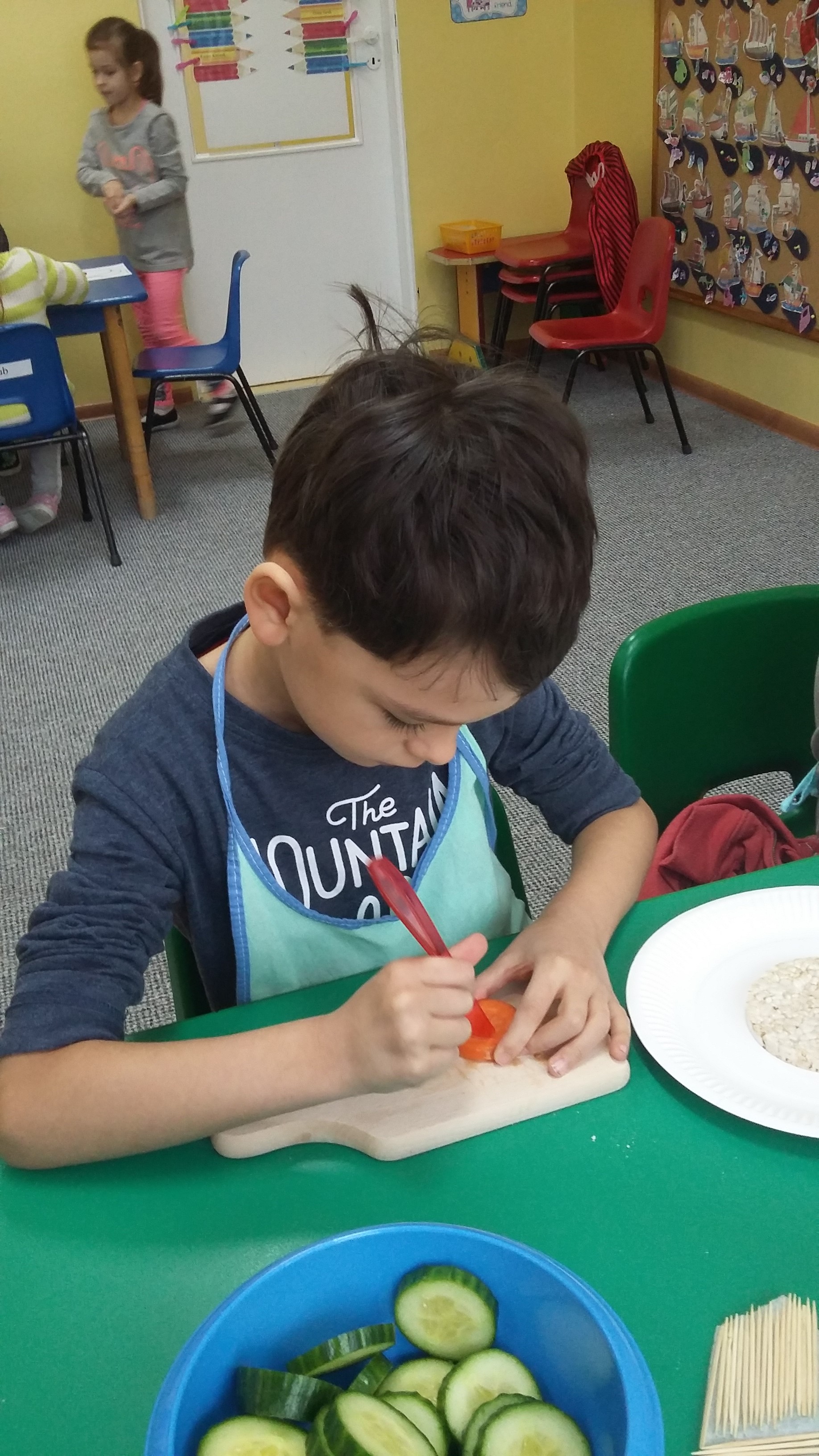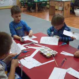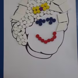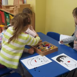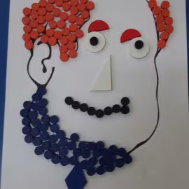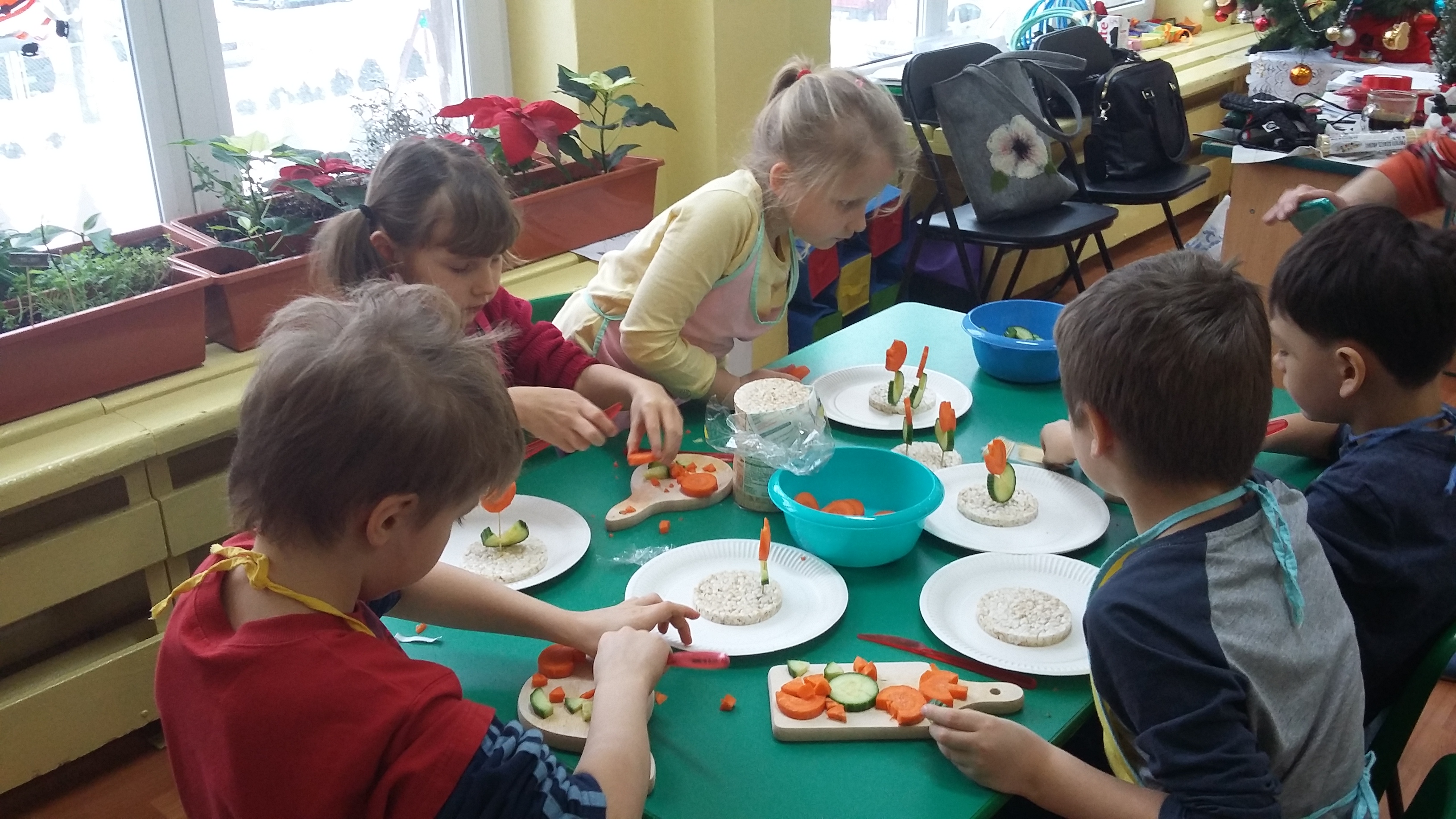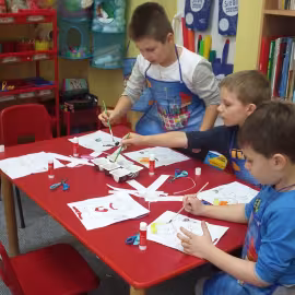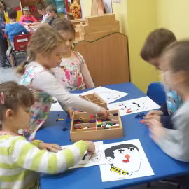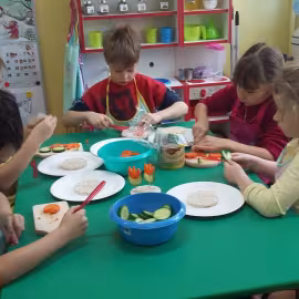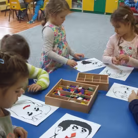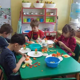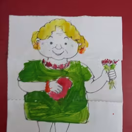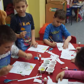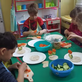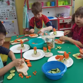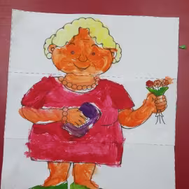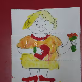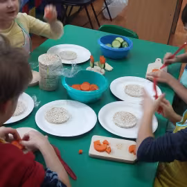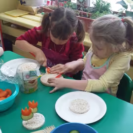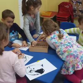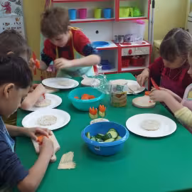 Nasza wyliczanka była również pretekstem do dzielenia wyrazów: Babcia i Dziadek na sylaby oraz głoski oraz do czytania obu tych wyrazów. Później dzieci rozpoczęły aktywności w kącikach zabawowo- zadaniowych. W kąciku darów starszaki układały twarz dziadka z daru 7 i 10. Powstały prawdziwe portrety. W kąciku twórczym artyści układali postać babci, którą później malowali farbami. Praca w kąciku badawczym zaplanowana była w postaci eksperymentu z kolorowymi barwnikami rozpuszczonymi w mleku oraz patyczka zanurzonego w płynie do mycia naczyń. Magiczne działanie mleka i płynu powodowało powstanie kolorowych wirów oraz mieszanie się kolorów. W kąciku gospodarczym przedszkolaki wykonywały niezwykle apetyczne tulipany dla Babci i Dziadka z marchewki, ogórka, wafli ryżowych oraz wykałaczek. Kwiatki wyglądały niezwykle efektownie i smacznie, niestety nie przetrwały, ponieważ zostały zjedzone ze smakiem. Ten dzień froeblowski upłynął nam pod znakiem przygotowań do Dnia Babci i Dziadka.