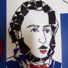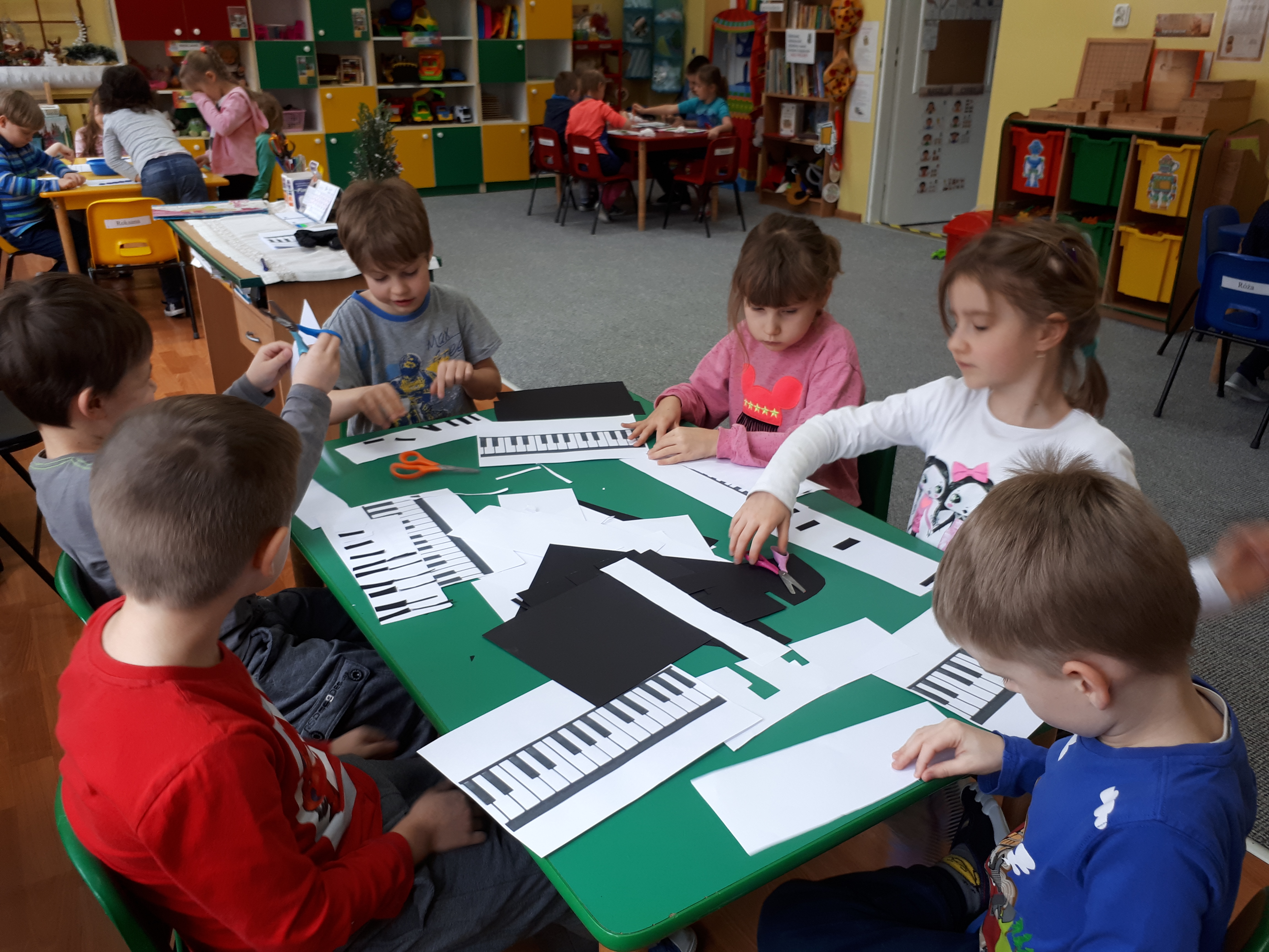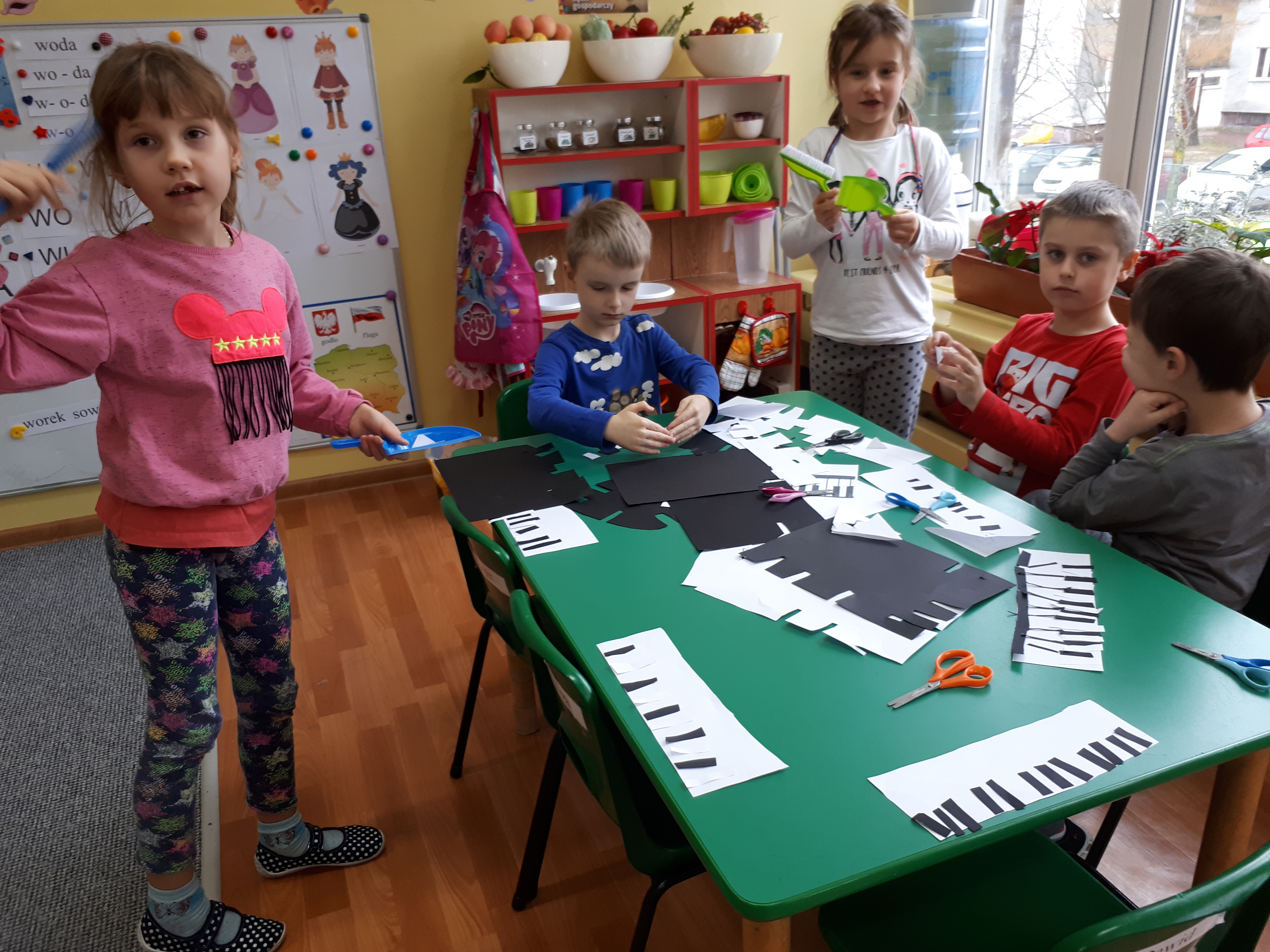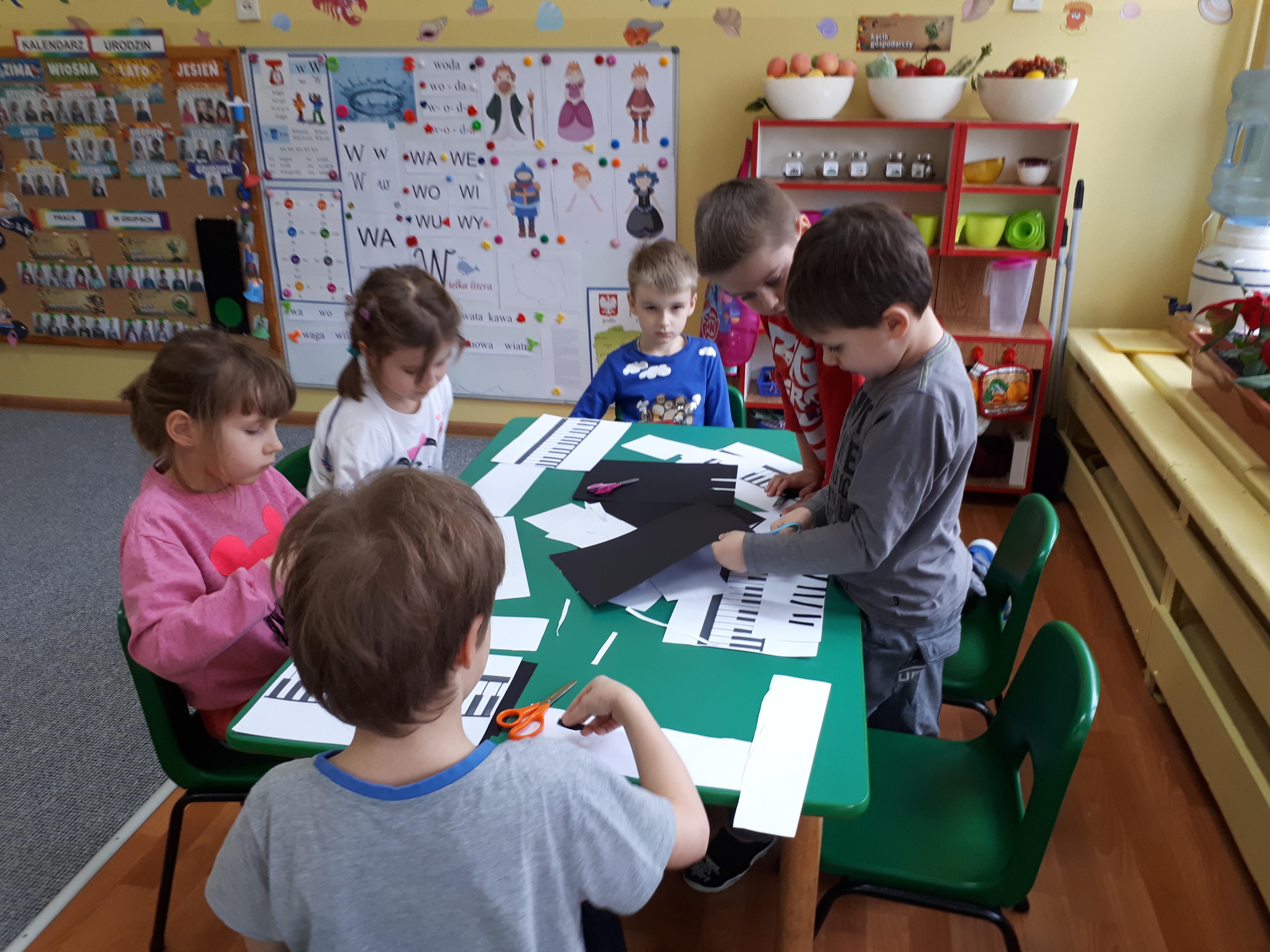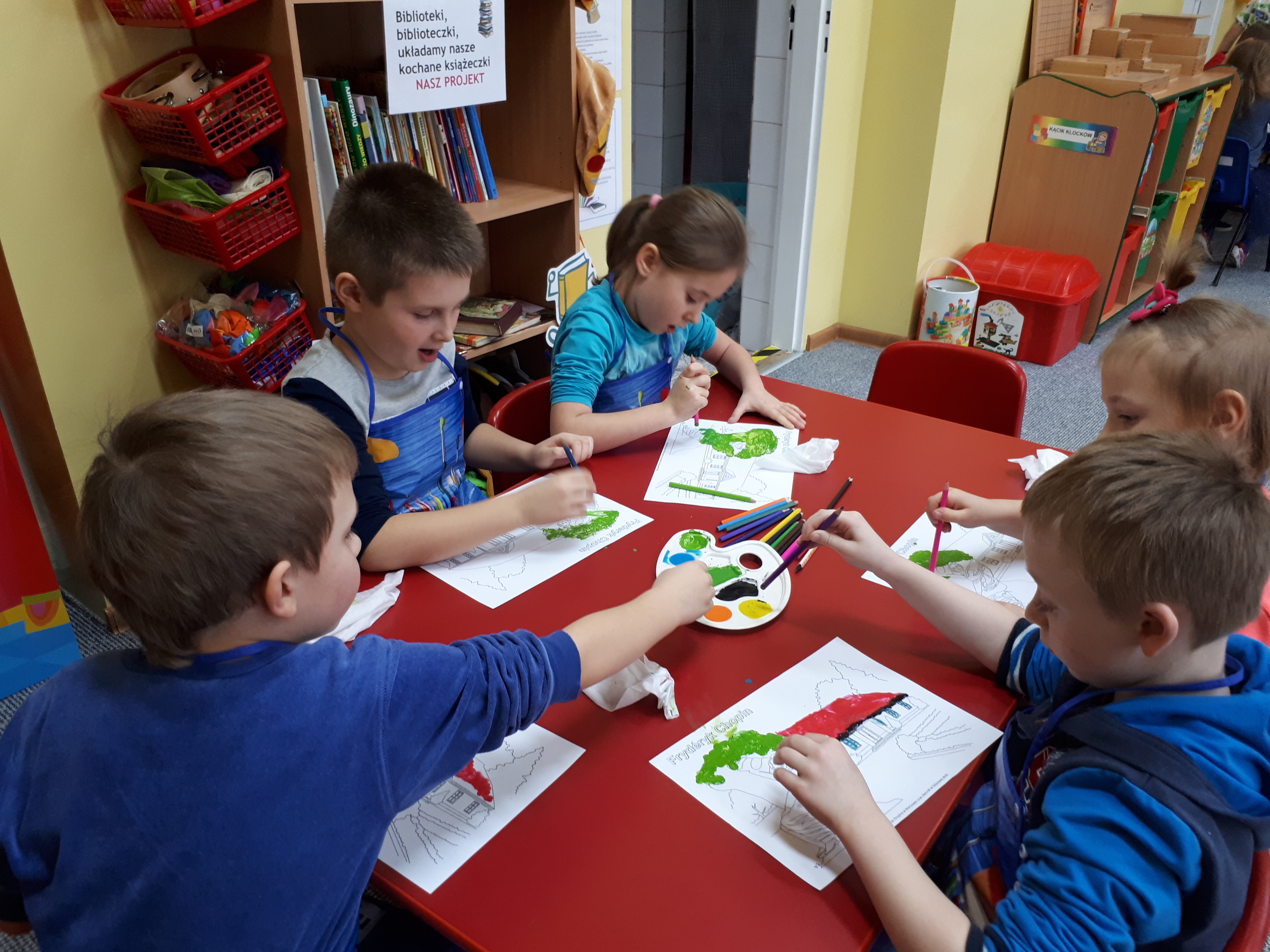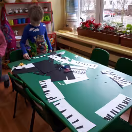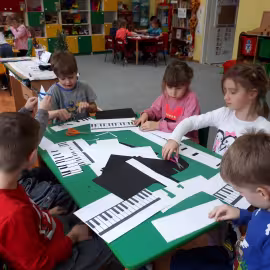 W grupie starszaków poznaliśmy sylwetkę wielkiego Polaka – Fryderyka Chopina. Dodatkowo kształtowaliśmy umiejętności słuchania muzyki poważnej oraz wyobraźni muzycznej poprzez improwizację ruchową i plastyczną. Na początku zajęć w porannym kole wysłuchaliśmy wiersz Heleny Bechlerowej „Kiedy mamusia gra” i poznaliśmy krótką historię życia Fryderyka Chopina. Dzieci były pod wrażeniem faktu, że pierwsze utwory mały Fryderyk skomponował w wieku 7 lat. Później podczas pracy w kącikach zabawowo- zadaniowych zgłębialiśmy tajemnice geniuszu wielkiego Polaka. W kąciku darów dzieci układały portrety młodego Fryderyka. W kąciku twórczym malowały pomnik i dom Fryderyka Chopina, który znajduje się w Żelazowej Woli metodą „kropki”- zanurzając końcówkę ołówka w farbie i odbijając na kartce. W kąciku badawczym dzieci z darów układały na pięciolinii gamę i wygrywały je na Bum Bum Rurkach. W kąciku gospodarczym przedszkolaki projektowały klawiaturę fortepianu z biało- czarnego kartonu. Ważne jest, aby od najmłodszych lat dziecko miało kontakt z wartościami wyższego rzędu. Poznawanie dobytku kulturowego swojego kraju, poznawanie ludzi kultury rozwija w dziecku wrażliwości estetyczne, uczy wrażliwości na piękno, a także prawidłowego odbioru, rozumienia i przeżywania utworów muzyki klasycznej
