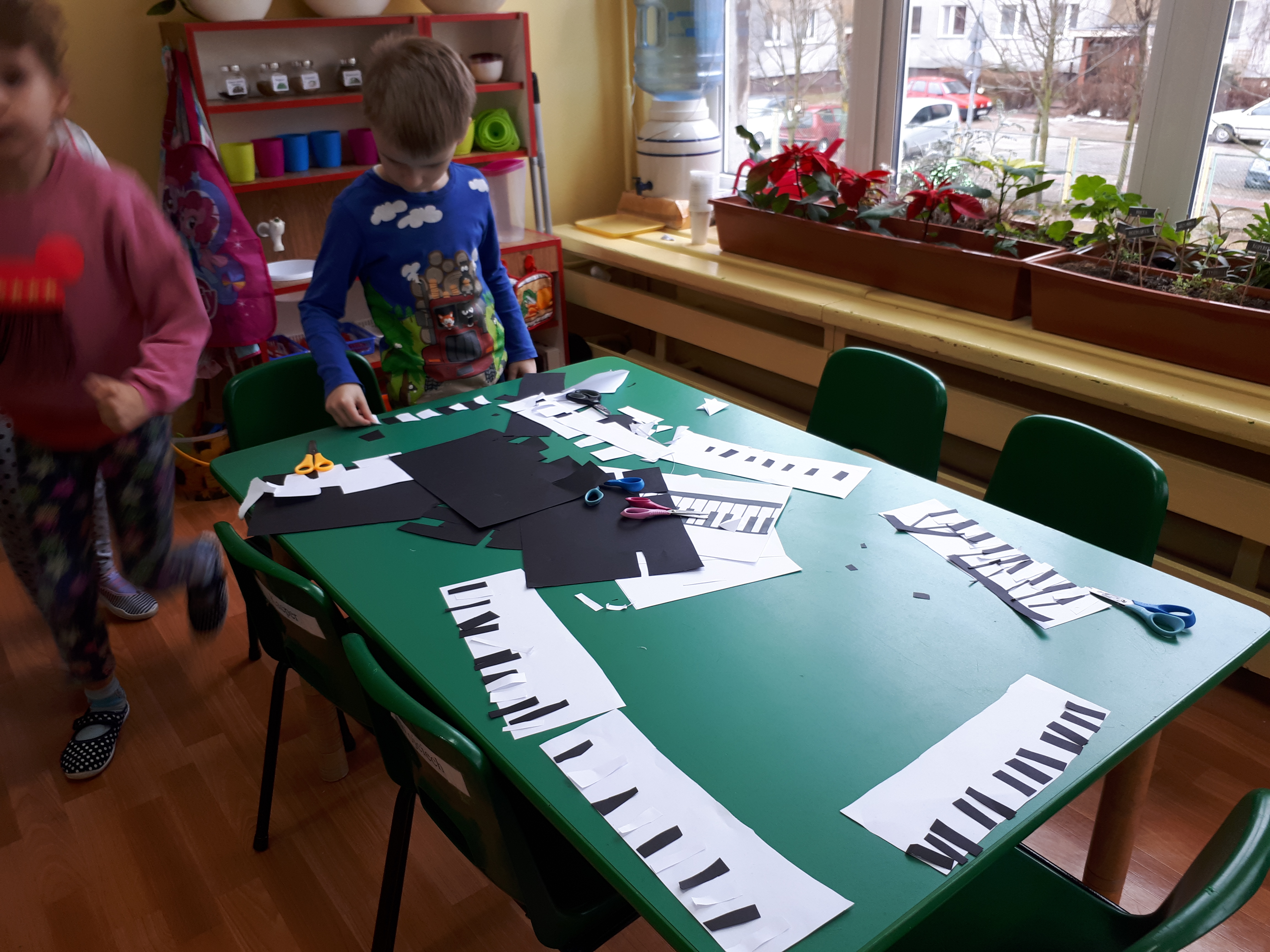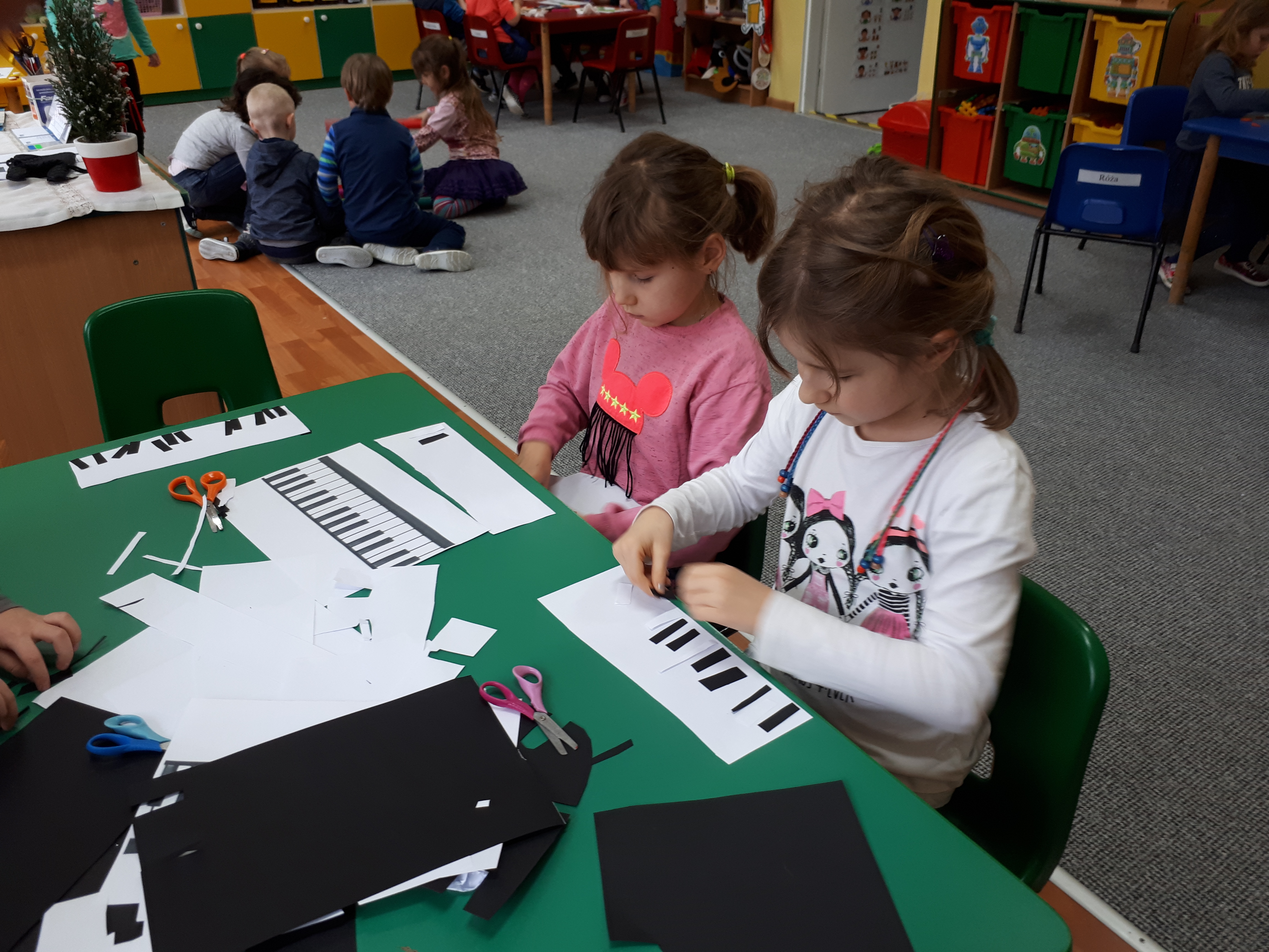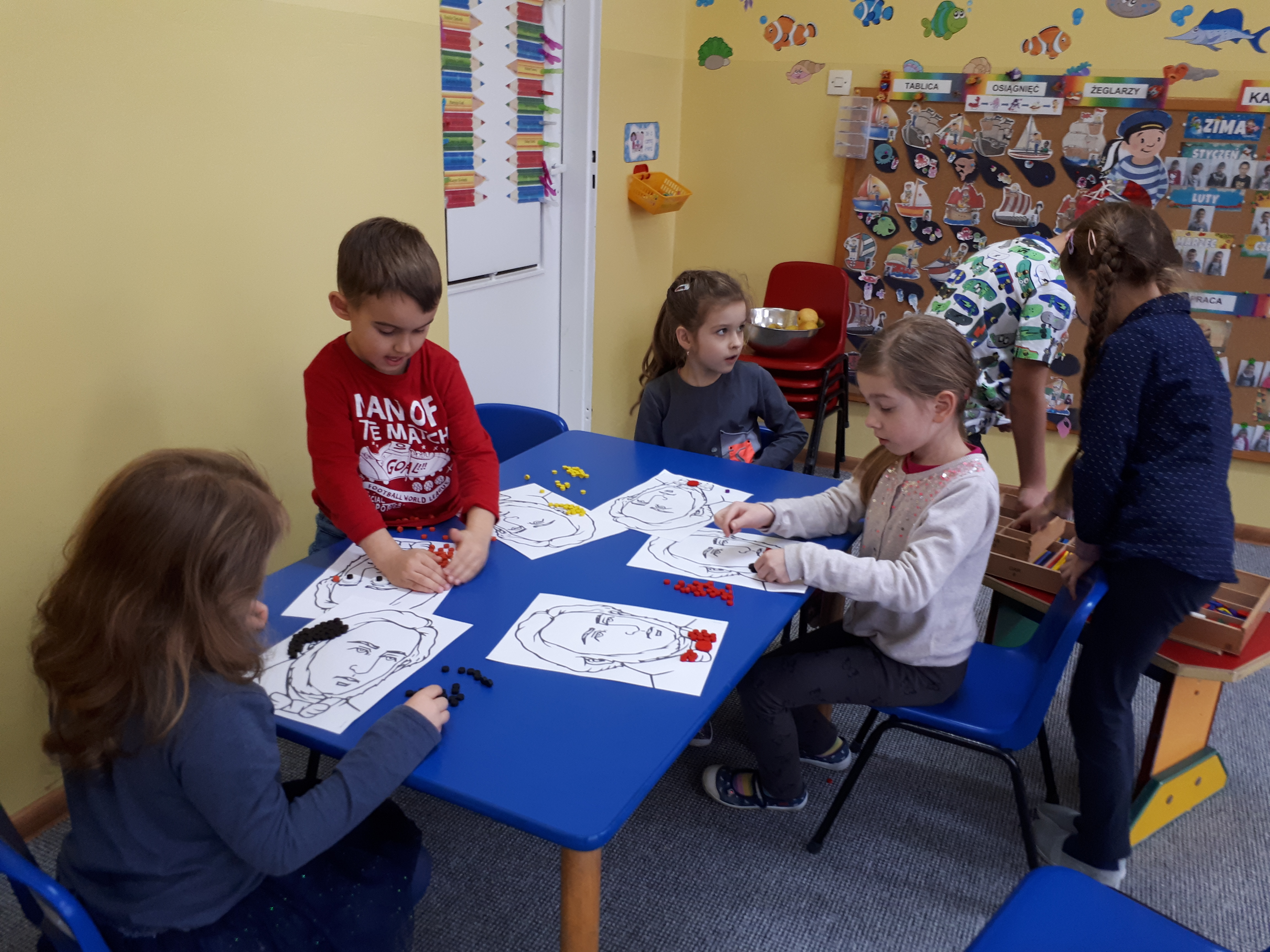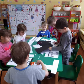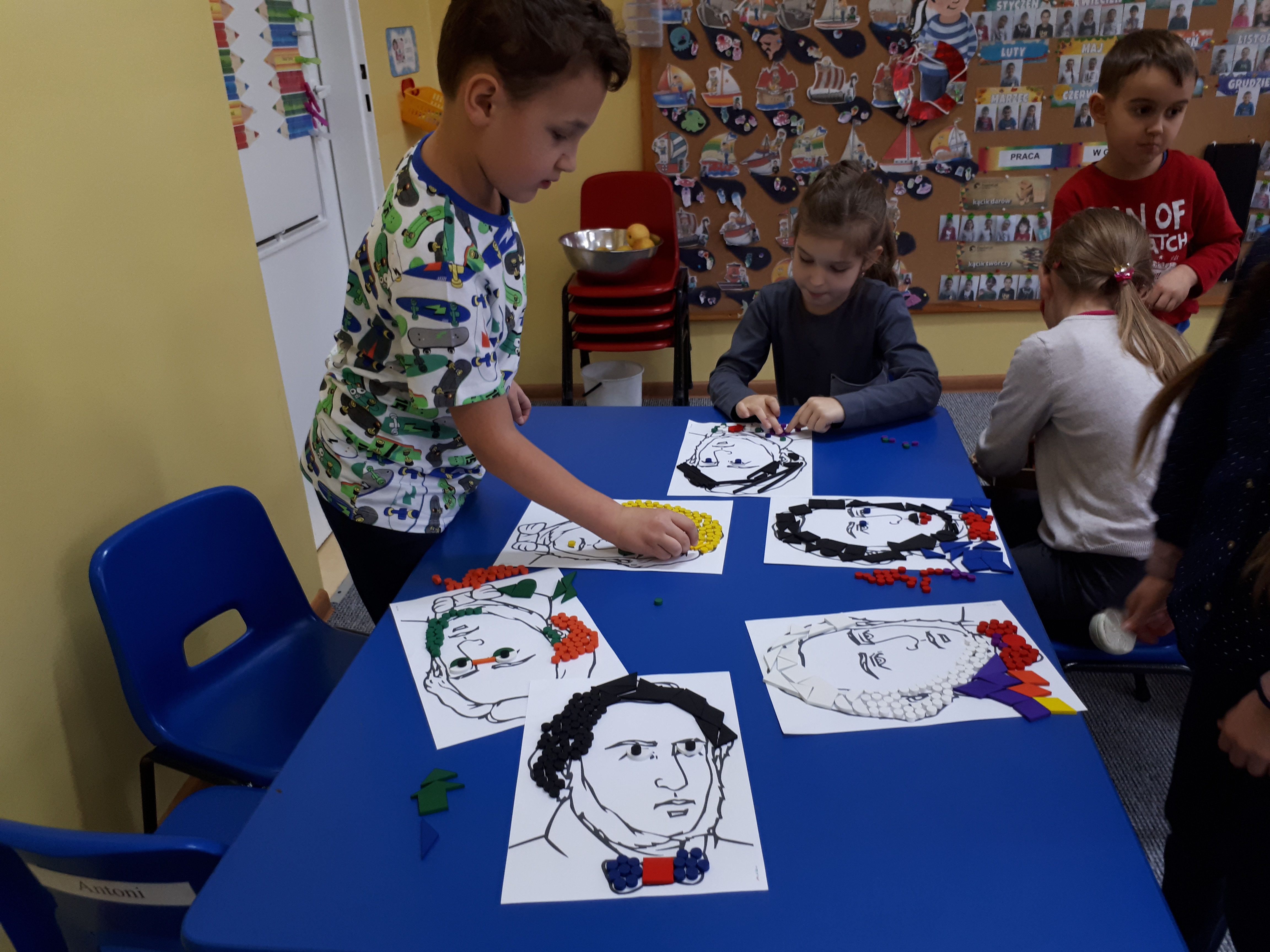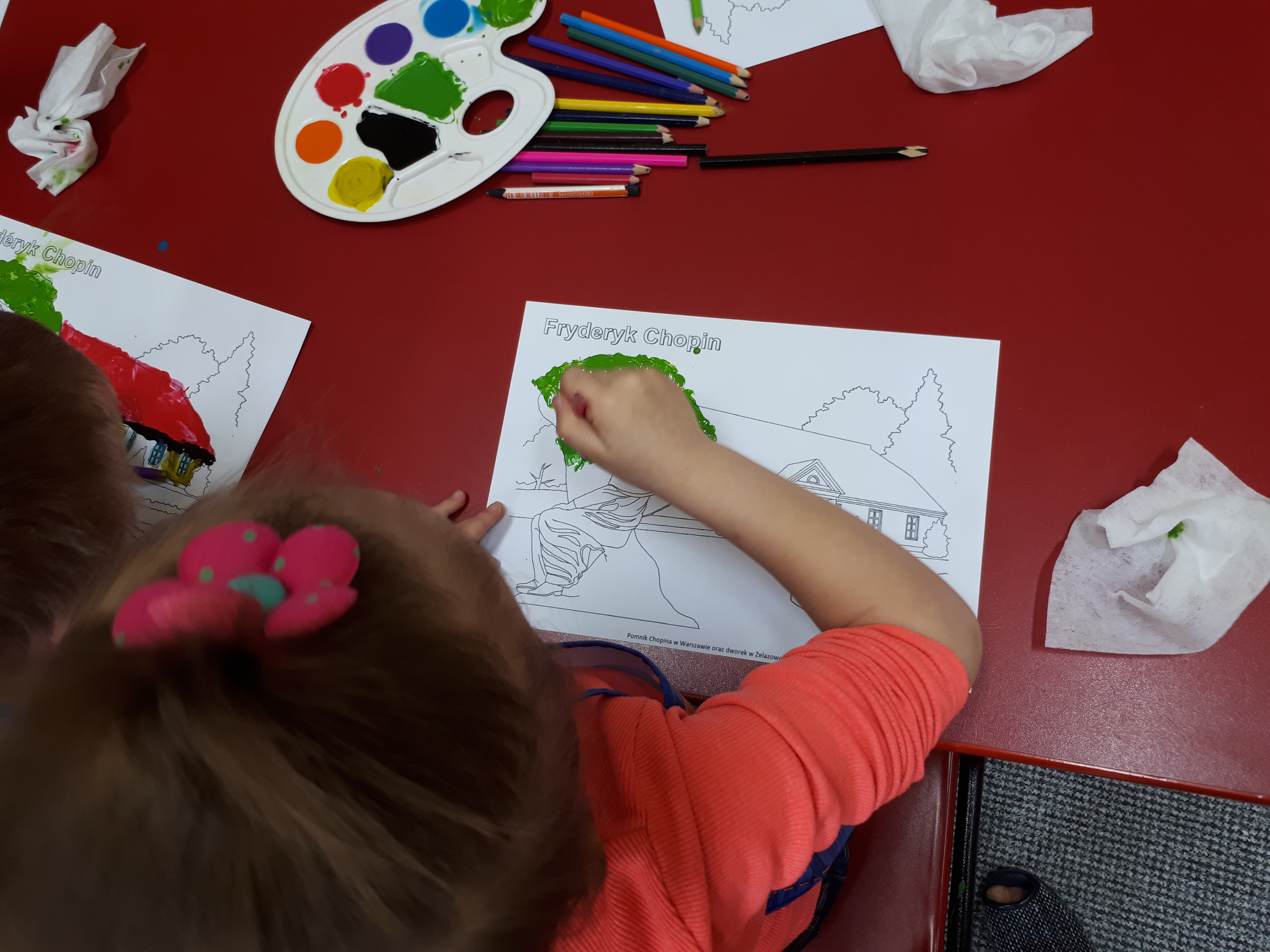 W grupie starszaków poznaliśmy sylwetkę wielkiego Polaka – Fryderyka Chopina. Dodatkowo kształtowaliśmy umiejętności słuchania muzyki poważnej oraz wyobraźni muzycznej poprzez improwizację ruchową i plastyczną. Na początku zajęć w porannym kole wysłuchaliśmy wiersz Heleny Bechlerowej „Kiedy mamusia gra” i poznaliśmy krótką historię życia Fryderyka Chopina. Dzieci były pod wrażeniem faktu, że pierwsze utwory mały Fryderyk skomponował w wieku 7 lat. Później podczas pracy w kącikach zabawowo- zadaniowych zgłębialiśmy tajemnice geniuszu wielkiego Polaka. W kąciku darów dzieci układały portrety młodego Fryderyka. W kąciku twórczym malowały pomnik i dom Fryderyka Chopina, który znajduje się w Żelazowej Woli metodą „kropki”- zanurzając końcówkę ołówka w farbie i odbijając na kartce. W kąciku badawczym dzieci z darów układały na pięciolinii gamę i wygrywały je na Bum Bum Rurkach. W kąciku gospodarczym przedszkolaki projektowały klawiaturę fortepianu z biało- czarnego kartonu. Ważne jest, aby od najmłodszych lat dziecko miało kontakt z wartościami wyższego rzędu. Poznawanie dobytku kulturowego swojego kraju, poznawanie ludzi kultury rozwija w dziecku wrażliwości estetyczne, uczy wrażliwości na piękno, a także prawidłowego odbioru, rozumienia i przeżywania utworów muzyki klasycznej